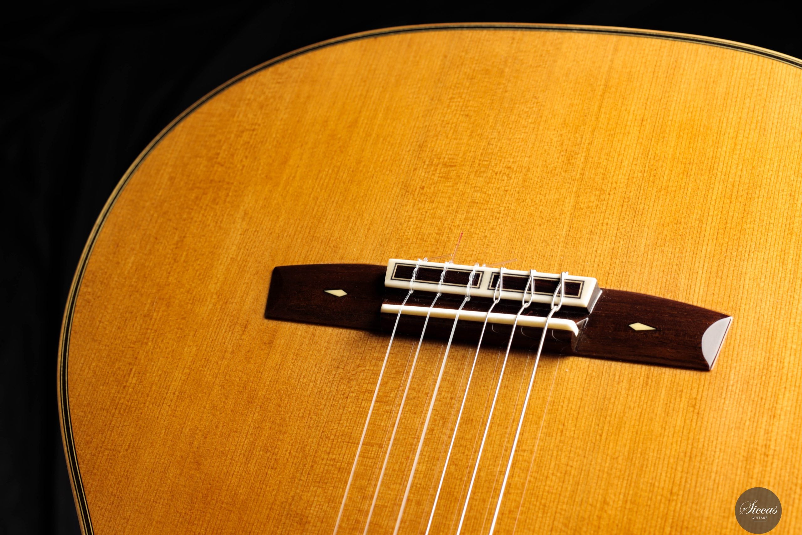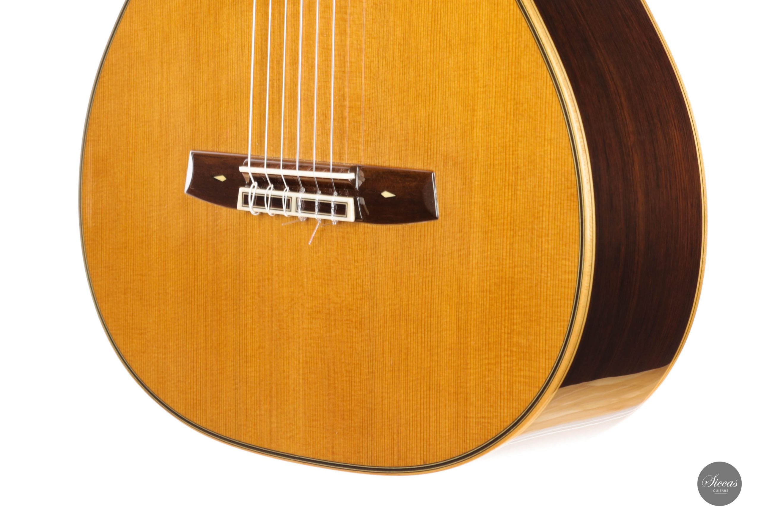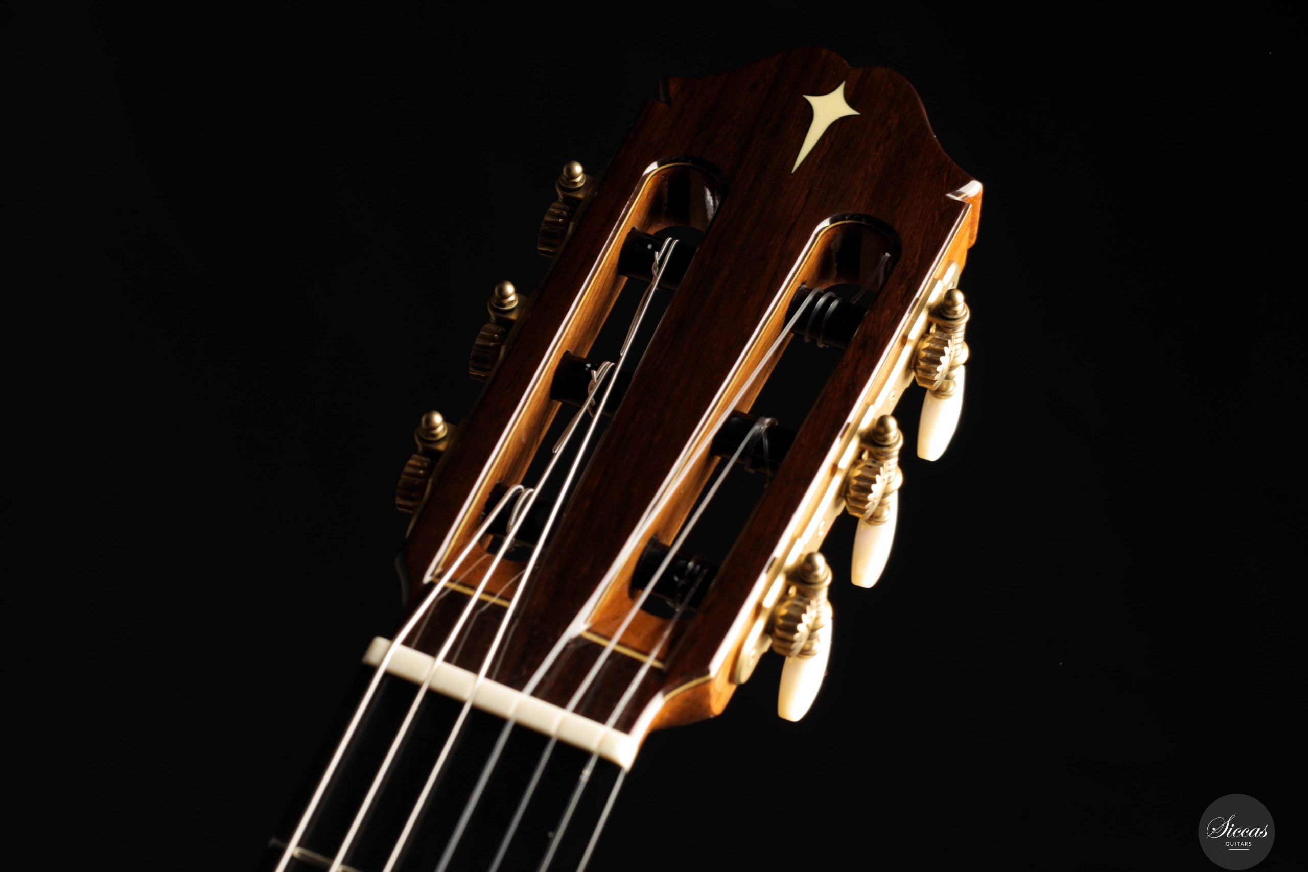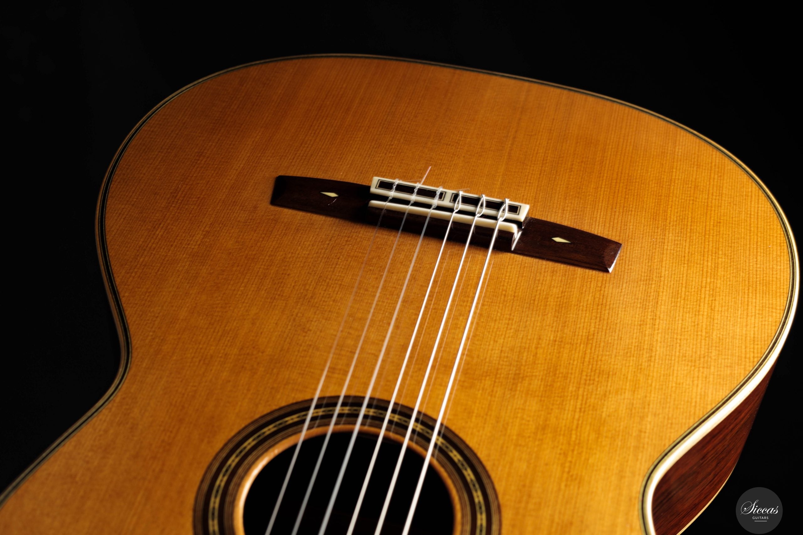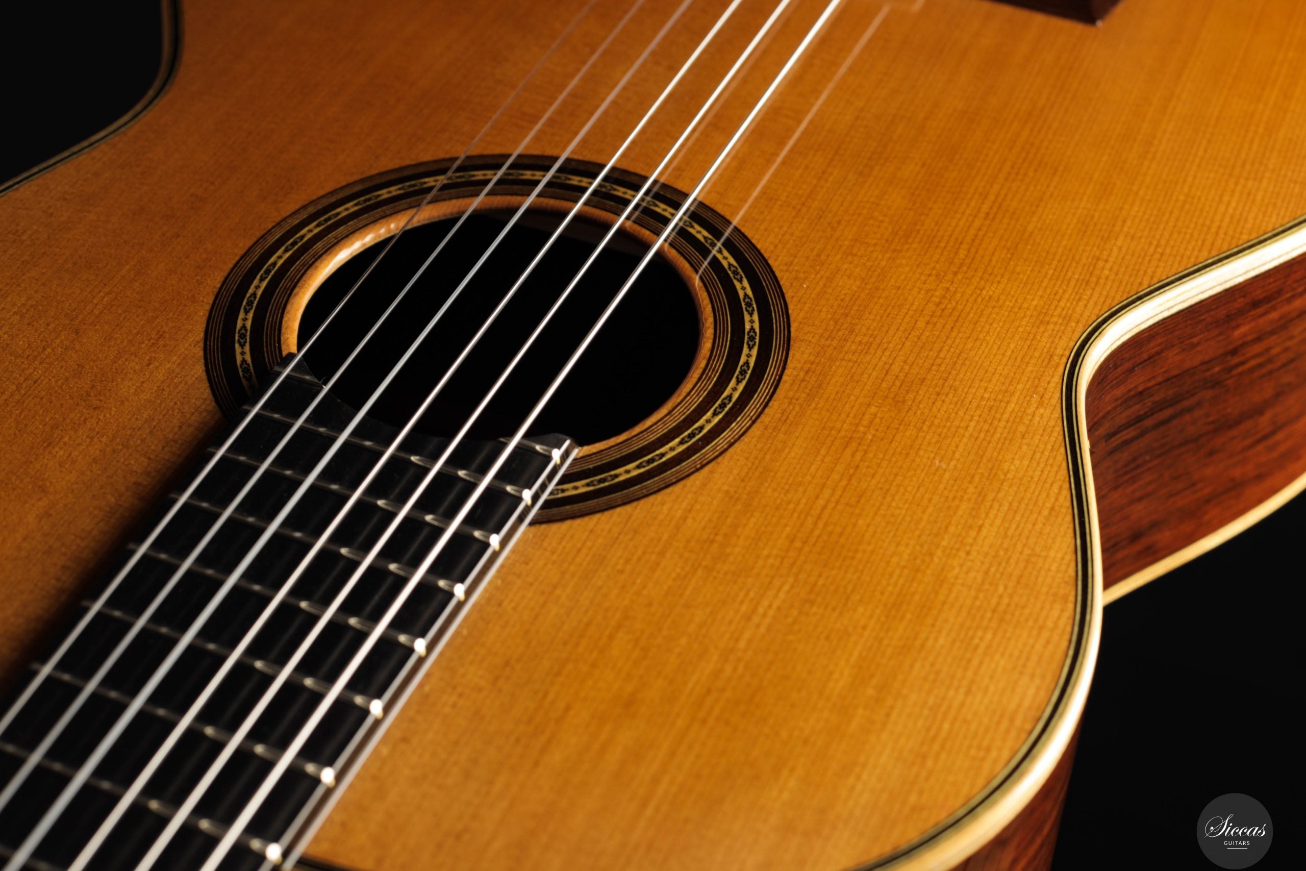 This exceptional 2025 “PC” model (Paris Competition) is a direct descendant of the award-winning guitar that secured Sakurai first prize in Paris in 1988. It represents the culmination of decades of experience and refinement and stands out for its expressive power and elegant presence. The cedar top is finely grained and harmonizes beautifully with the dark, straight-grained Madagascar rosewood back and sides, producing a balanced tonal spectrum with strong basses, full mids, and rounded trebles. Its voice is clear, nuanced, and effortlessly projects, making it an ideal concert instrument.