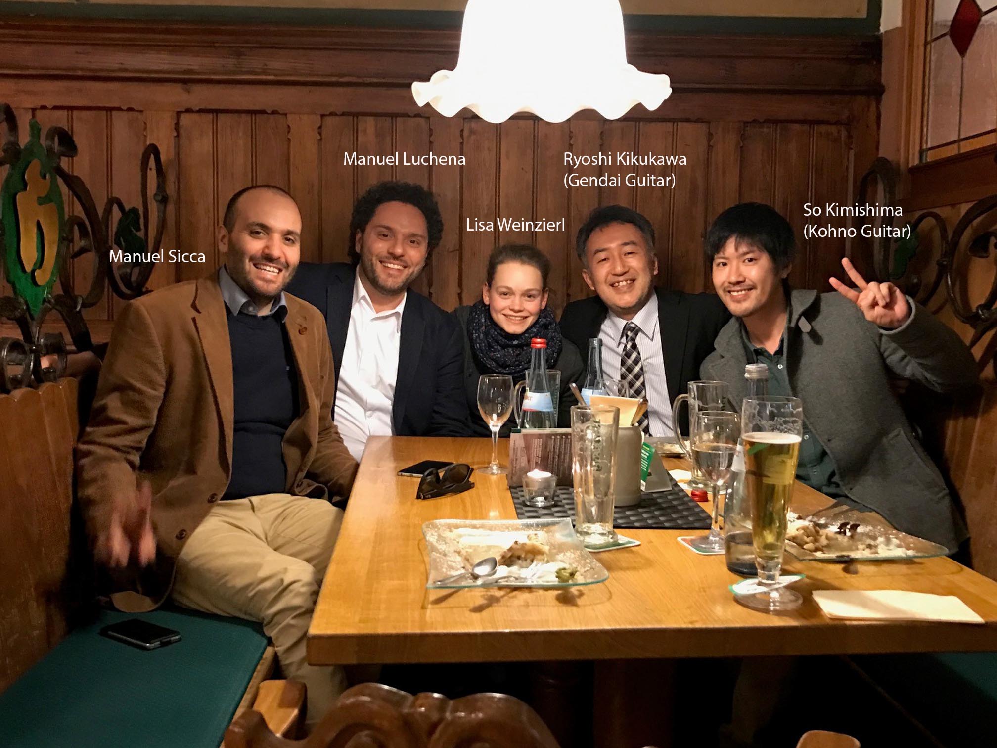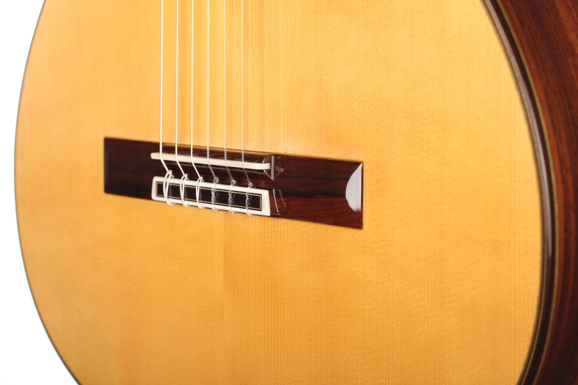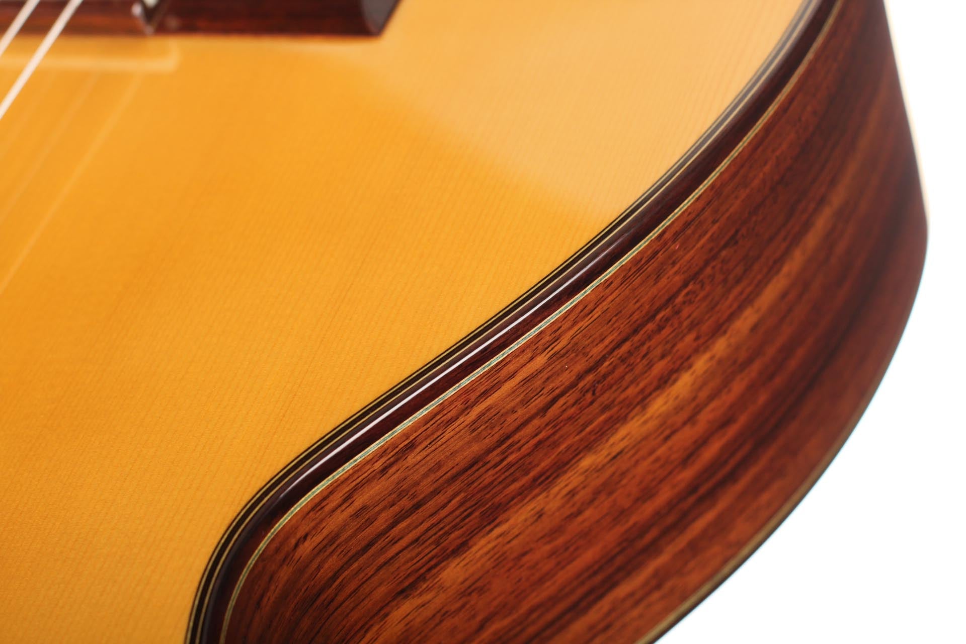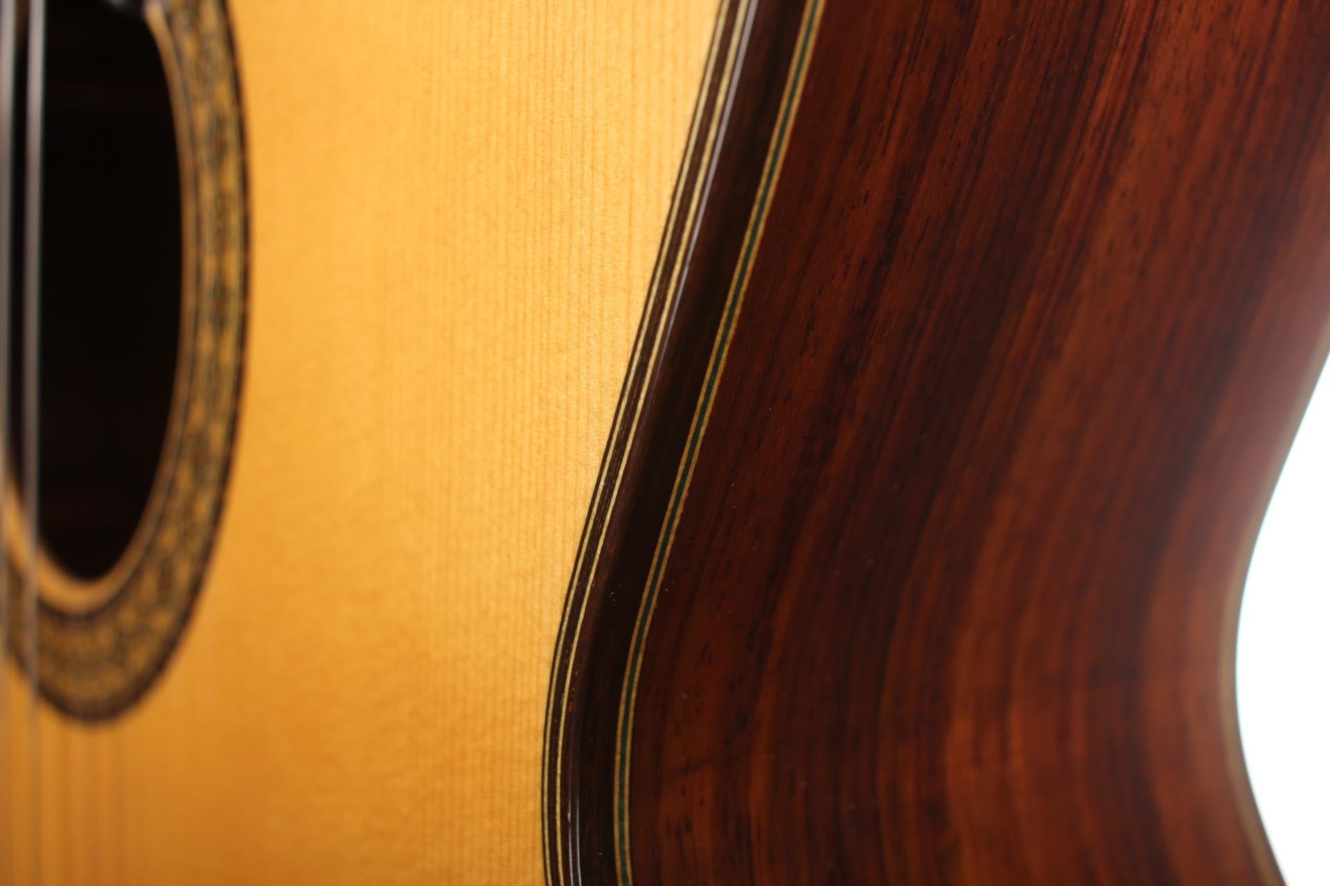 About the guitar: This Concert-R model was made by So Kimishima. He is the grandson of Masaru Kohno and the nephew of Masaki Sakurai, and he has worked for over 10 years as a luthier in the Sakurai workshop. The spruce top of this beautiful guitar and the red-hued Indian Rosewood back and sides give the guitar a warm, appealing appearance. The rosewood binding and back strip are embedded between two plain green stripes. The sound is warm but forceful with pearly trebles, and it has an excellent response. The tuners are made by Fustero. A hard-shell case is included.