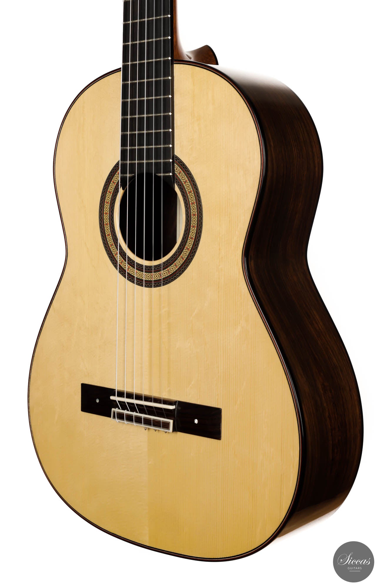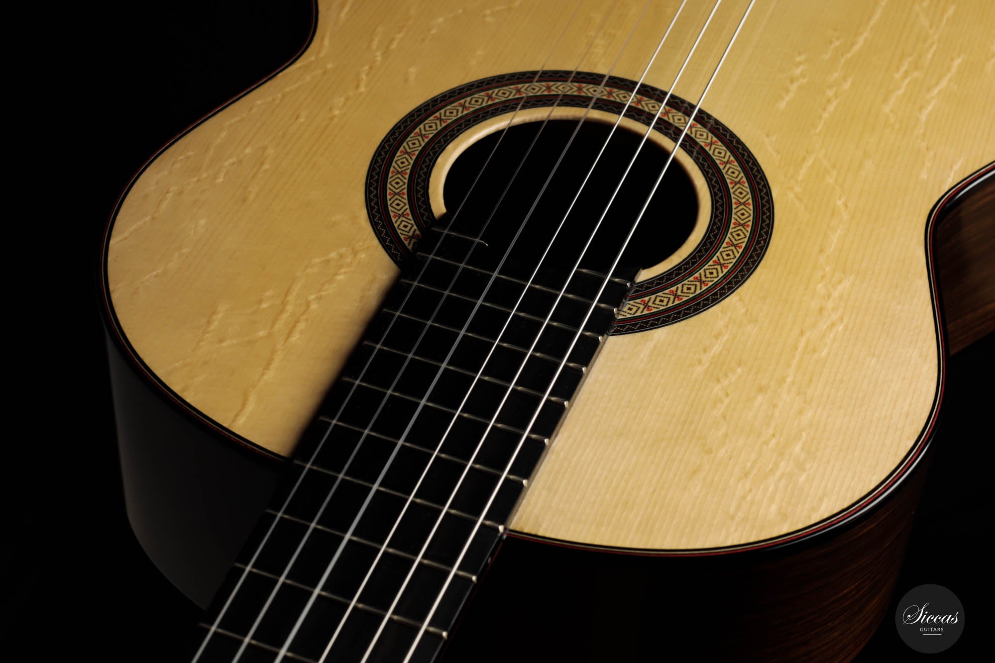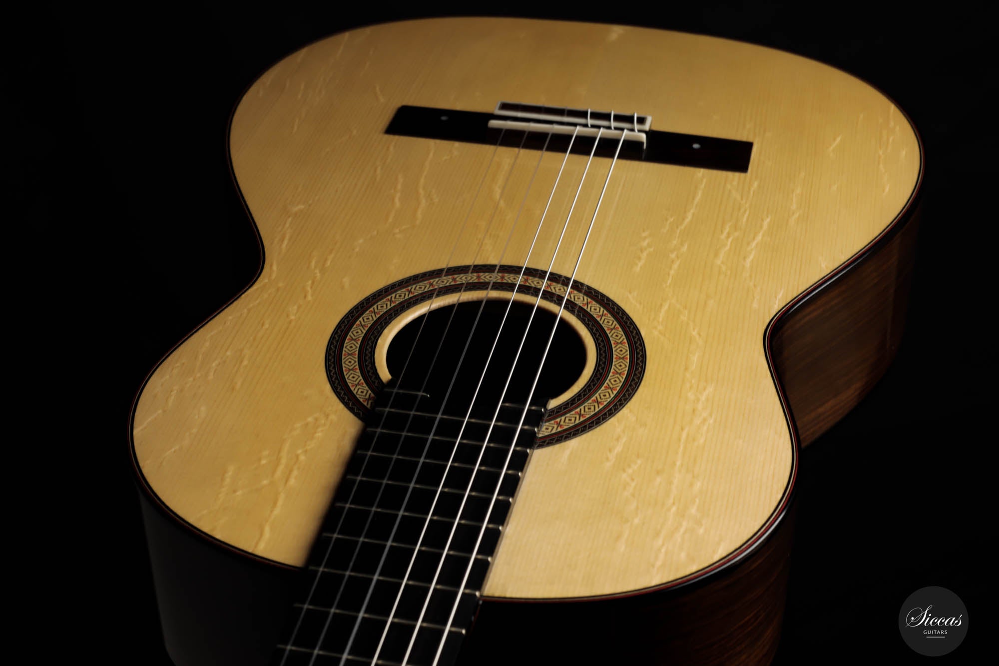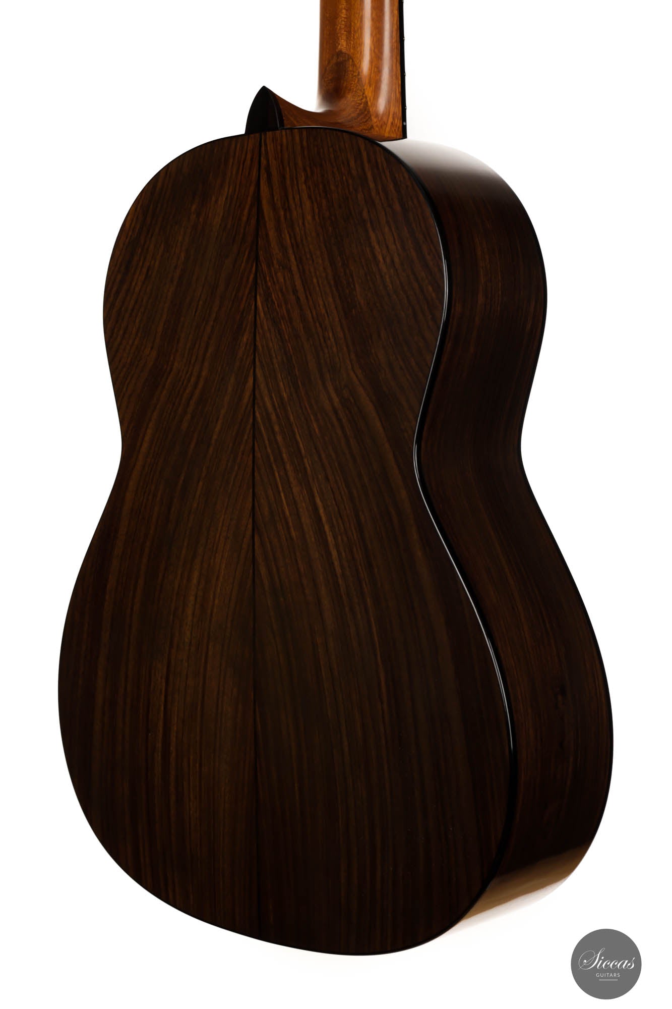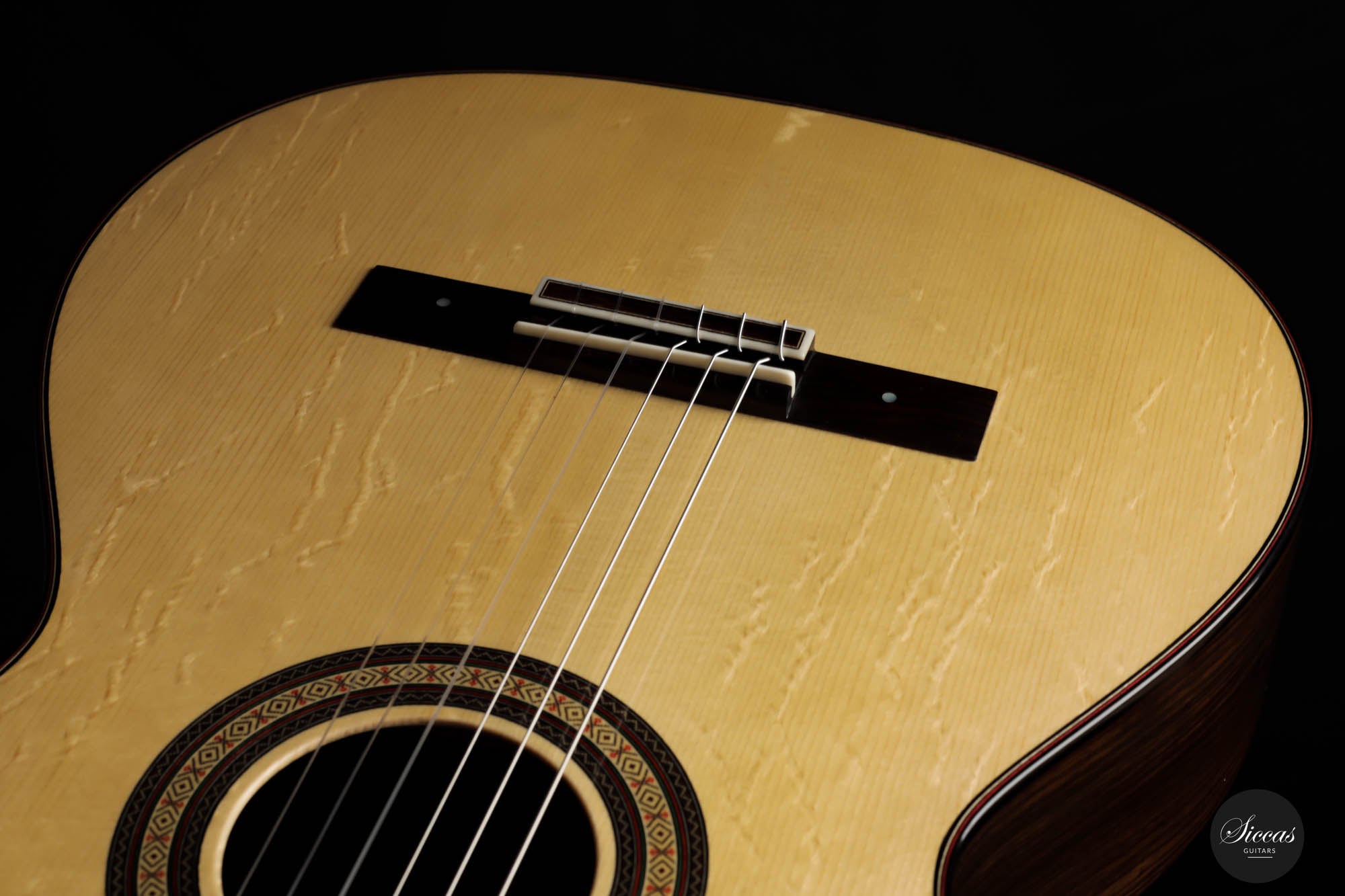 The simplicity of the decoration, yet its traditional solid influence, gives it an affirmed aesthetic. With its striking Bearclaw spruce soundboard, fan bracing system, Indian rosewood back and sides, 65 cm scale, and weight of around 1600 grams, it is an excellent allrounder classical guitar for an ambitious player. Furthermore, this instrument has a beautiful lyricism in its voicing, which makes playing this guitar very enjoyable.