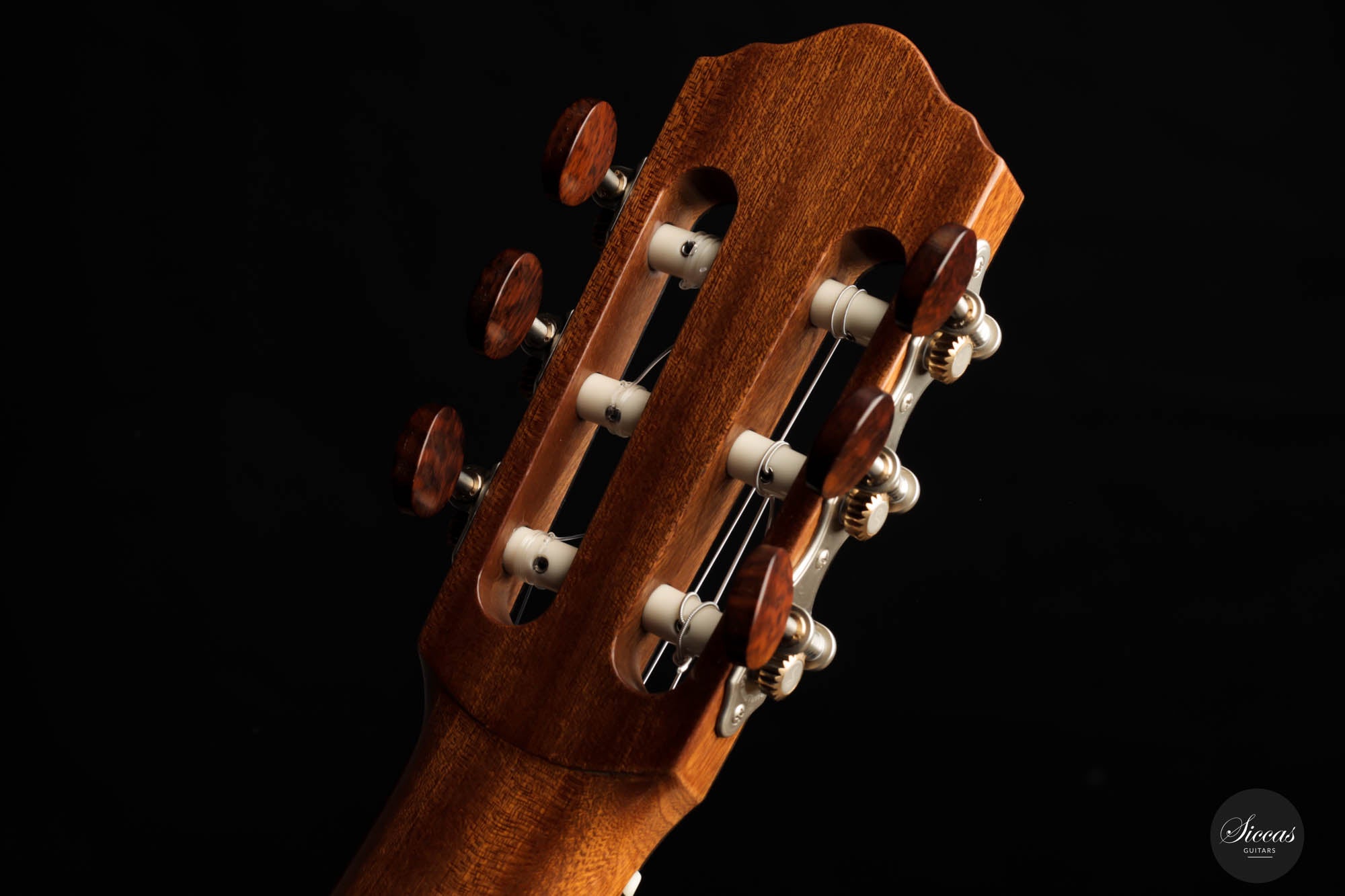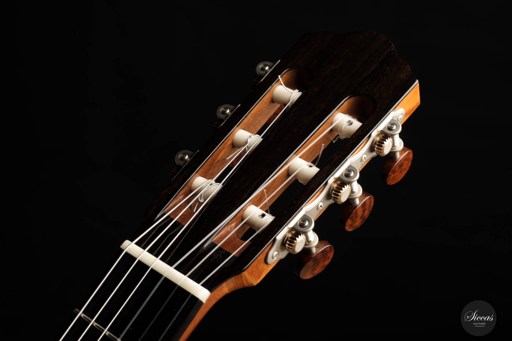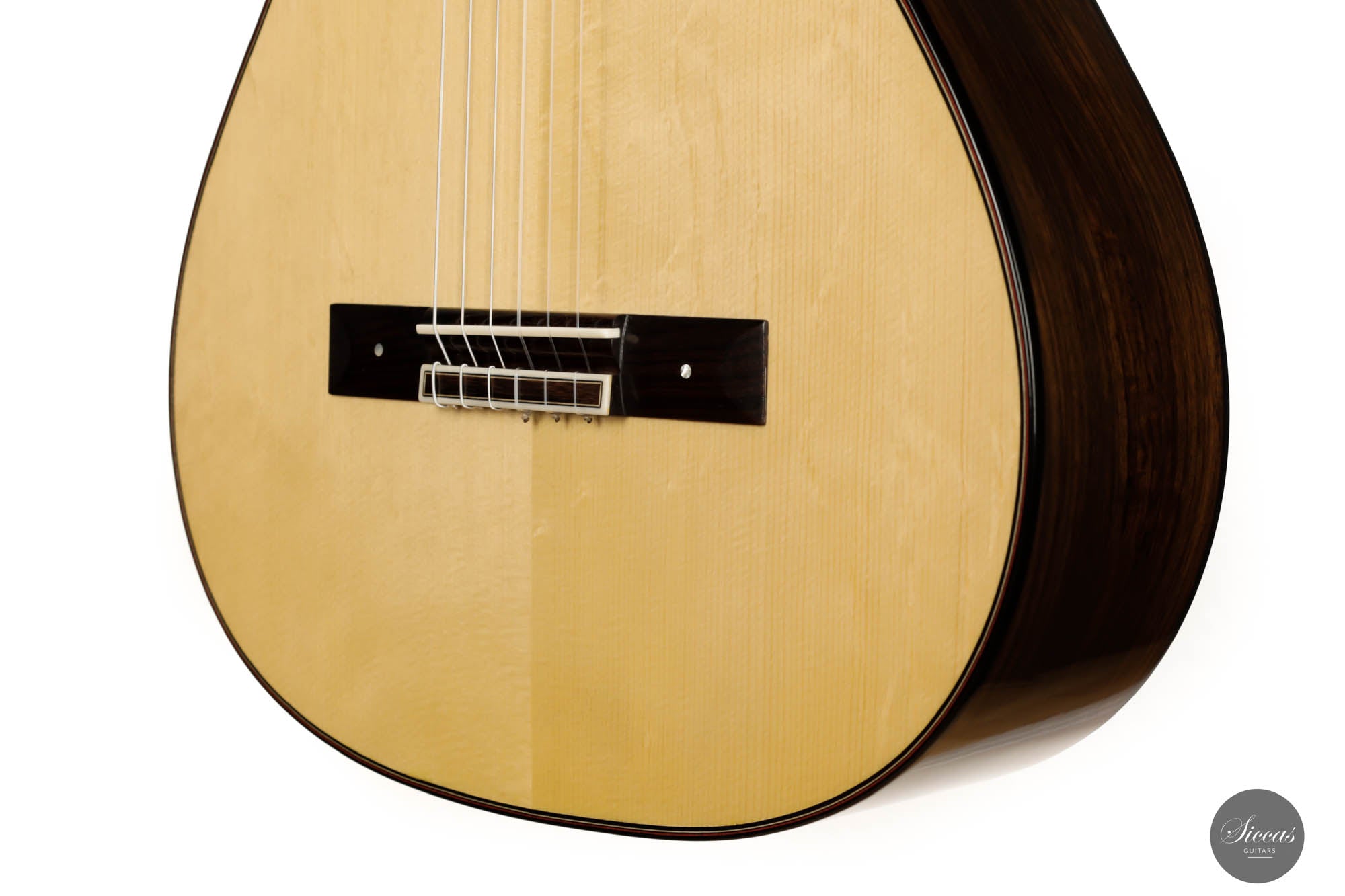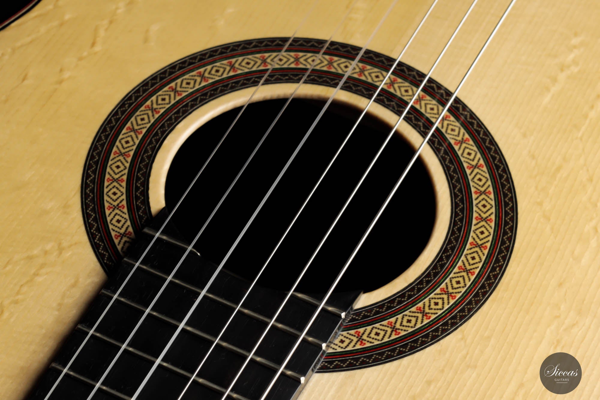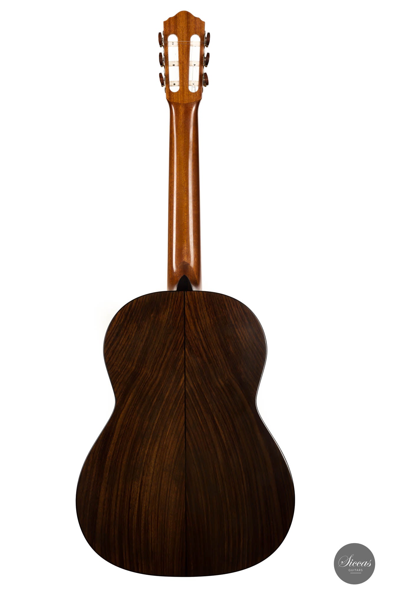 The simplicity of the decoration, yet its traditional solid influence, gives it an affirmed aesthetic. With its striking Bearclaw spruce soundboard, fan bracing system, Indian rosewood back and sides, 65 cm scale, and weight of around 1600 grams, it is an excellent allrounder classical guitar for an ambitious player. Furthermore, this instrument has a beautiful lyricism in its voicing, which makes playing this guitar very enjoyable.