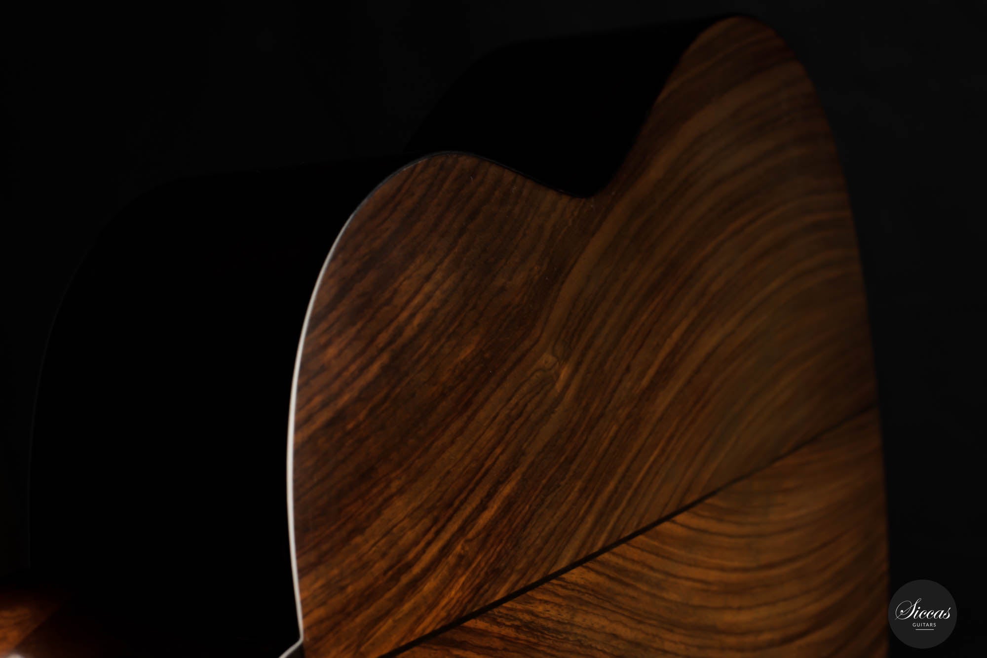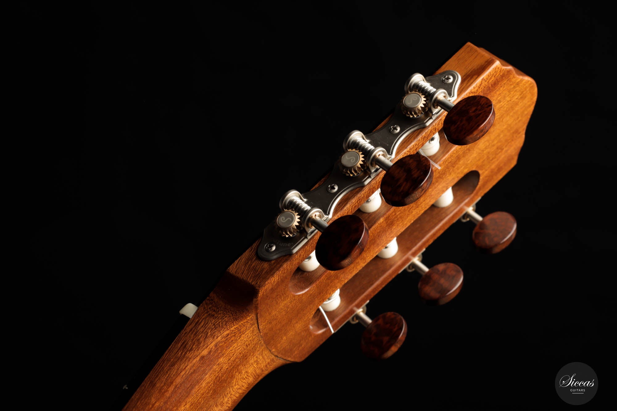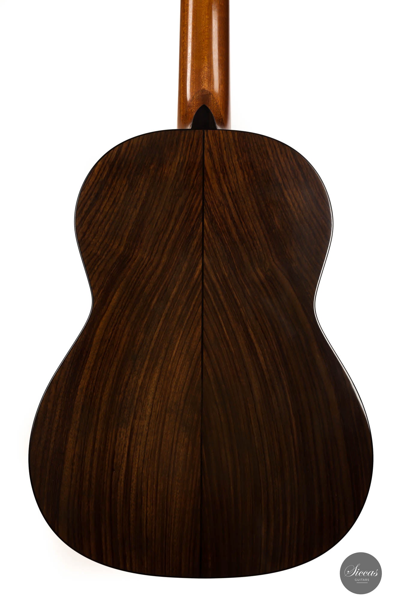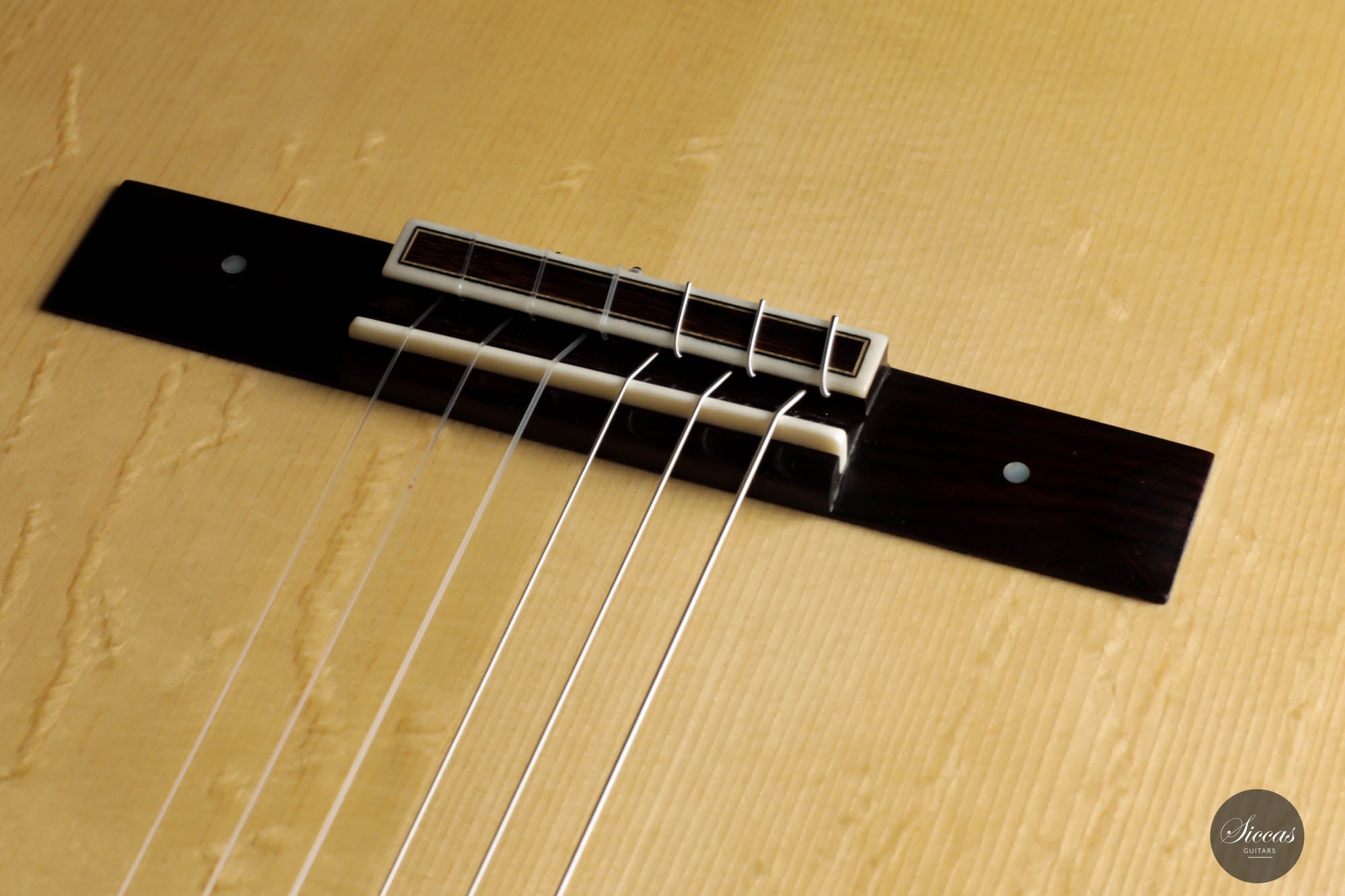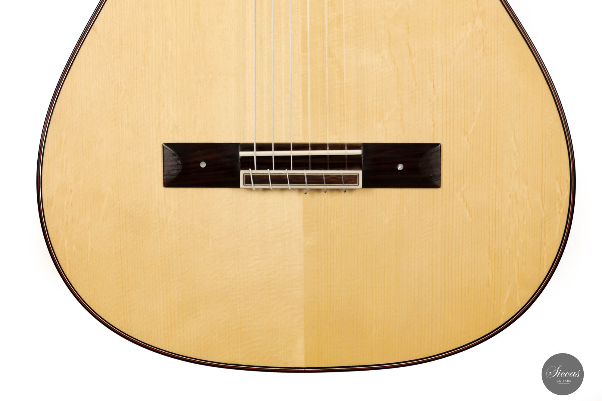 The simplicity of the decoration, yet its traditional solid influence, gives it an affirmed aesthetic. With its striking Bearclaw spruce soundboard, fan bracing system, Indian rosewood back and sides, 65 cm scale, and weight of around 1600 grams, it is an excellent allrounder classical guitar for an ambitious player. Furthermore, this instrument has a beautiful lyricism in its voicing, which makes playing this guitar very enjoyable.