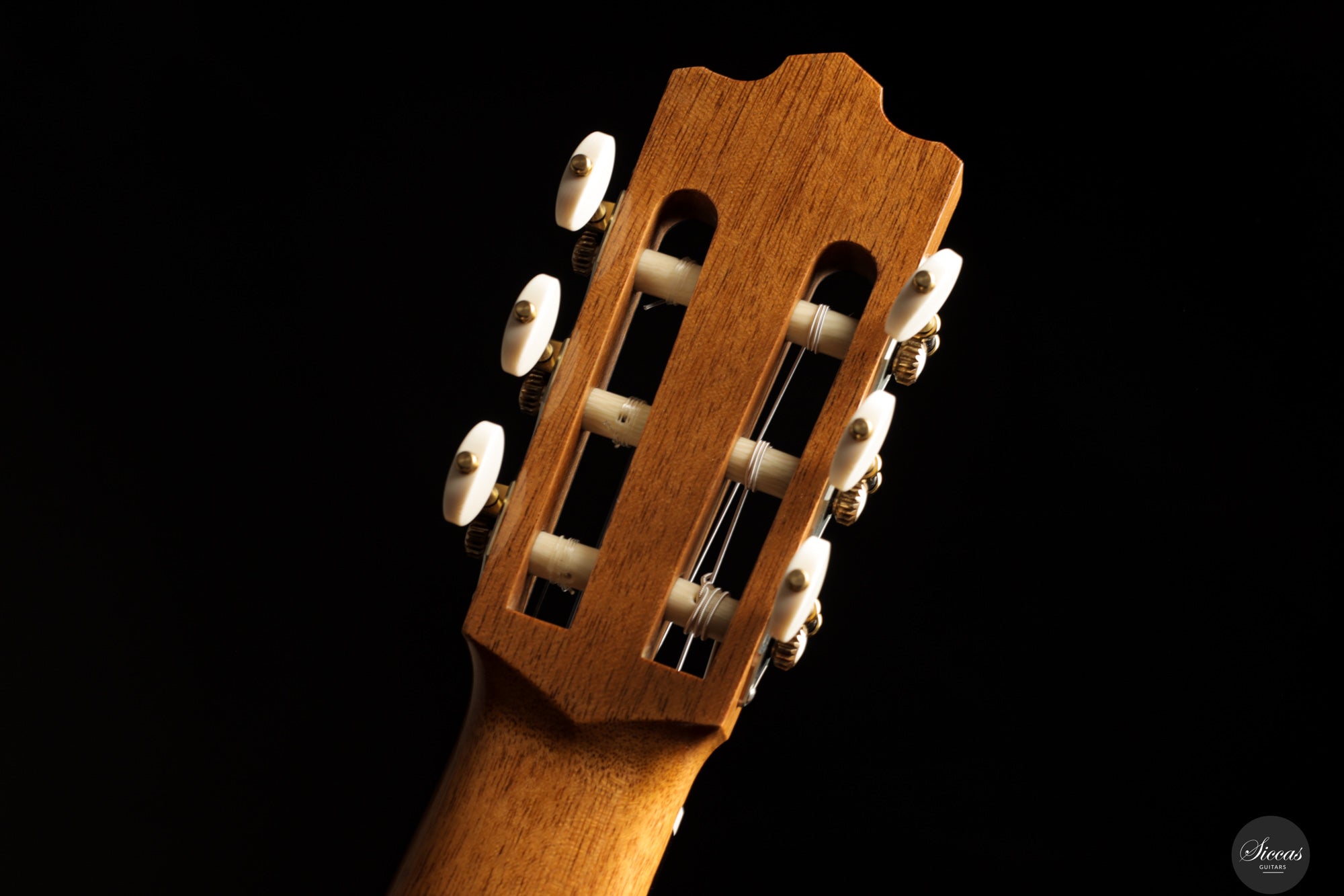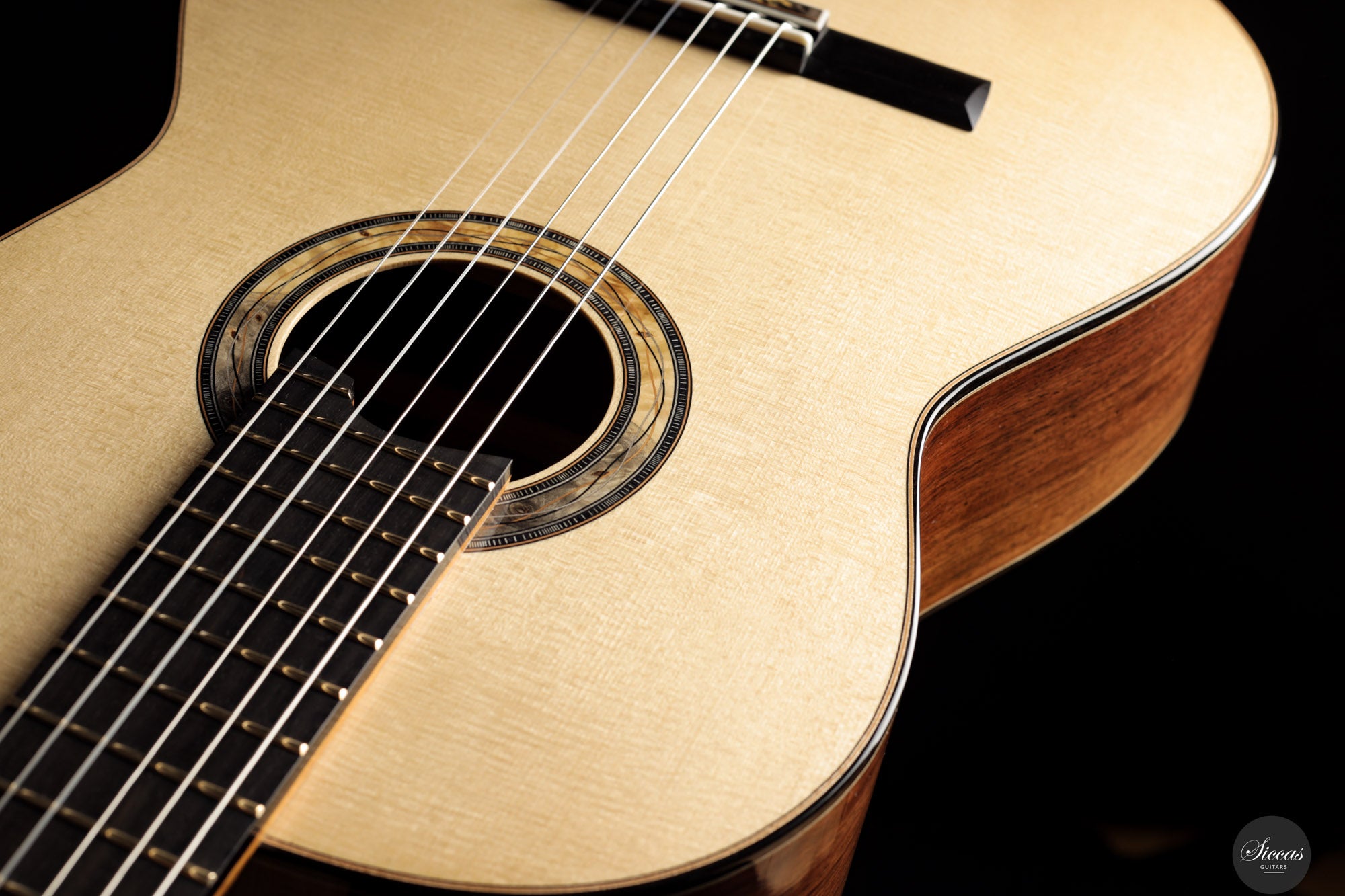 Tonally, the guitar has a warm, enveloping voice with deep basses and a responsive, singing treble. Its sustain is long and clean, especially in the upper register, and the tonal balance remains consistent across dynamics. Separation between voices is excellent, and the instrument’s light build contributes to a quick and expressive response, particularly appealing to players seeking both sensitivity and projection.