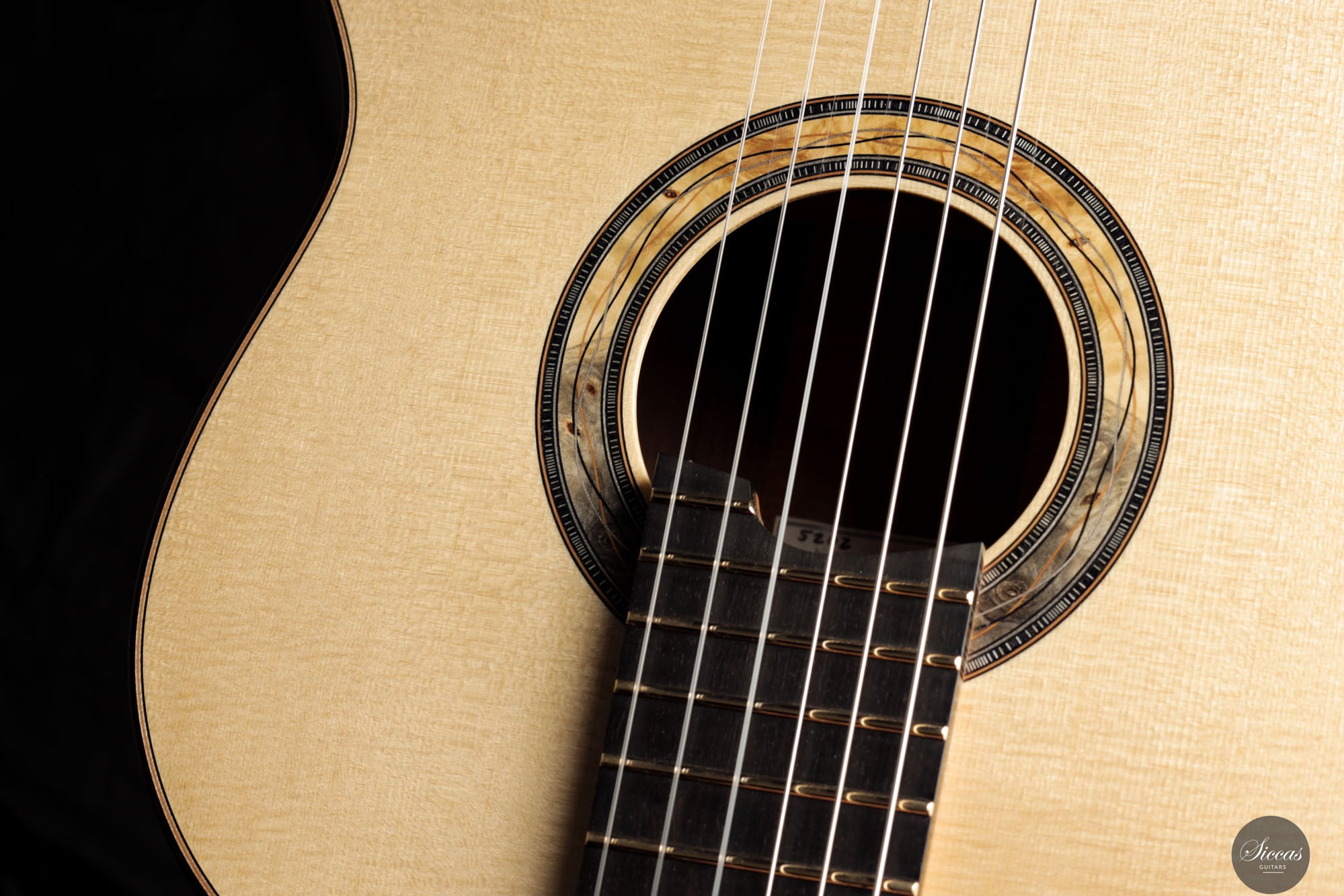 One of the standout features of this guitar is its intricate “New Waves” rosette. It combines California buckeye burl, a rare native American species, with pearwood and dyed koto, forming a visually striking, almost topographic pattern. This motif is echoed in the matte-finished bridge, carved from ebonized rosewood, whose dark tone flows naturally into the fingerboard and the headstock veneer, giving the entire instrument a visual unity and compositional elegance. The bindings are ebony, and the guitar is fitted with Barnett tuning machines and Jescar EVO Gold fretwire.
