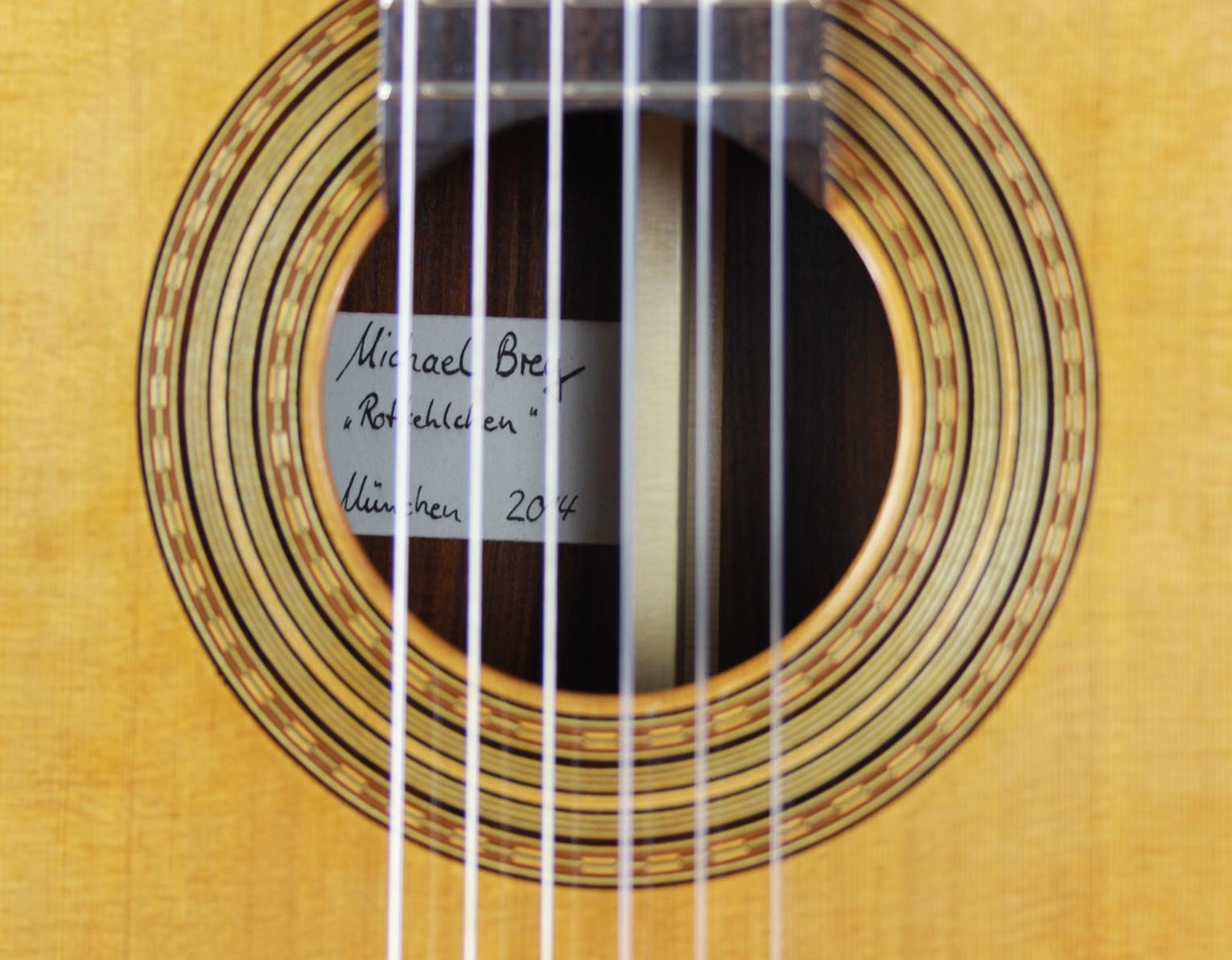 Michael Brey, born in 1966, initially learned his craft from Peter Barton in England during the years from 1994 to 1996. In the following years he worked for a repairshop, a guitar dealer and a violin maker in Munich. In 2007 he opened his own workshop in Munich. In the beginning, besides doing repair and restoration work, he built classical as well as archtop guitars. Nowadays he has completely dedicated himself to the traditional Spanish guitar in the style of Antonio de Torres, without just copying them however. A distinctive feature of his guitars is a stabilizing strut between the heel block and the endblock which reduces the tension in the top and back plates in order to enhance the sustain. For the fretboard Michael Brey prefers to use Indian Rosewood. This is giving the guitar a slightly warmer tone and the lighter weight makes for a well balanced instrument. His guitars are completely handmade and finished with a high quality French polish. This guitar is built out of fine grained cedar and a beautiful set of Pao Ferro, both 30 years old. The binding is figured maple. The air body resonance is F# and the guitar has a full bodyed, warm tone and good volume.