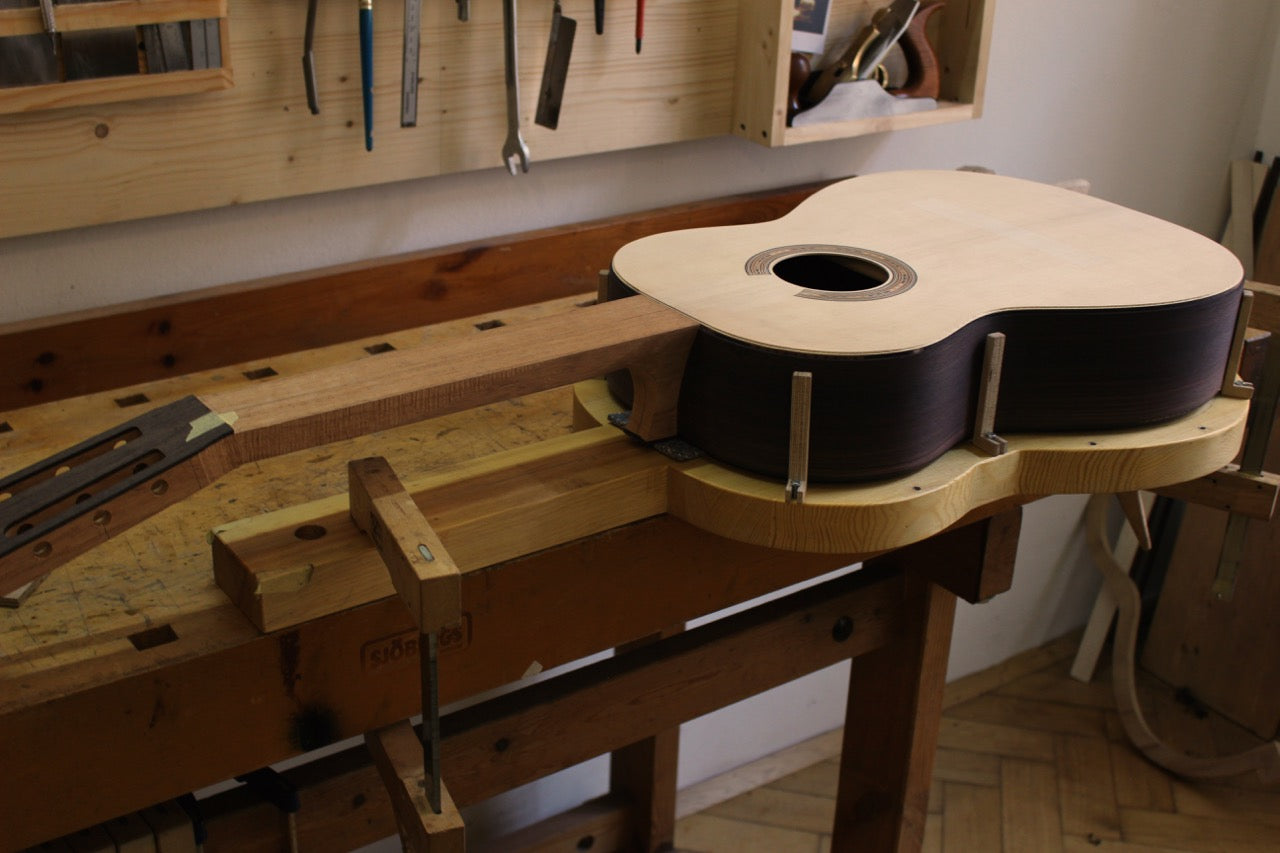 Michael Cadiz is native from Seattle, Washington, and recently moved his workshop to Graz, Austria. He is a mostly self-taught luthier, but feels profoundly grateful for Robert Ruck, who invited him to stay for a while in his workshop to share his philosophy and approach to guitar building. He also received a great support from the Seattle builders Rick Davis and Greg Oxrieder.