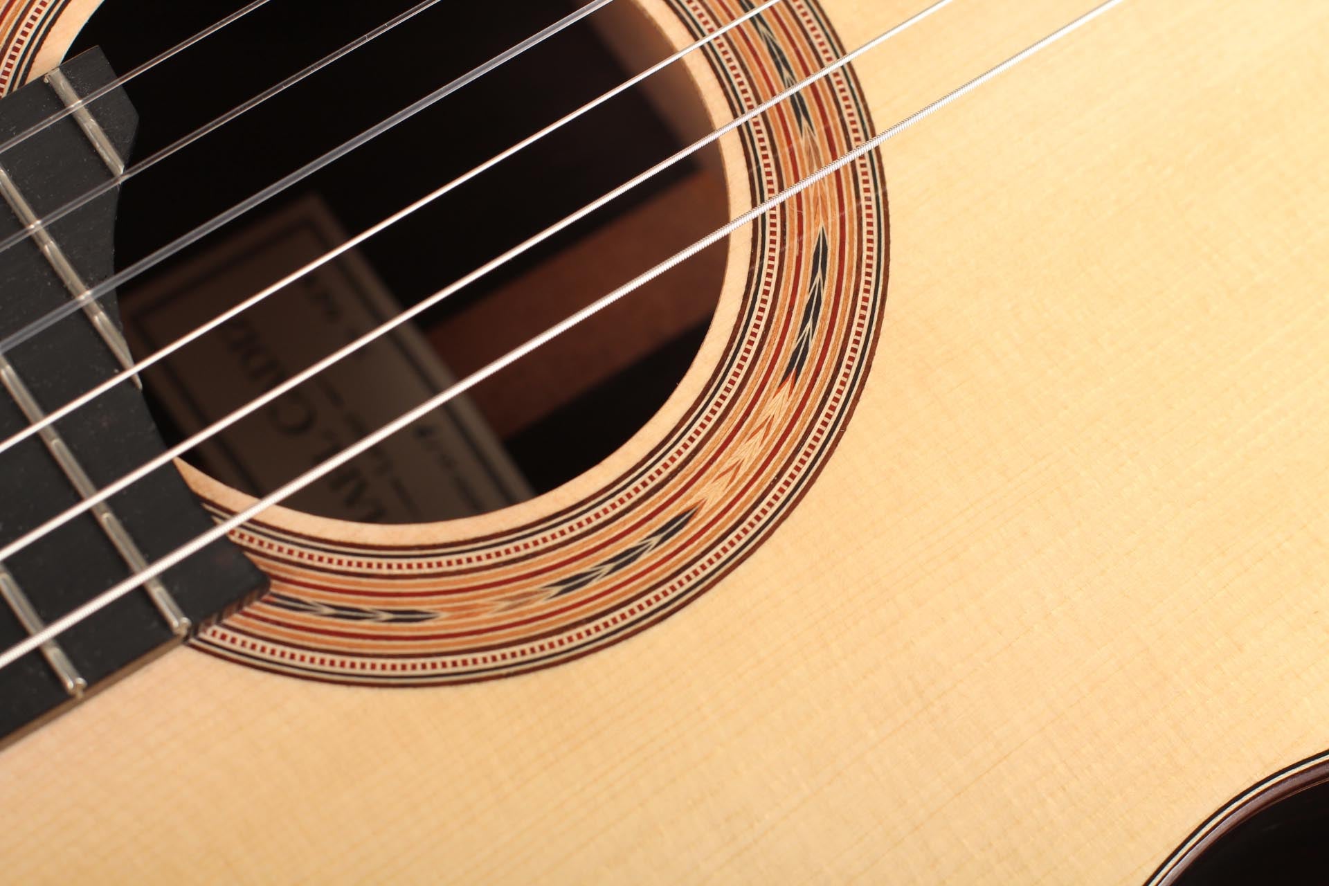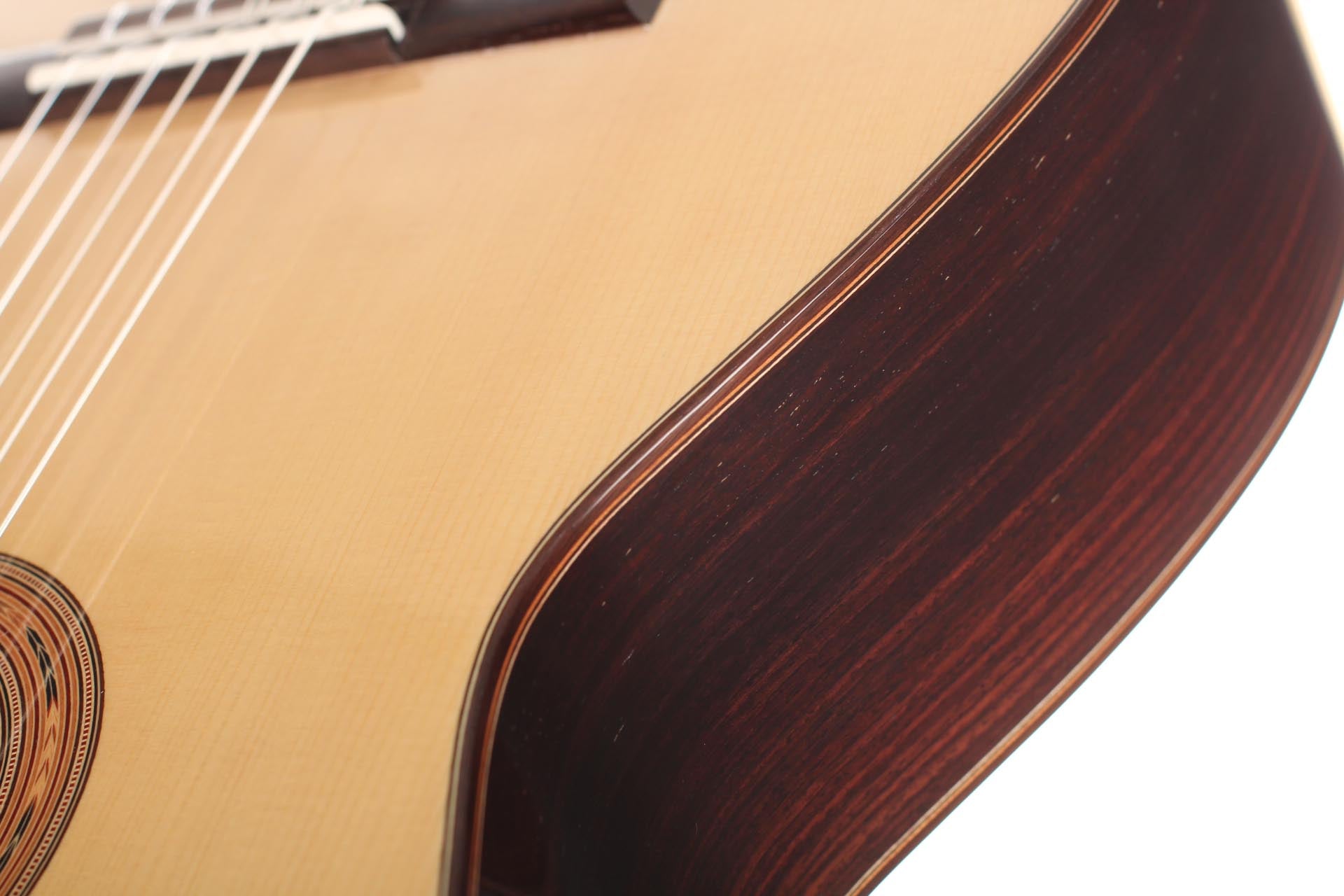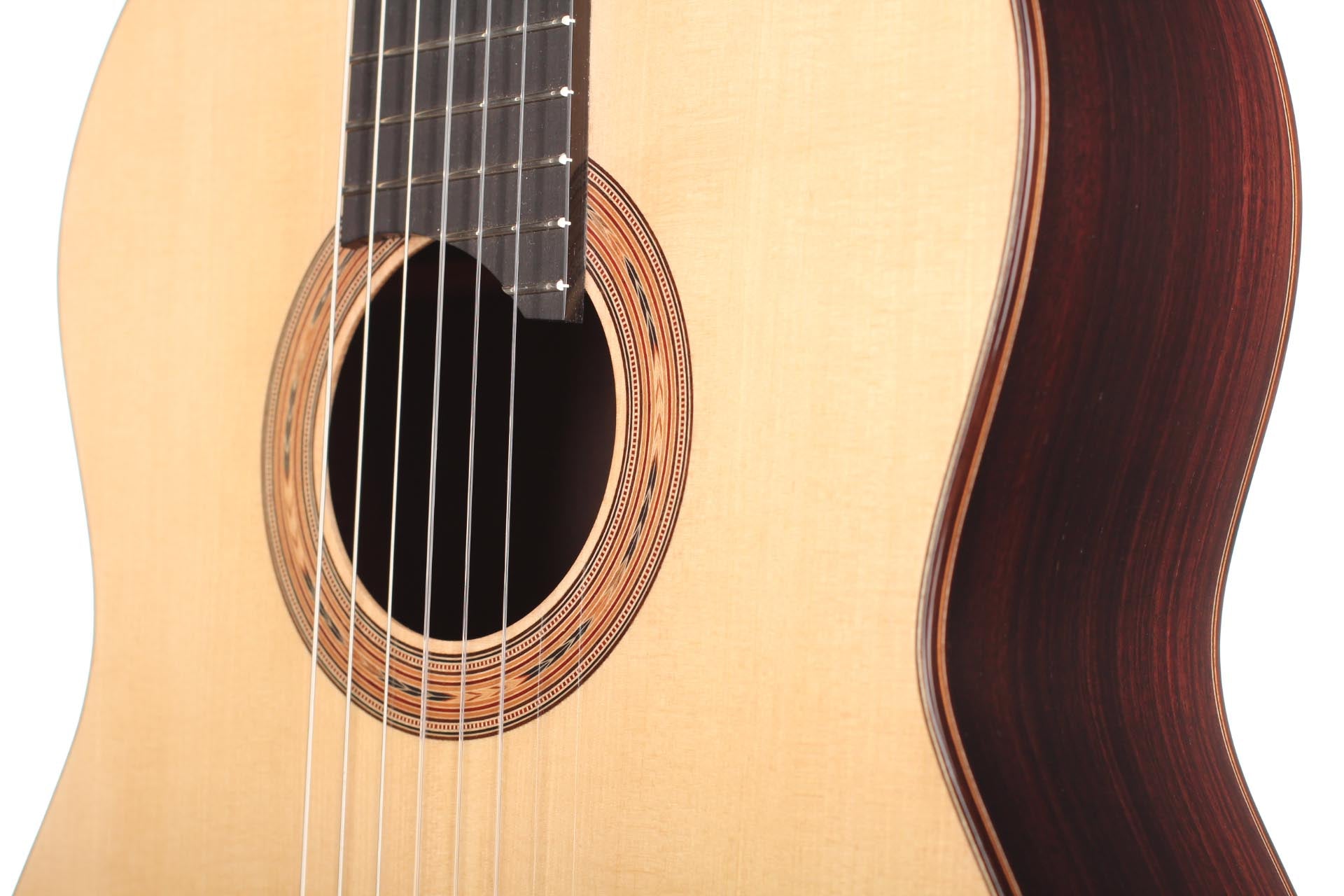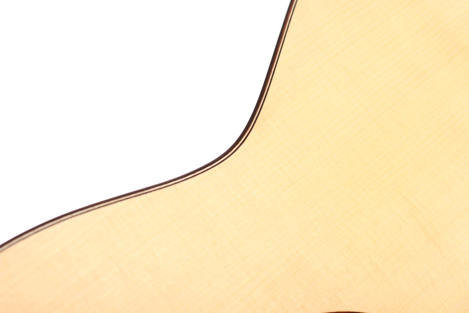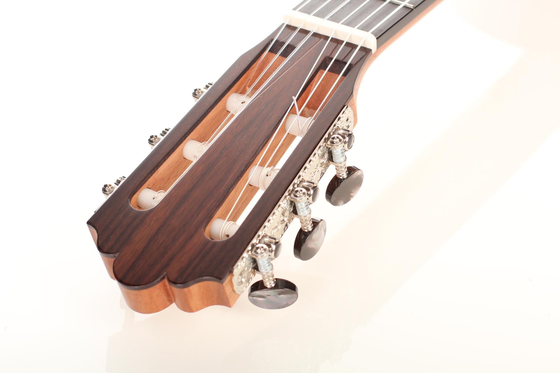 This is a subtle and fine guitar with a great delicacy in the craftmanship. Its design reminds the great master-instruments of the nineteenth century, where all the beauty stands in skilful details. The sound of this guitar concord with its appearance. It is a sincere guitar with a defined attack, a great balance and a fine separation between the voices. This instrument has a clear sound projection thanks to the purity of its tone and the immediate sound production of the spruce-top. It is a great instrument for a mindful guitar player seeking for a subtle and truthful guitar. The tuning machines are Rubner superior series with roller bearings and black mother of pearl buttons. A Hiscox Pro II case is included.