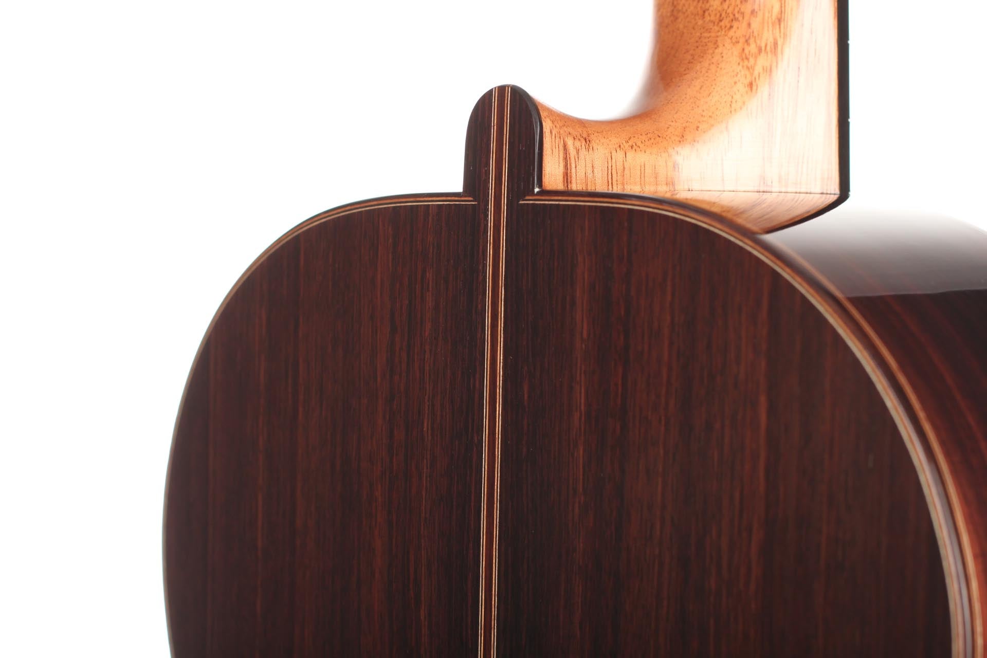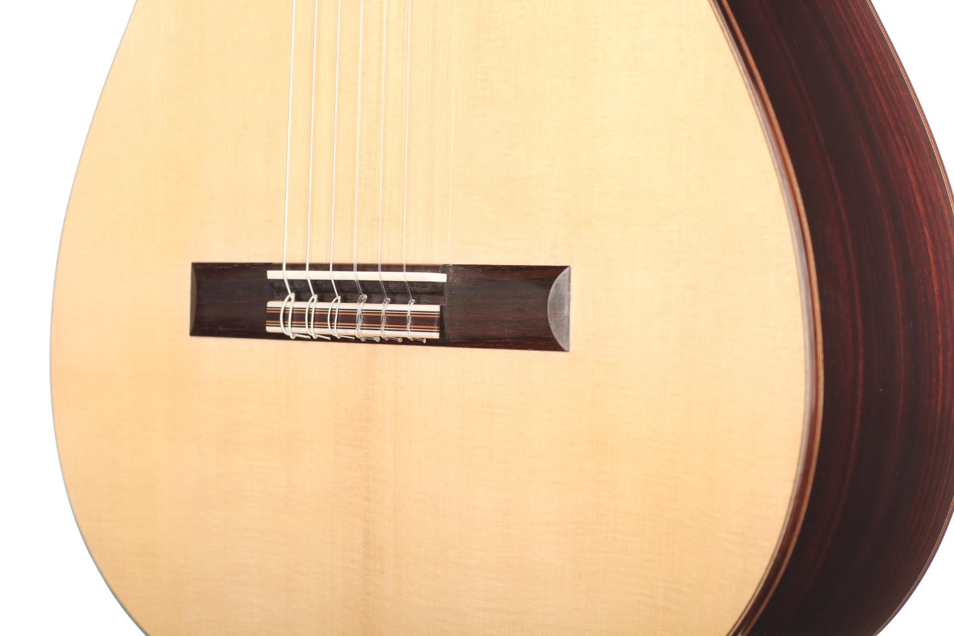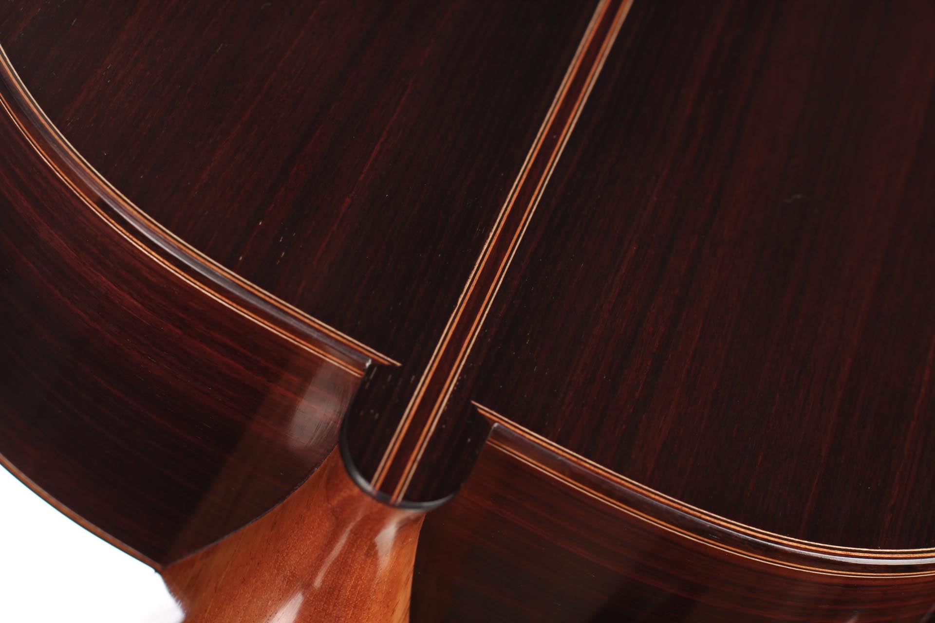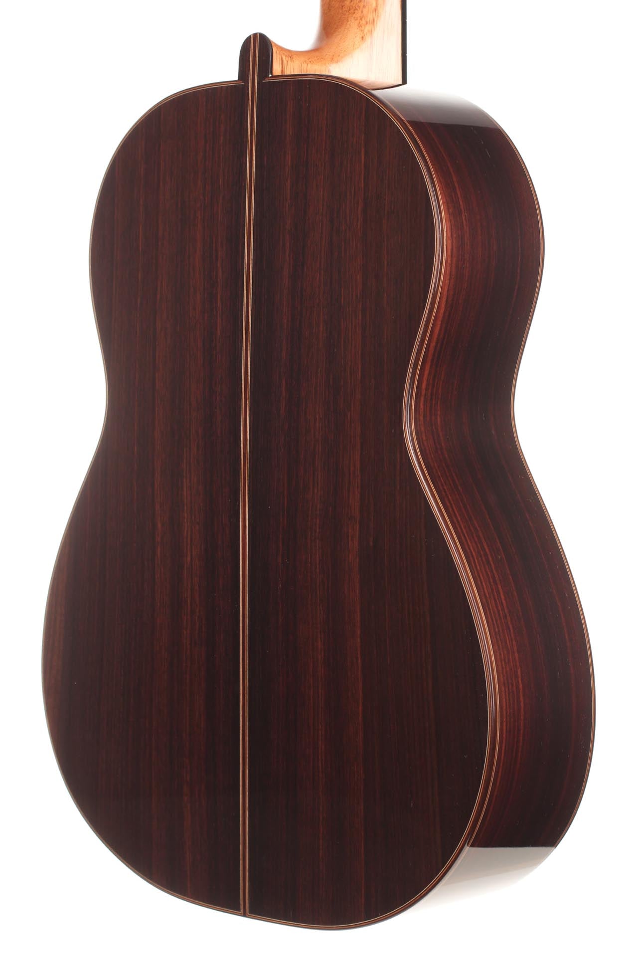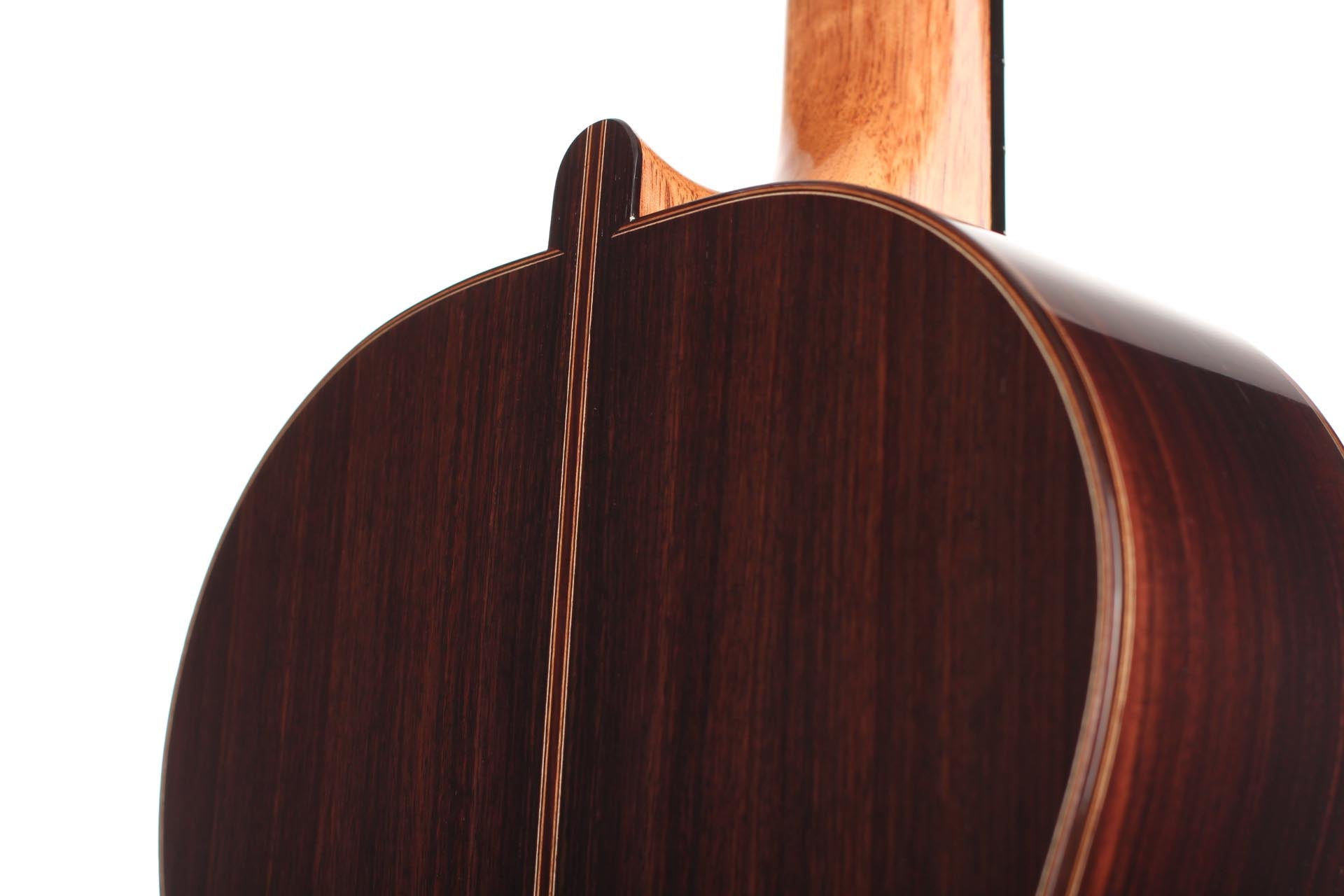 This is a subtle and fine guitar with a great delicacy in the craftmanship. Its design reminds the great master-instruments of the nineteenth century, where all the beauty stands in skilful details. The sound of this guitar concord with its appearance. It is a sincere guitar with a defined attack, a great balance and a fine separation between the voices. This instrument has a clear sound projection thanks to the purity of its tone and the immediate sound production of the spruce-top. It is a great instrument for a mindful guitar player seeking for a subtle and truthful guitar. The tuning machines are Rubner superior series with roller bearings and black mother of pearl buttons. A Hiscox Pro II case is included.
