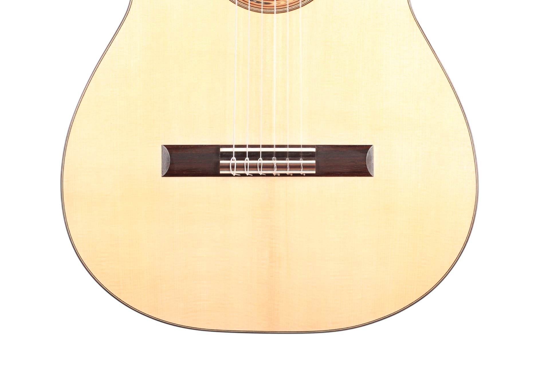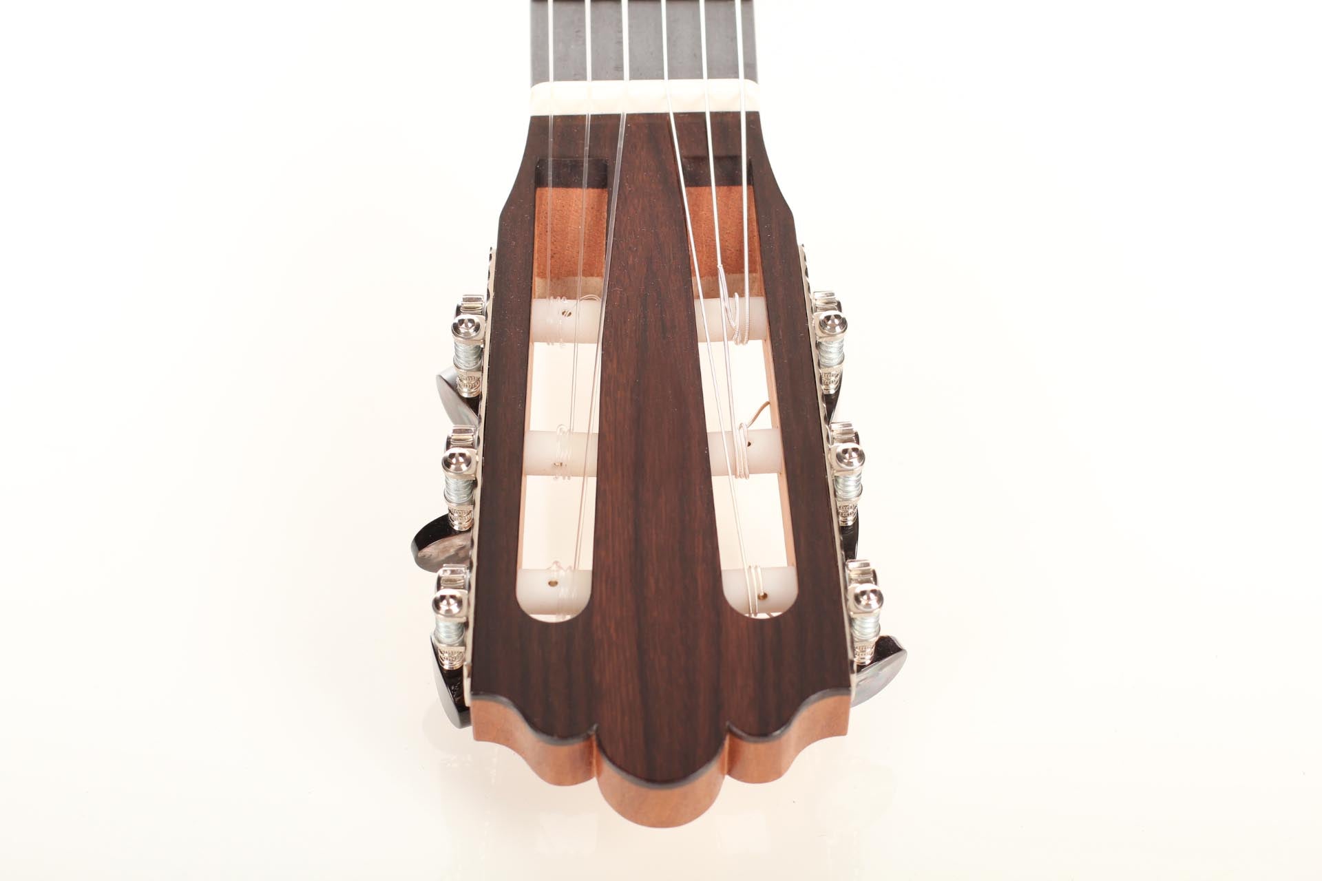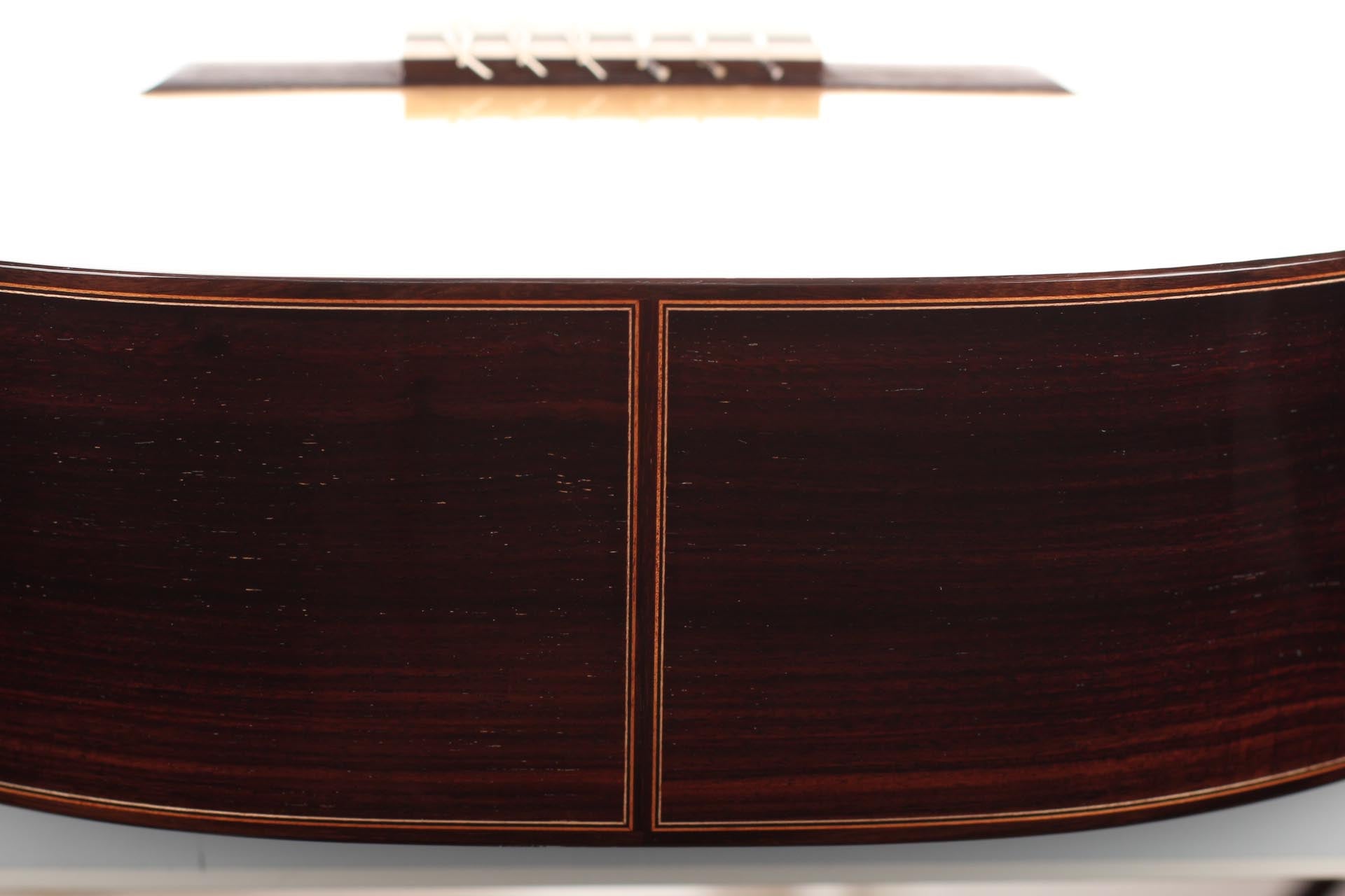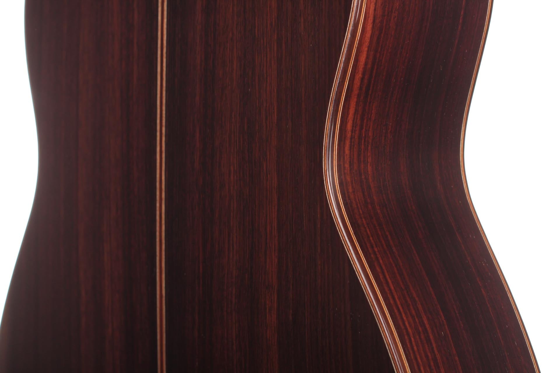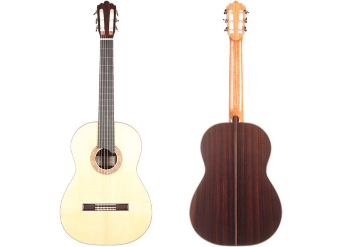 This is a subtle and fine guitar with a great delicacy in the craftmanship. Its design reminds the great master-instruments of the nineteenth century, where all the beauty stands in skilful details. The sound of this guitar concord with its appearance. It is a sincere guitar with a defined attack, a great balance and a fine separation between the voices. This instrument has a clear sound projection thanks to the purity of its tone and the immediate sound production of the spruce-top. It is a great instrument for a mindful guitar player seeking for a subtle and truthful guitar. The tuning machines are Rubner superior series with roller bearings and black mother of pearl buttons. A Hiscox Pro II case is included.