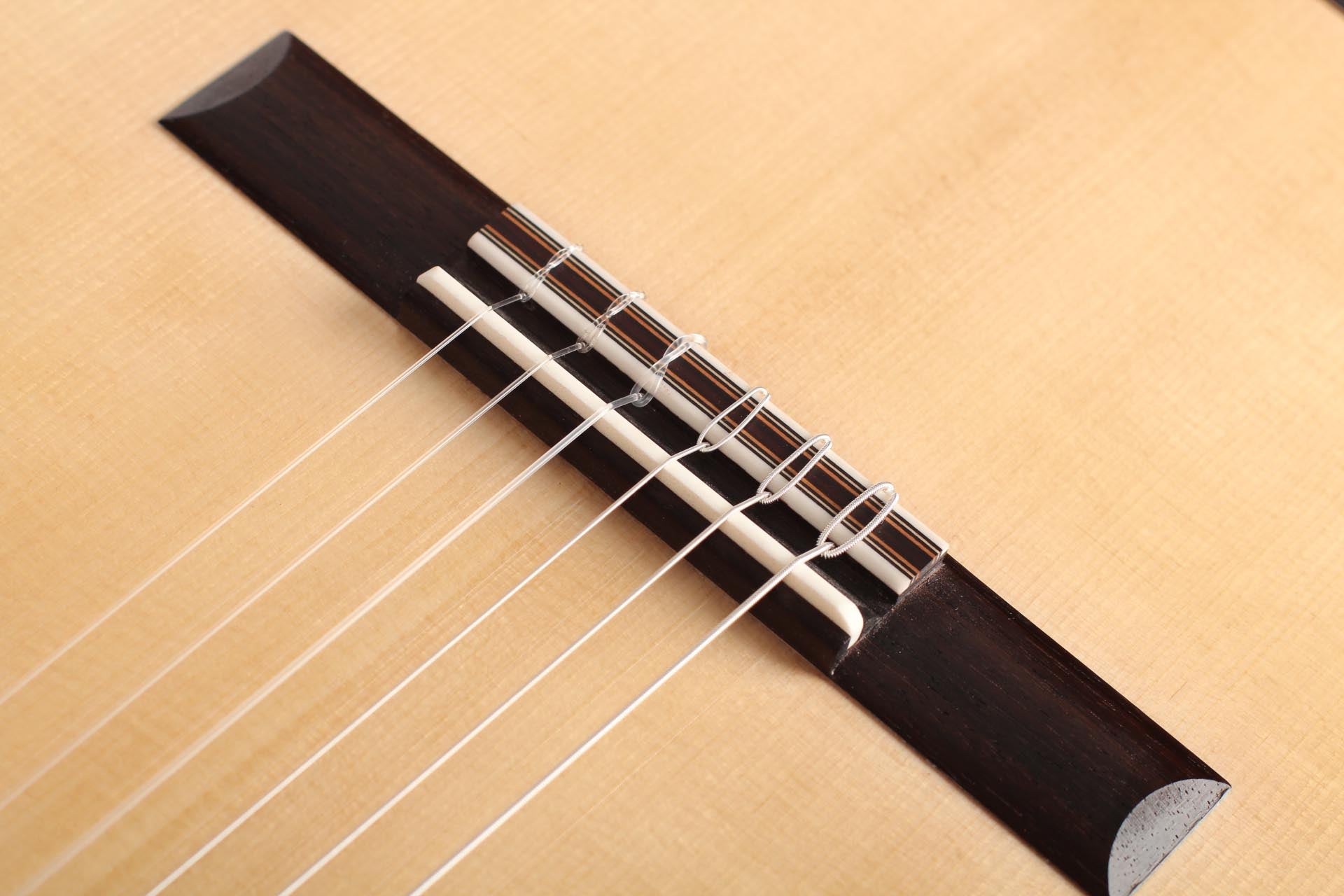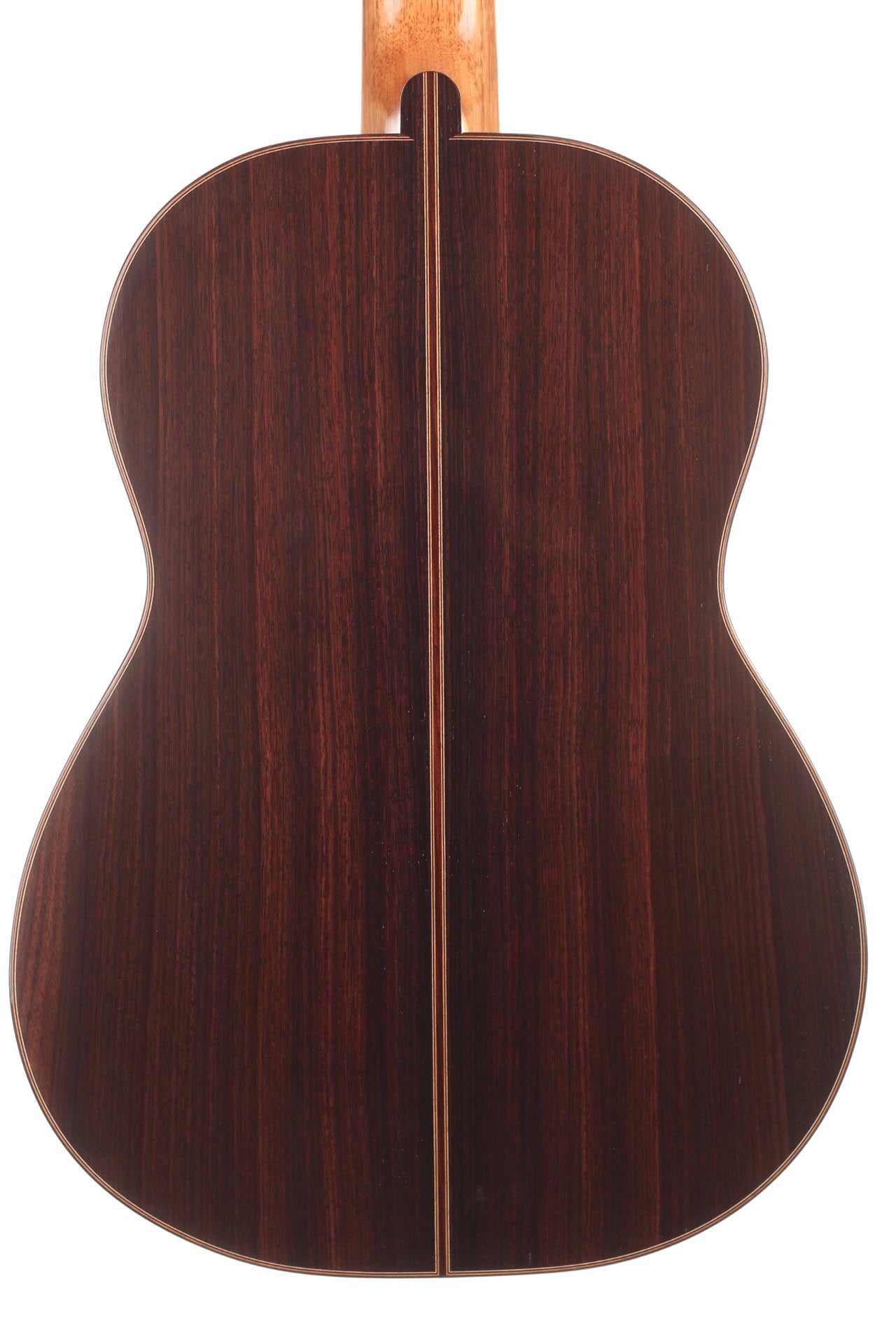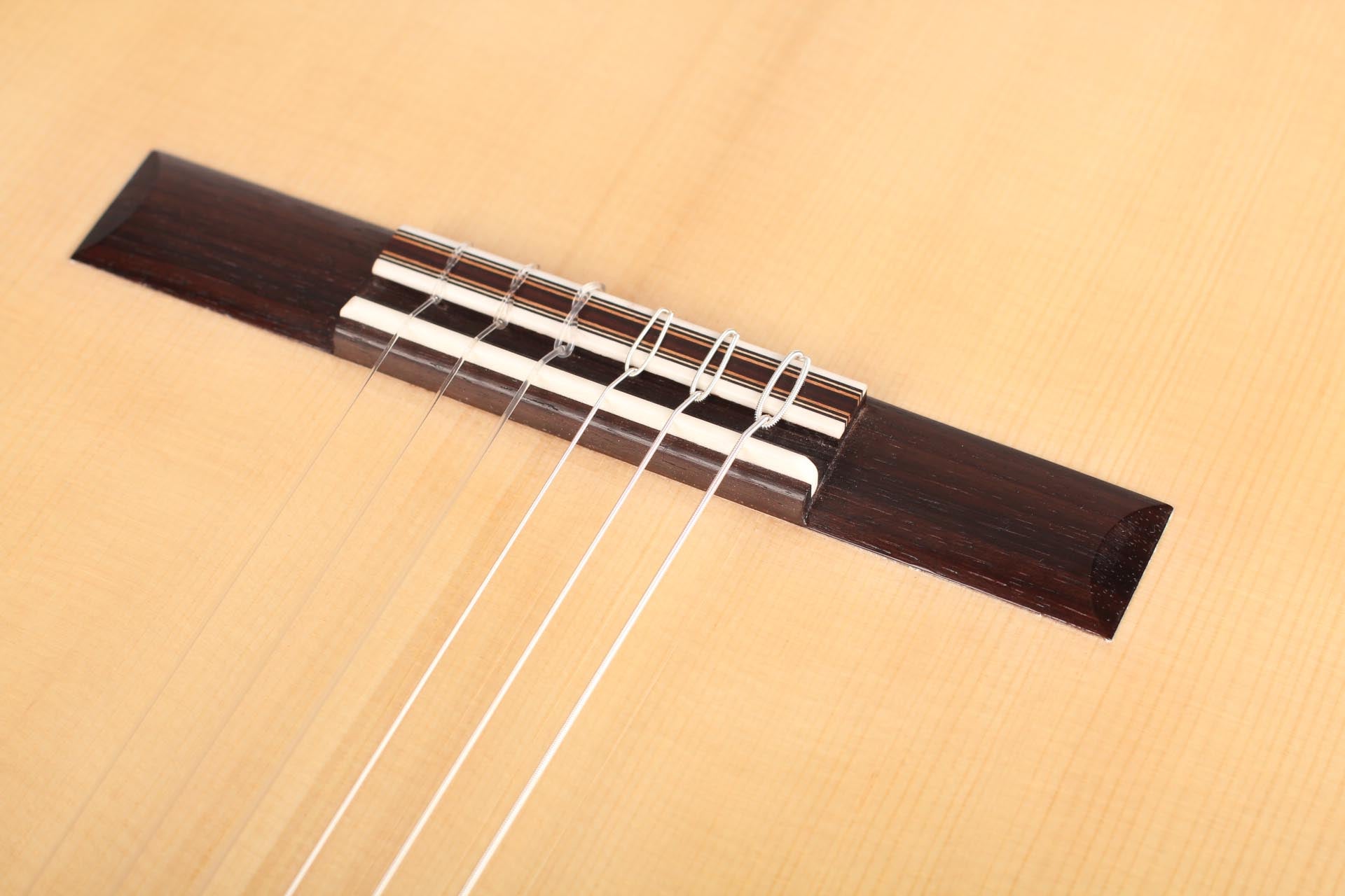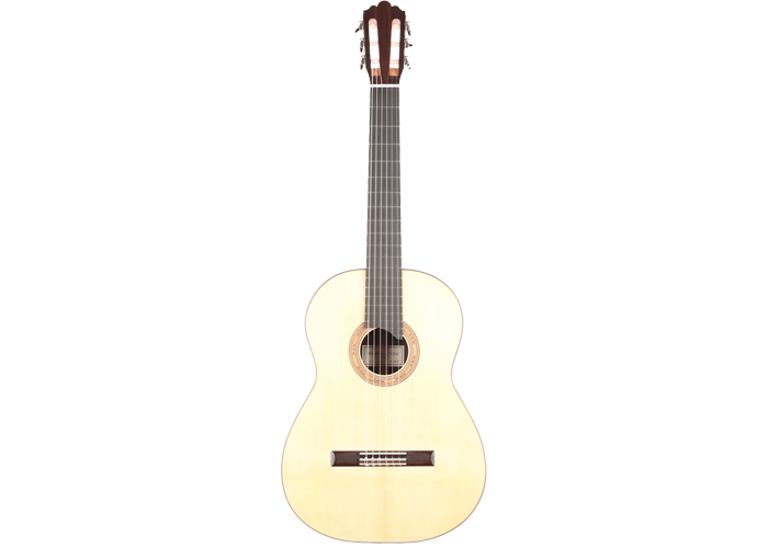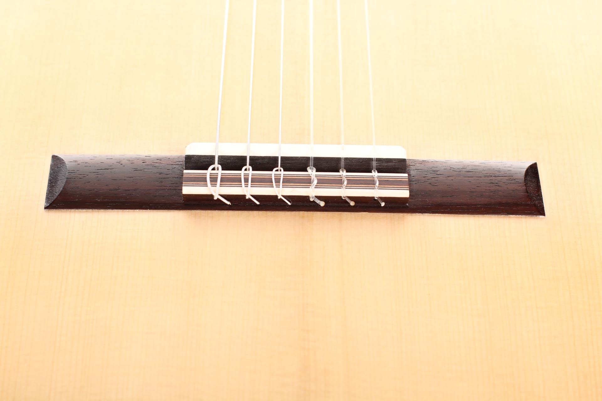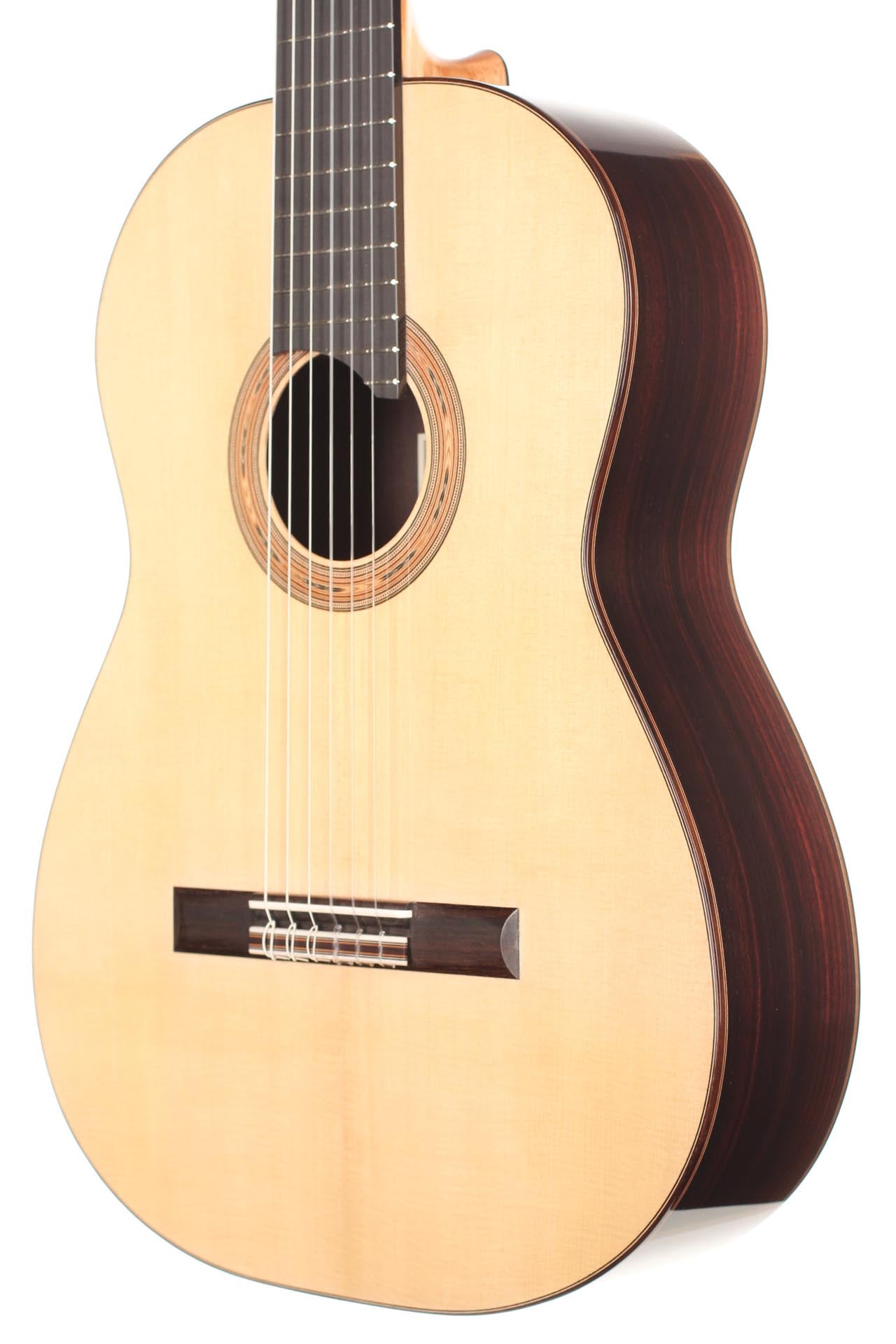 This is a subtle and fine guitar with a great delicacy in the craftmanship. Its design reminds the great master-instruments of the nineteenth century, where all the beauty stands in skilful details. The sound of this guitar concord with its appearance. It is a sincere guitar with a defined attack, a great balance and a fine separation between the voices. This instrument has a clear sound projection thanks to the purity of its tone and the immediate sound production of the spruce-top. It is a great instrument for a mindful guitar player seeking for a subtle and truthful guitar. The tuning machines are Rubner superior series with roller bearings and black mother of pearl buttons. A Hiscox Pro II case is included.