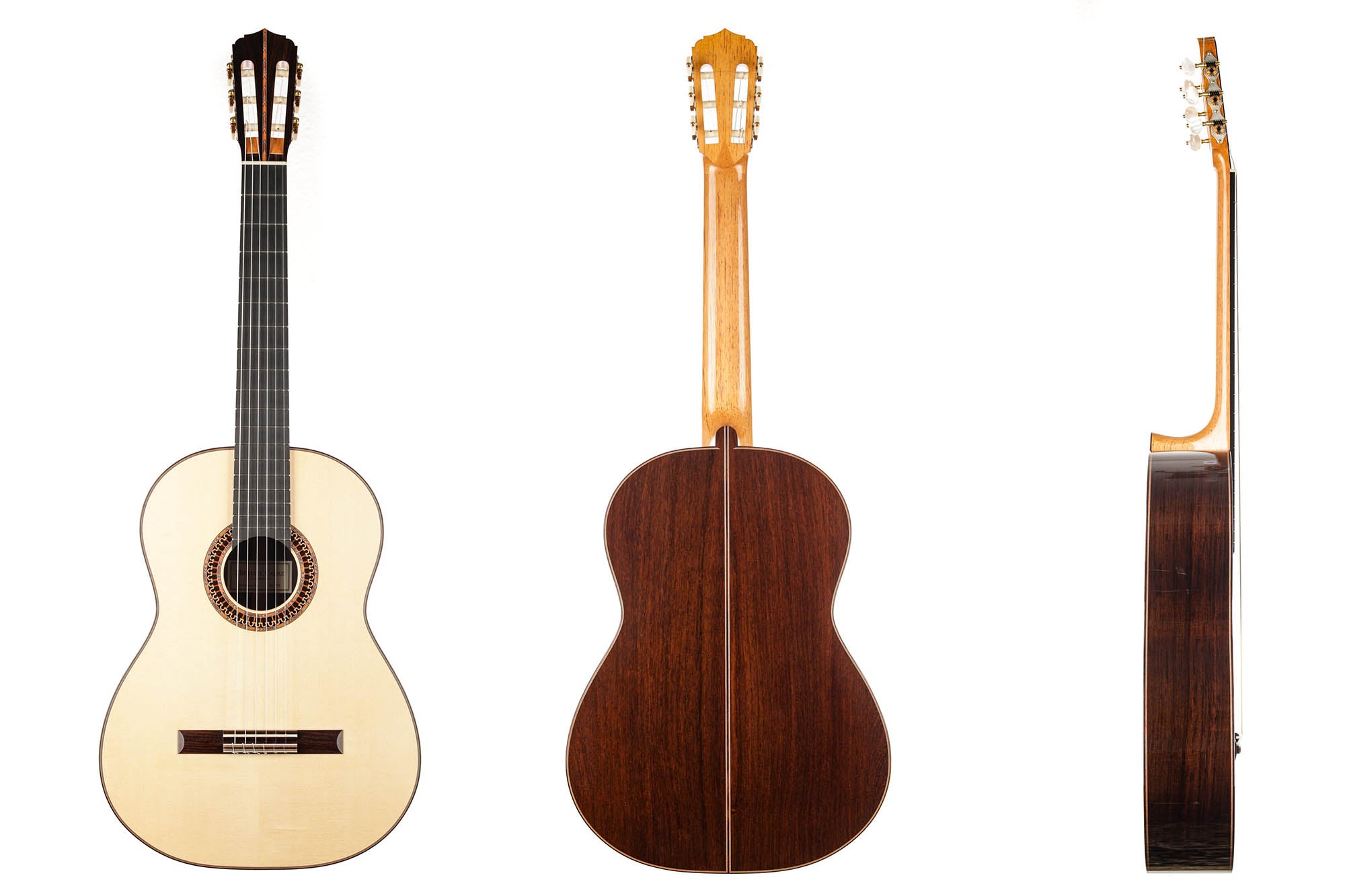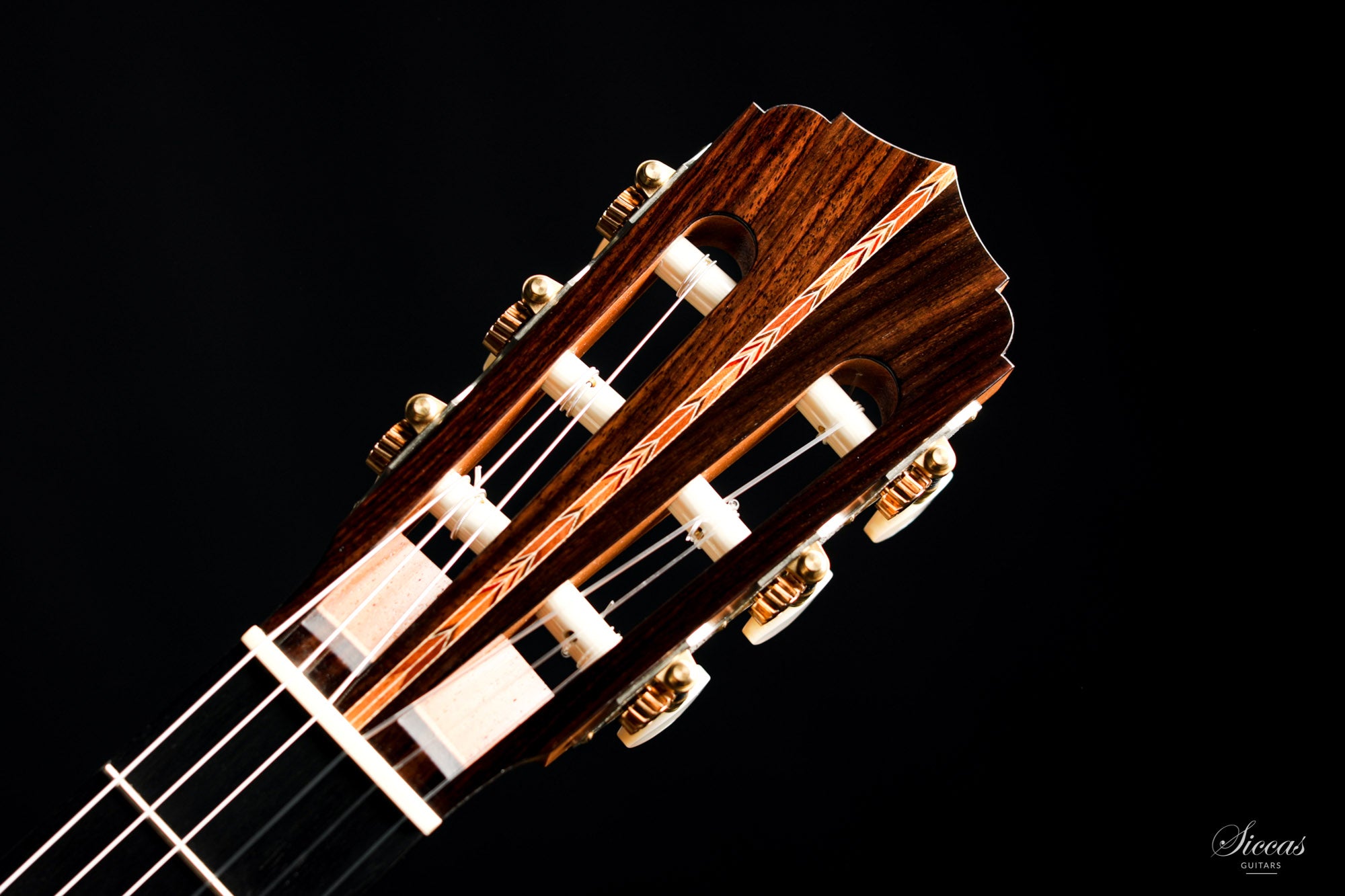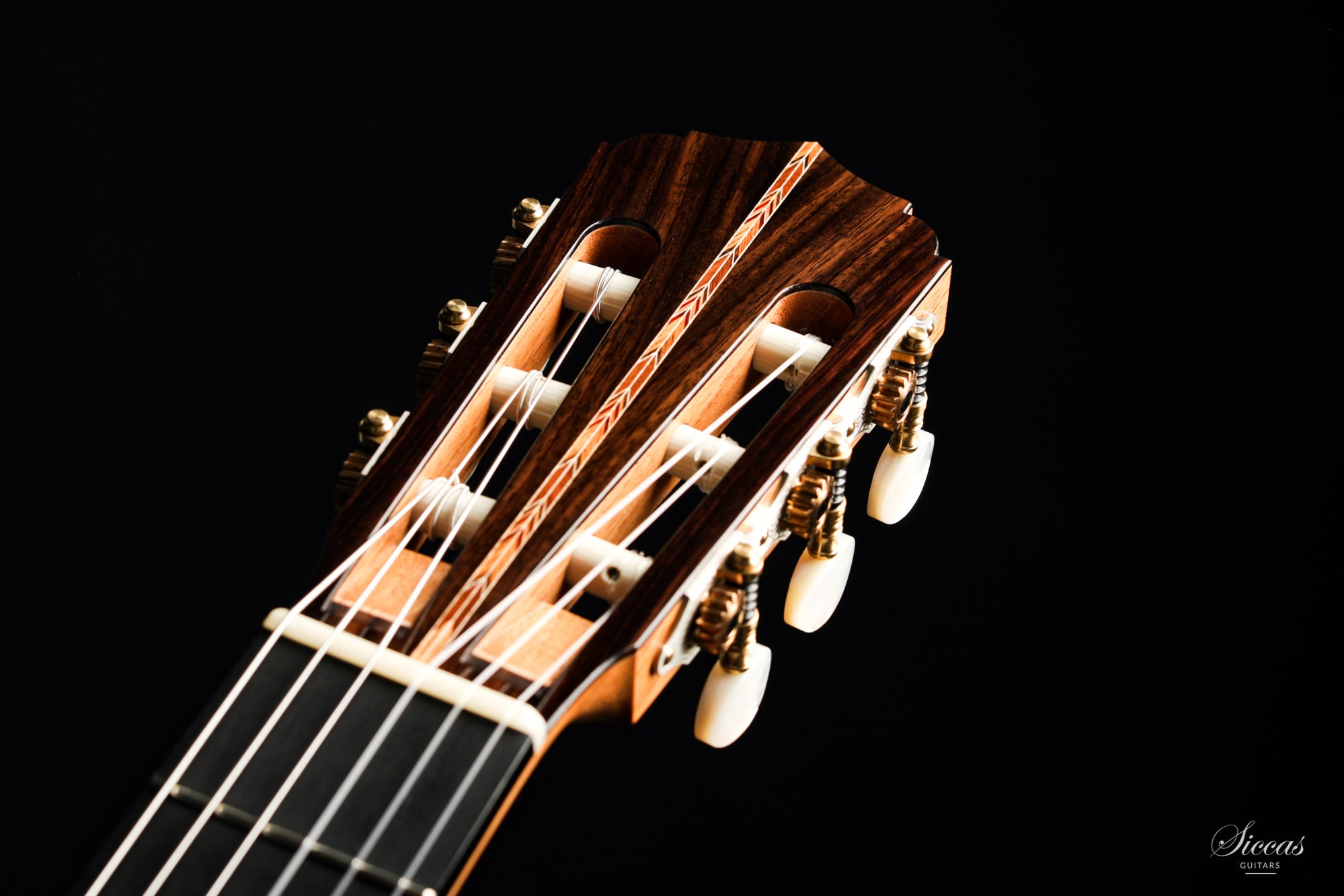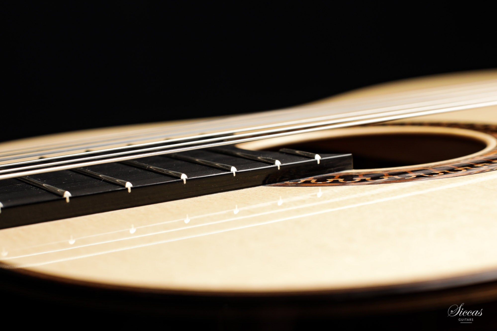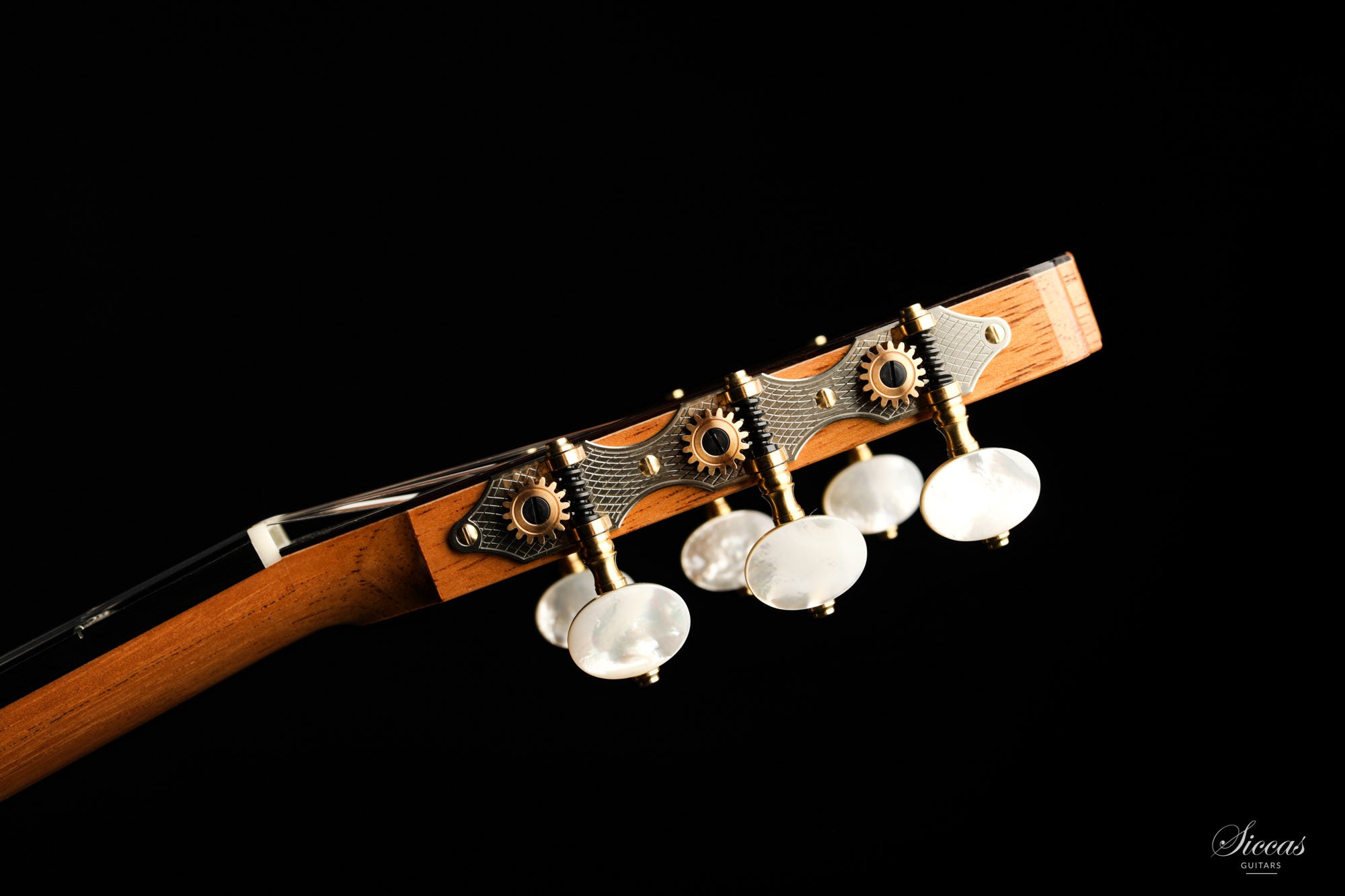 For this guitar, Michael used a dark, homogeneous Madagascar rosewood of superior quality. The German Klaus Scheller mechanics with mother-of-pearl knob and hand-engraved silver plate underline the exclusive character of this model. In terms of sound, one uncovers a touching charm and sensitivity from the first note on. The beauty of the first string is striking and its sustain offers infinite possibilities to the guitarist. Overall, is it a very light and spontaneous guitar with a brilliant endless sound. The subtlety of the sound colours and the timelessness of its timbre places this guitar at the highest level of contemporary lutherie.