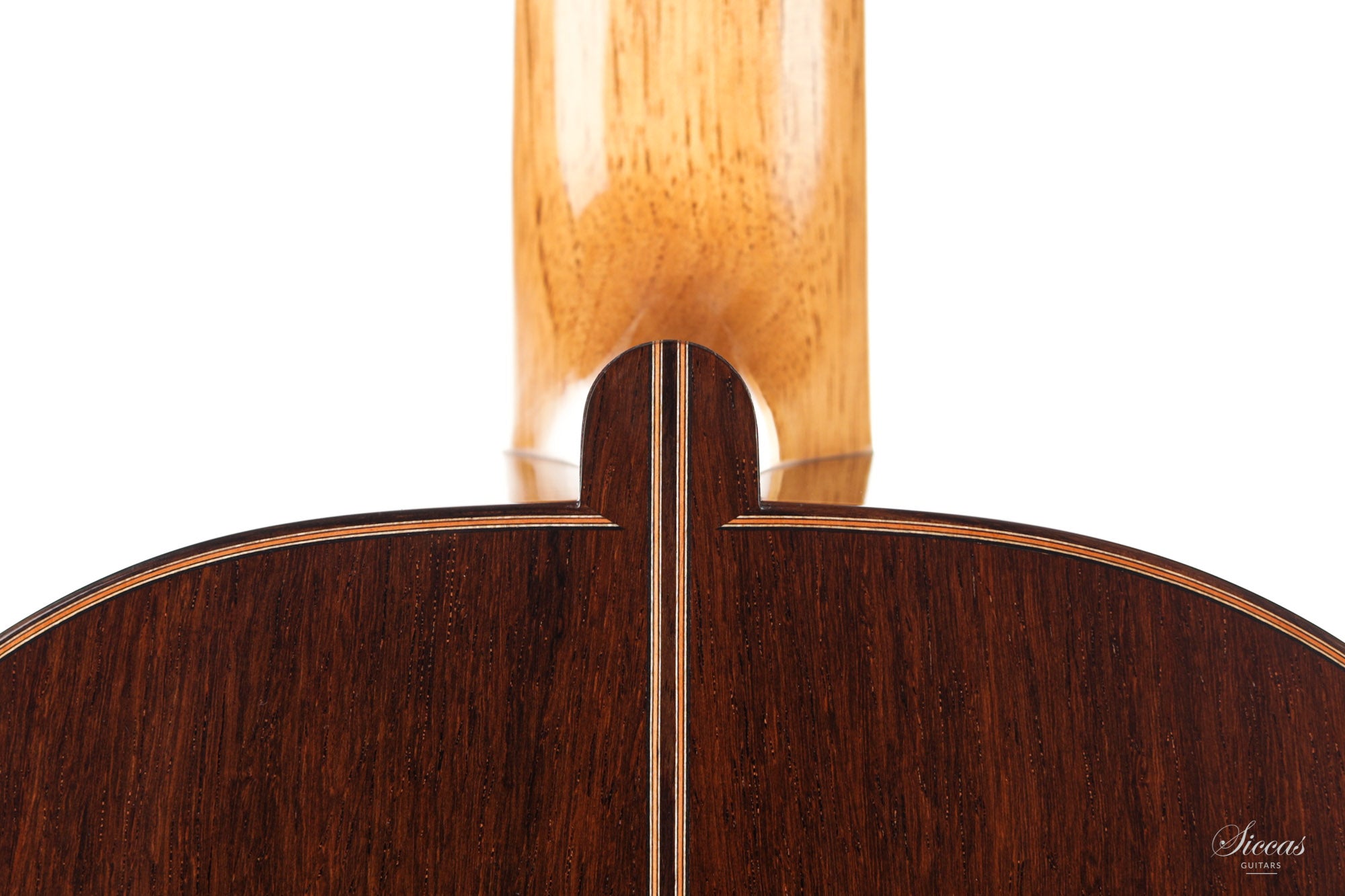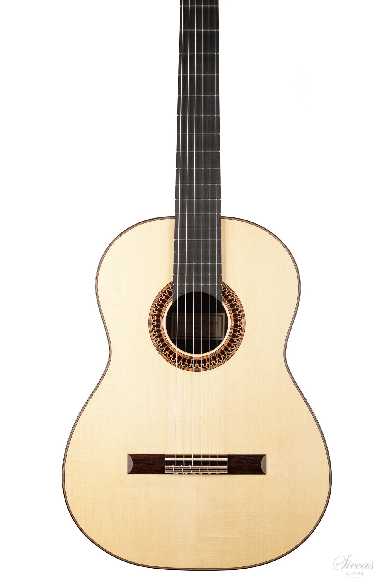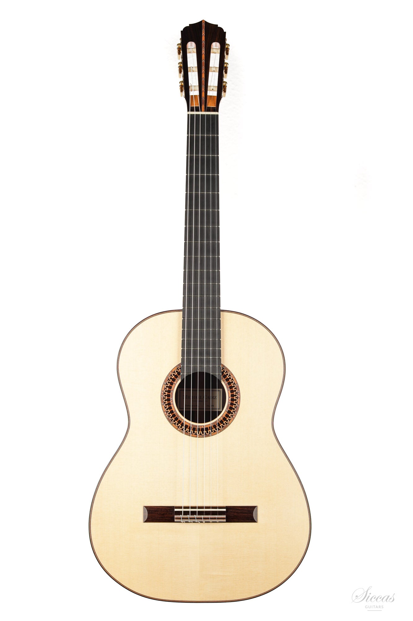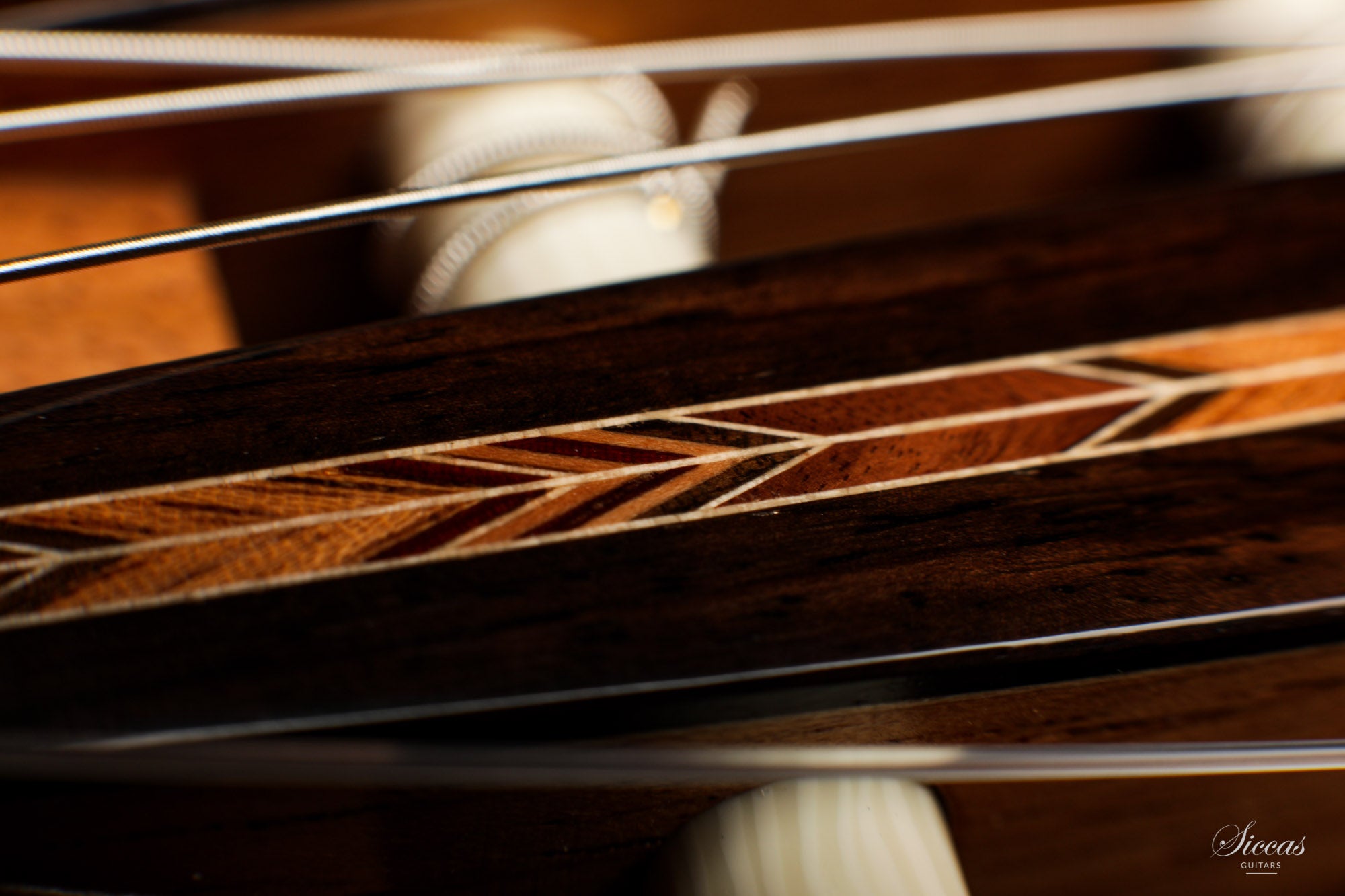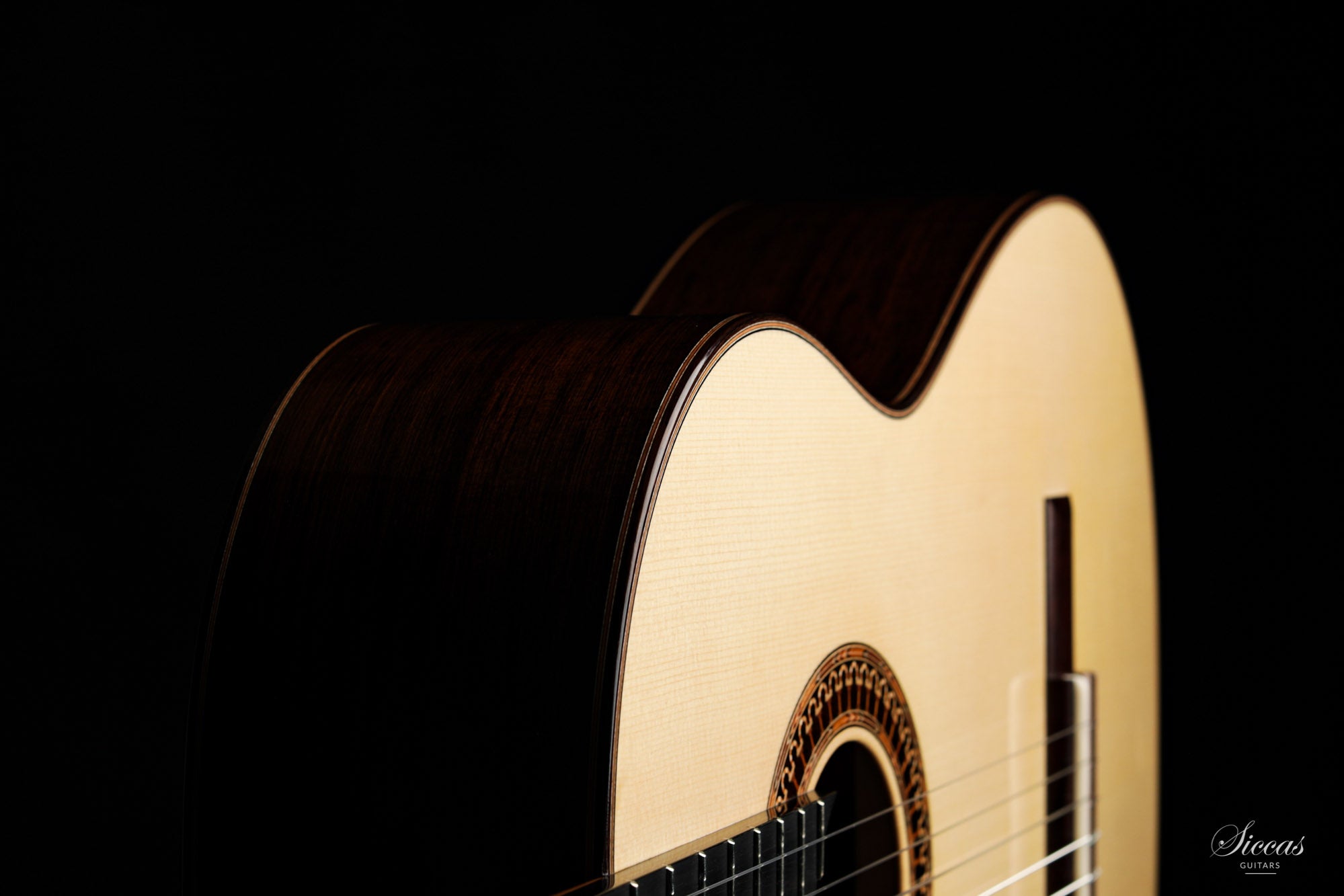For this guitar, Michael used a dark, homogeneous Madagascar rosewood of superior quality. The German Klaus Scheller mechanics with mother-of-pearl knob and hand-engraved silver plate underline the exclusive character of this model. In terms of sound, one uncovers a touching charm and sensitivity from the first note on. The beauty of the first string is striking and its sustain offers infinite possibilities to the guitarist. Overall, is it a very light and spontaneous guitar with a brilliant endless sound. The subtlety of the sound colours and the timelessness of its timbre places this guitar at the highest level of contemporary lutherie.