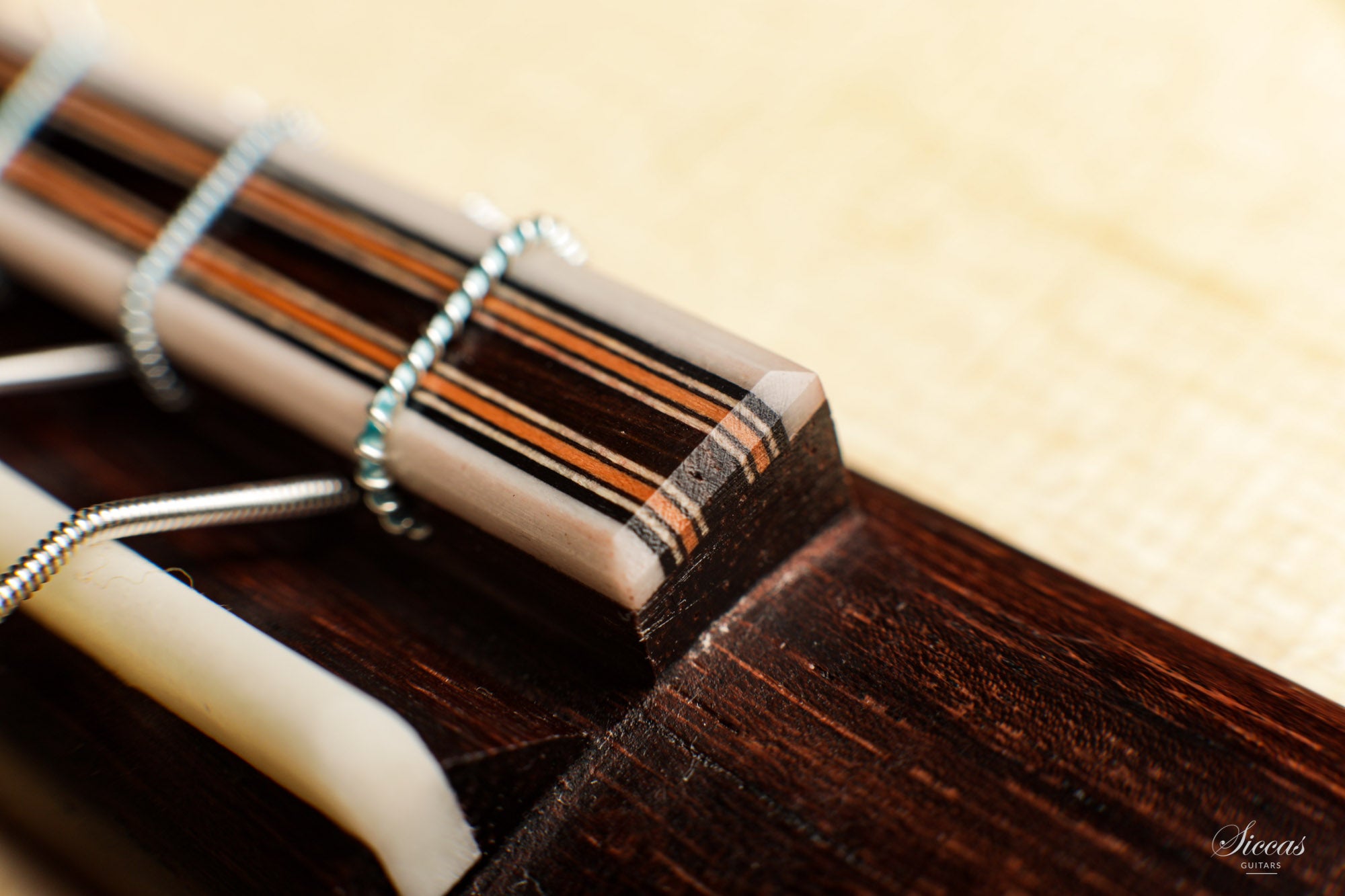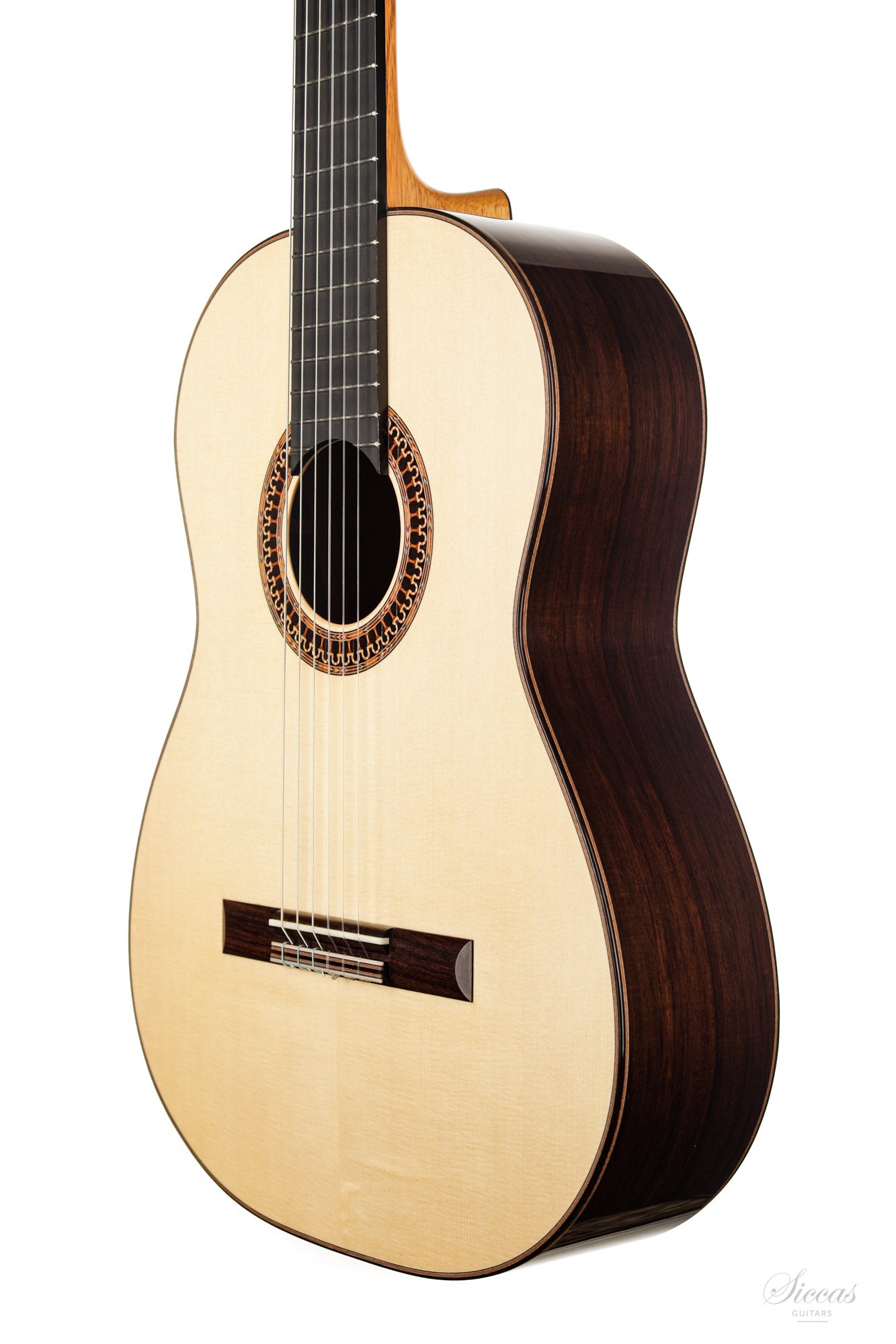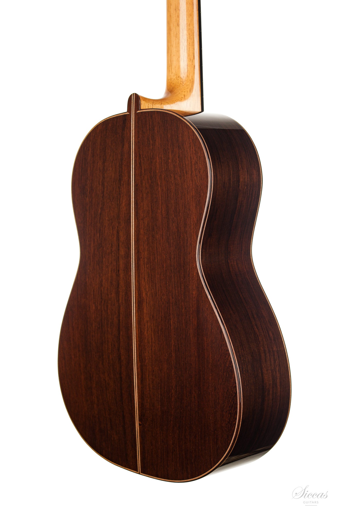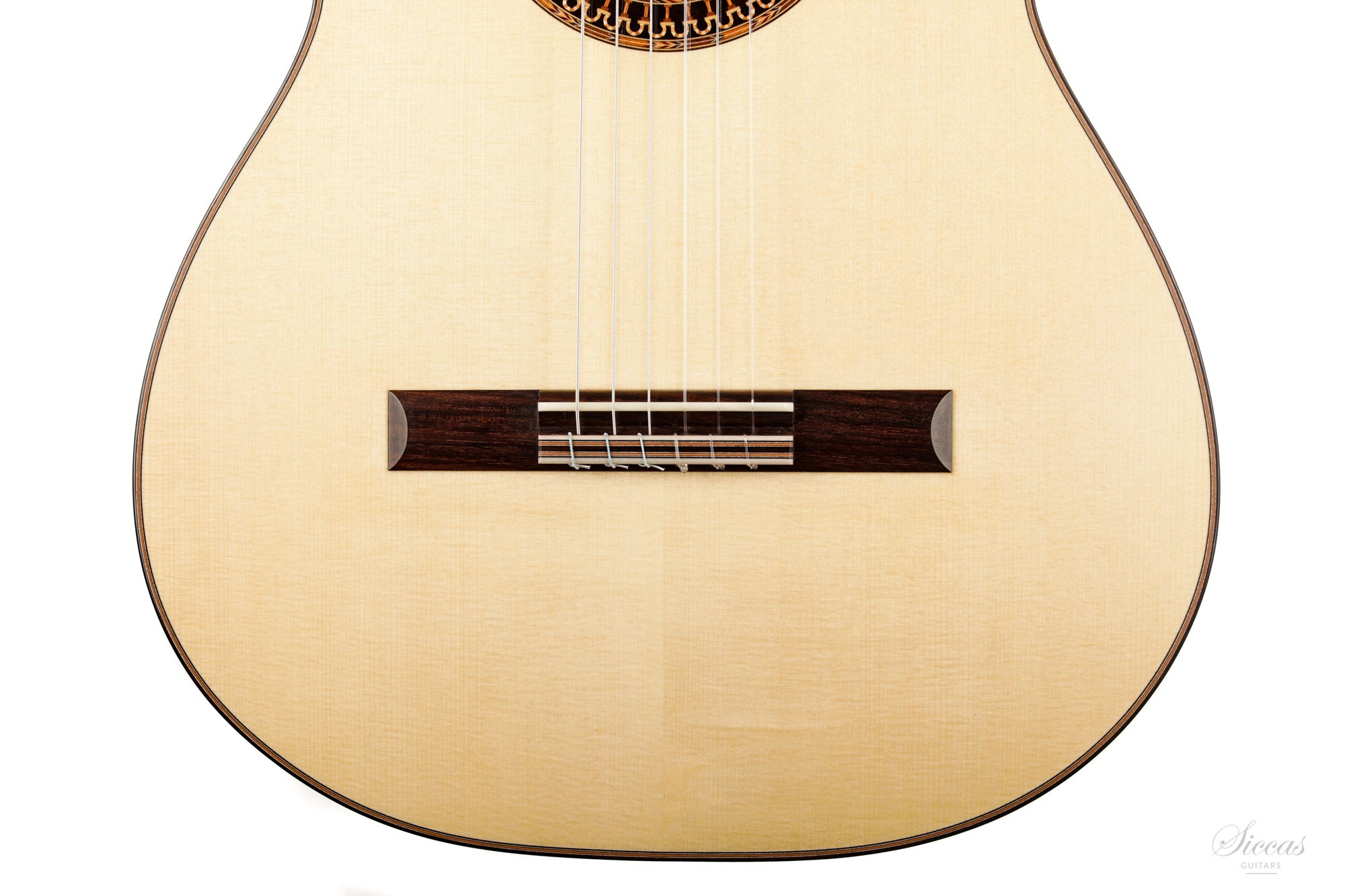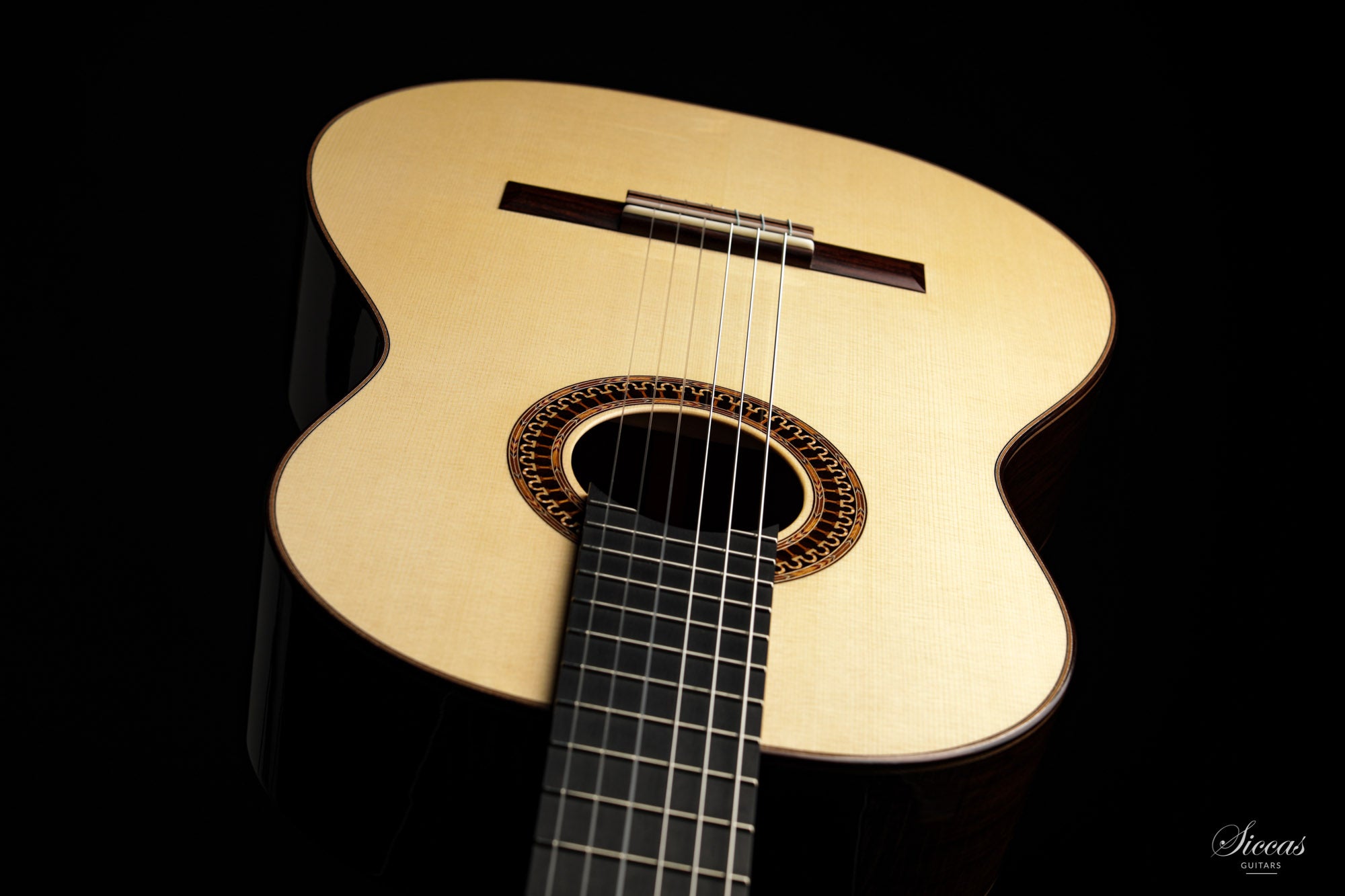 For this guitar, Michael used a dark, homogeneous Madagascar rosewood of superior quality. The German Klaus Scheller mechanics with mother-of-pearl knob and hand-engraved silver plate underline the exclusive character of this model. In terms of sound, one uncovers a touching charm and sensitivity from the first note on. The beauty of the first string is striking and its sustain offers infinite possibilities to the guitarist. Overall, is it a very light and spontaneous guitar with a brilliant endless sound. The subtlety of the sound colours and the timelessness of its timbre places this guitar at the highest level of contemporary lutherie.