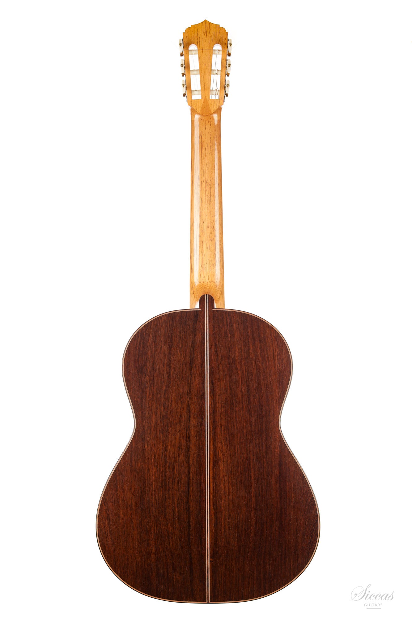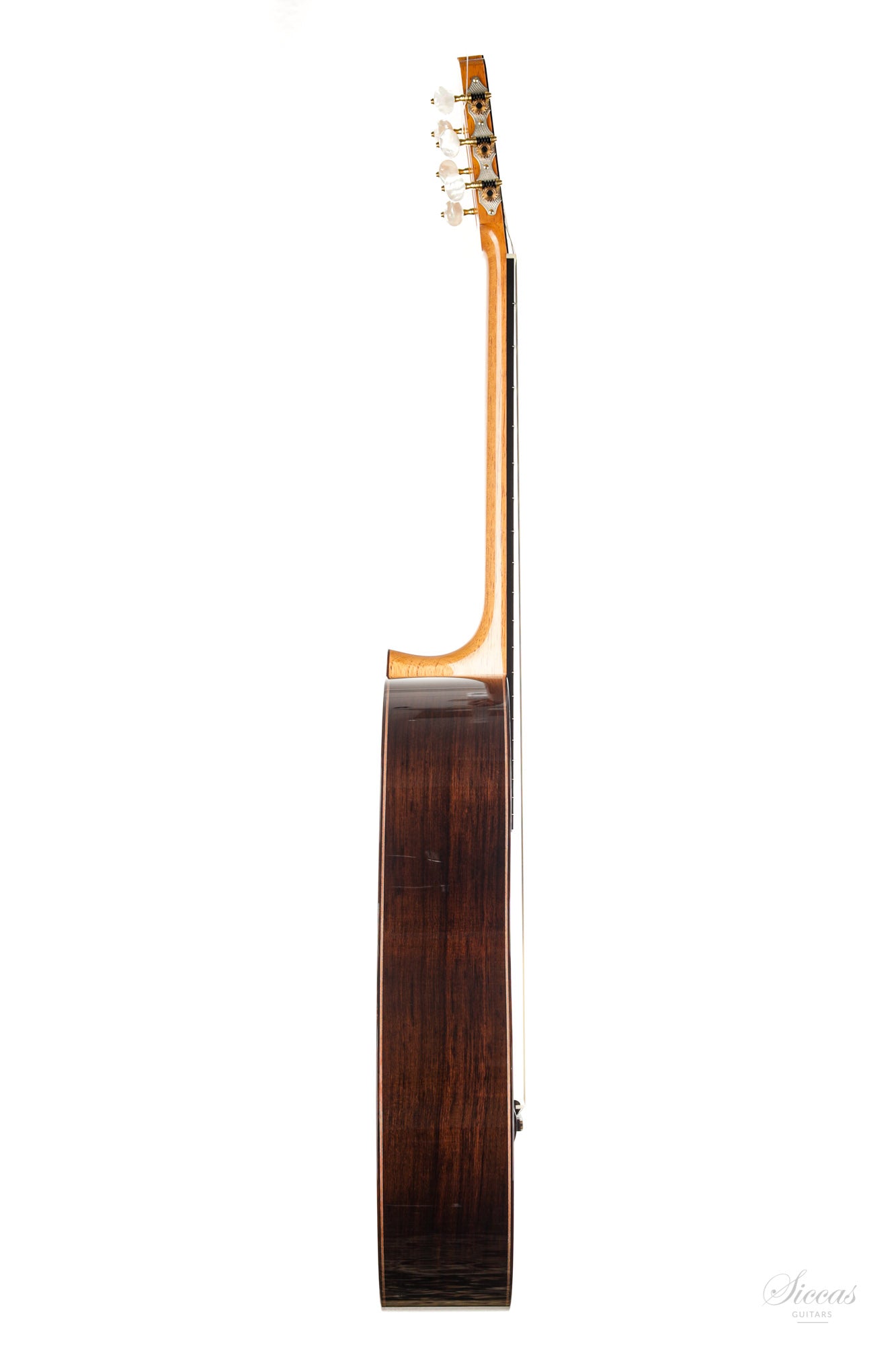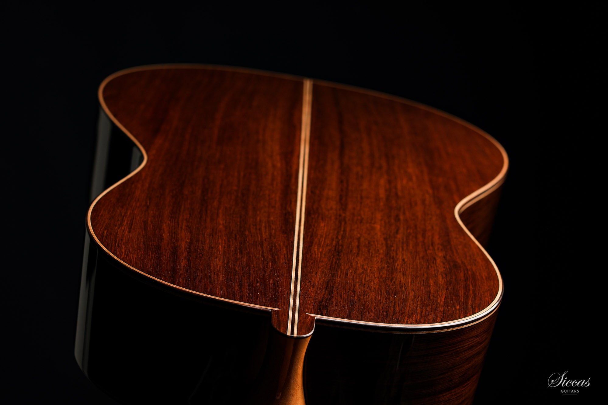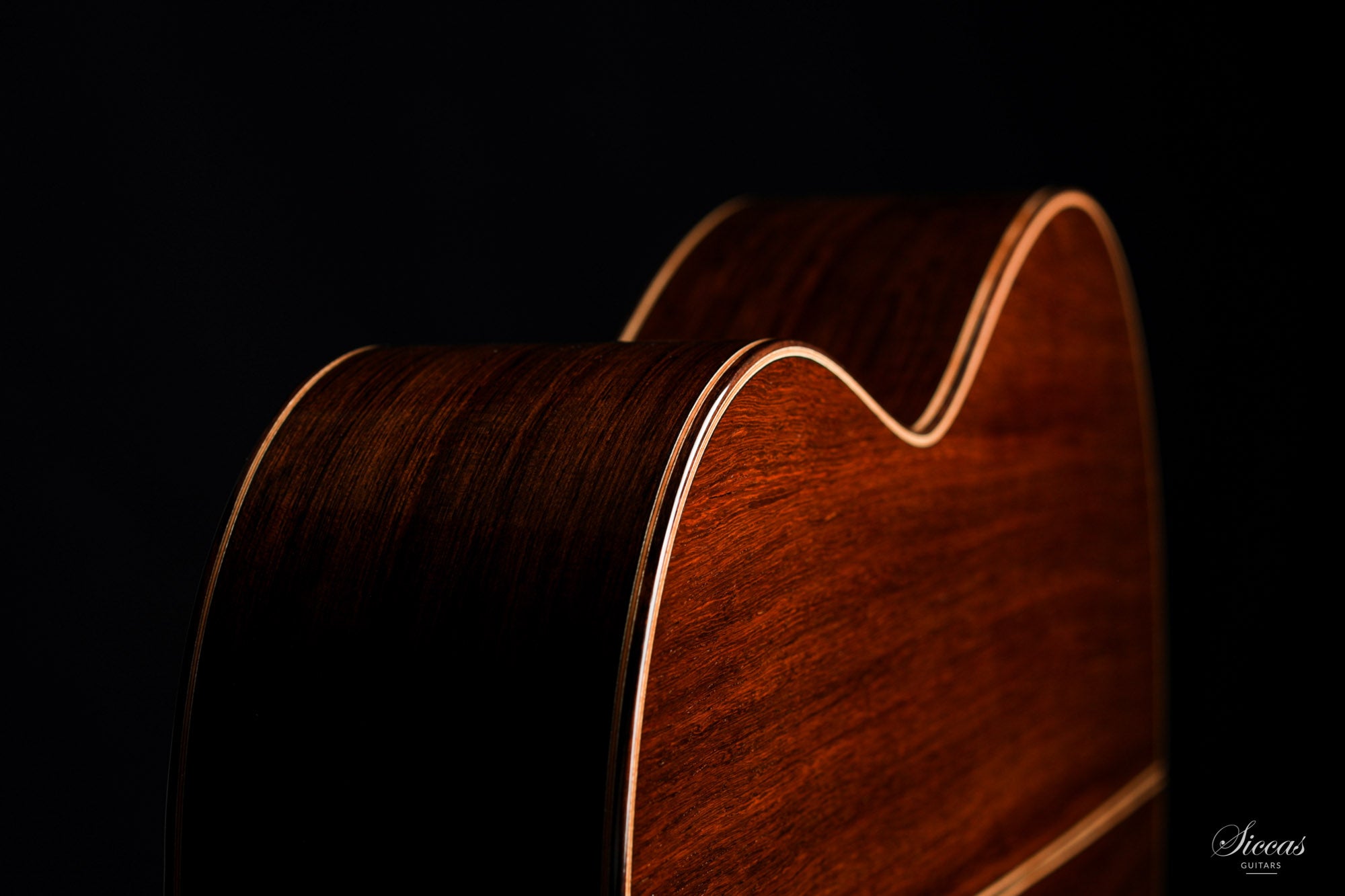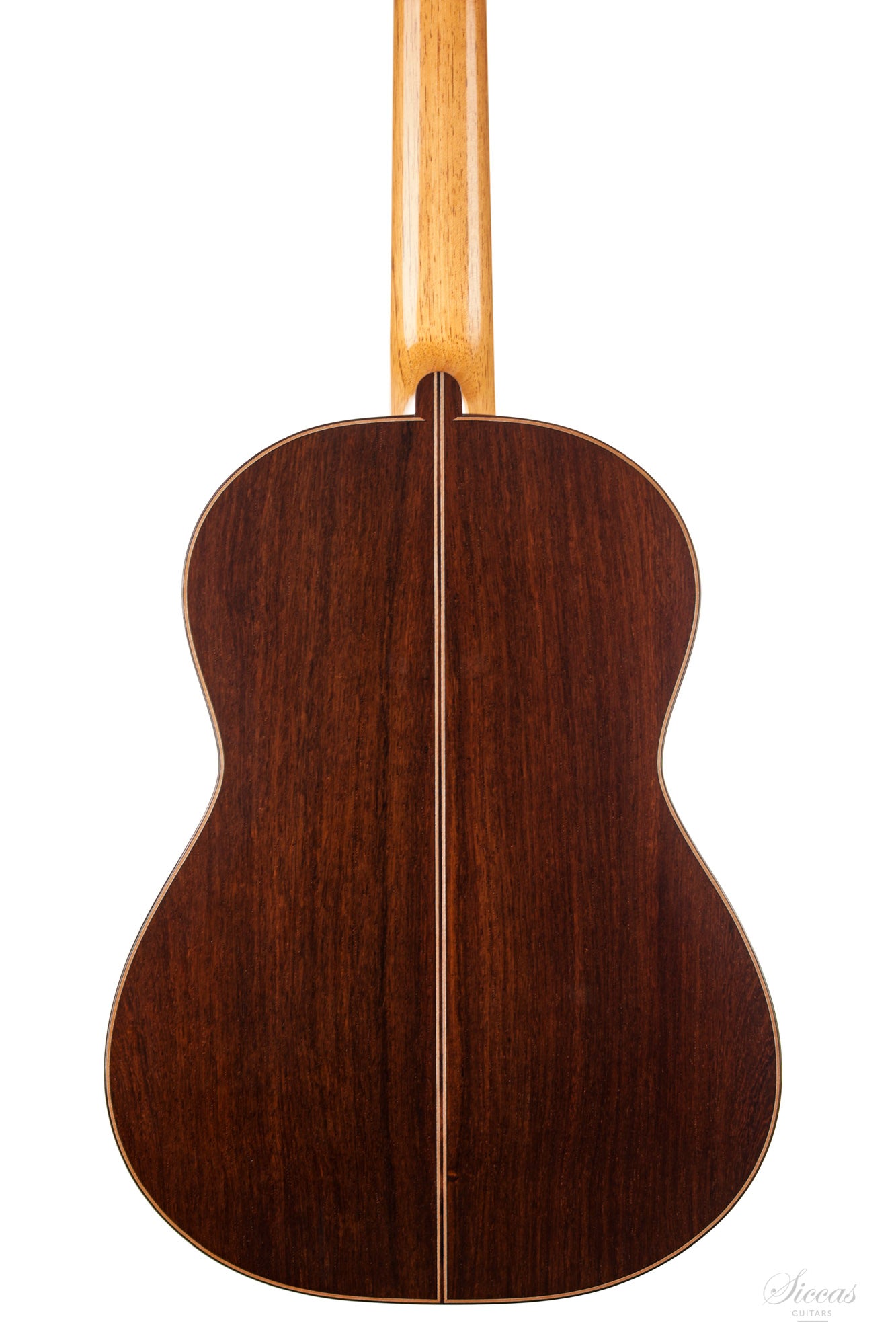 For this guitar, Michael used a dark, homogeneous Madagascar rosewood of superior quality. The German Klaus Scheller mechanics with mother-of-pearl knob and hand-engraved silver plate underline the exclusive character of this model. In terms of sound, one uncovers a touching charm and sensitivity from the first note on. The beauty of the first string is striking and its sustain offers infinite possibilities to the guitarist. Overall, is it a very light and spontaneous guitar with a brilliant endless sound. The subtlety of the sound colours and the timelessness of its timbre places this guitar at the highest level of contemporary lutherie.
