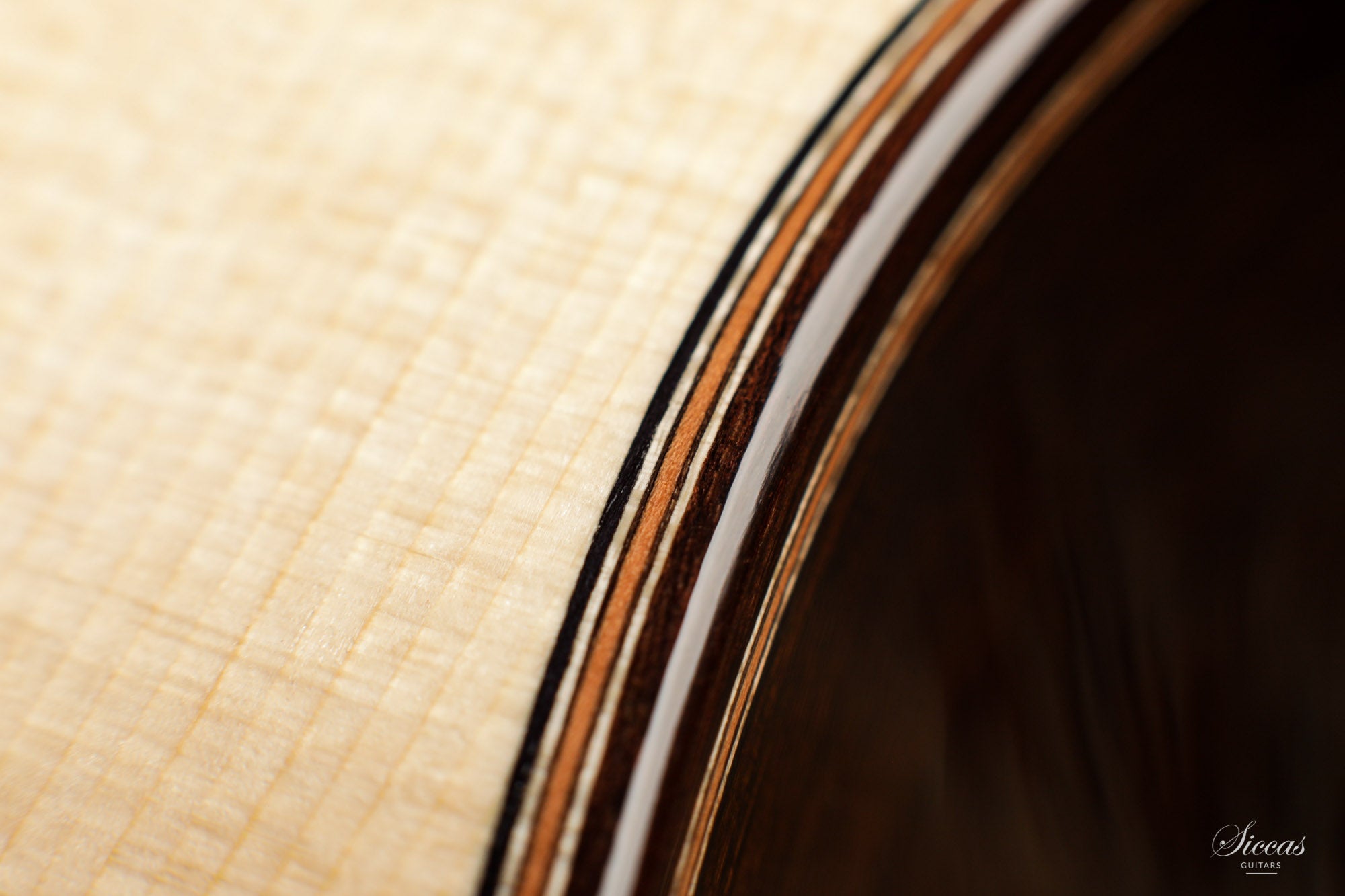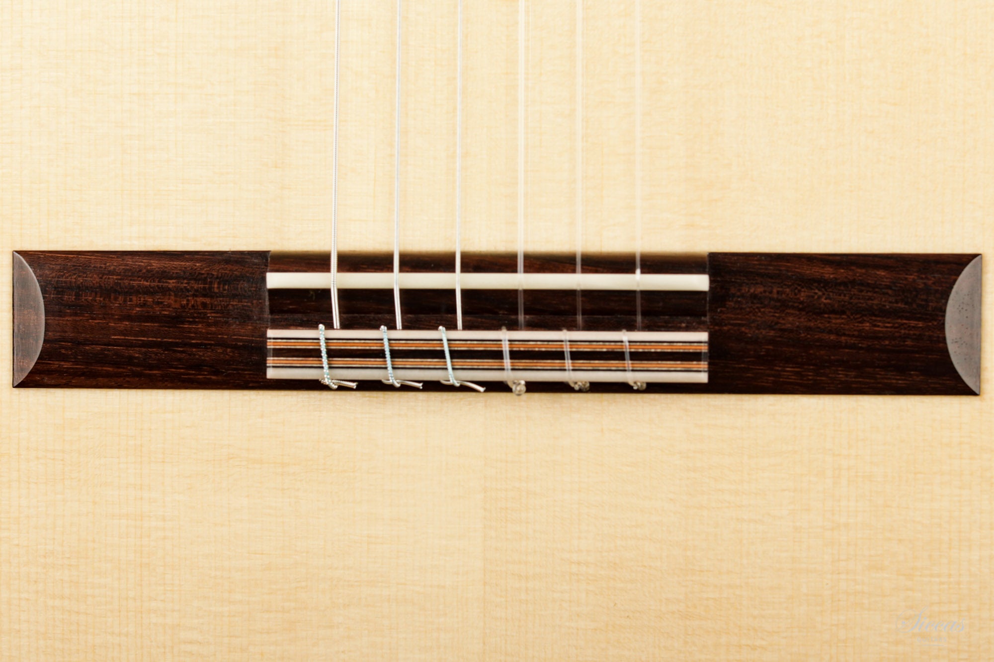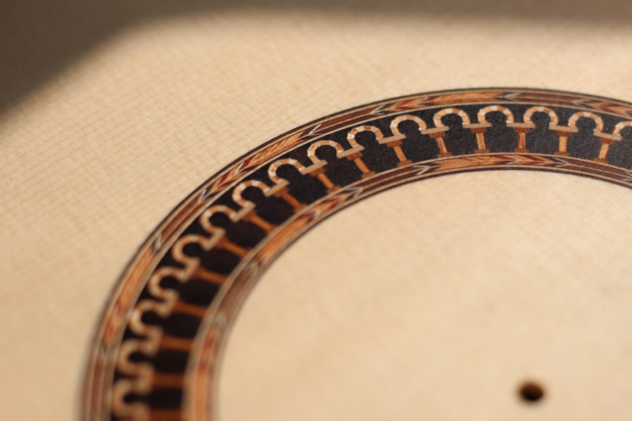 “This model is inspired by the traditional sound of Antonio de Torres and the unmistakable aesthetic of José Romanillos. More specifically, the plantilla and bracing is derived from the 1888 SE114 owned by Francisco Tarrega. It has a very typical deep F to F# body resonance, a dark and velvety warmth, as well as a direct presence and responsive color palette. I have been building variations of this model for years now and it has in most respects remained unchanged. In recent years, I’ve enlarged the plantilla and depth of the instrument just a touch from the original Torres instrument, which makes it a bit closer to a Romanillos or Hauser in size.”