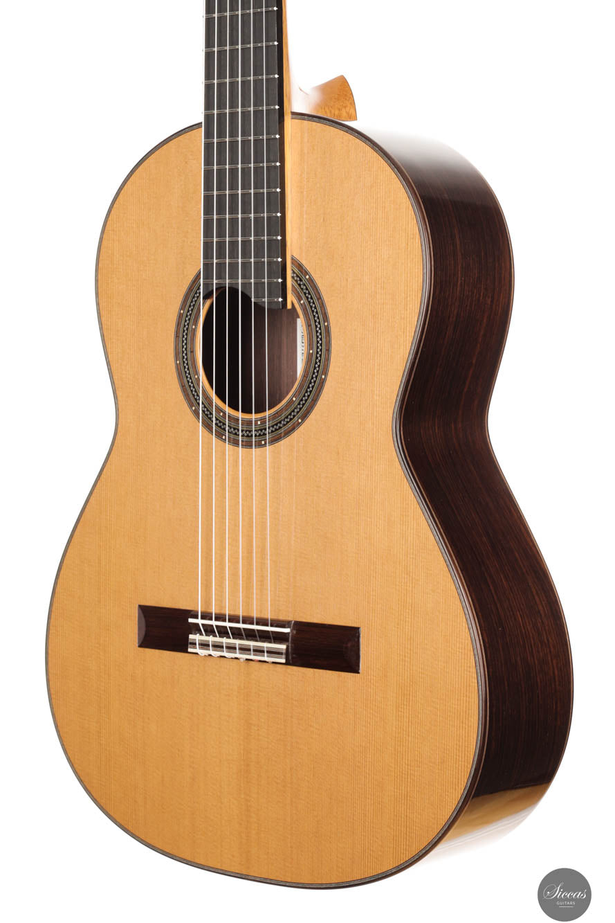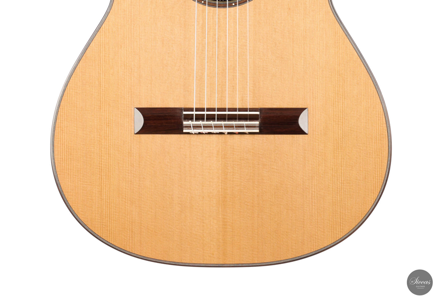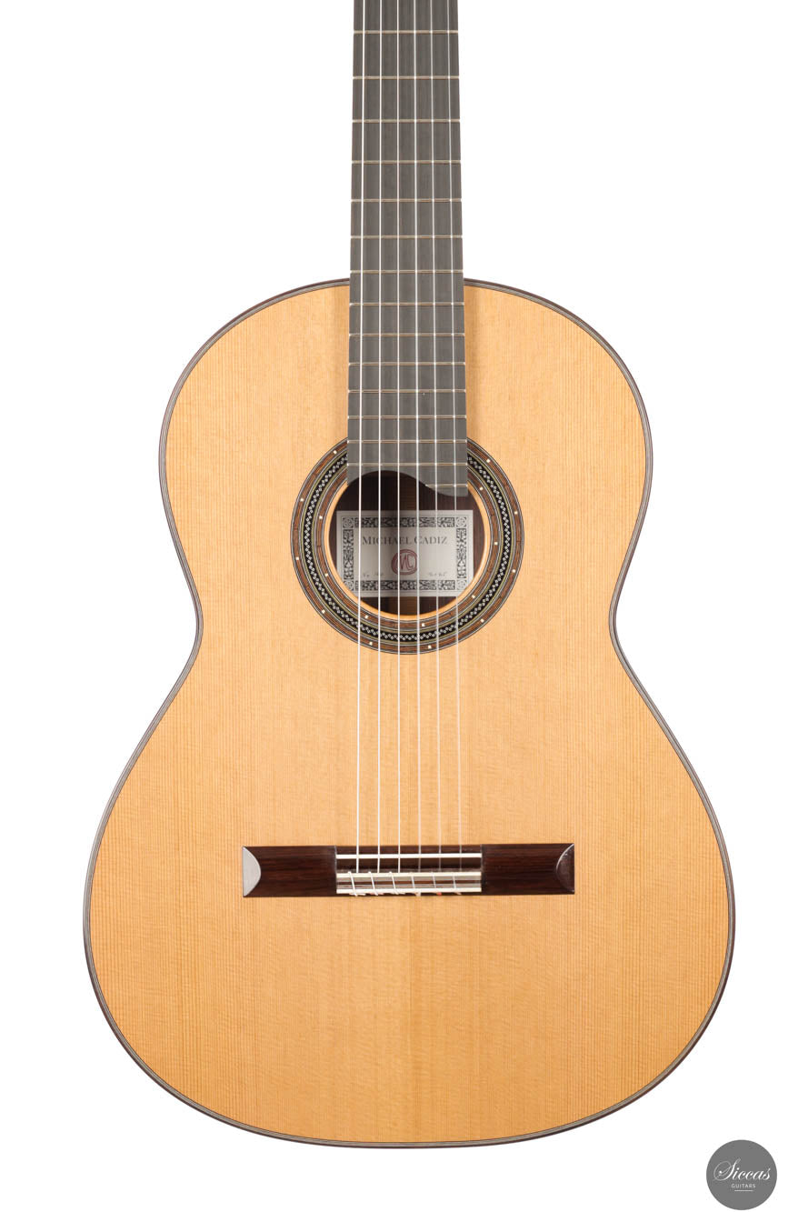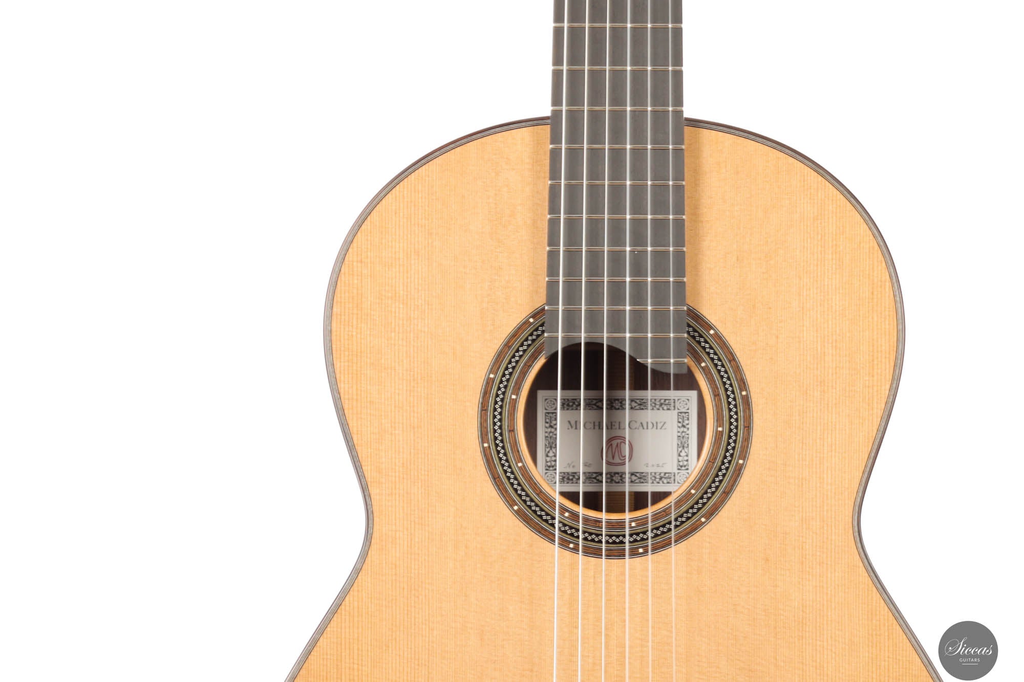 The 2025 Michel Cadiz 64 cm guitar is a masterfully built instrument that offers a harmonious fusion of historical inspiration and modern performance. As part of his Modern Concert model, this guitar reflects Cadiz’s vision of blending the charm of late-19th-century Spanish guitars with the demands of contemporary players. Constructed using traditional hide glue and a seven-fan bracing system with minimal cross struts, the guitar strikes a perfect balance between tradition and innovation. Tonally, it leans toward a mid-20th-century sound, characterized by excellent clarity, balance, dynamic range, and timbral variety, while maintaining a traditional voice. Michel Cadiz places a strong emphasis on achieving a clear and even frequency response, ensuring the sound carries effectively in large halls without being overpowered by midrange heaviness. Though the construction is overall slightly stiffer, the guitar maintains a low body resonance, which allows for a blooming bass, even sustain, and greater headroom across the tonal spectrum. The cedar soundboard contributes to warm, round trebles with excellent sustain, while the 64 cm scale combined with a finely shaped neck makes for exceptional playability. As a guitarist himself, Michel Cadiz understands the nuanced needs of players, and this instrument clearly reflects his commitment to playability, responsiveness, and expressive freedom. It is a guitar that performs equally well in intimate settings and large concert halls—a true modern concert guitar rooted in tradition.Regular care extends the life of the instrument