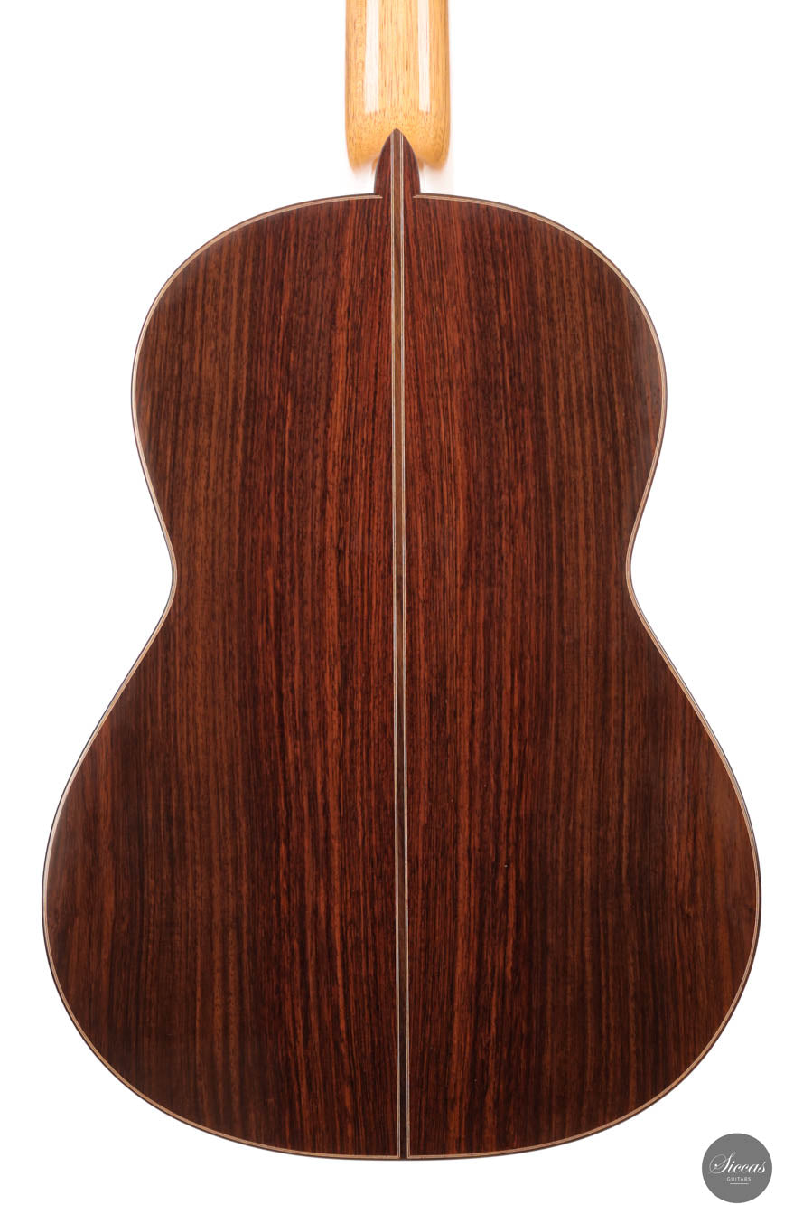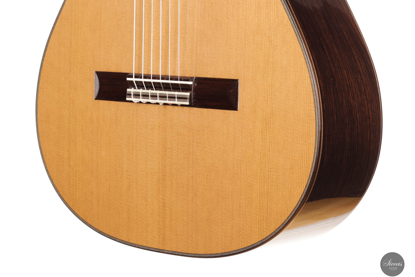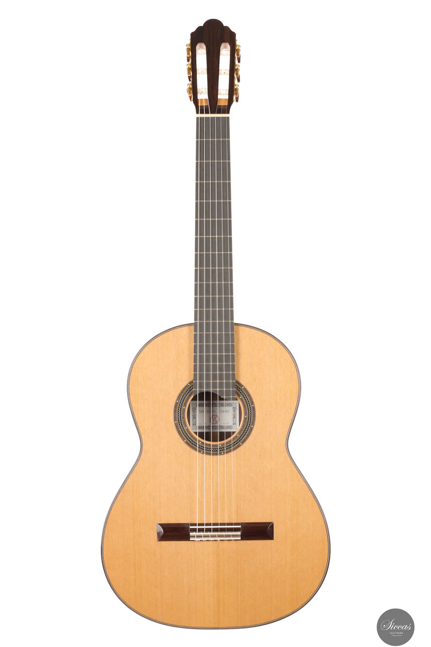 The 2025 Michel Cadiz 64 cm guitar is a masterfully built instrument that offers a harmonious fusion of historical inspiration and modern performance. As part of his Modern Concert model, this guitar reflects Cadiz’s vision of blending the charm of late-19th-century Spanish guitars with the demands of contemporary players. Constructed using traditional hide glue and a seven-fan bracing system with minimal cross struts, the guitar strikes a perfect balance between tradition and innovation. Tonally, it leans toward a mid-20th-century sound, characterized by excellent clarity, balance, dynamic range, and timbral variety, while maintaining a traditional voice. Michel Cadiz places a strong emphasis on achieving a clear and even frequency response, ensuring the sound carries effectively in large halls without being overpowered by midrange heaviness. Though the construction is overall slightly stiffer, the guitar maintains a low body resonance, which allows for a blooming bass, even sustain, and greater headroom across the tonal spectrum. The cedar soundboard contributes to warm, round trebles with excellent sustain, while the 64 cm scale combined with a finely shaped neck makes for exceptional playability. As a guitarist himself, Michel Cadiz understands the nuanced needs of players, and this instrument clearly reflects his commitment to playability, responsiveness, and expressive freedom. It is a guitar that performs equally well in intimate settings and large concert halls—a true modern concert guitar rooted in tradition.Regular care extends the life of the instrument
