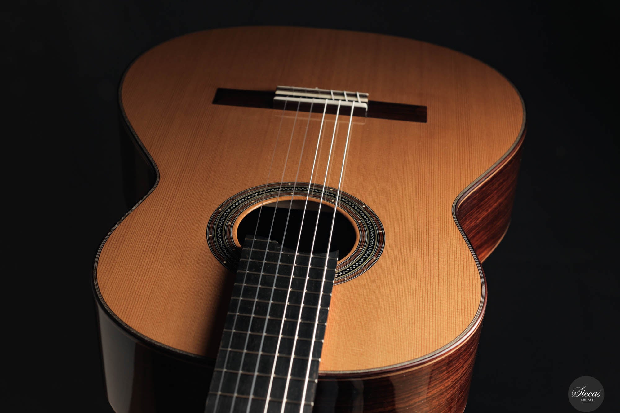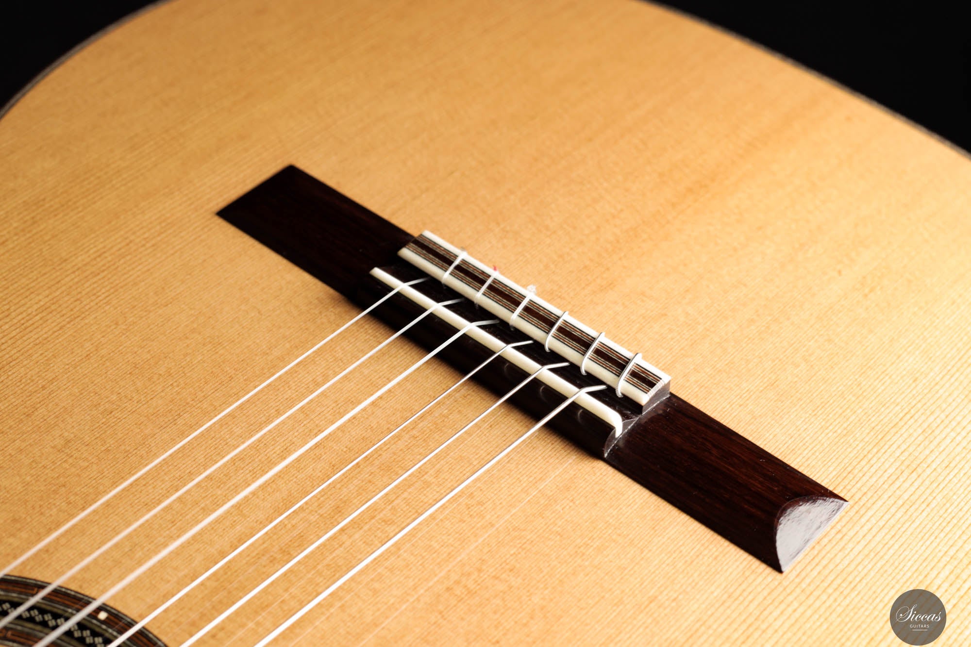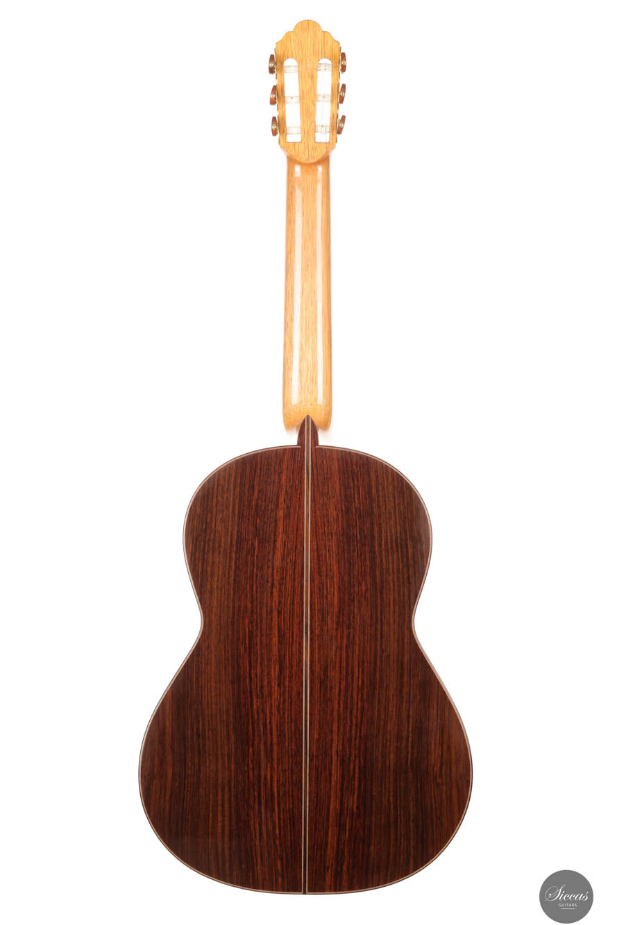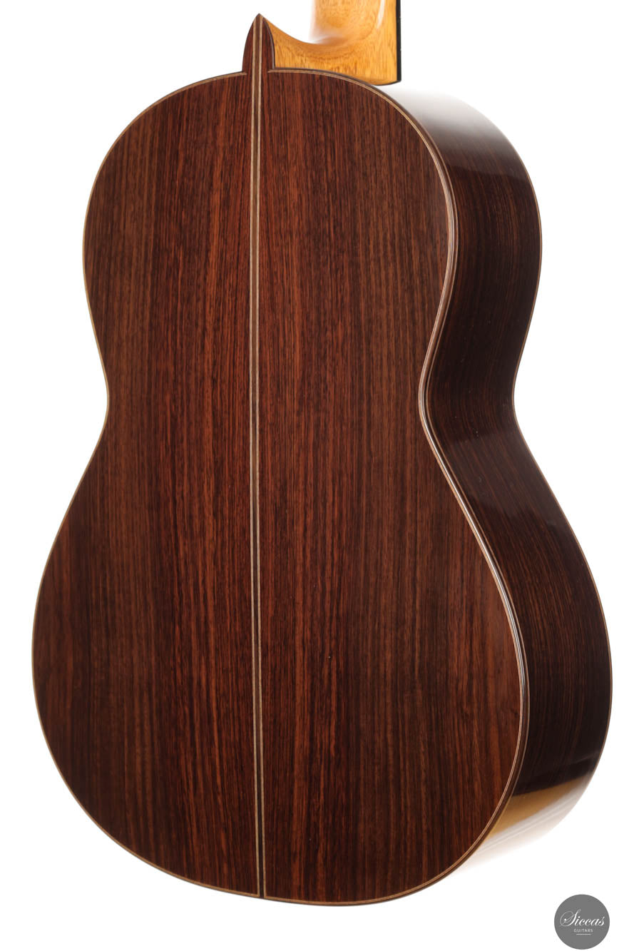 The 2025 Michel Cadiz 64 cm guitar is a masterfully built instrument that offers a harmonious fusion of historical inspiration and modern performance. As part of his Modern Concert model, this guitar reflects Cadiz’s vision of blending the charm of late-19th-century Spanish guitars with the demands of contemporary players. Constructed using traditional hide glue and a seven-fan bracing system with minimal cross struts, the guitar strikes a perfect balance between tradition and innovation. Tonally, it leans toward a mid-20th-century sound, characterized by excellent clarity, balance, dynamic range, and timbral variety, while maintaining a traditional voice. Michel Cadiz places a strong emphasis on achieving a clear and even frequency response, ensuring the sound carries effectively in large halls without being overpowered by midrange heaviness. Though the construction is overall slightly stiffer, the guitar maintains a low body resonance, which allows for a blooming bass, even sustain, and greater headroom across the tonal spectrum. The cedar soundboard contributes to warm, round trebles with excellent sustain, while the 64 cm scale combined with a finely shaped neck makes for exceptional playability. As a guitarist himself, Michel Cadiz understands the nuanced needs of players, and this instrument clearly reflects his commitment to playability, responsiveness, and expressive freedom. It is a guitar that performs equally well in intimate settings and large concert halls—a true modern concert guitar rooted in tradition.Regular care extends the life of the instrument