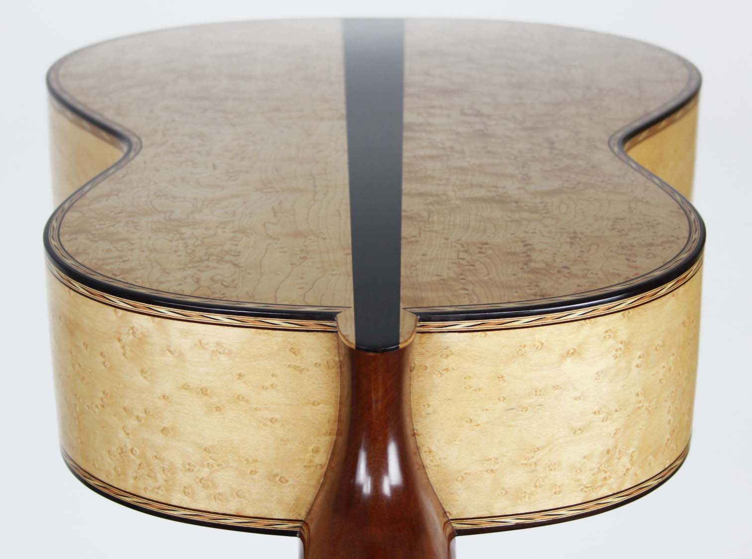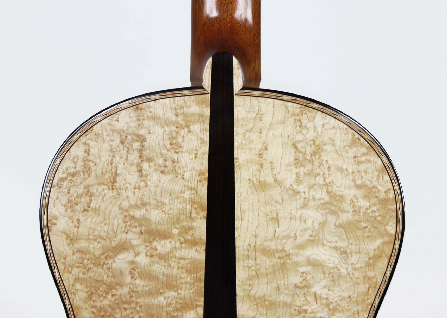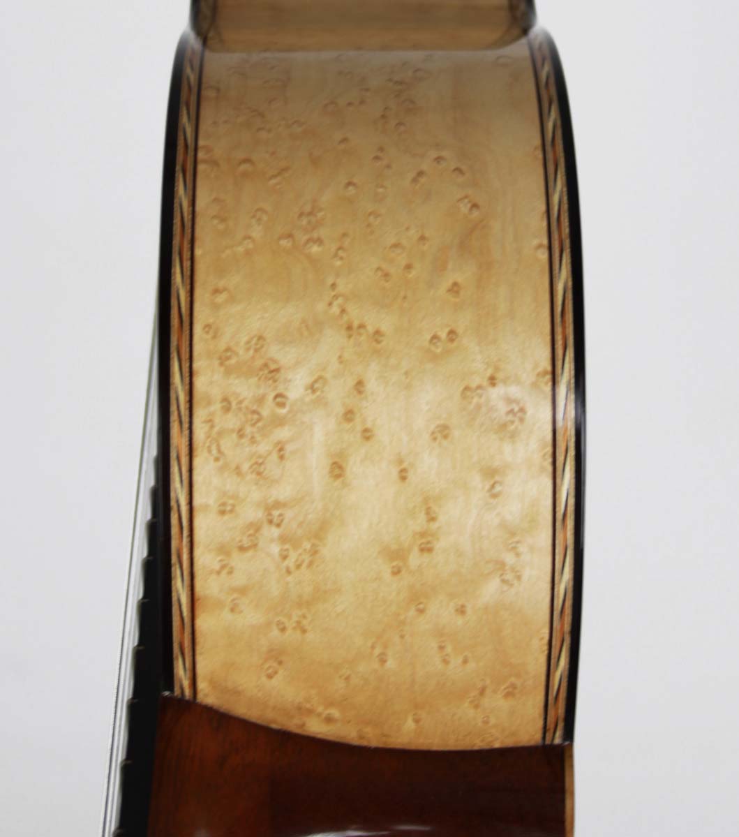 On the 24th May, 2008 the English luthier Michael Gee celebrated his 50th birthday and simultaneously his 30th year of being a luthier. On this occasion he built four special guitars. Three made of rosewood and the last one - completed in 2012 - made of bird’s eye maple with a fantastic top made of hazel spruce, which was given to him by his mentor Herbert Schwarz. This guitar has some more features: