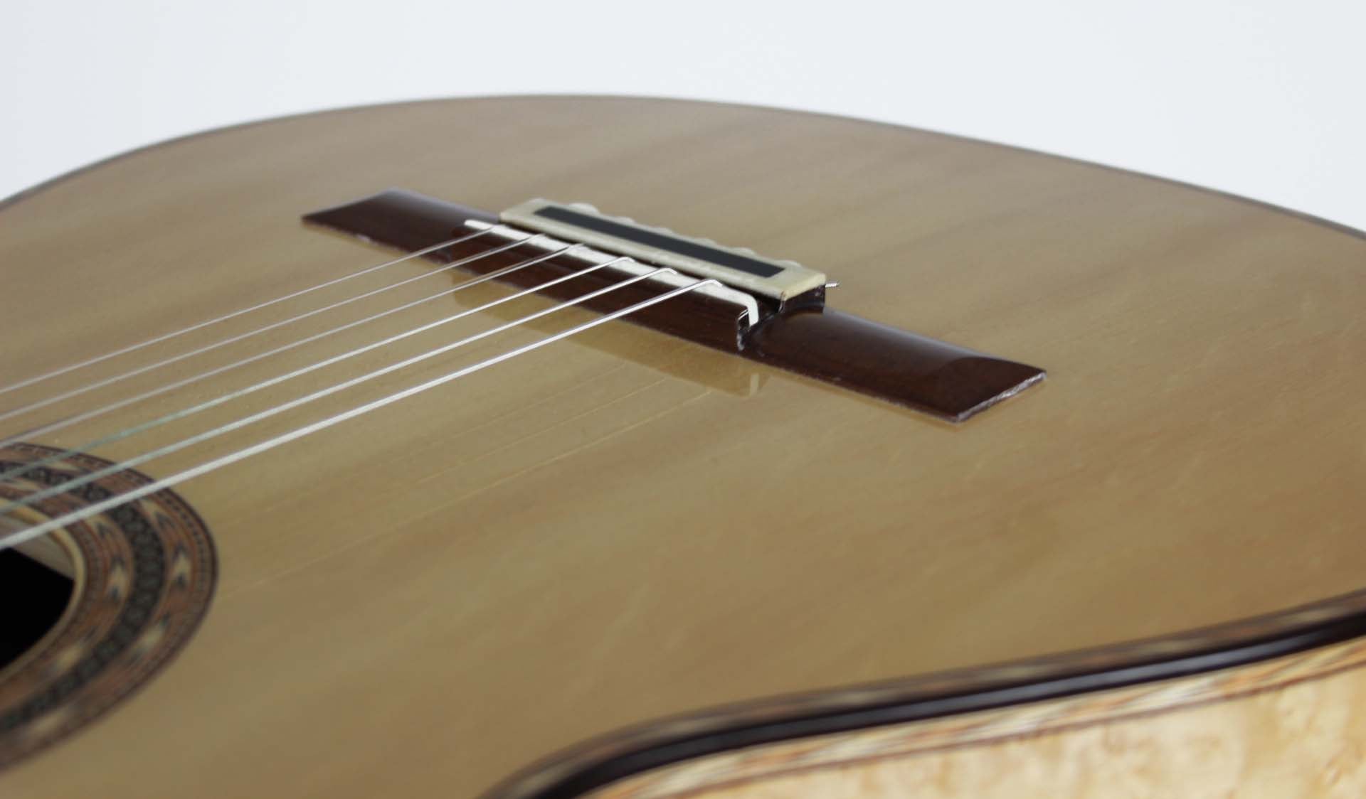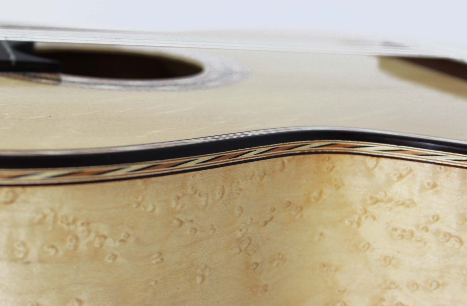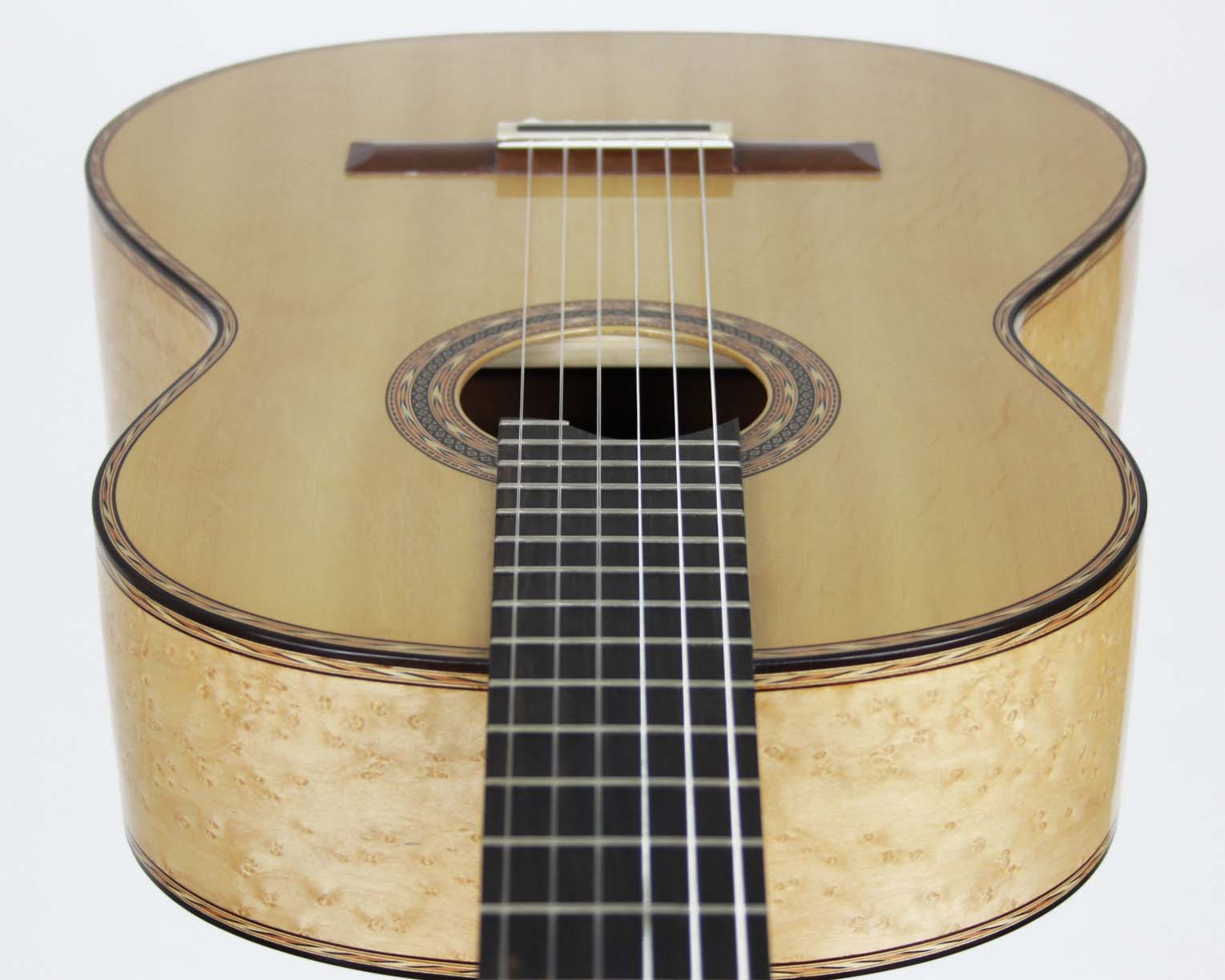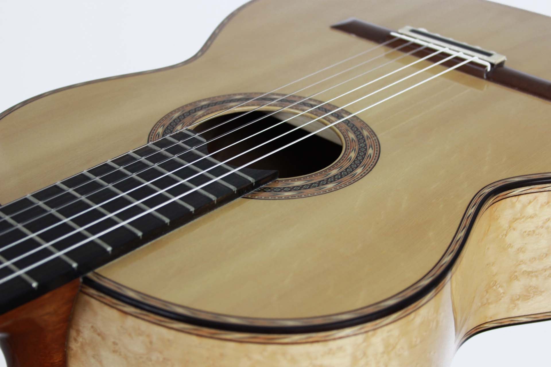 On the 24th May, 2008 the English luthier Michael Gee celebrated his 50th birthday and simultaneously his 30th year of being a luthier. On this occasion he built four special guitars. Three made of rosewood and the last one - completed in 2012 - made of bird’s eye maple with a fantastic top made of hazel spruce, which was given to him by his mentor Herbert Schwarz. This guitar has some more features: