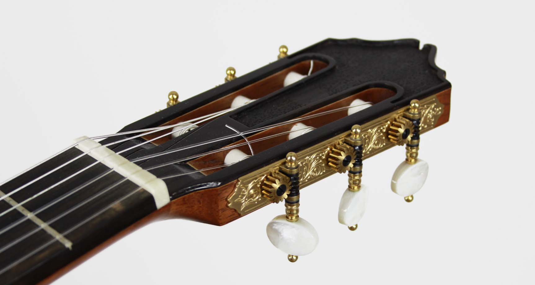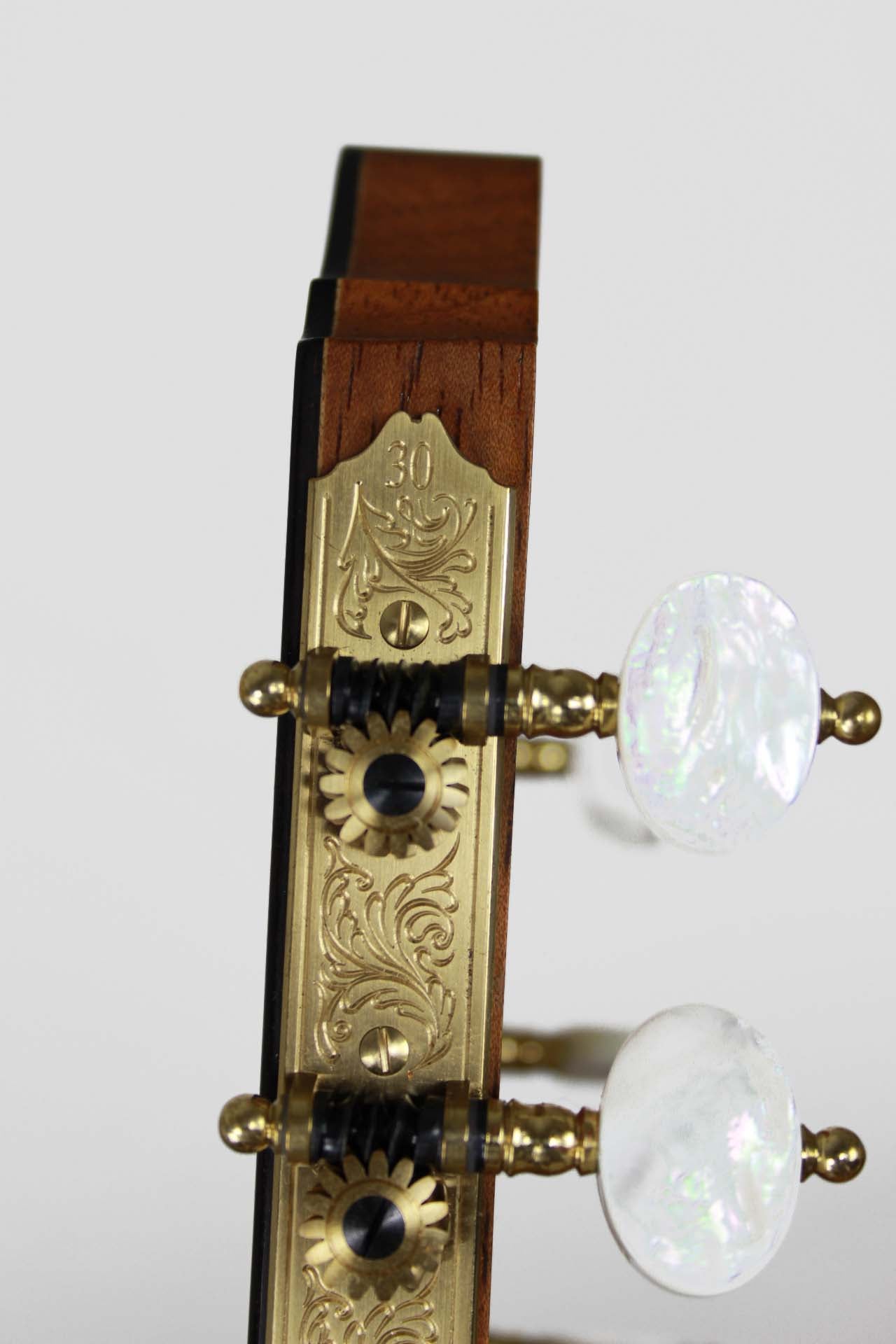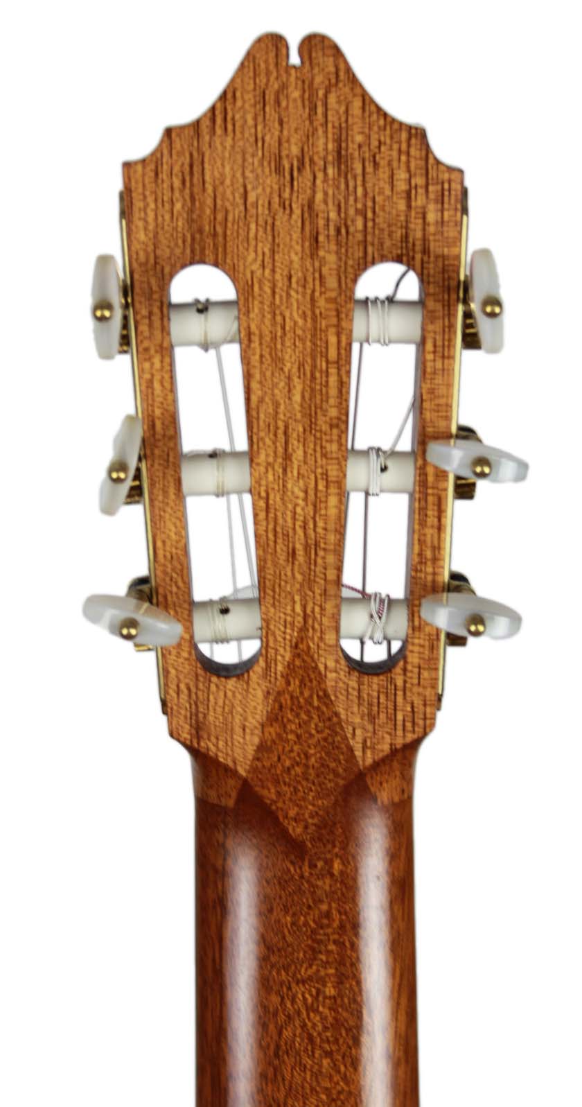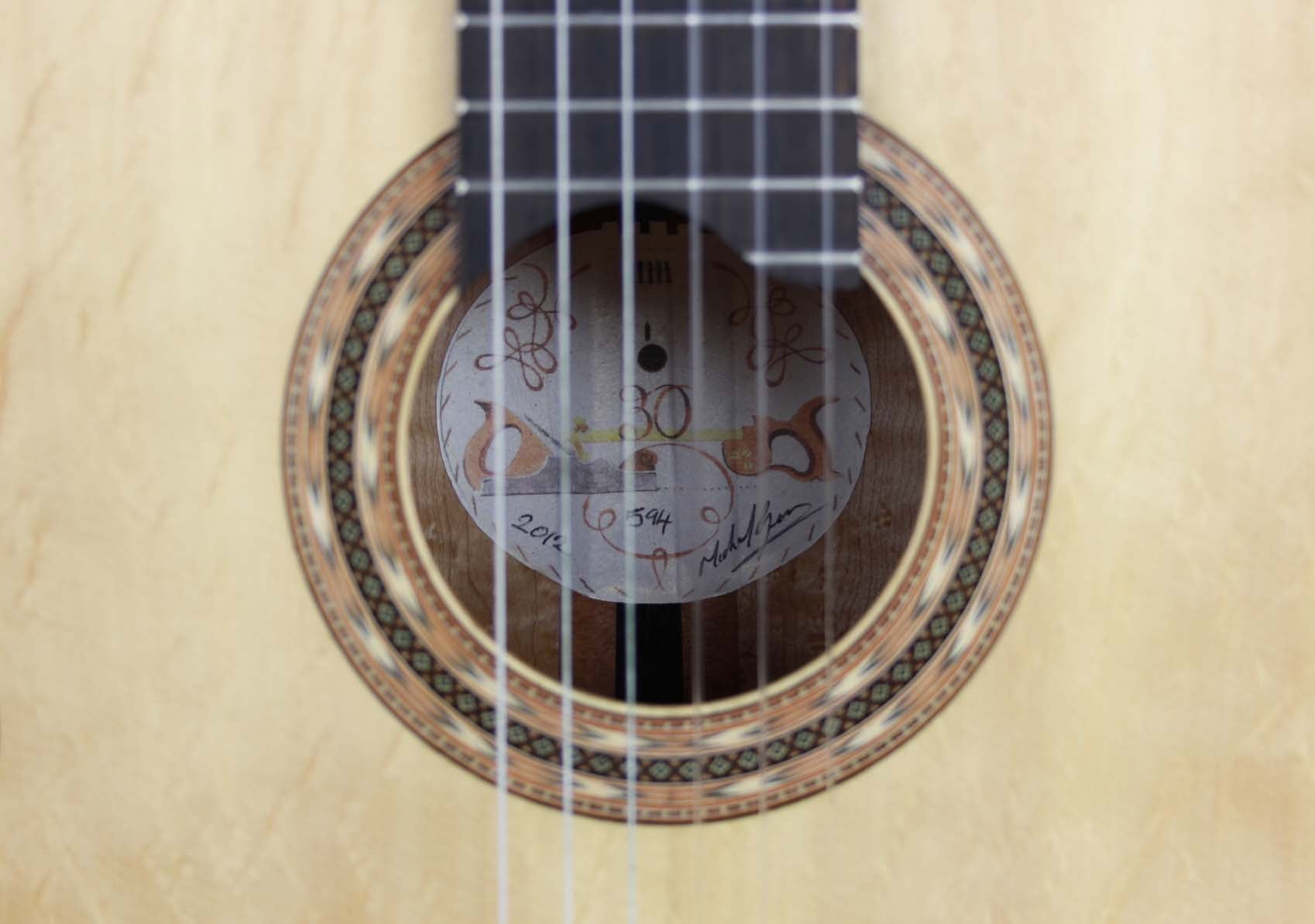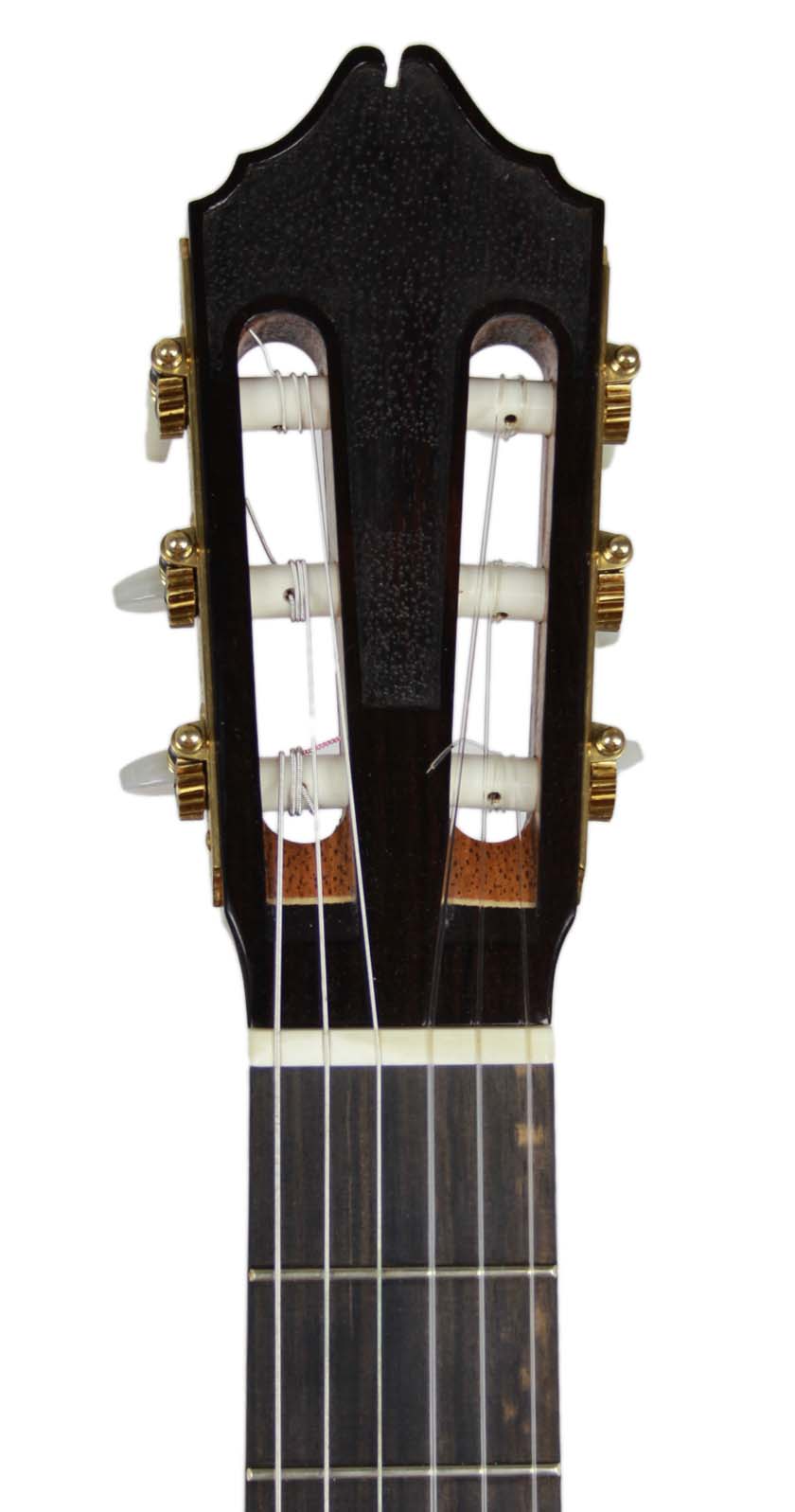 - the characteristic headstock with the typical Gee silhouette is “punched” on the front, where one elliptical spot between the tuning machines has been left untreated. This resembles the instruments of “Hernandez y Aguado”, which influenced Michael’s work.