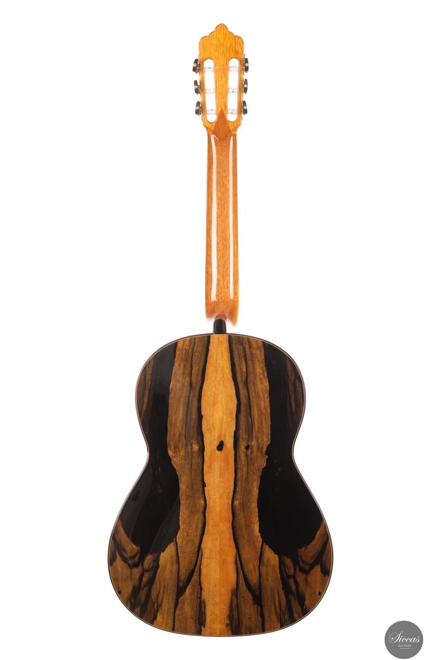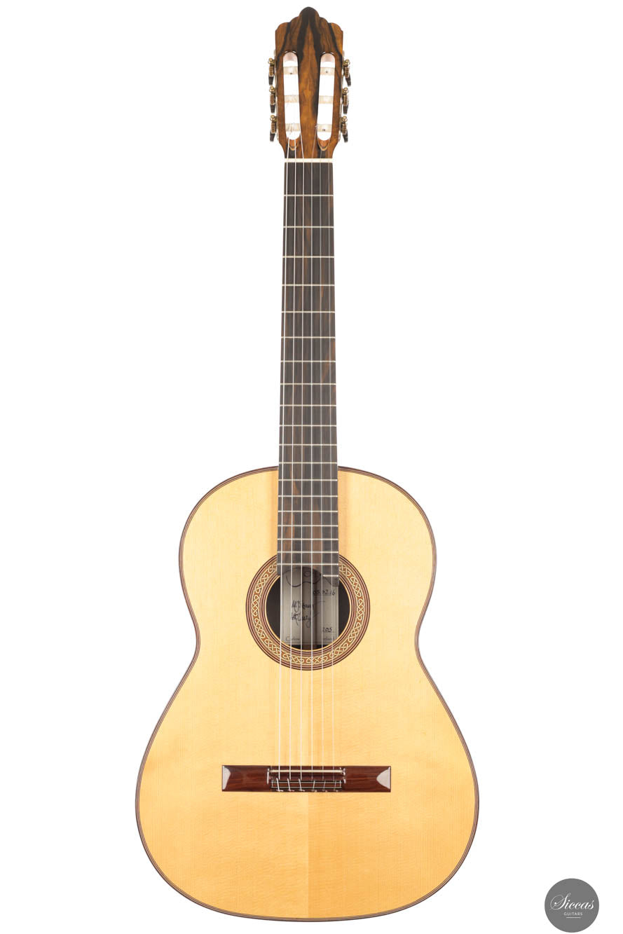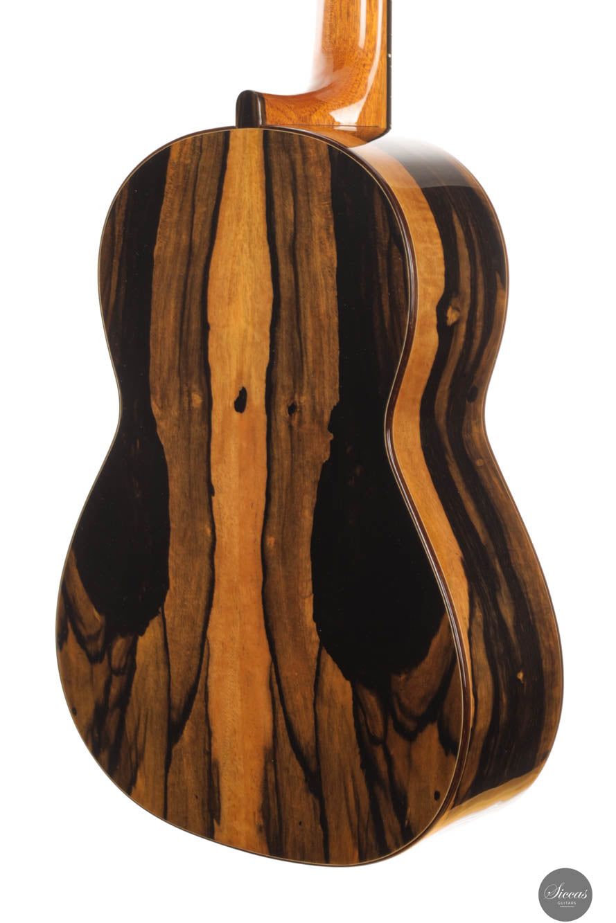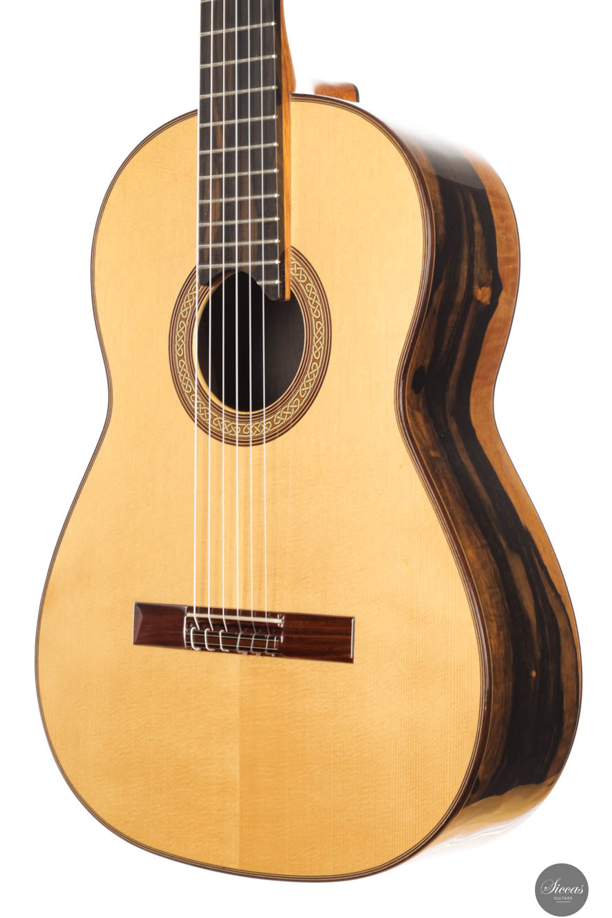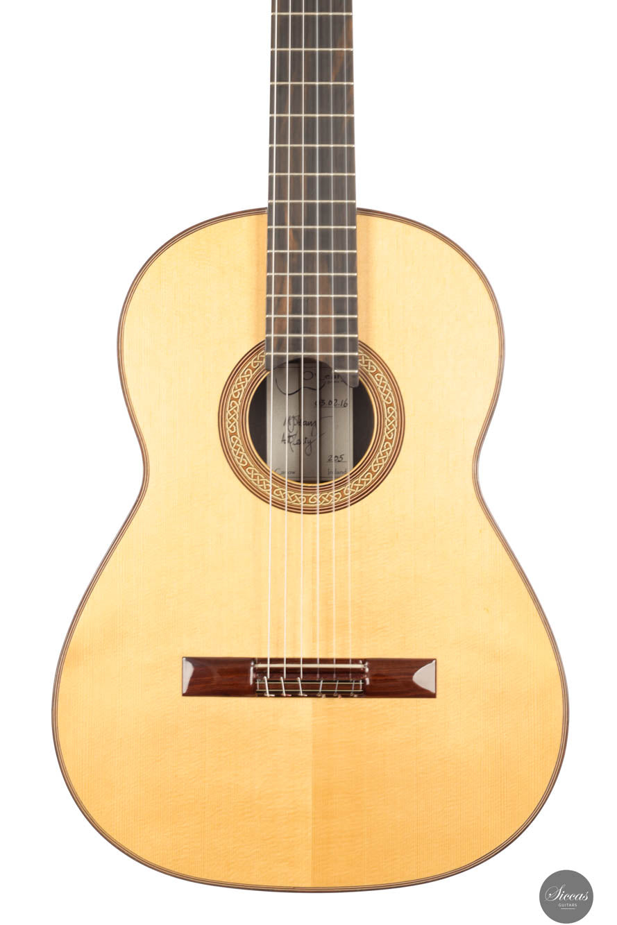 This remarkable guitar from 2021 is the "Exclusive" model, representing the pinnacle of craftsmanship by Michael O’Leary in his Irish workshop. It features a spruce soundboard paired with a stunning African ebony back and sides, showcasing O’Leary’s distinctive design elements such as the intertwined rosette, elevated fingerboard, and braceless back. The construction of this guitar allows for a massive volume while preserving a balanced beauty and subtlety of tone. Its impeccable setup ensures effortless playability. Despite being a second-hand instrument, it remains in excellent condition with minimal playing marks, ready to excel in any concert situation.