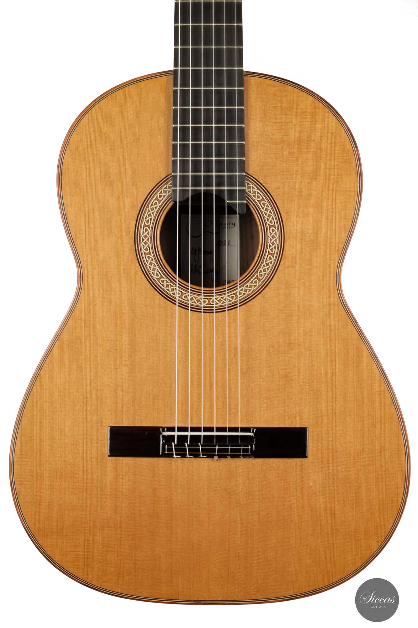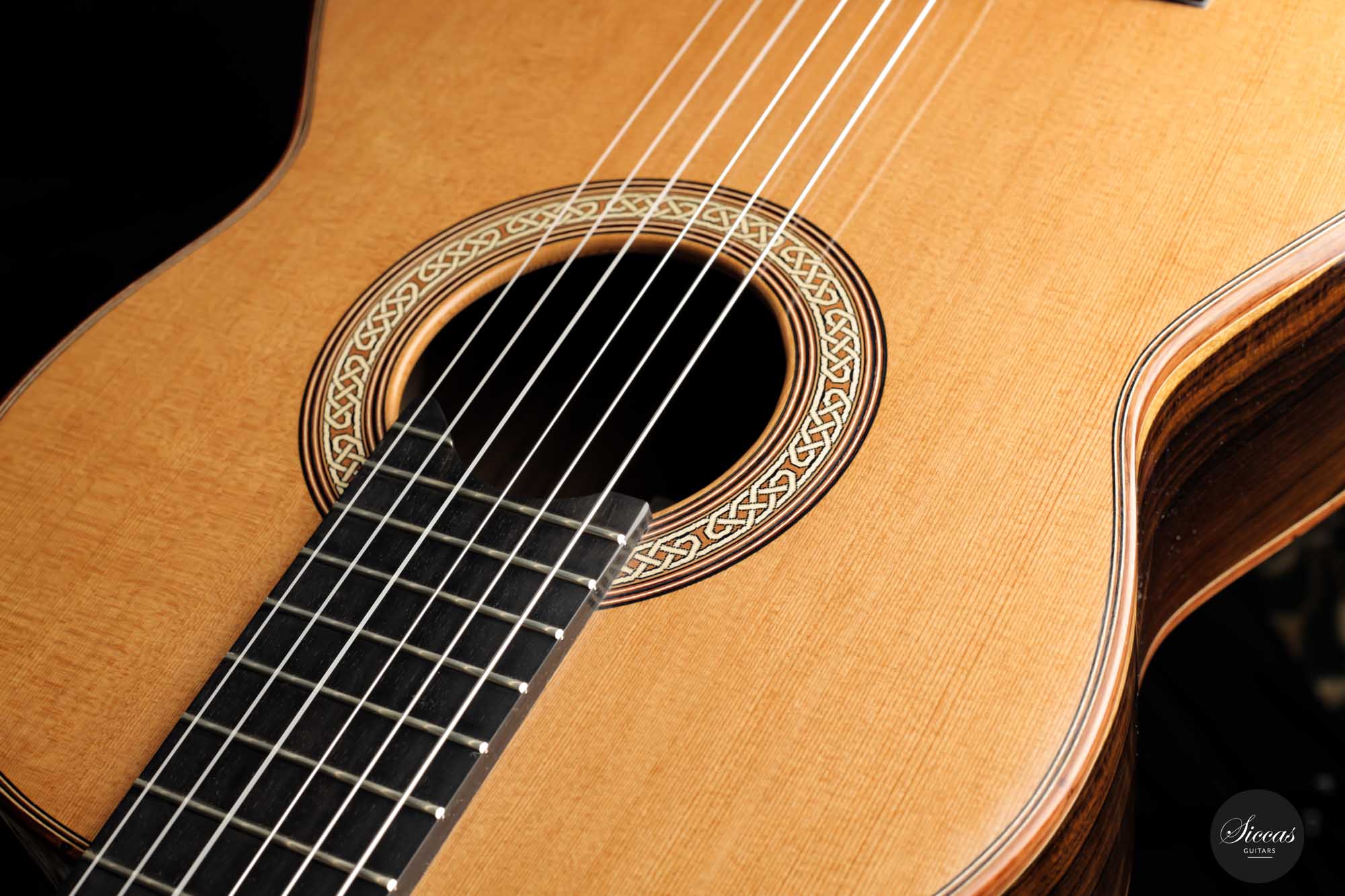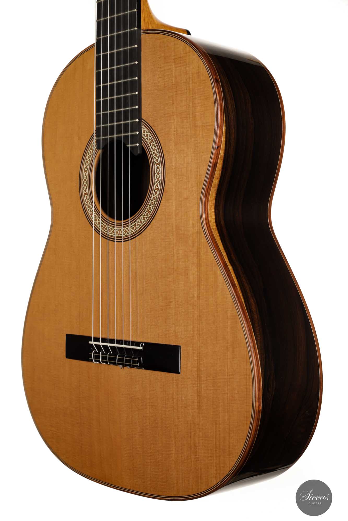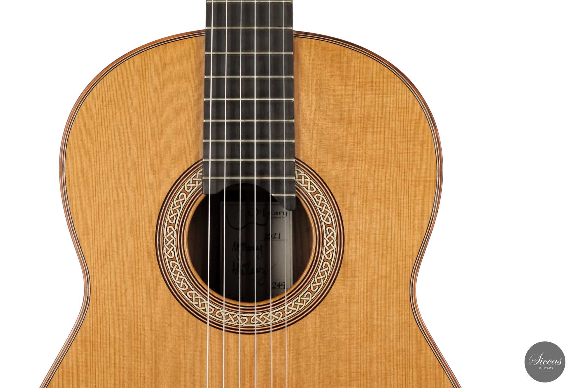 This incredible guitar from 2021 is the "Exclusive" model, the highest model built by Michael O'Leary in his Irish workshop. It has a cedar soundboard combined with a beautiful Ziricote back and sides. It features distinctive elements of O'Leary's guitars, such as the intertwined rosette, the elevated fingerboard, and the braceless back. Due to its construction, this guitar has a massive volume yet maintains its balanced beauty and subtlety of tone. Thanks to its incredible setup, this guitar is effortless to play. Despite being a second-hand instrument, this guitar is in excellent condition with minimal playing marks and is ready to make its way to any concert situation.