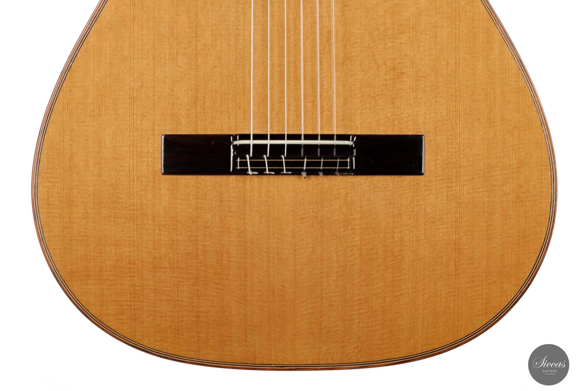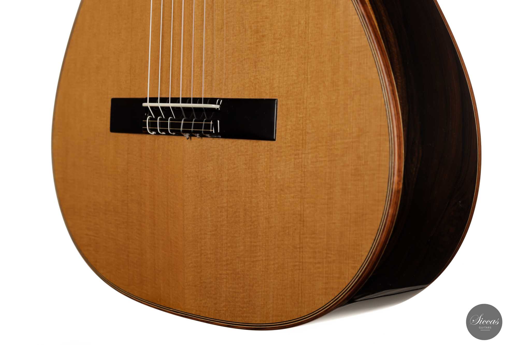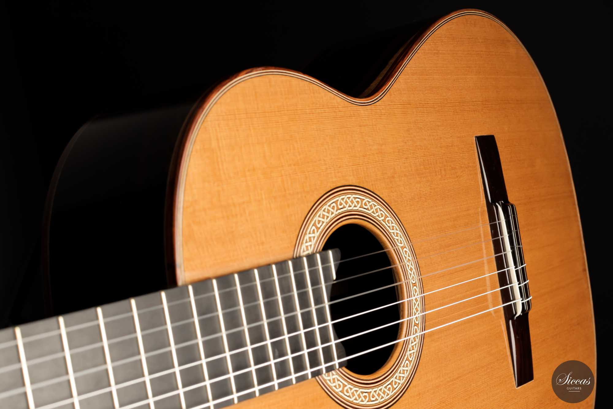 This incredible guitar from 2021 is the "Exclusive" model, the highest model built by Michael O'Leary in his Irish workshop. It has a cedar soundboard combined with a beautiful Ziricote back and sides. It features distinctive elements of O'Leary's guitars, such as the intertwined rosette, the elevated fingerboard, and the braceless back. Due to its construction, this guitar has a massive volume yet maintains its balanced beauty and subtlety of tone. Thanks to its incredible setup, this guitar is effortless to play. Despite being a second-hand instrument, this guitar is in excellent condition with minimal playing marks and is ready to make its way to any concert situation.