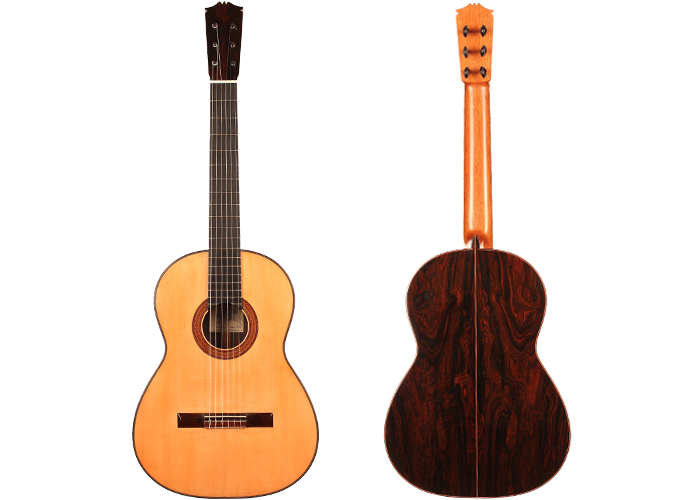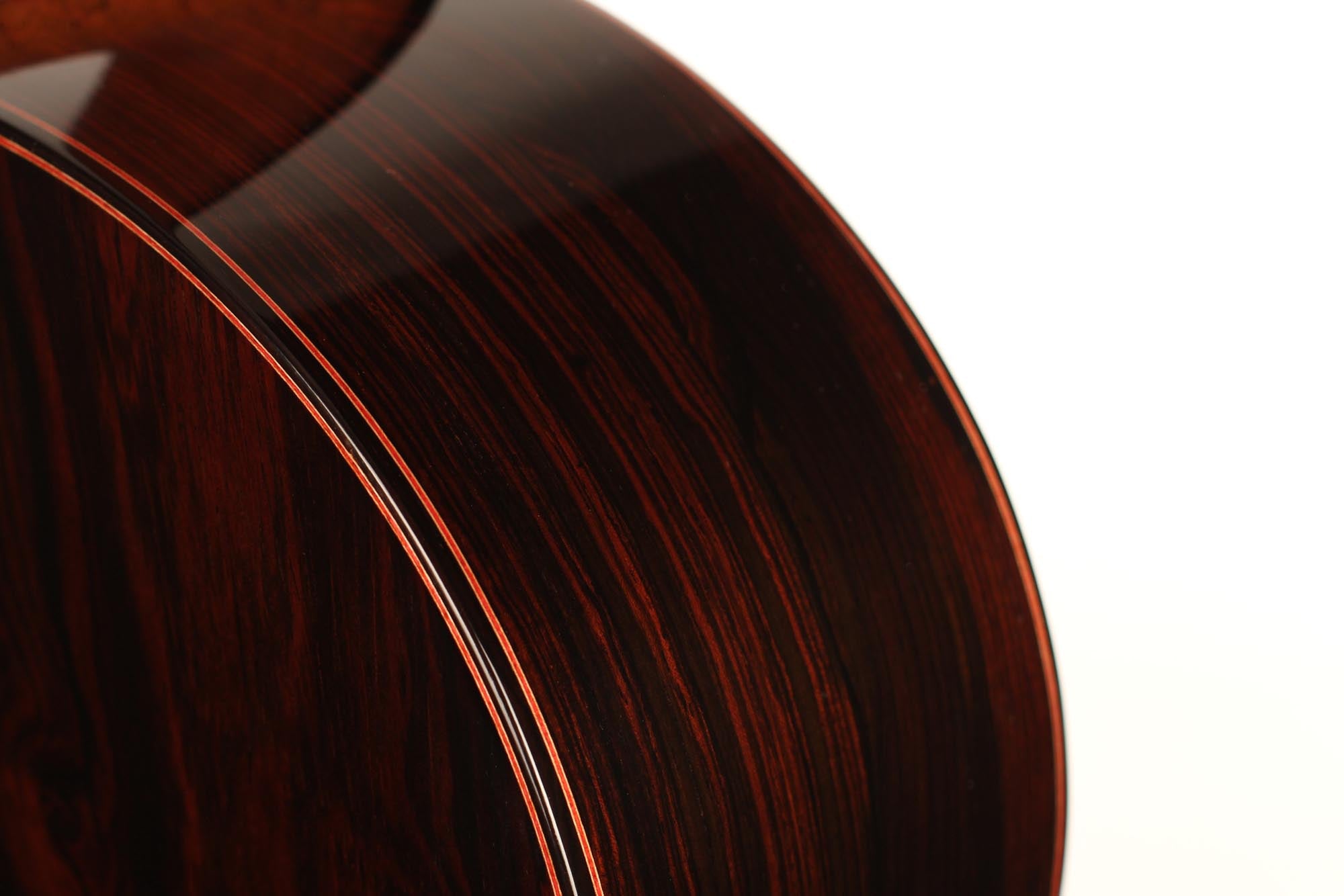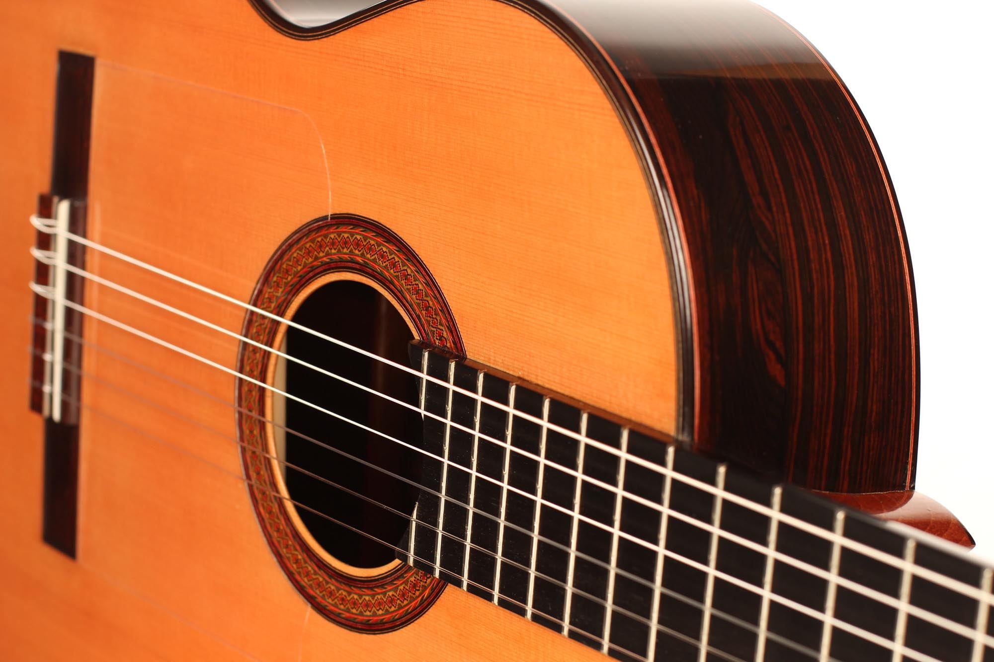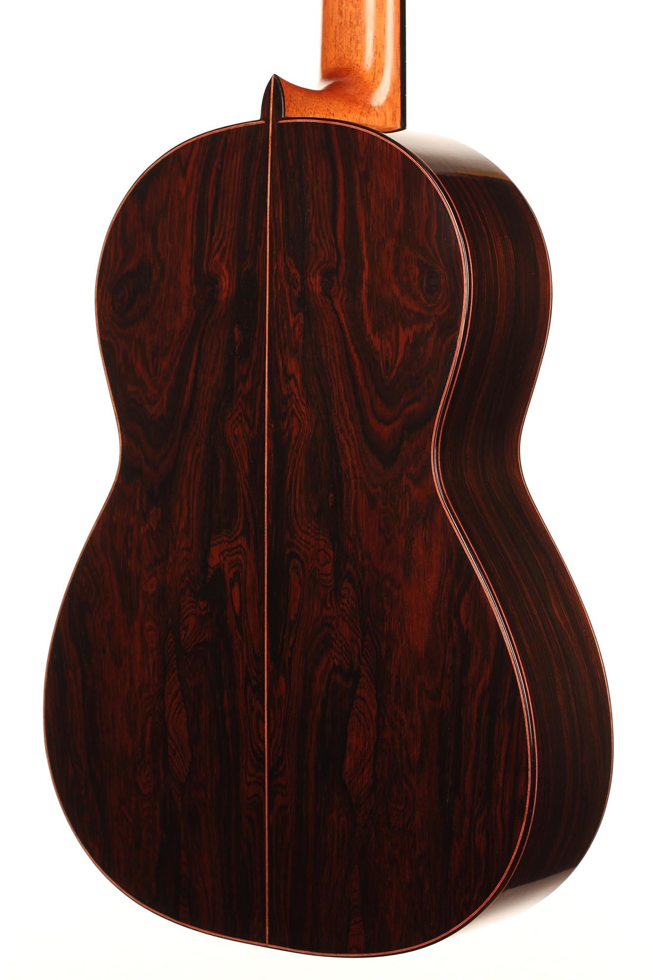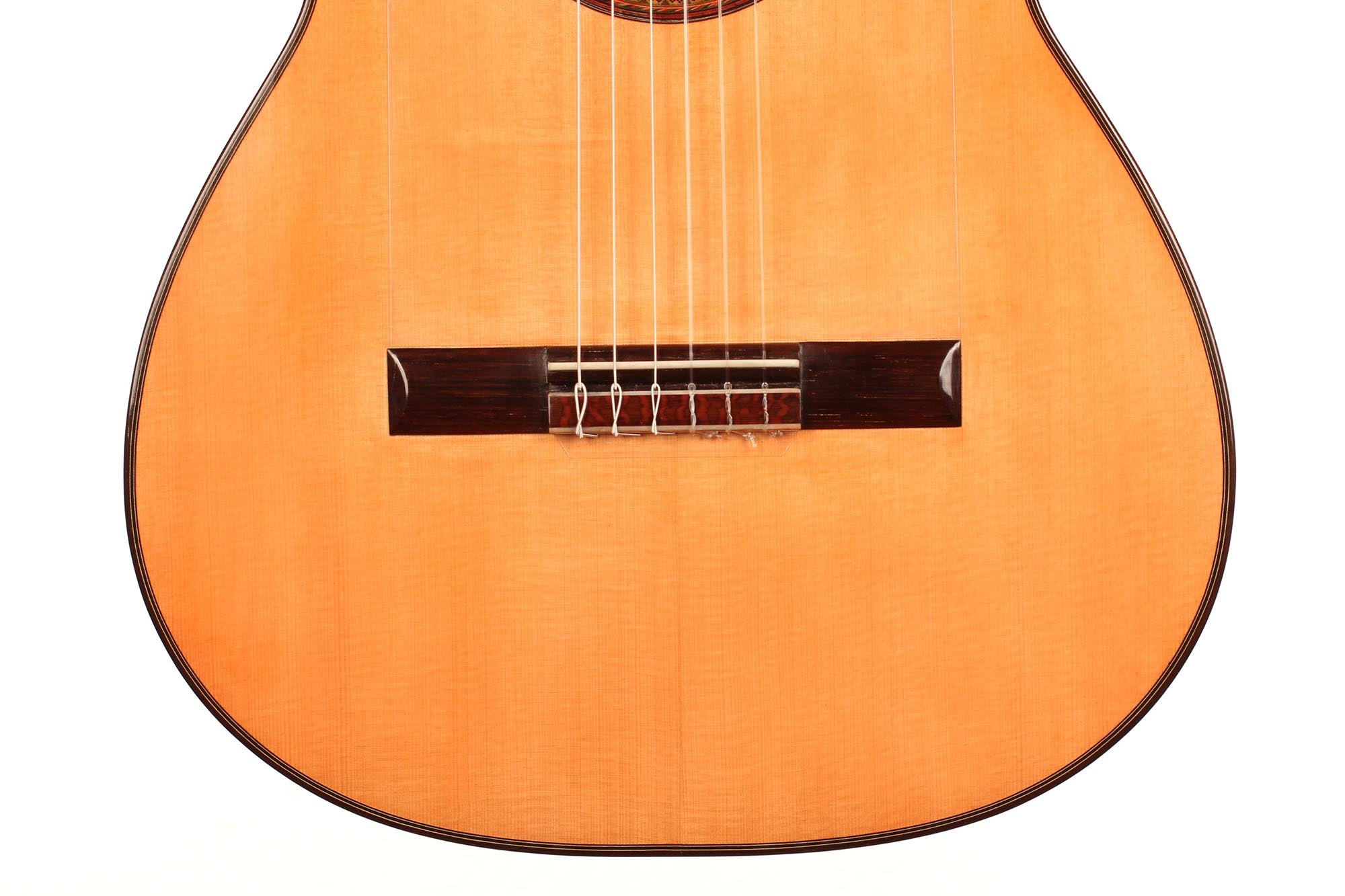 This beautiful flamenco model was built in 2016. It is a very special instrument with CITES certified highly figured Brazilian rosewood back and sides, in excellent condition and only has few superficial playing marks. This guitar can be played in both flamenco and classical style. It is both percussive and singing, has a clear strong attack and a long sustain, and offers a rich colourful tone.