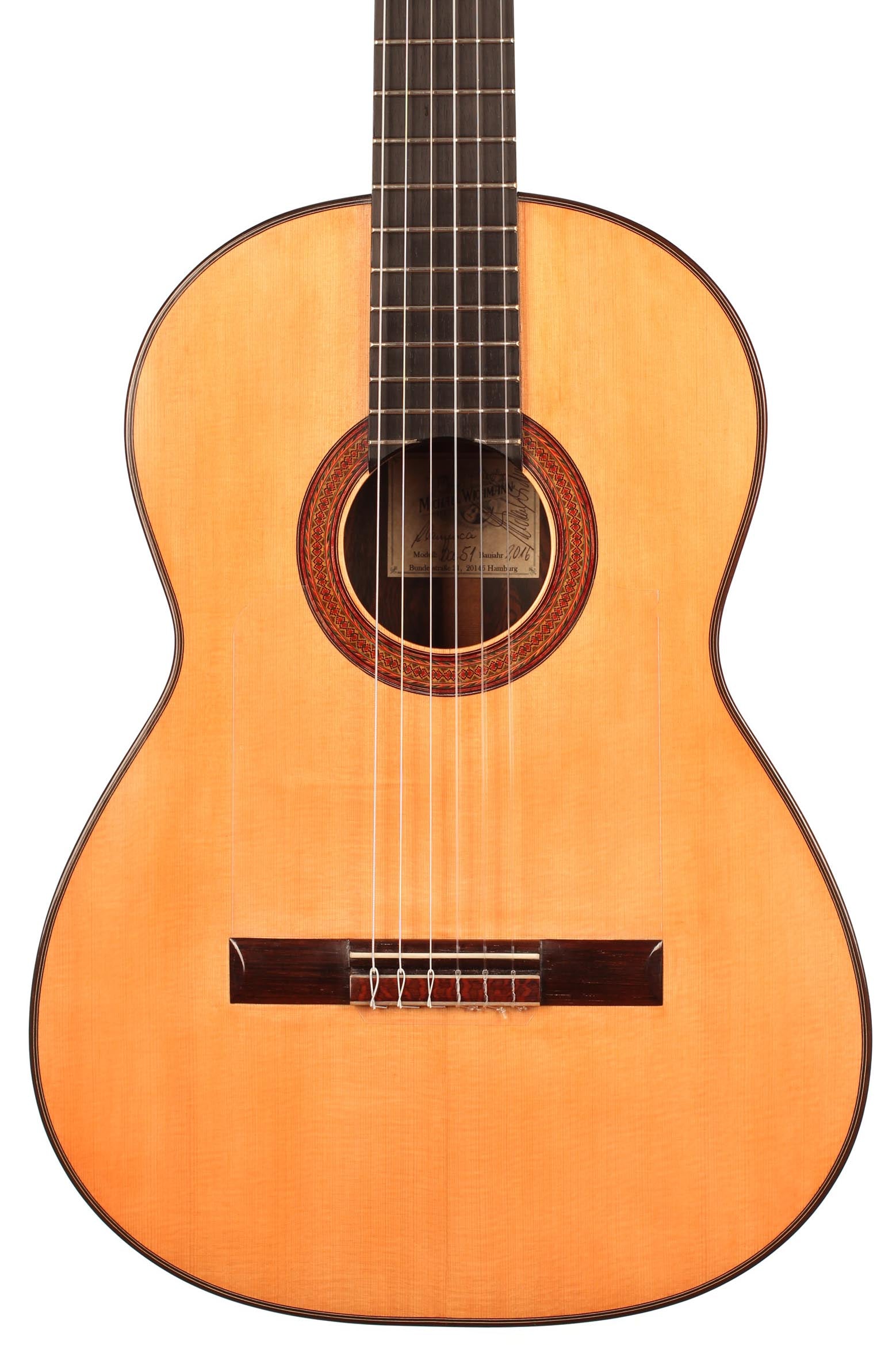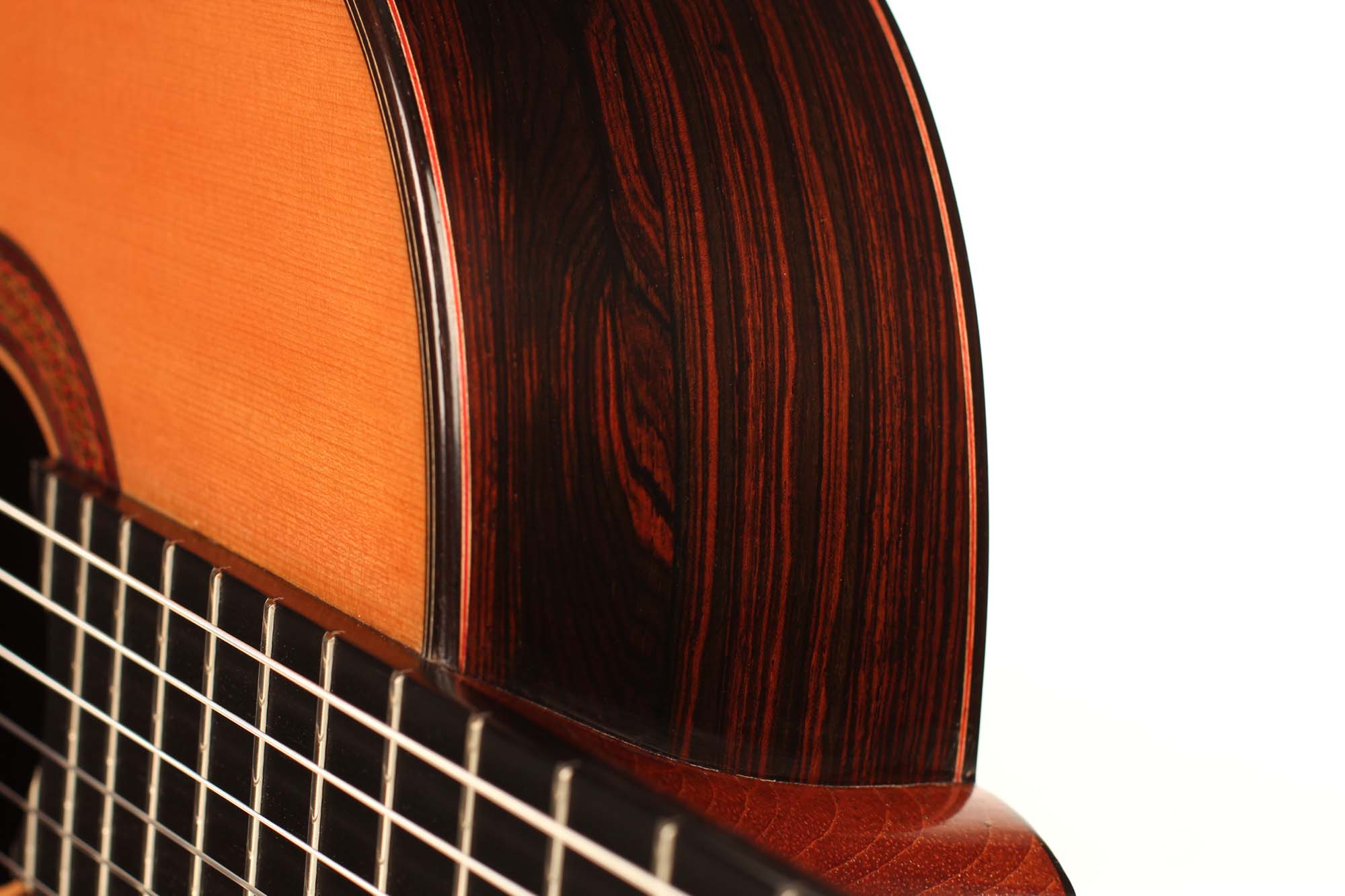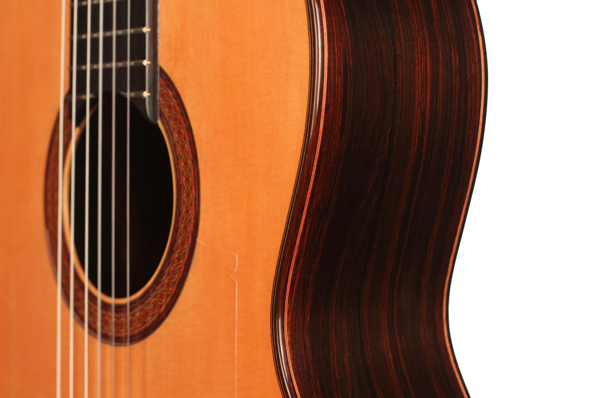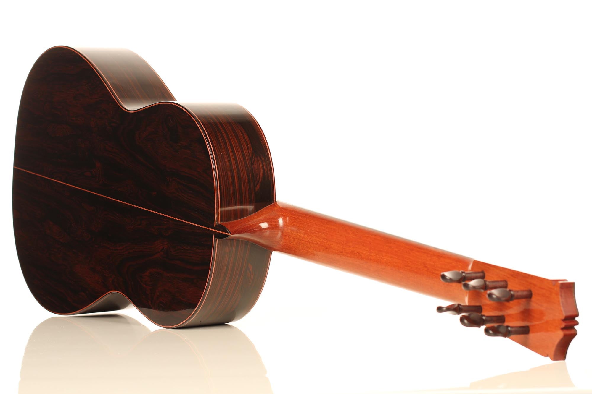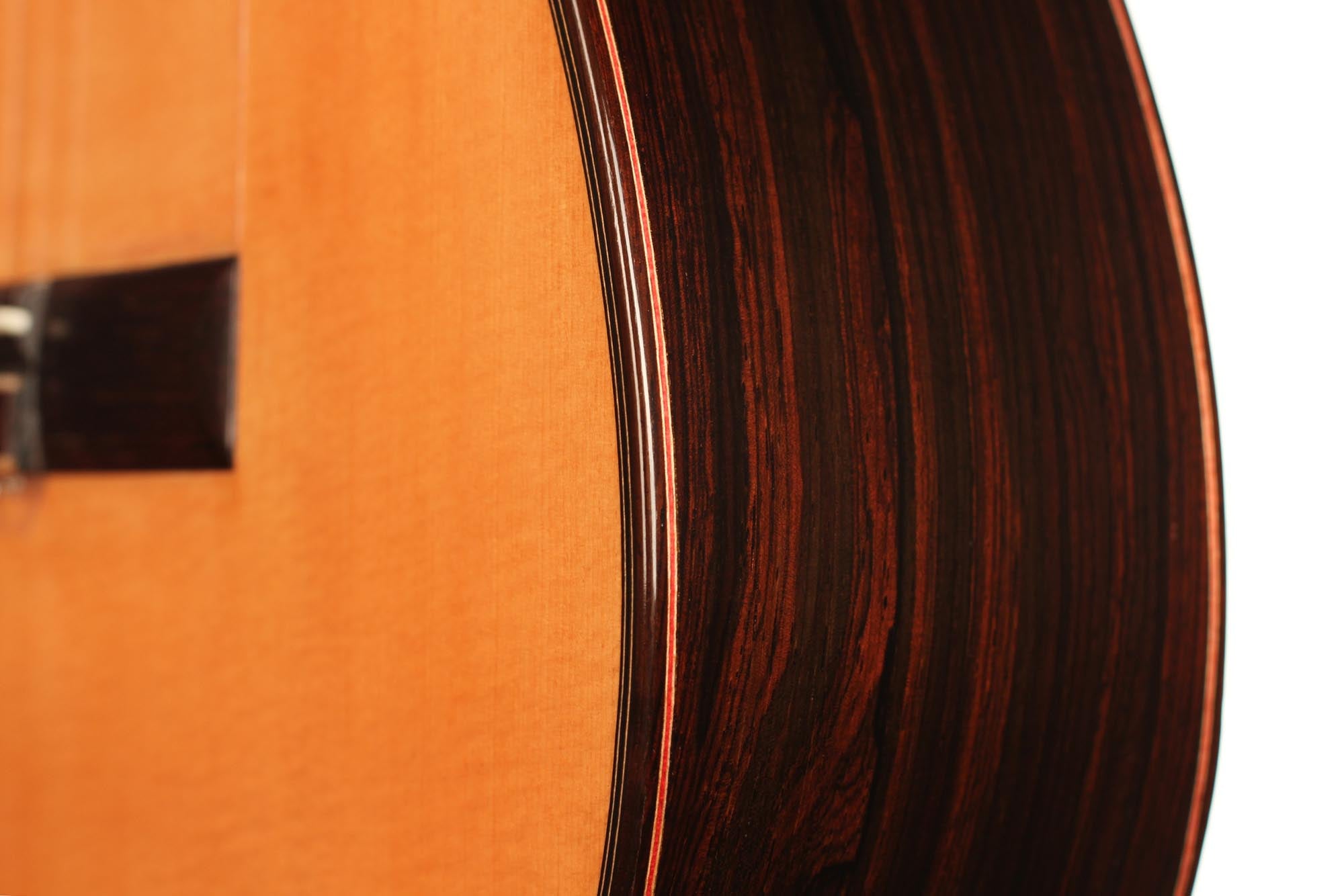 This beautiful flamenco model was built in 2016. It is a very special instrument with CITES certified highly figured Brazilian rosewood back and sides, in excellent condition and only has few superficial playing marks. This guitar can be played in both flamenco and classical style. It is both percussive and singing, has a clear strong attack and a long sustain, and offers a rich colourful tone.
