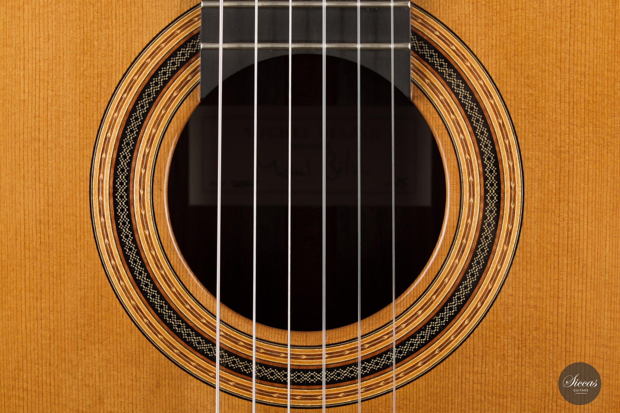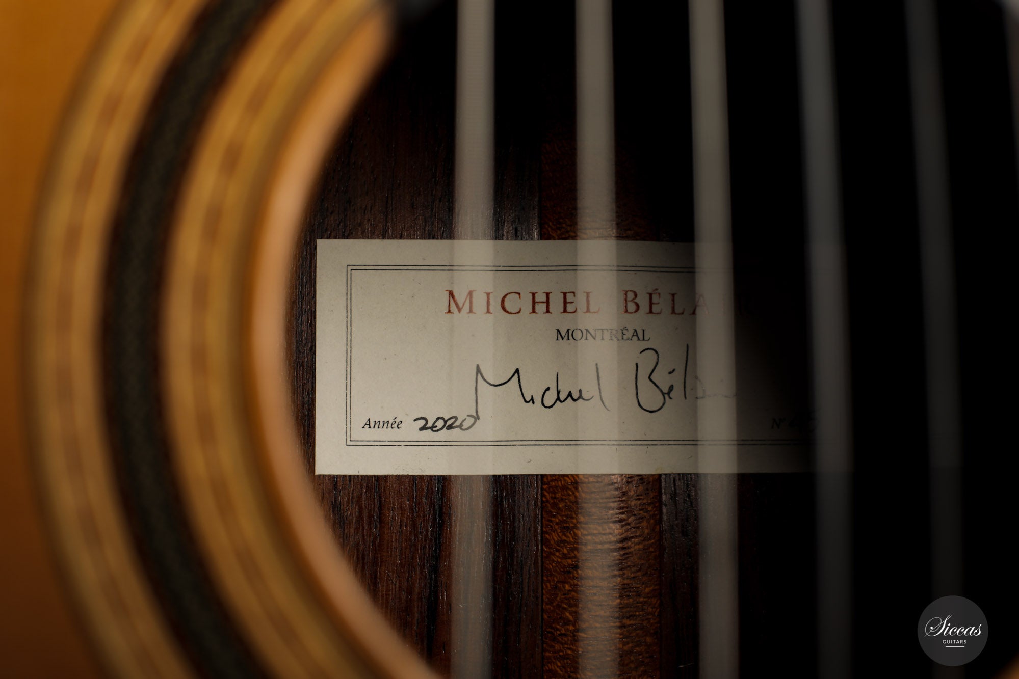 This particular guitar, built in 2020, is an outstanding instrument. It was built just like Michel's "Hommage à Daniel Friederich" model and features the Canadian luthier's rosette and personal purfling design, recognizable for its elegance and delicacy. The instrument is in excellent condition with only a few superficial playing marks. The Vancouver Island cedar top and Indian rosewood back and sides were personally selected on site by Michel Belair in 2006. The German tuners by Scheller, hand-engraved on nickel silver plates, are also of premium quality.