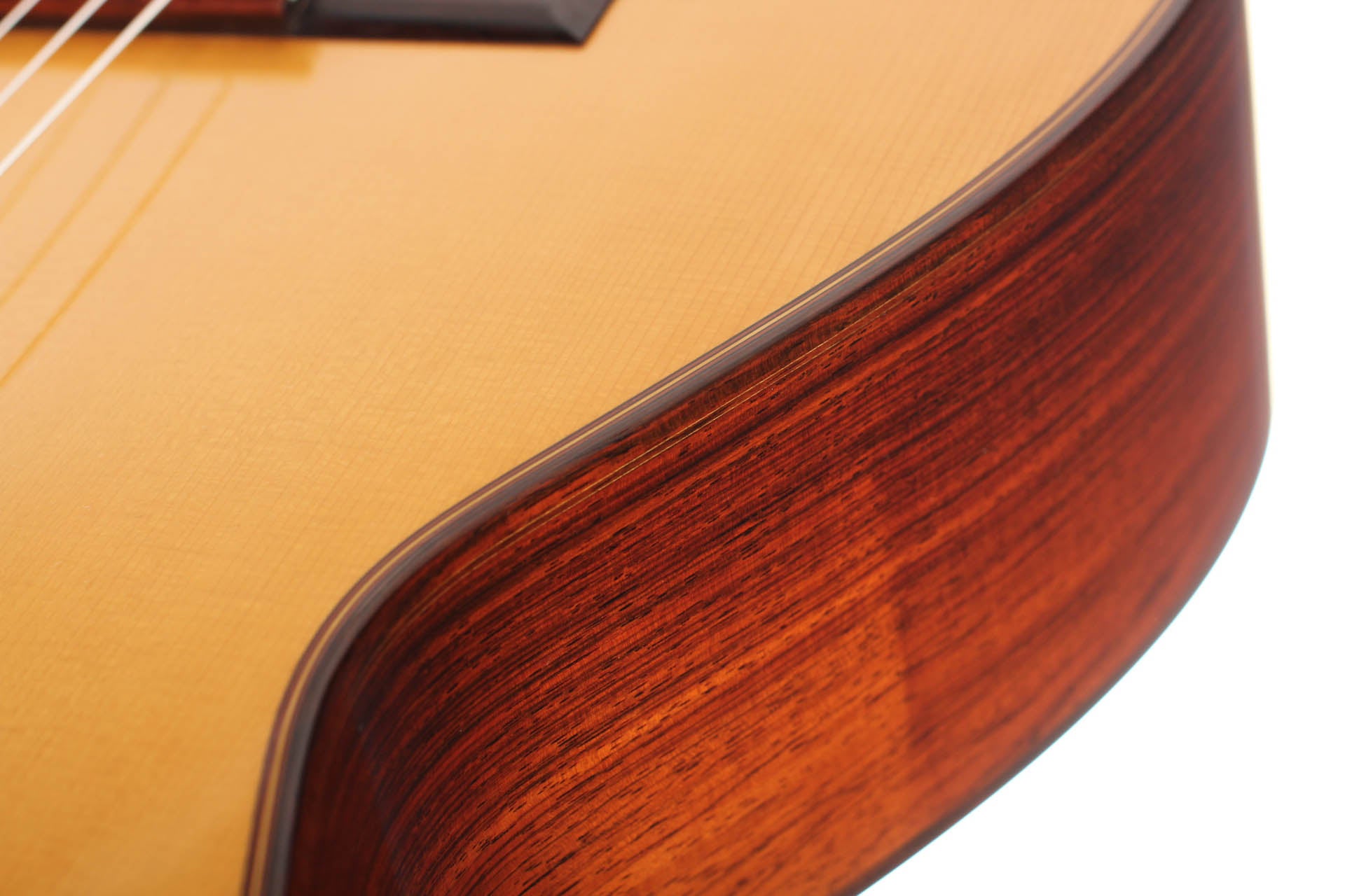 This double top guitar by Michel was built in 2012 and is in really excellent condition. The top is made of fine long seasoned European Spruce. The back and sides are made of the finest red/orange CITES-certified Brazilian rosewood. A raised fingerboard enables the playing of higher positions. This guitar sounds voluminous, forceful and open and has a gorgeously crisp double top bass. Played softly the warm deeper mids and the pearly trebles fill the room. The condition is very good. On the back is a little repaired crack that is nearly invisible. The tuners are made by Alessi. A hard-shell case is included.