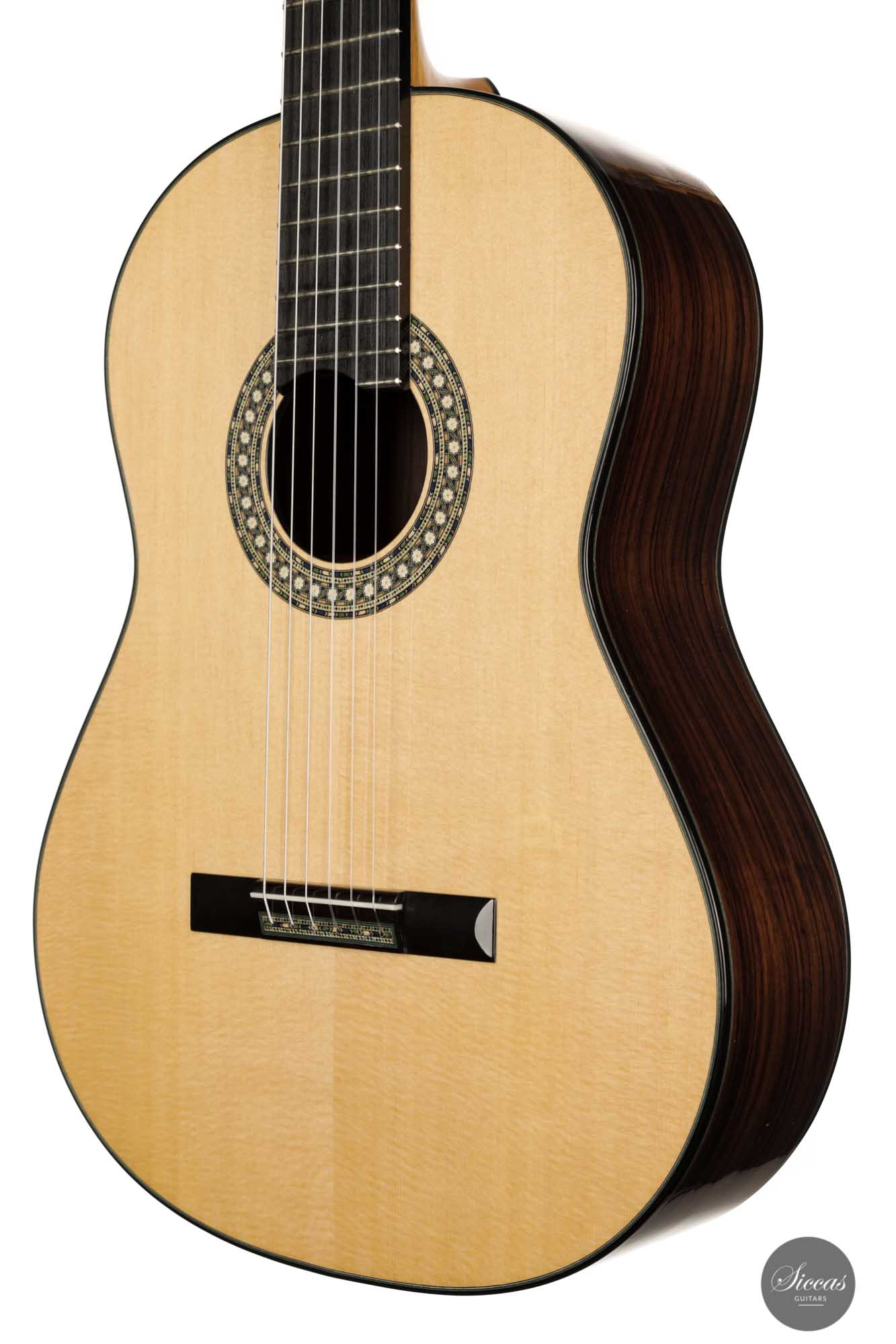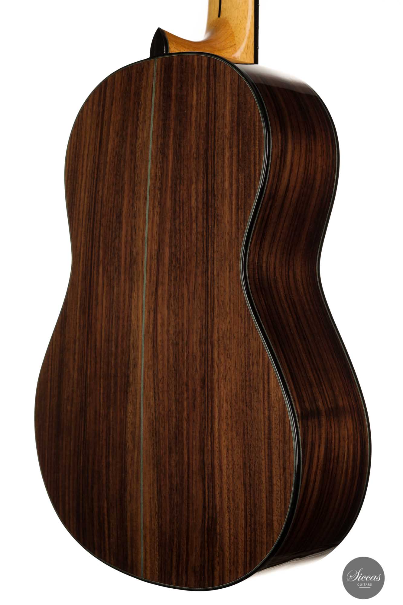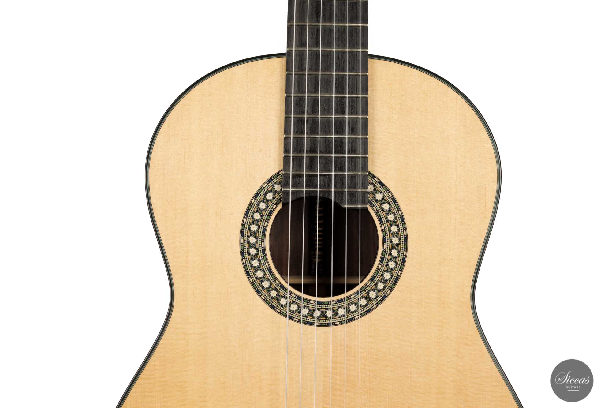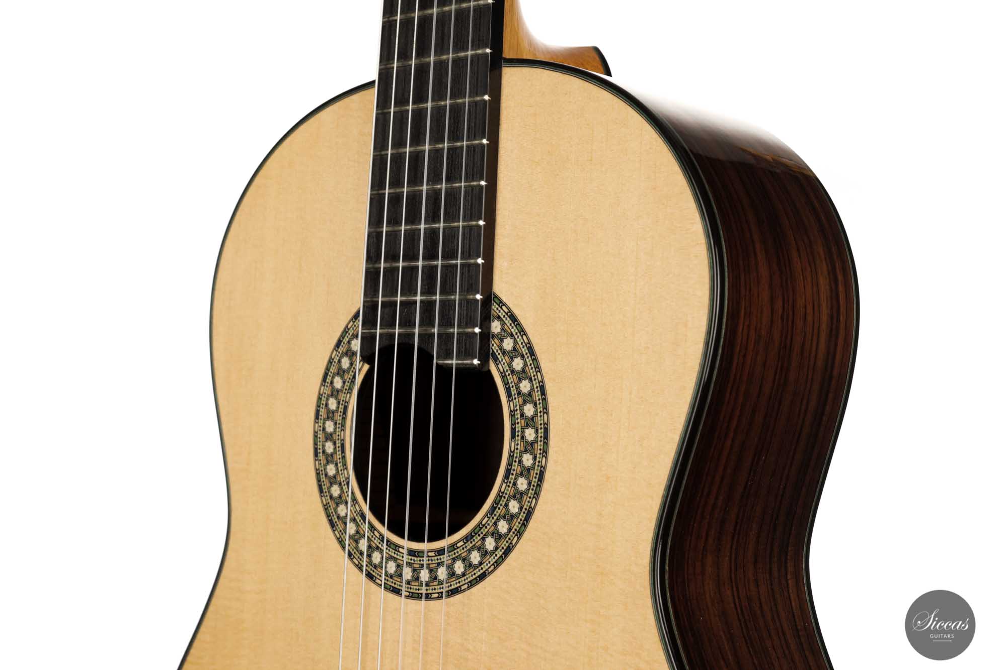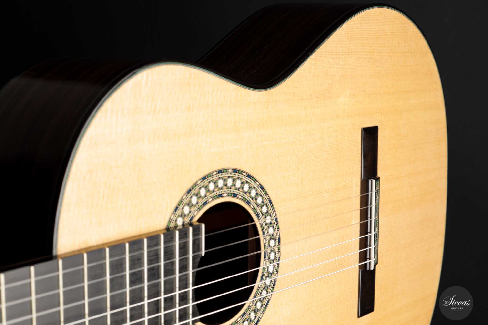 This wonderful 2022 instrument is built with a spruce top with lattice bracing. Aesthetically, it is heavily inspired by Moorish art as depicted in the ornaments of the Alhambra in Granada, Spain. The sumptuous and colourful geometric mosaic of the rosette adds a unique appearance to this instrument and displays Miguel Angel's masterful artistry. Its response and tonal volume, as well as the 65 cm scale length and 52 mm nut, make this model an excellent classical guitar that is suitable for most guitarists, providing fantastic playing comfort and an elegant, carrying overall sound.