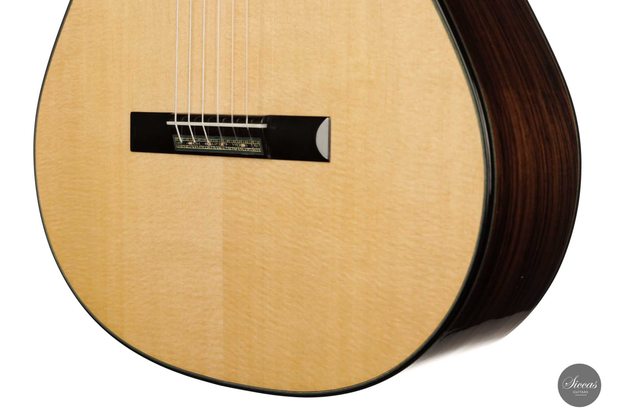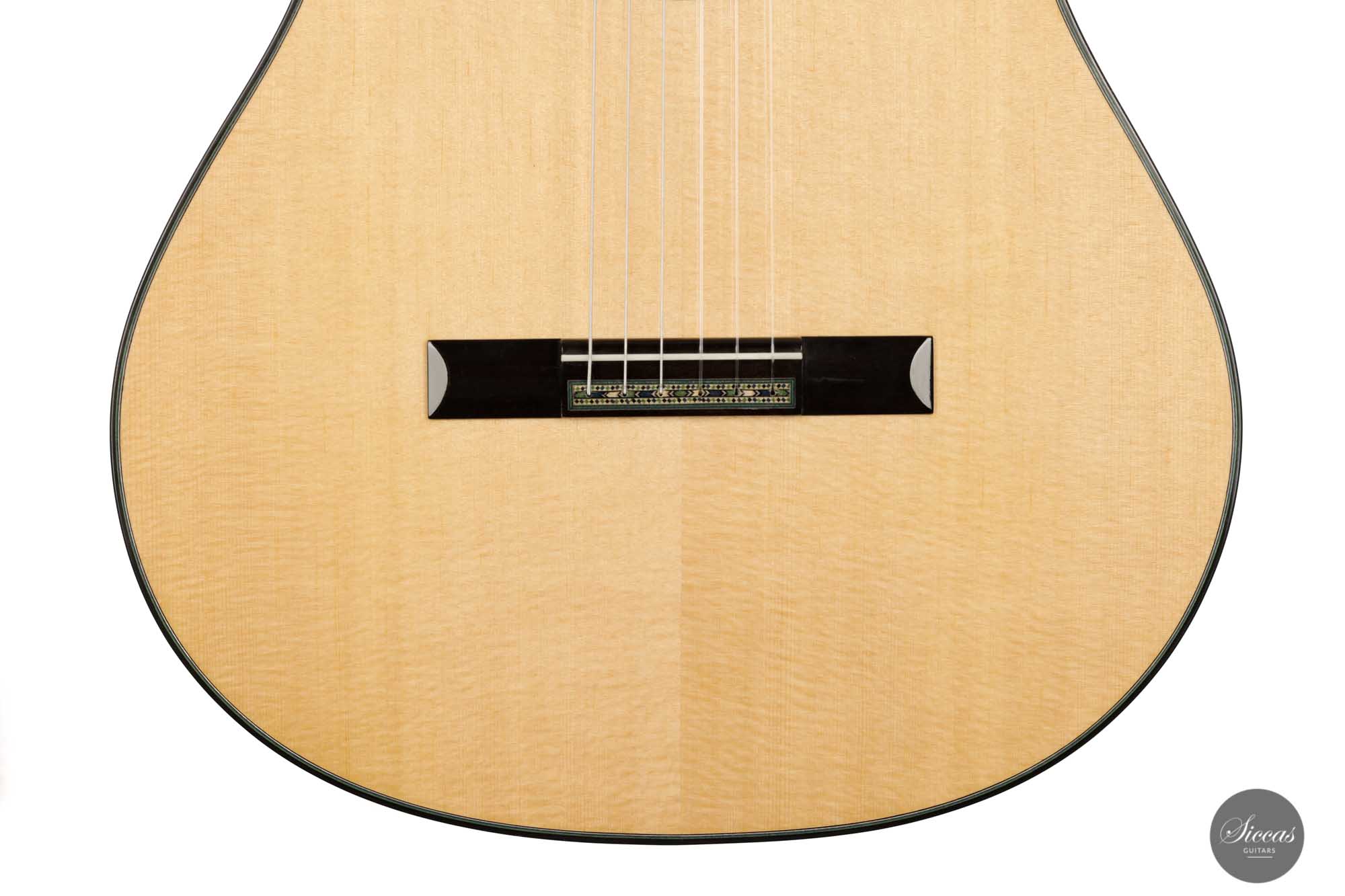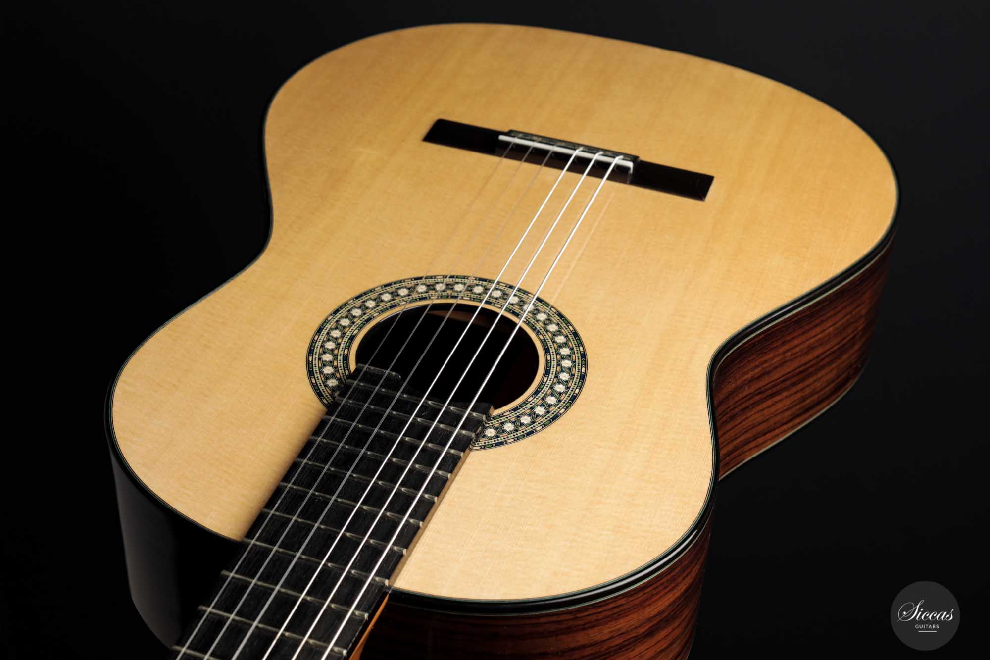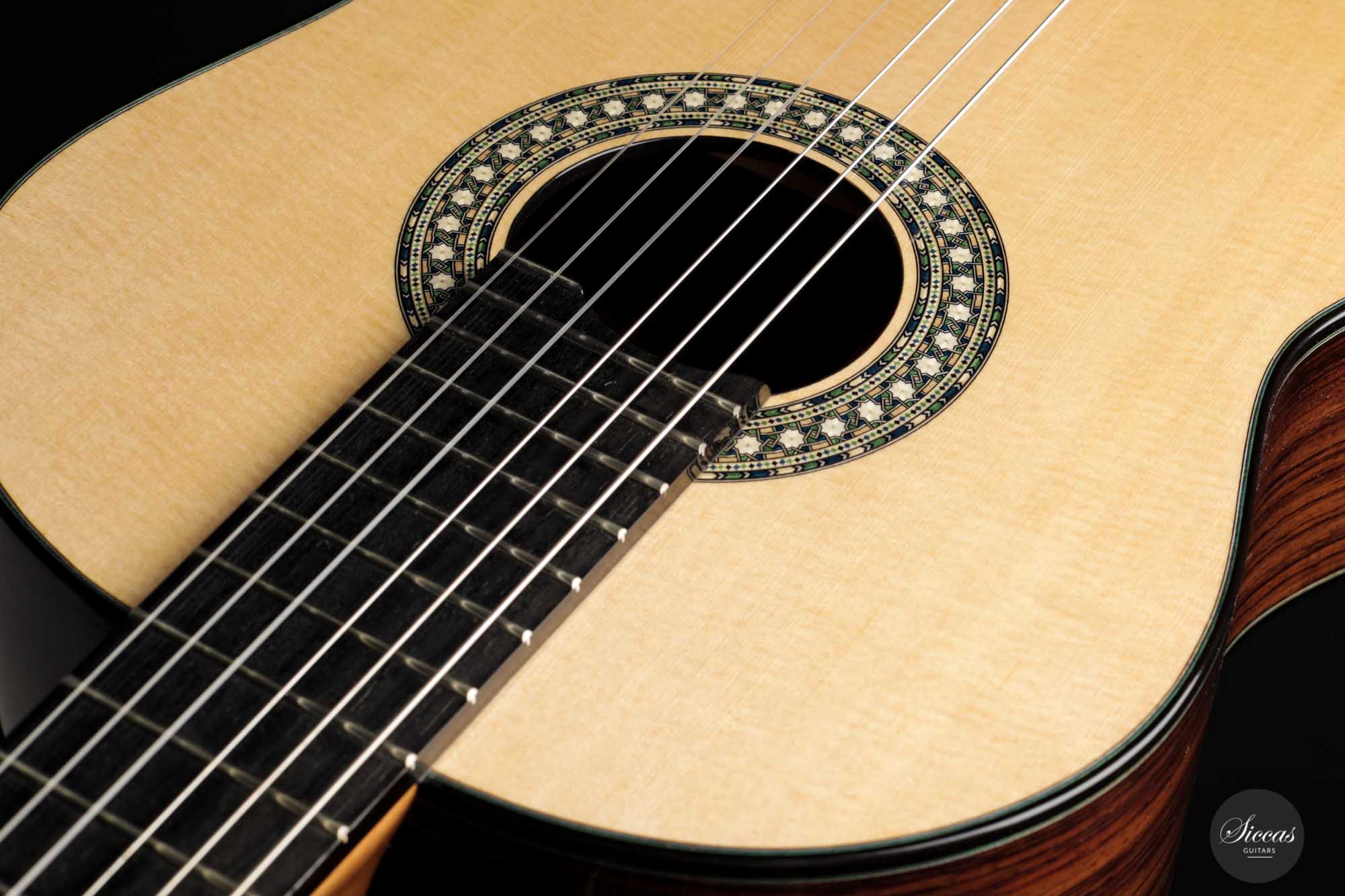 This wonderful 2022 instrument is built with a spruce top with lattice bracing. Aesthetically, it is heavily inspired by Moorish art as depicted in the ornaments of the Alhambra in Granada, Spain. The sumptuous and colourful geometric mosaic of the rosette adds a unique appearance to this instrument and displays Miguel Angel's masterful artistry. Its response and tonal volume, as well as the 65 cm scale length and 52 mm nut, make this model an excellent classical guitar that is suitable for most guitarists, providing fantastic playing comfort and an elegant, carrying overall sound.
