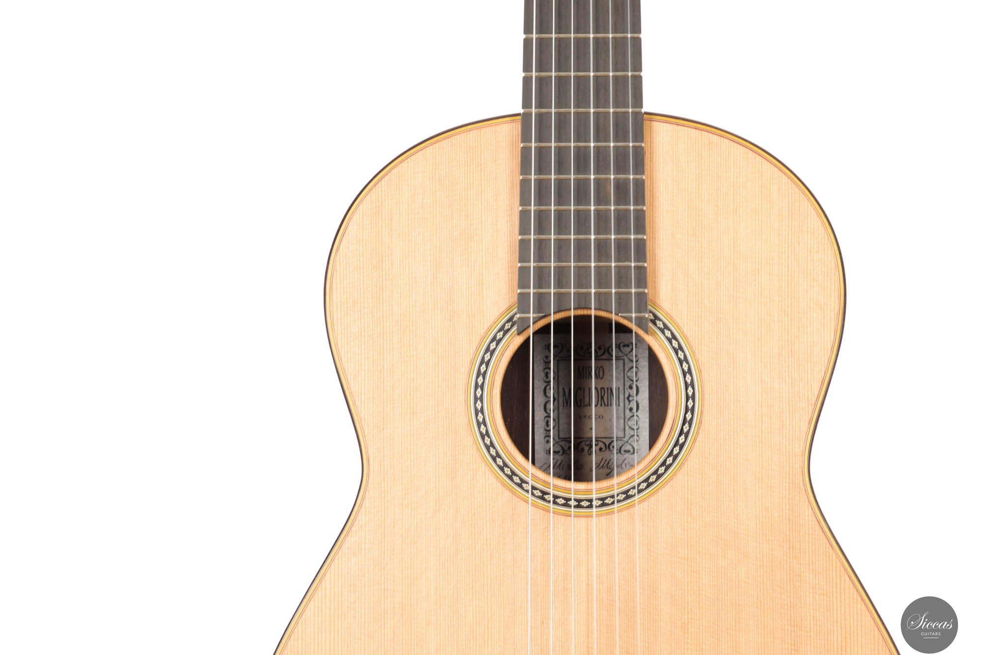 Despite its modern construction, this instrument retains classic design elements, such as a traditional rosette and headstock, enhancing its timeless aesthetic. For the finish, Mirko has applied a unique shellac formula, strengthened with nitrocellulose and other resins, resulting in a thin yet durable coating that enhances the instrument’s tonal response while ensuring long-term protection.