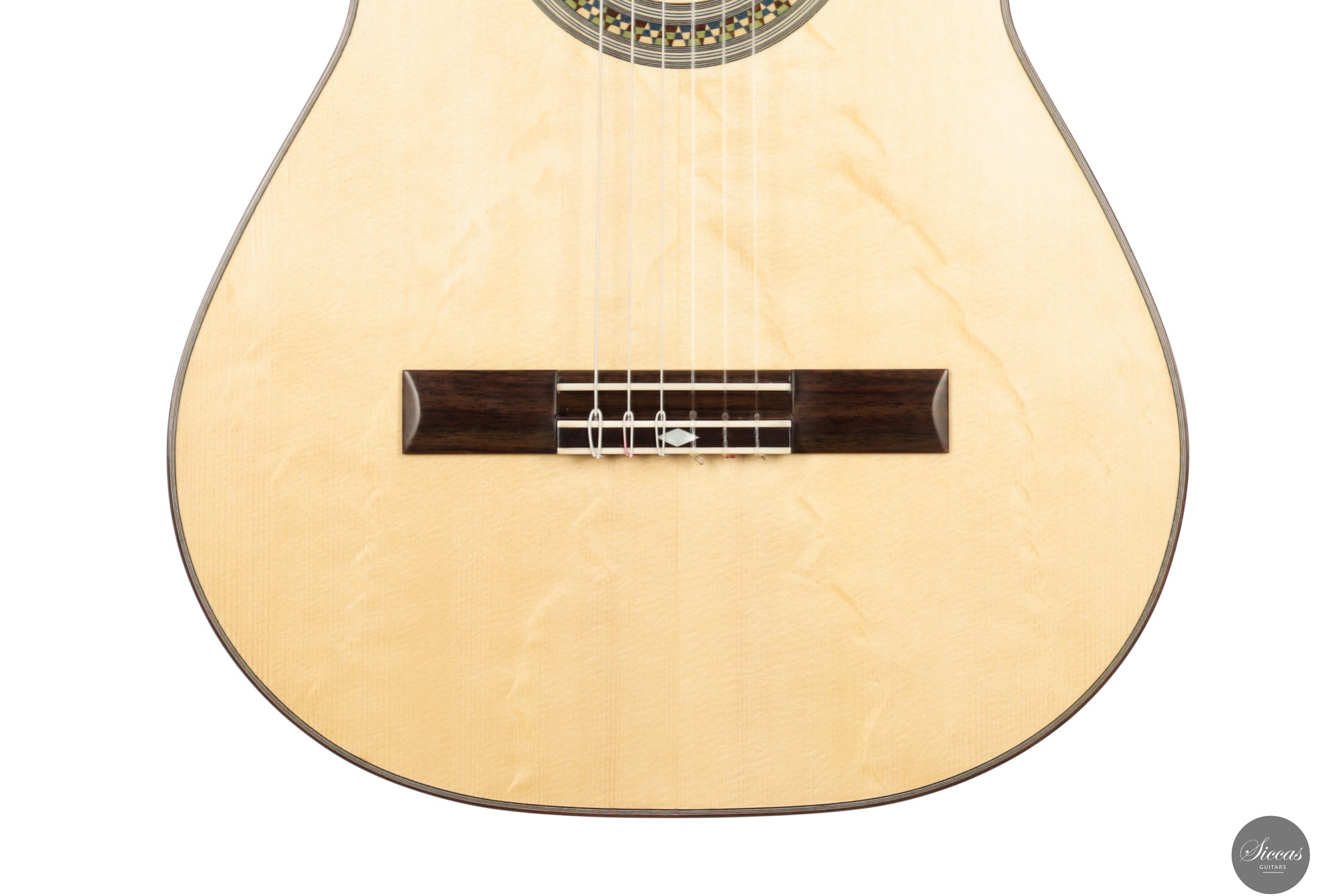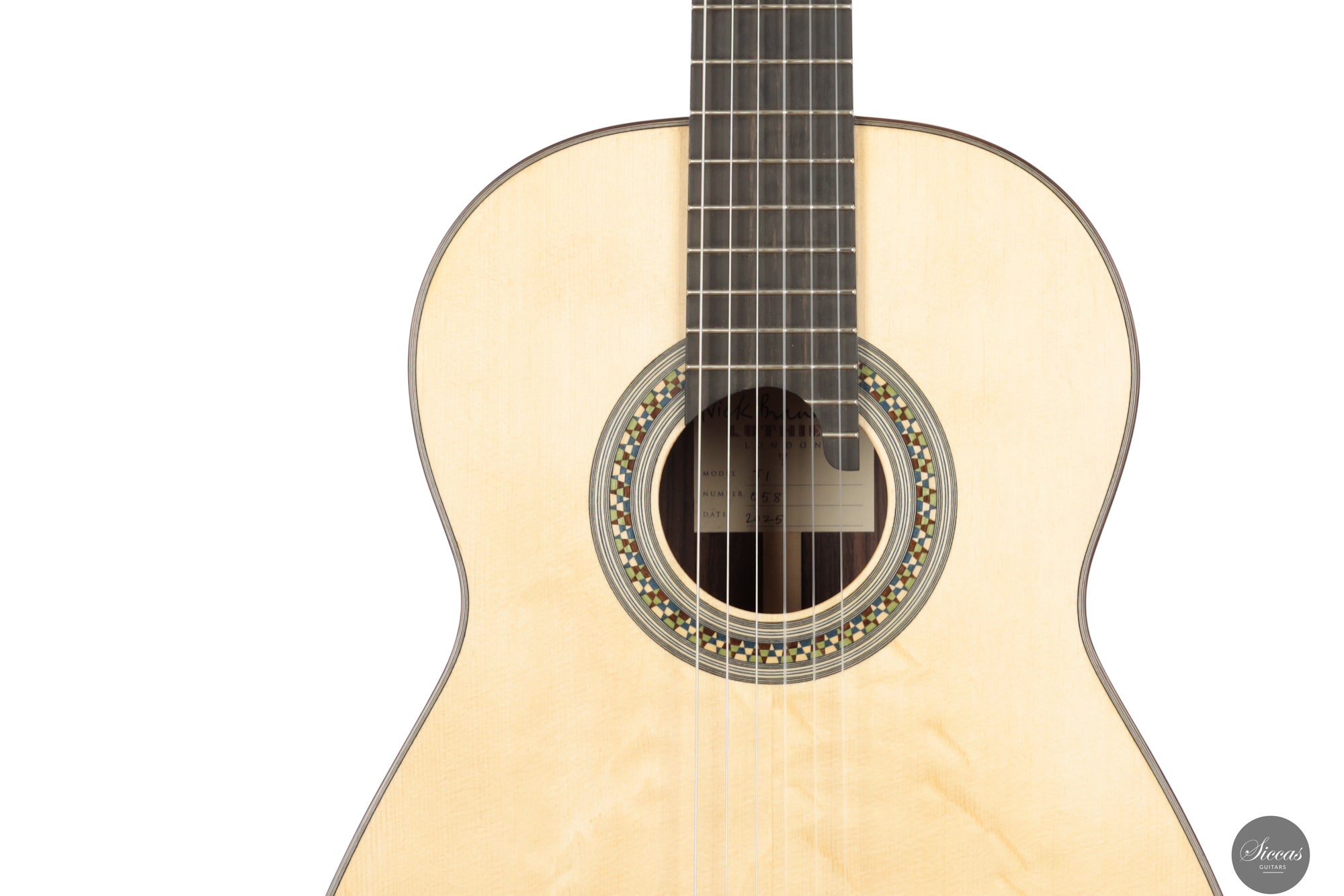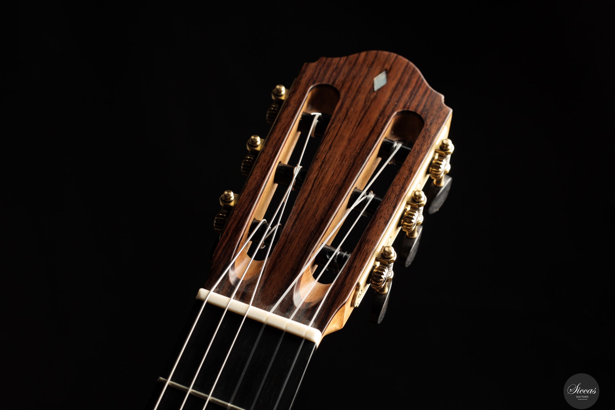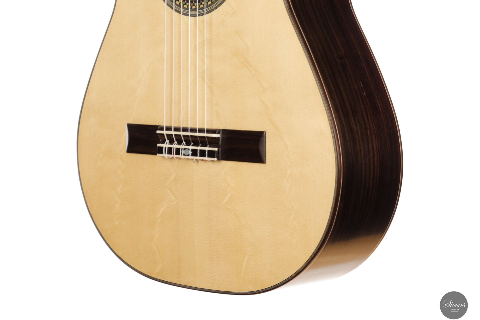 The No. 58 is a traditionally built concert guitar crafted in 2025, featuring a spruce top and Indian rosewood back and sides, finished in French polish. Weighing only 1435 grams, it is notably lightweight. The air body resonance lies between F♯ and G, supporting a warm, balanced core tone. A distinctive feature is its exceptionally comfortable neck, noted for its ease of play across all positions. Tonally, the guitar offers a soft attack and rounded timbre, with a gentle tonal character that leans toward warmth despite the spruce top. This guitar rewards nuanced phrasing and long practice sessions, making it a refined option for both students and professionals seeking an understated yet expressive instrument.