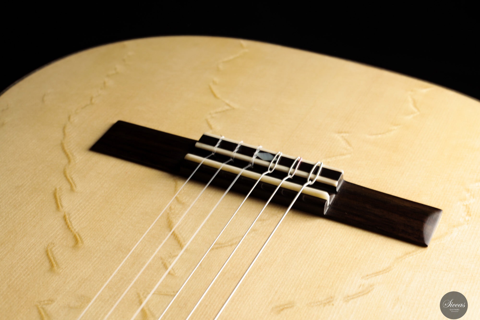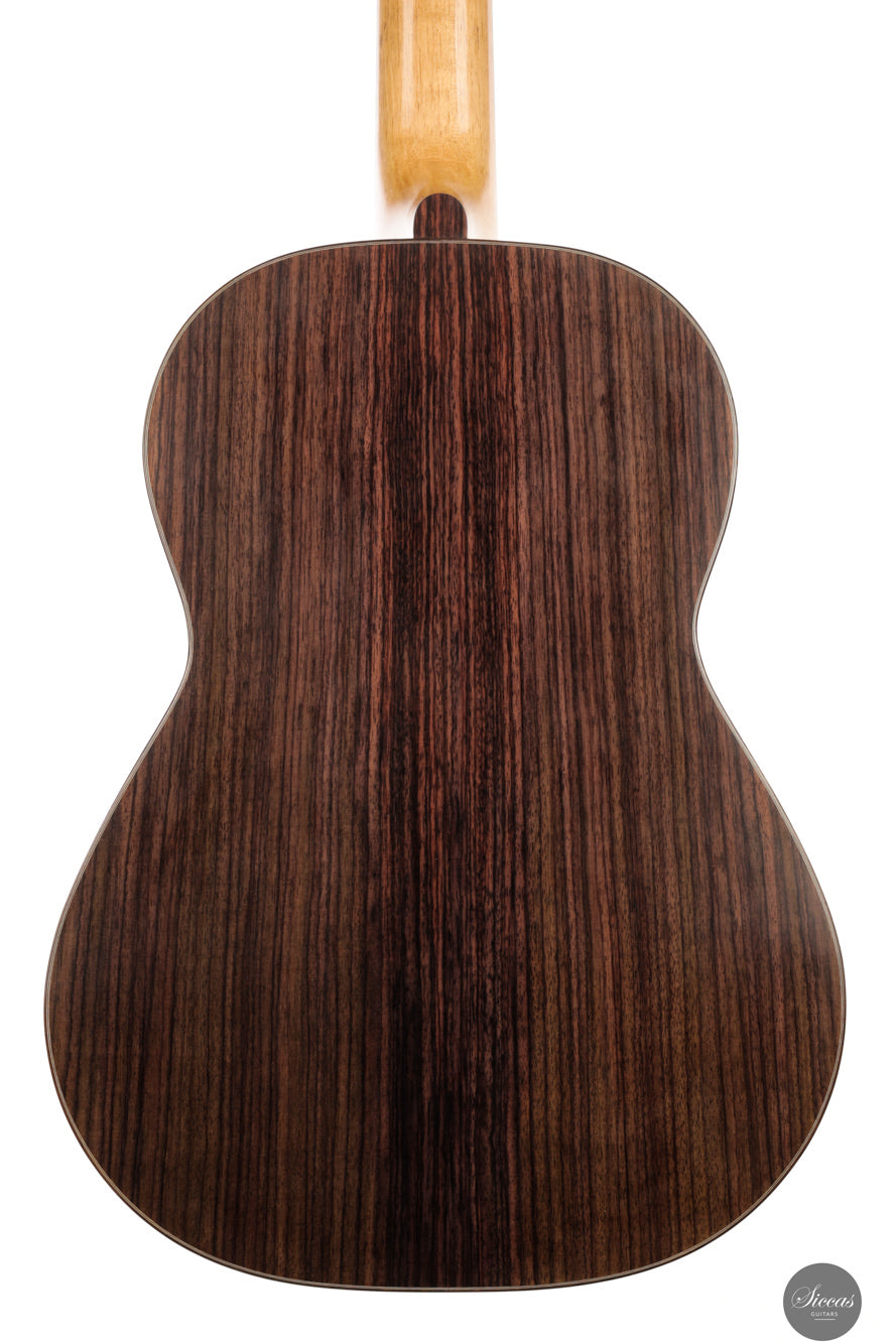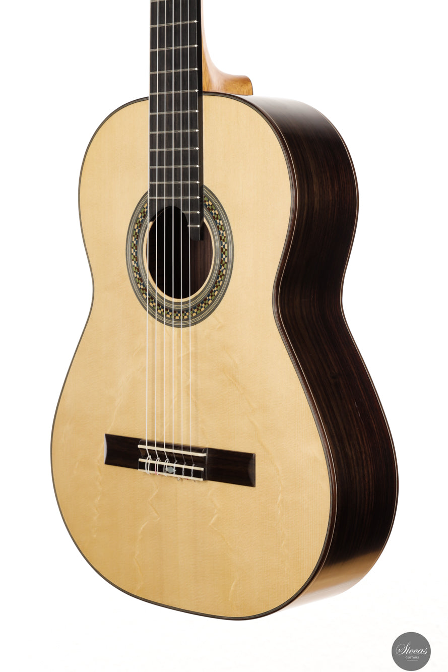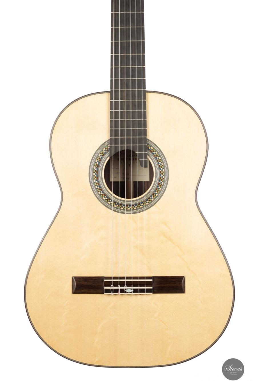 The No. 58 is a traditionally built concert guitar crafted in 2025, featuring a spruce top and Indian rosewood back and sides, finished in French polish. Weighing only 1435 grams, it is notably lightweight. The air body resonance lies between F♯ and G, supporting a warm, balanced core tone. A distinctive feature is its exceptionally comfortable neck, noted for its ease of play across all positions. Tonally, the guitar offers a soft attack and rounded timbre, with a gentle tonal character that leans toward warmth despite the spruce top. This guitar rewards nuanced phrasing and long practice sessions, making it a refined option for both students and professionals seeking an understated yet expressive instrument.