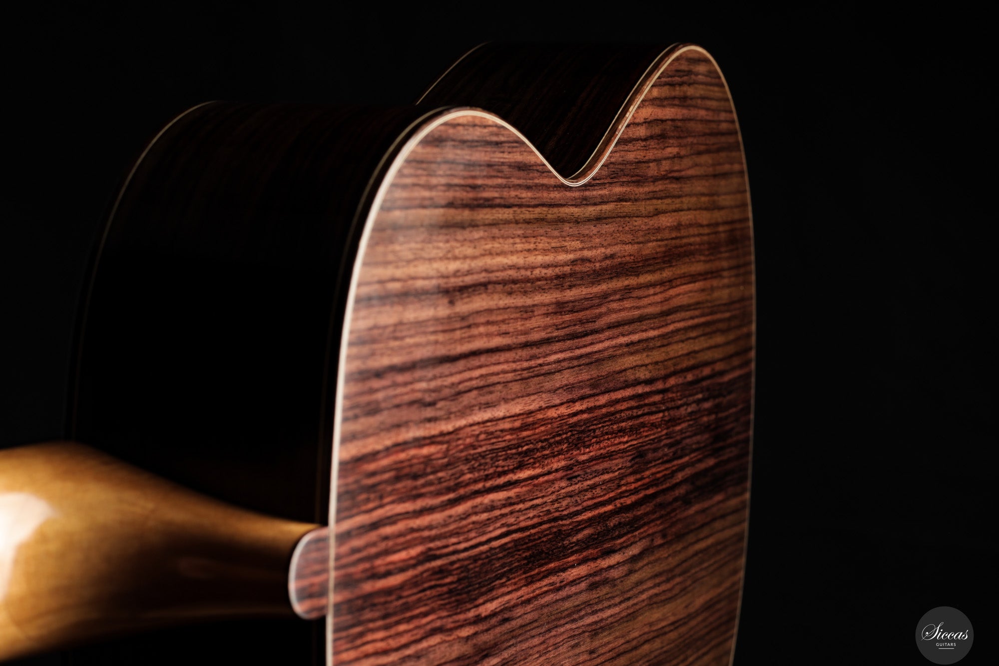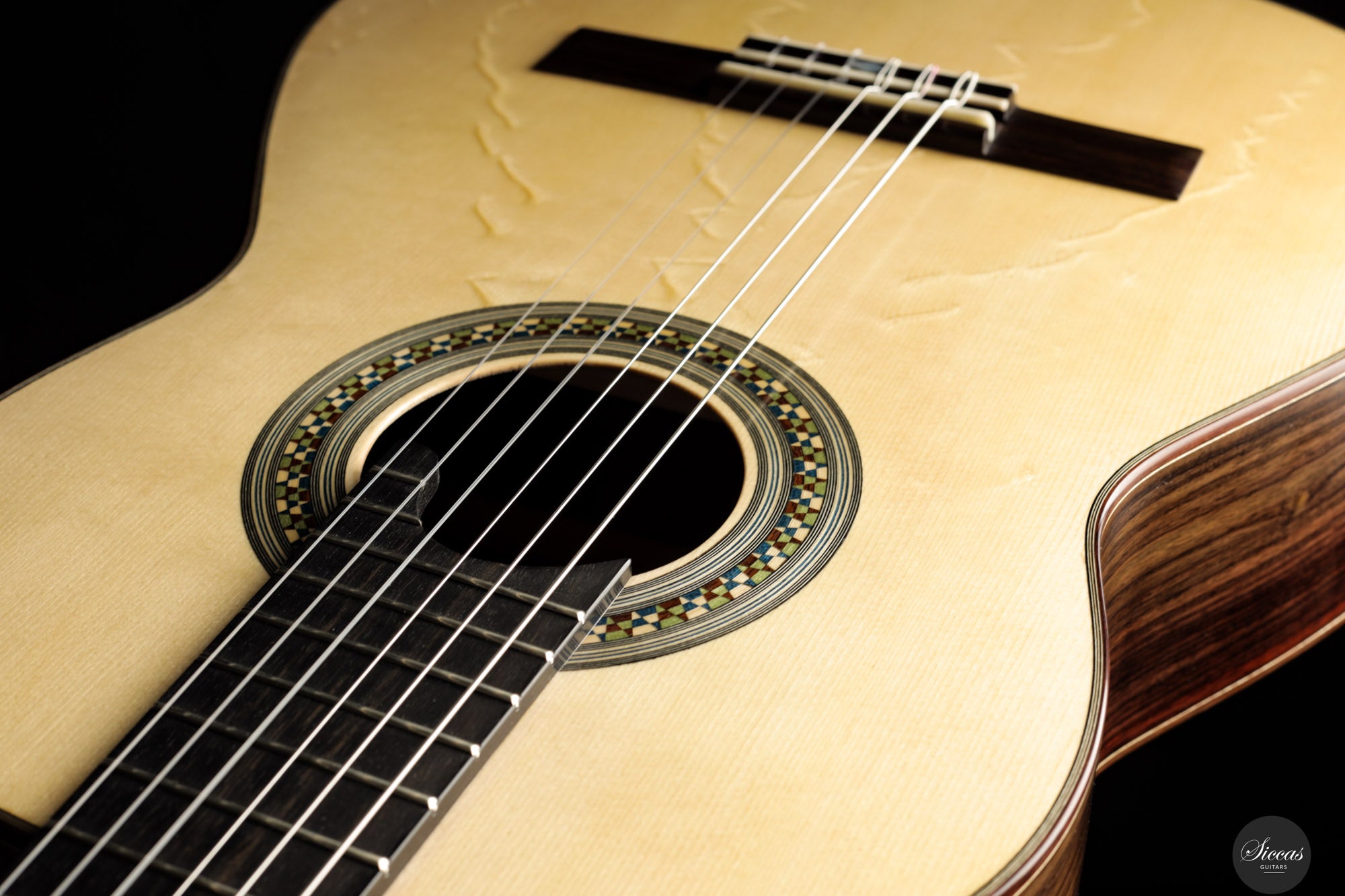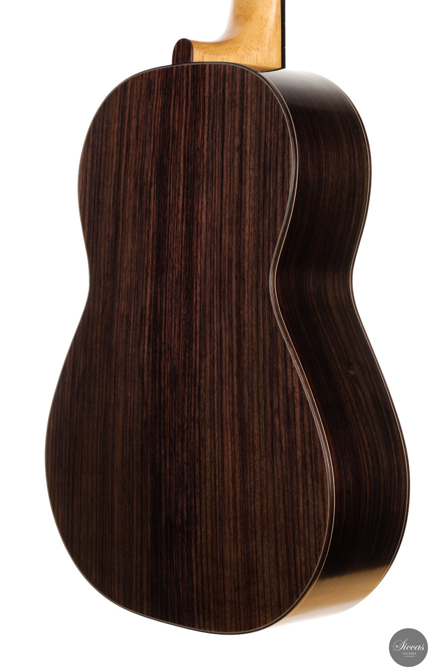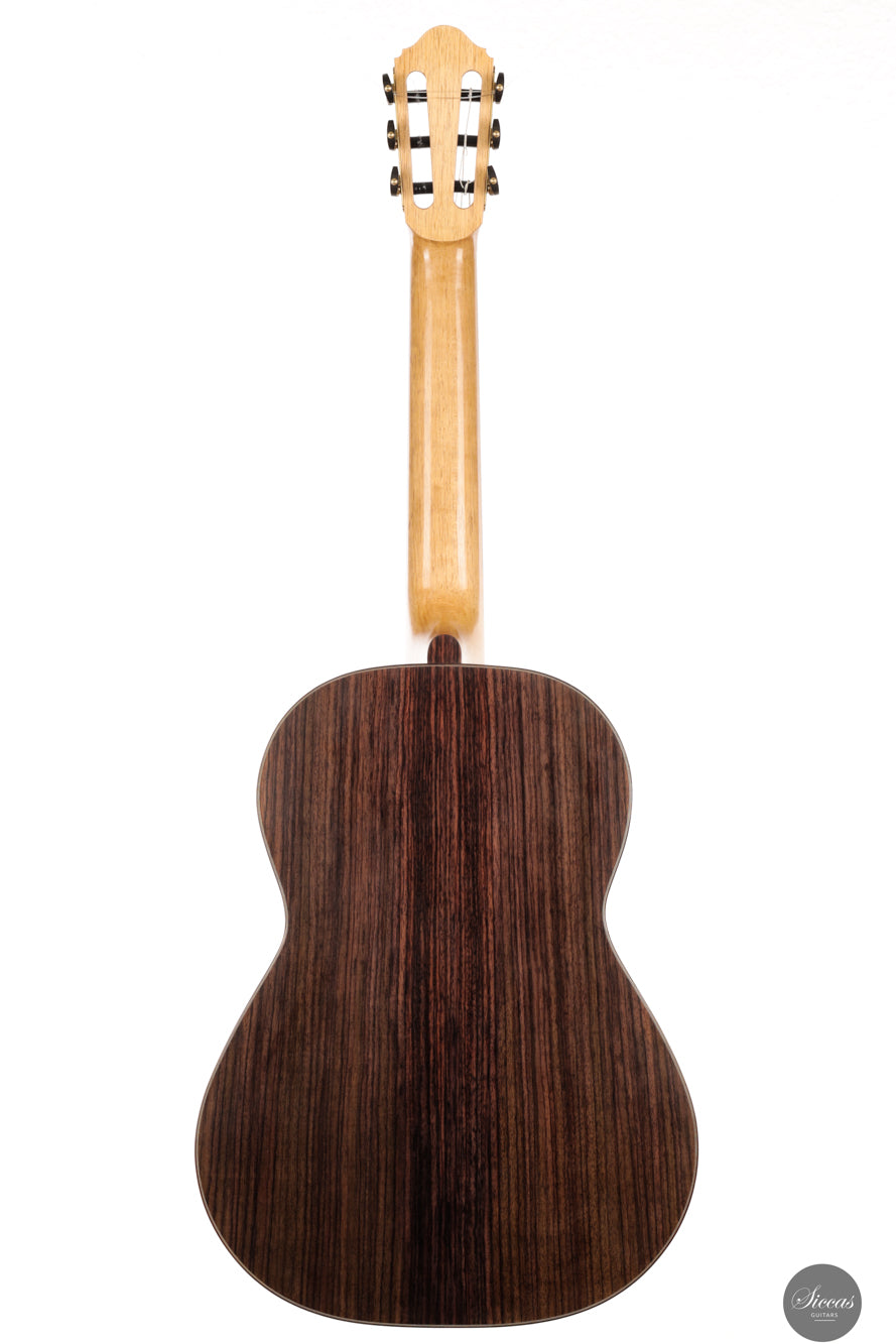 The No. 58 is a traditionally built concert guitar crafted in 2025, featuring a spruce top and Indian rosewood back and sides, finished in French polish. Weighing only 1435 grams, it is notably lightweight. The air body resonance lies between F♯ and G, supporting a warm, balanced core tone. A distinctive feature is its exceptionally comfortable neck, noted for its ease of play across all positions. Tonally, the guitar offers a soft attack and rounded timbre, with a gentle tonal character that leans toward warmth despite the spruce top. This guitar rewards nuanced phrasing and long practice sessions, making it a refined option for both students and professionals seeking an understated yet expressive instrument.