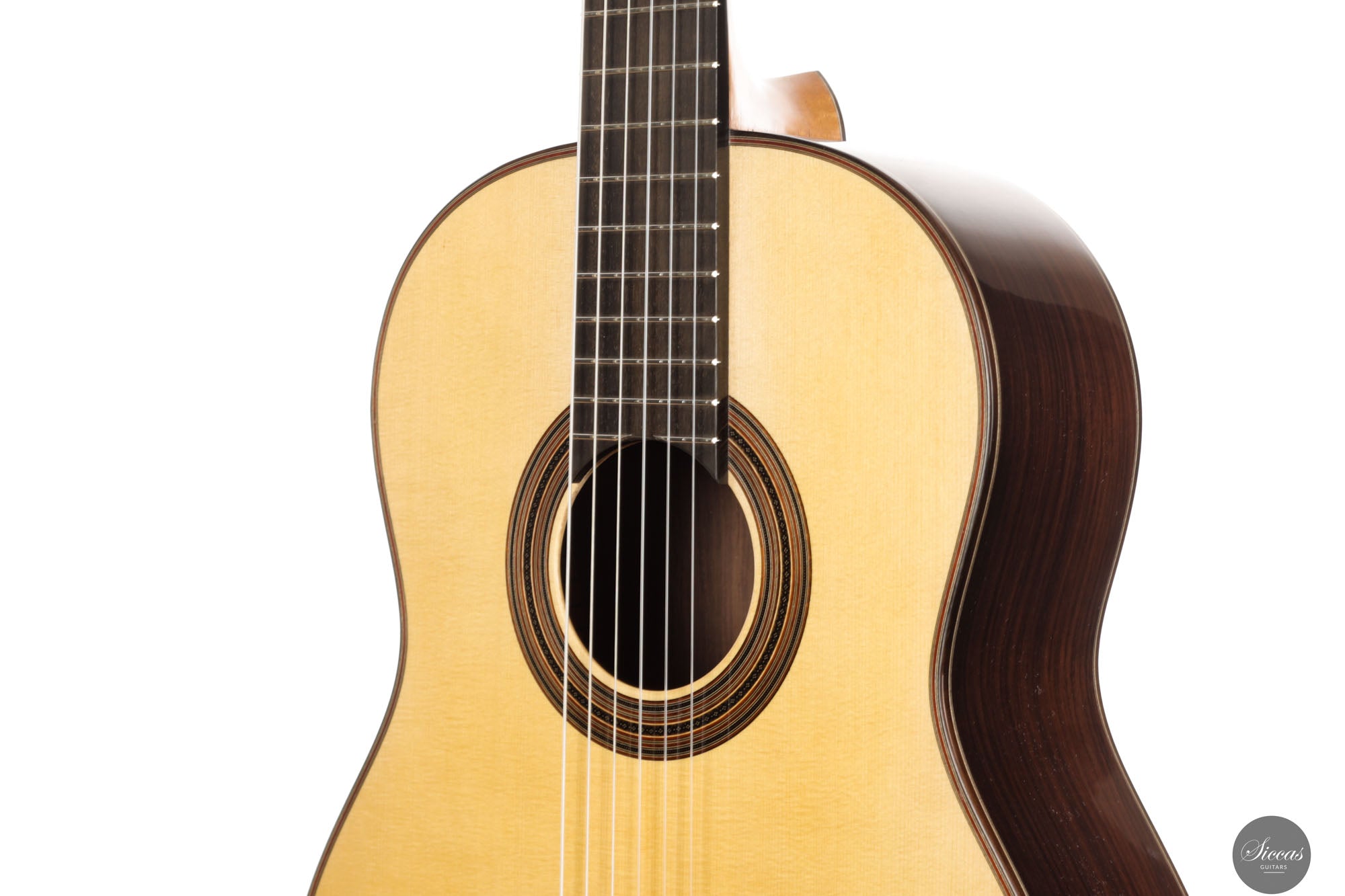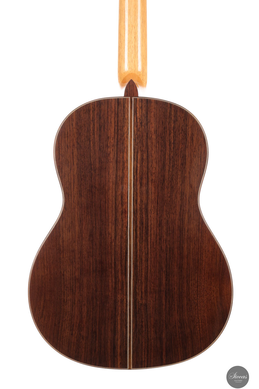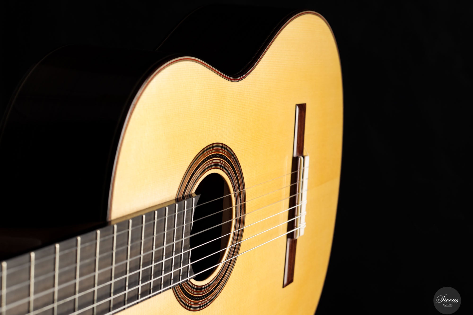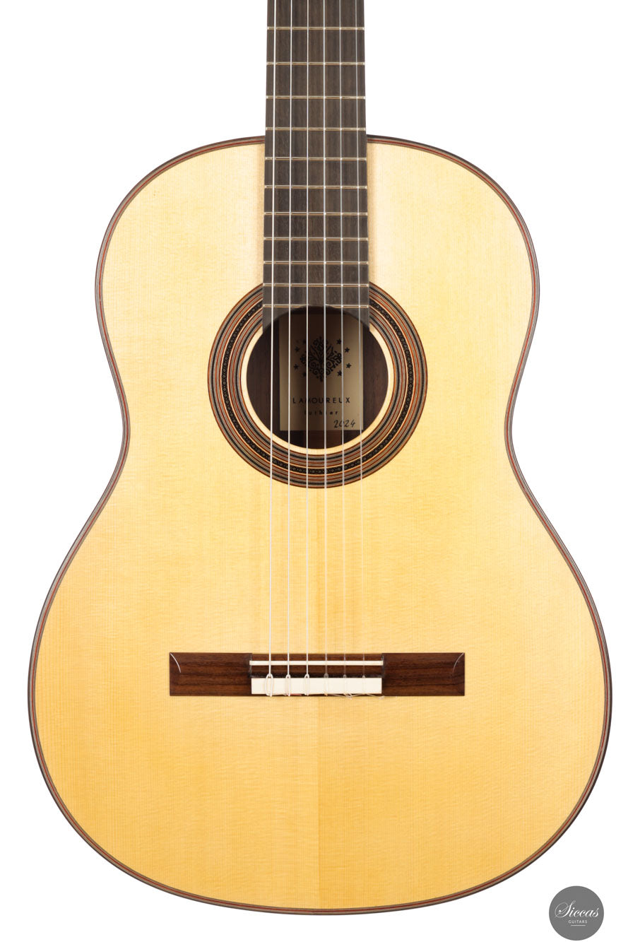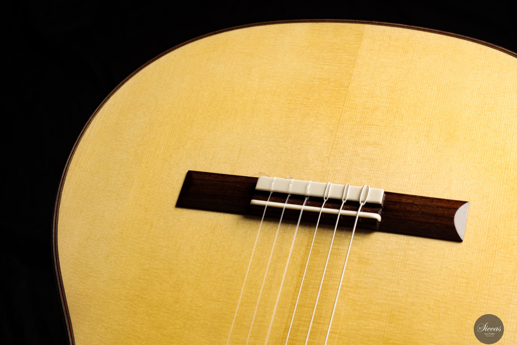 This guitar is a variation of the luthier's standard concert model, enriched and inspired by his work on replicas of Bouchet and Torres guitars, iconic references for those exploring a more "modern" approach to lutherie. It features an asymmetrical five-fan bracing system, a design frequently used by Dominique Field, complemented by an additional slanted harmonic bar. This bar, reminiscent of those found in 19th-century French romantic guitars by René Lacôte, enhances the instrument's overall frequency, particularly contributing to the clarity and brilliance of the trebles. This configuration also emphasizes the midrange presence, offering a beautifully balanced tone. The lightweight bracing beneath the bridge facilitates exceptional responsiveness and dynamic range, allowing for an immediate and nuanced reaction to the player’s touch. The back and sides are constructed using traditional techniques, ensuring flexibility and ease of play. Aesthetically, the guitar reflects a commitment to simplicity, elegance, and refinement. As a charming detail, the rosette design pays homage to a 1990 Dominique Field guitar that the luthier had the pleasure of playing for several years. This instrument is a seamless blend of tradition and innovation, offering both superb tonal quality and outstanding playability.