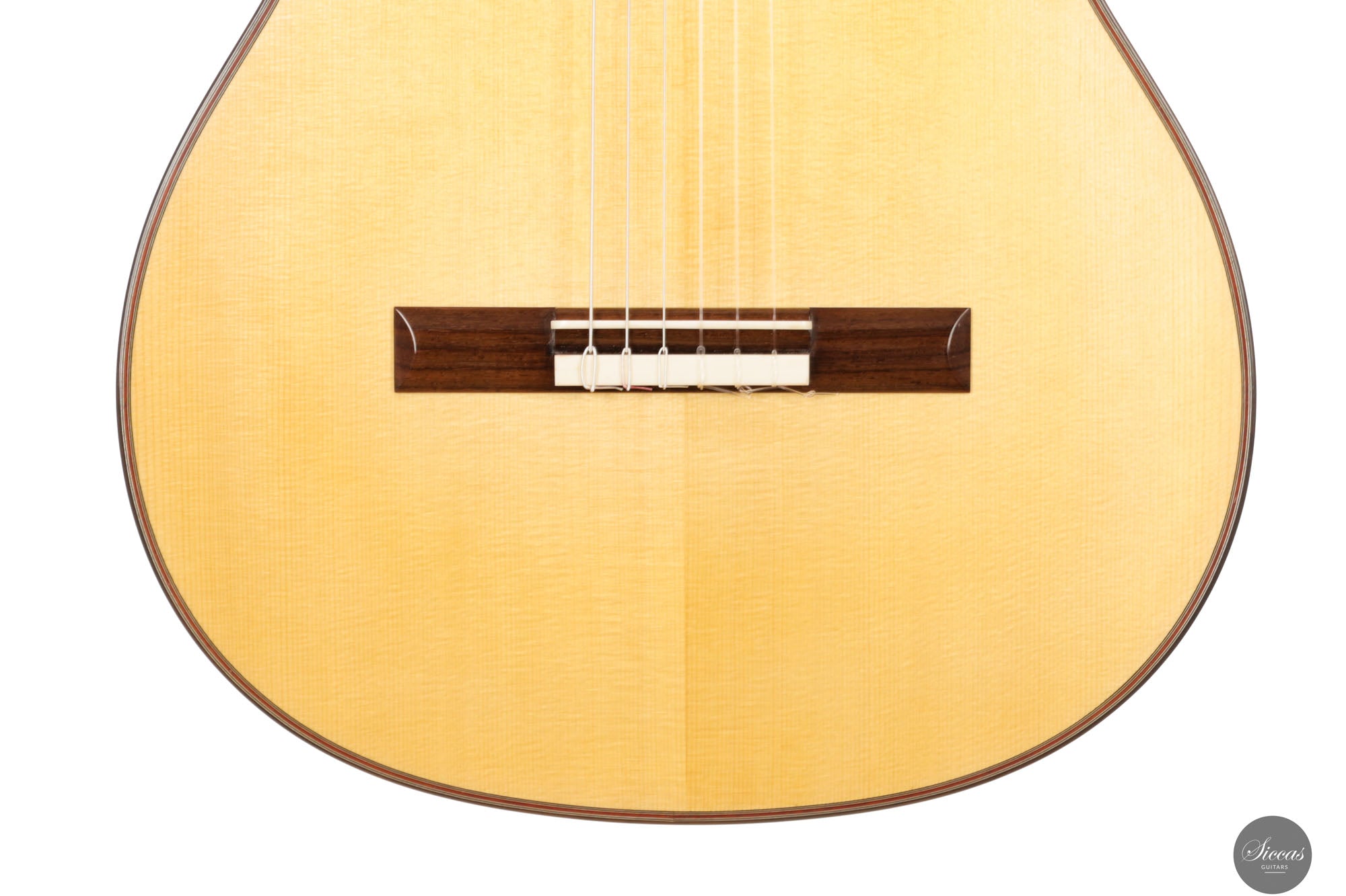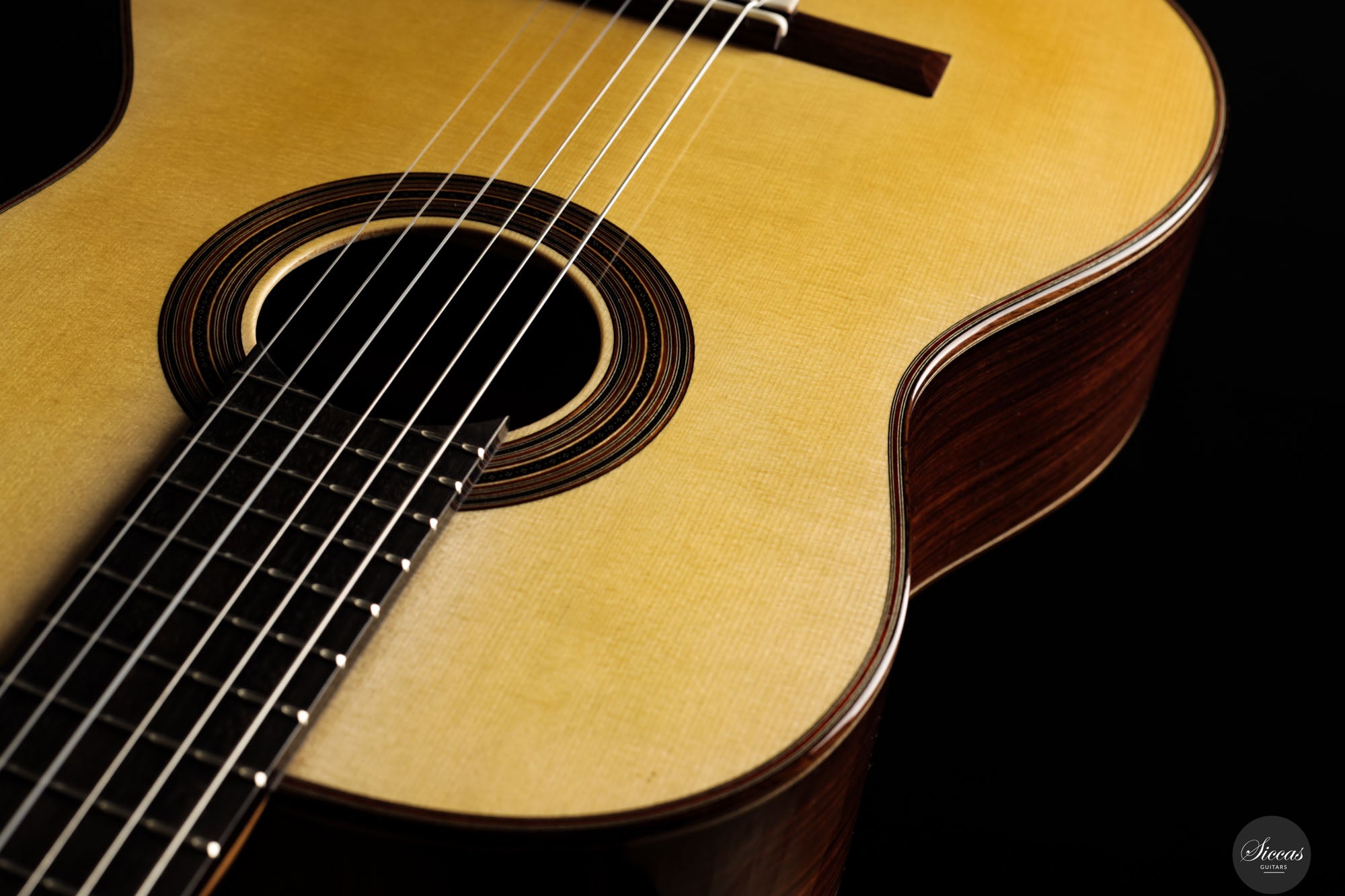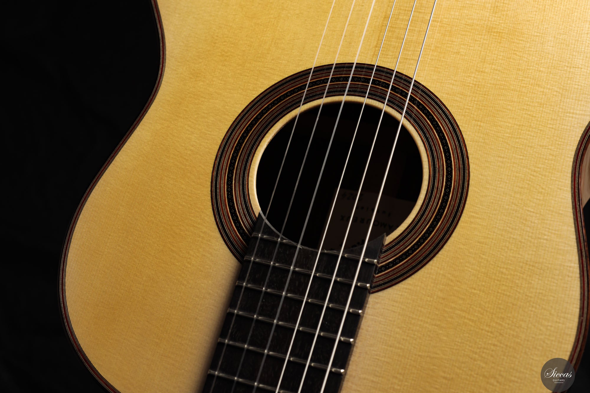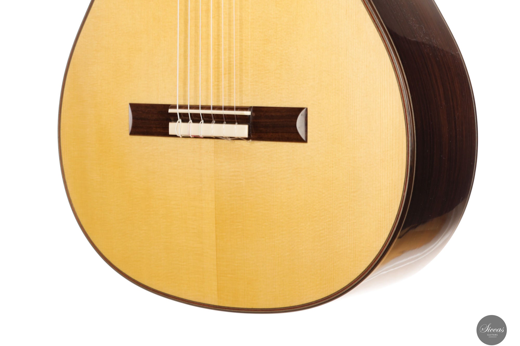 This guitar is a variation of the luthier's standard concert model, enriched and inspired by his work on replicas of Bouchet and Torres guitars, iconic references for those exploring a more "modern" approach to lutherie. It features an asymmetrical five-fan bracing system, a design frequently used by Dominique Field, complemented by an additional slanted harmonic bar. This bar, reminiscent of those found in 19th-century French romantic guitars by René Lacôte, enhances the instrument's overall frequency, particularly contributing to the clarity and brilliance of the trebles. This configuration also emphasizes the midrange presence, offering a beautifully balanced tone. The lightweight bracing beneath the bridge facilitates exceptional responsiveness and dynamic range, allowing for an immediate and nuanced reaction to the player’s touch. The back and sides are constructed using traditional techniques, ensuring flexibility and ease of play. Aesthetically, the guitar reflects a commitment to simplicity, elegance, and refinement. As a charming detail, the rosette design pays homage to a 1990 Dominique Field guitar that the luthier had the pleasure of playing for several years. This instrument is a seamless blend of tradition and innovation, offering both superb tonal quality and outstanding playability.