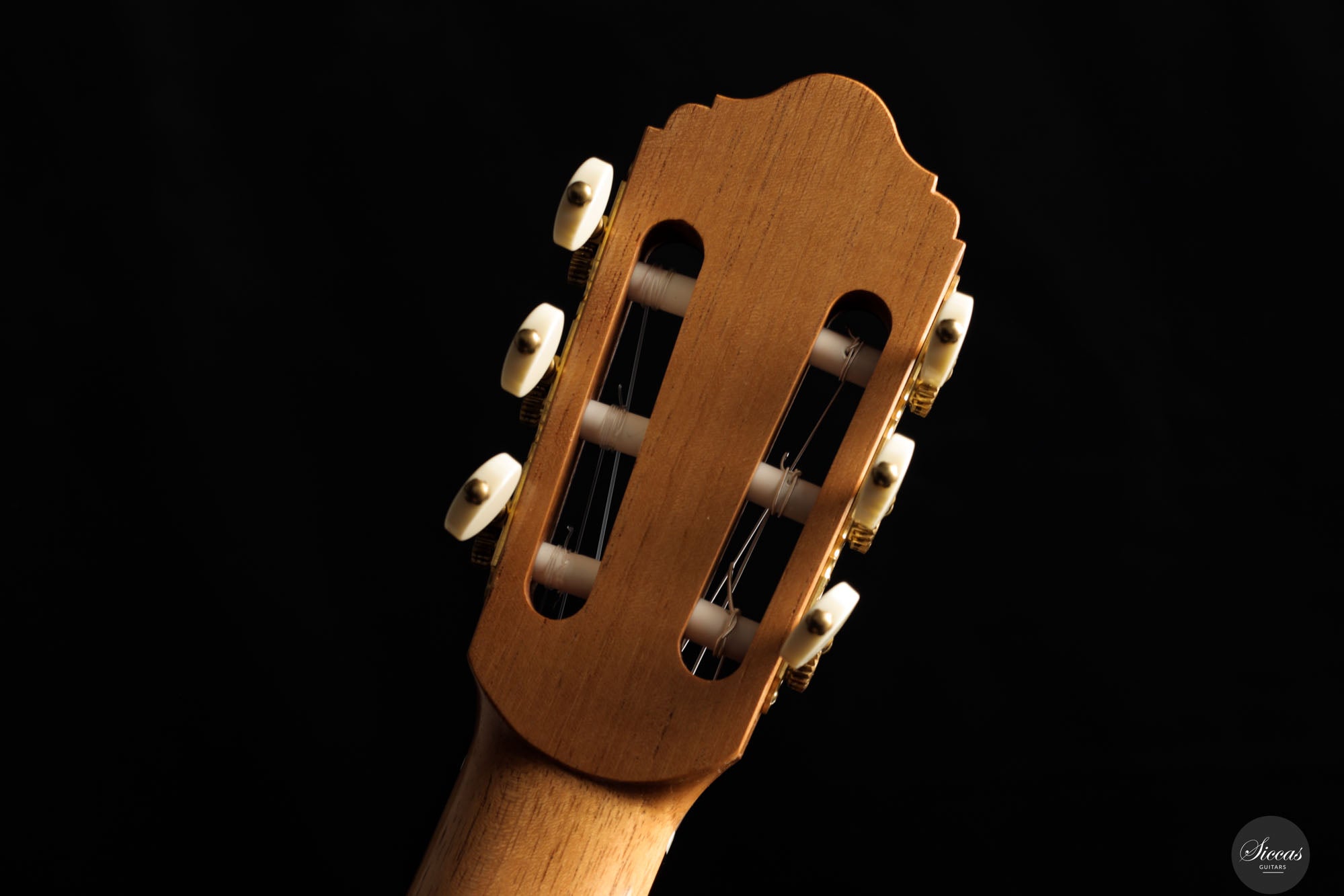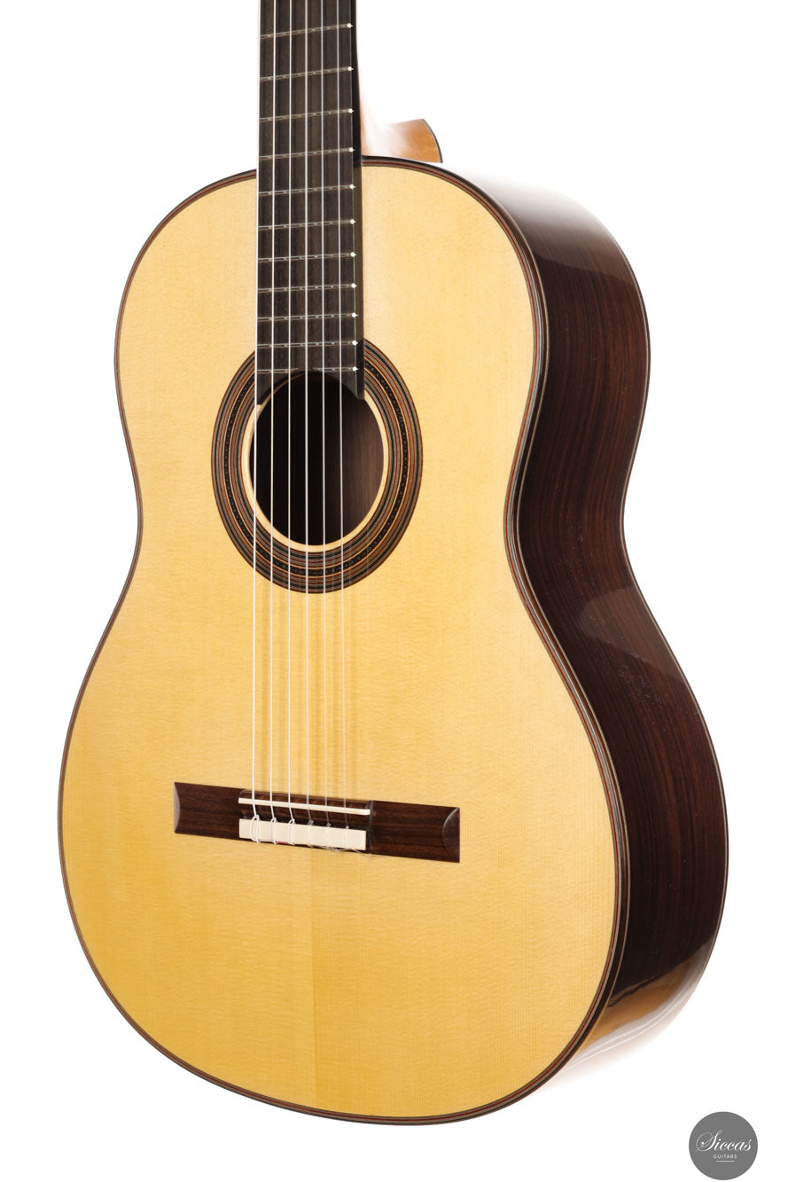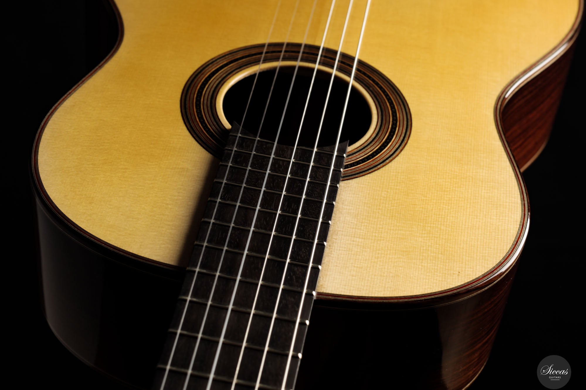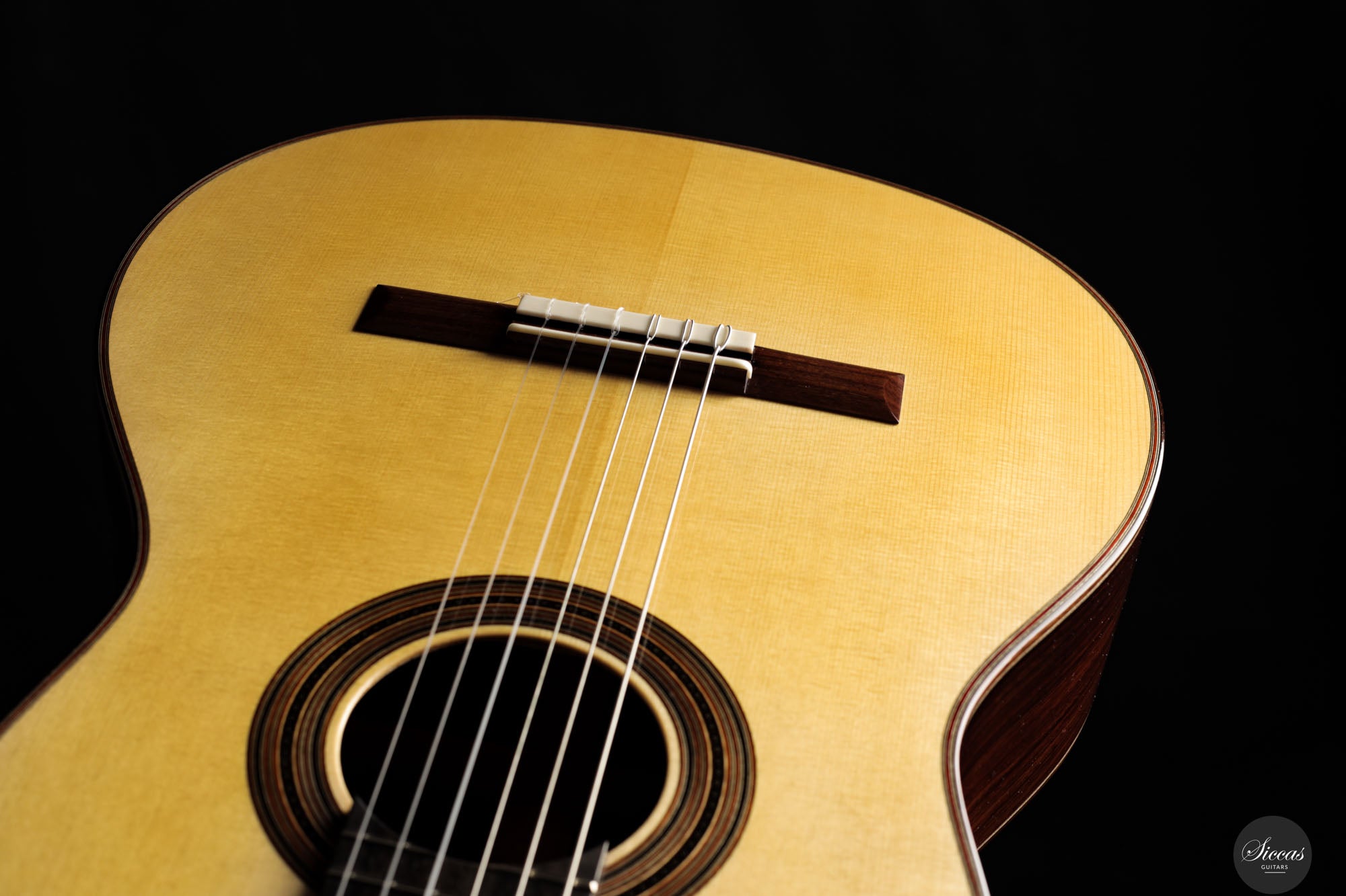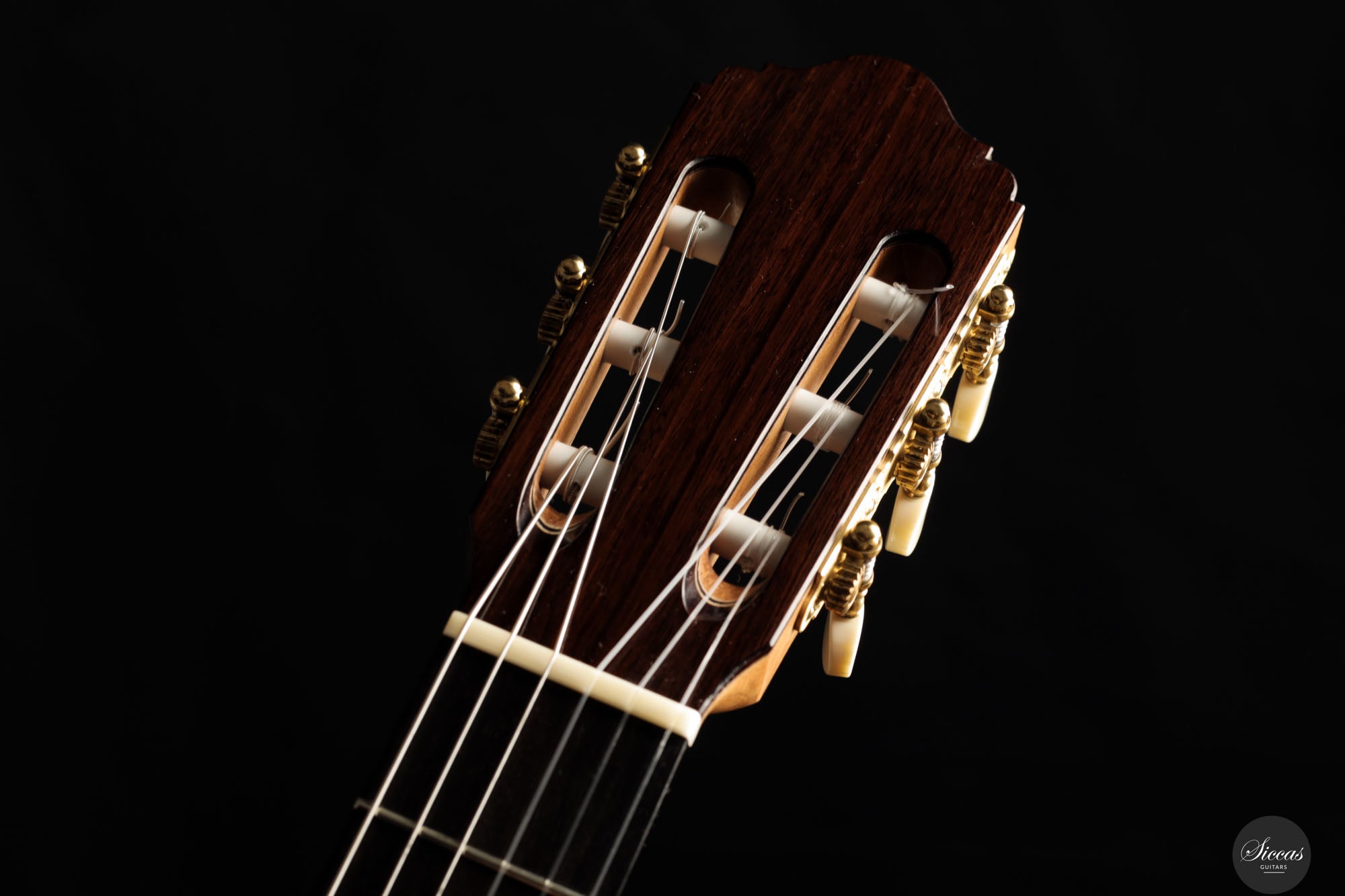 This guitar is a variation of the luthier's standard concert model, enriched and inspired by his work on replicas of Bouchet and Torres guitars, iconic references for those exploring a more "modern" approach to lutherie. It features an asymmetrical five-fan bracing system, a design frequently used by Dominique Field, complemented by an additional slanted harmonic bar. This bar, reminiscent of those found in 19th-century French romantic guitars by René Lacôte, enhances the instrument's overall frequency, particularly contributing to the clarity and brilliance of the trebles. This configuration also emphasizes the midrange presence, offering a beautifully balanced tone. The lightweight bracing beneath the bridge facilitates exceptional responsiveness and dynamic range, allowing for an immediate and nuanced reaction to the player’s touch. The back and sides are constructed using traditional techniques, ensuring flexibility and ease of play. Aesthetically, the guitar reflects a commitment to simplicity, elegance, and refinement. As a charming detail, the rosette design pays homage to a 1990 Dominique Field guitar that the luthier had the pleasure of playing for several years. This instrument is a seamless blend of tradition and innovation, offering both superb tonal quality and outstanding playability.