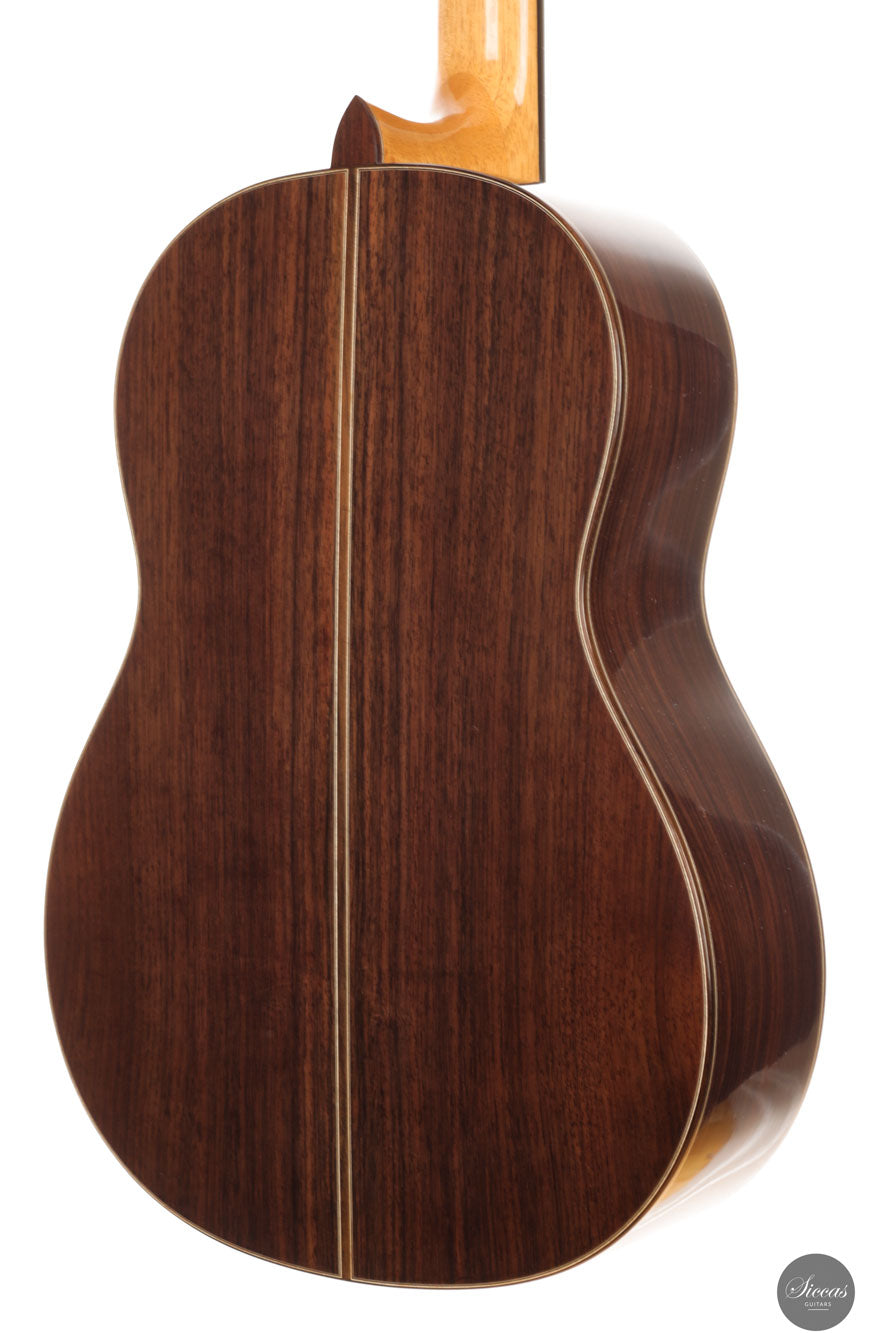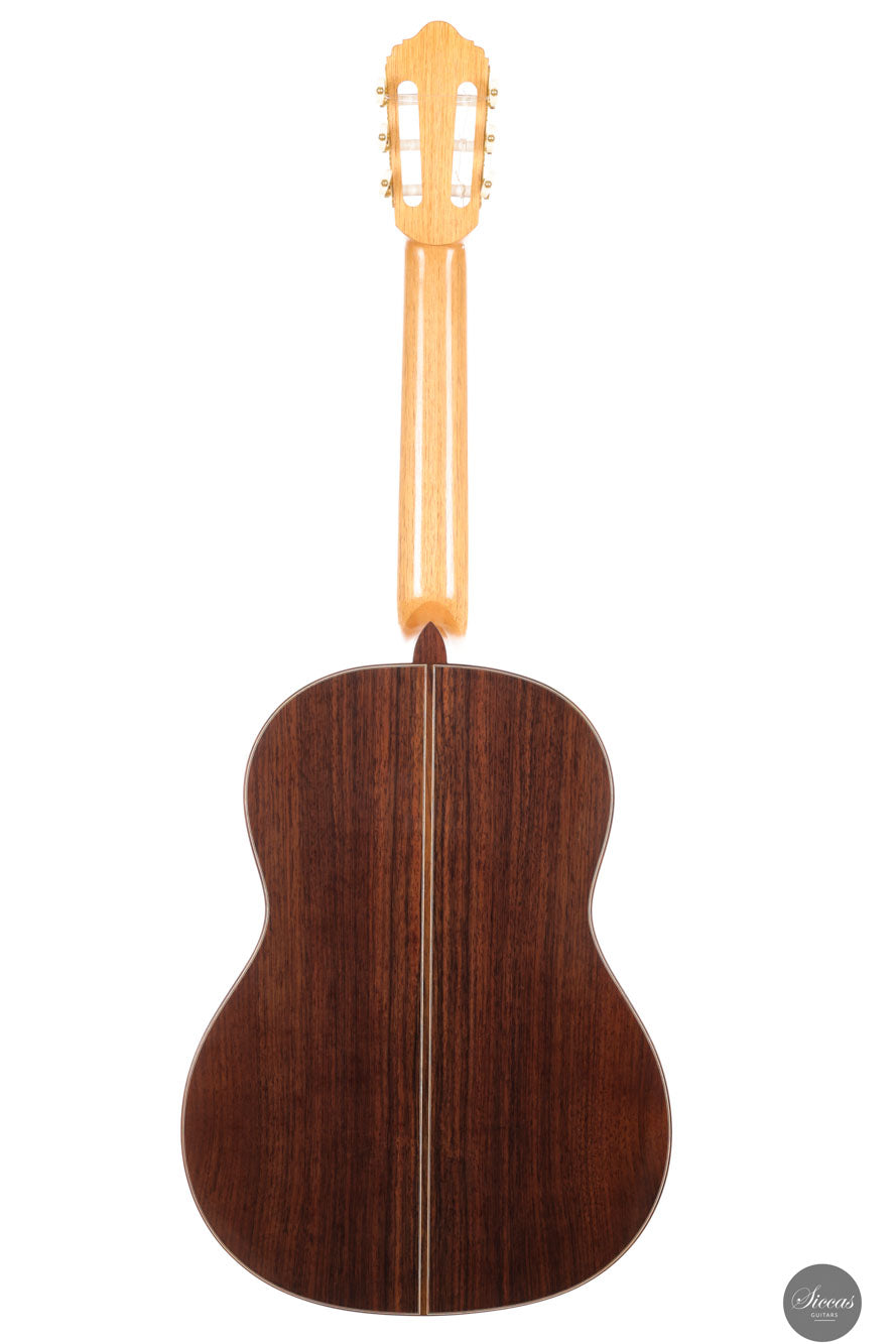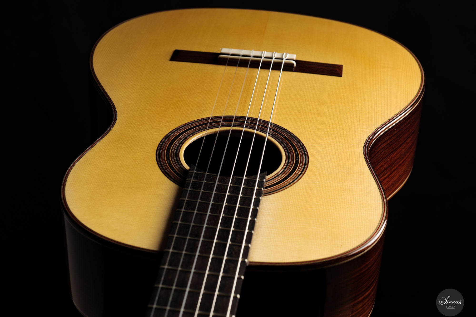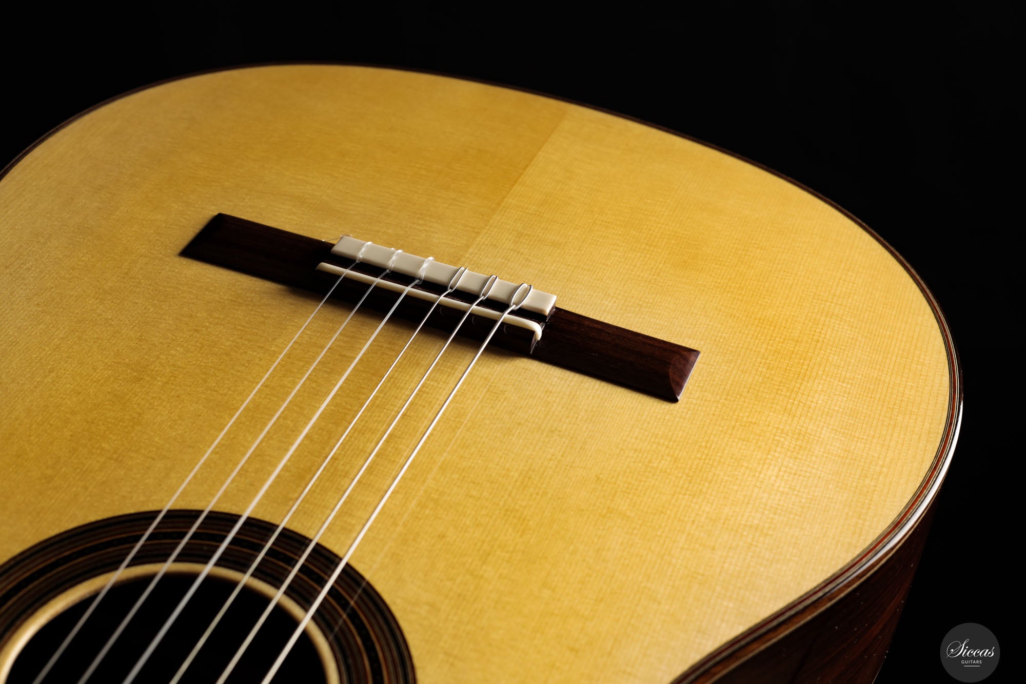 This guitar is a variation of the luthier's standard concert model, enriched and inspired by his work on replicas of Bouchet and Torres guitars, iconic references for those exploring a more "modern" approach to lutherie. It features an asymmetrical five-fan bracing system, a design frequently used by Dominique Field, complemented by an additional slanted harmonic bar. This bar, reminiscent of those found in 19th-century French romantic guitars by René Lacôte, enhances the instrument's overall frequency, particularly contributing to the clarity and brilliance of the trebles. This configuration also emphasizes the midrange presence, offering a beautifully balanced tone. The lightweight bracing beneath the bridge facilitates exceptional responsiveness and dynamic range, allowing for an immediate and nuanced reaction to the player’s touch. The back and sides are constructed using traditional techniques, ensuring flexibility and ease of play. Aesthetically, the guitar reflects a commitment to simplicity, elegance, and refinement. As a charming detail, the rosette design pays homage to a 1990 Dominique Field guitar that the luthier had the pleasure of playing for several years. This instrument is a seamless blend of tradition and innovation, offering both superb tonal quality and outstanding playability.