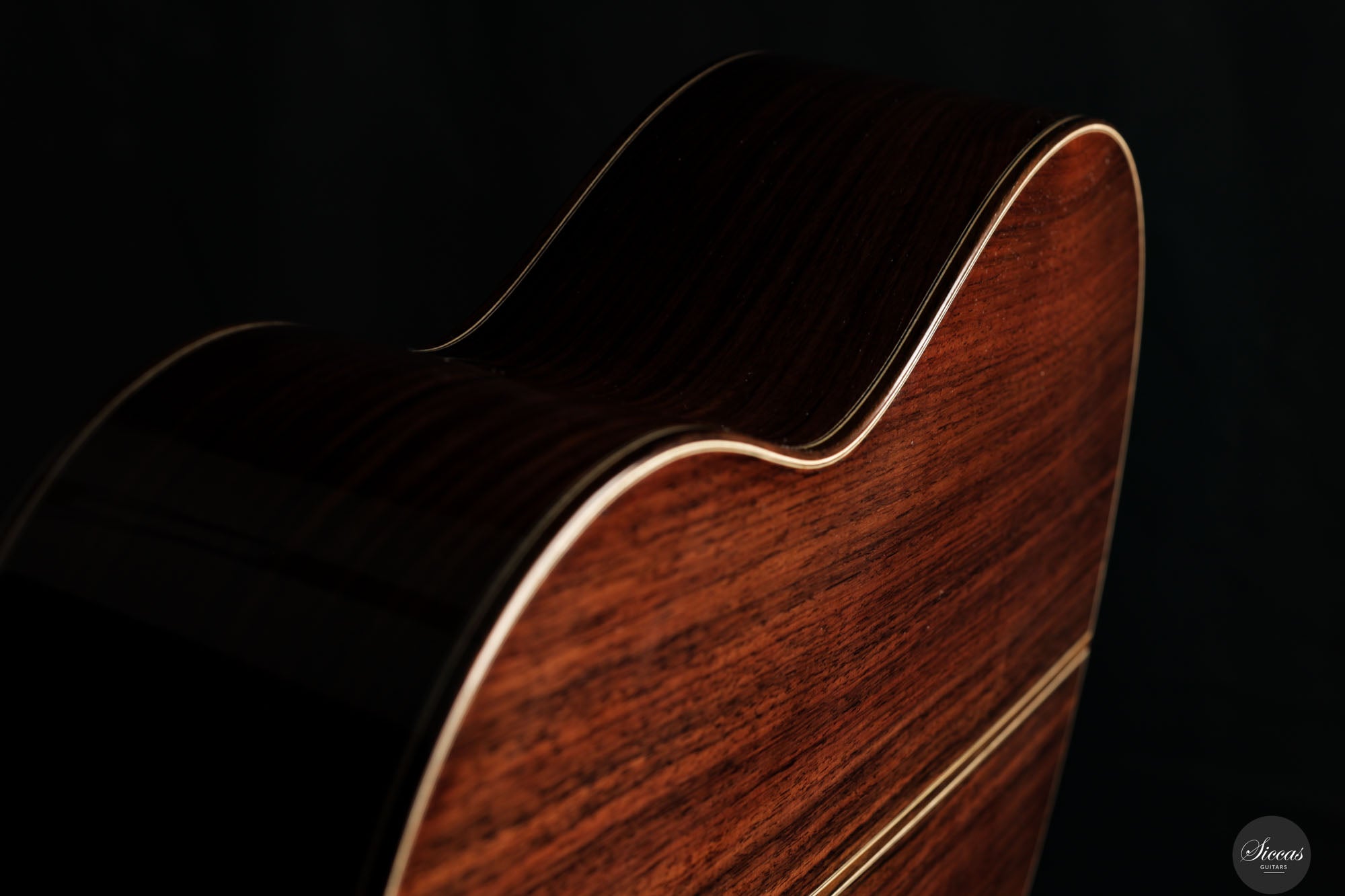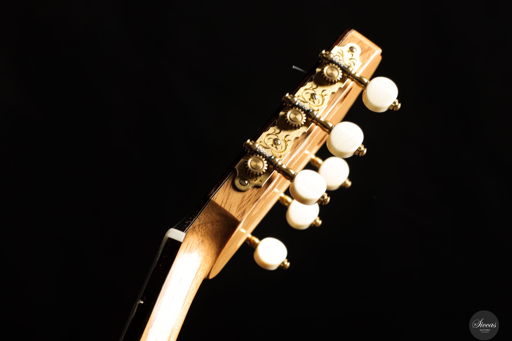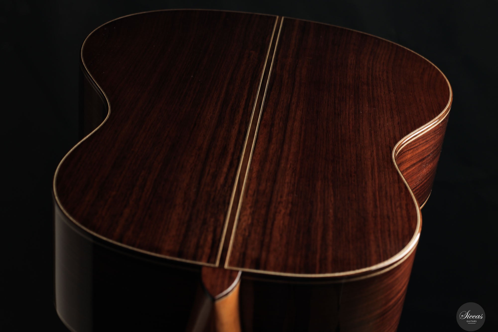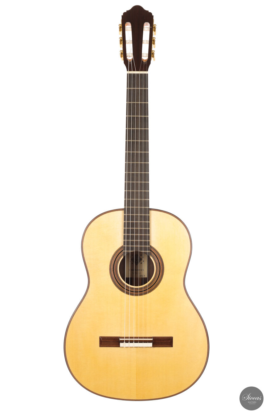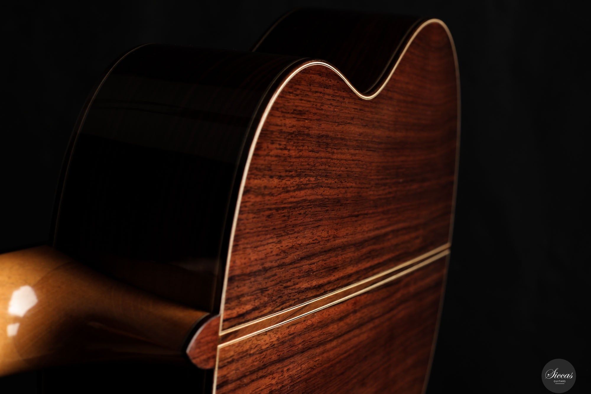 This guitar is a variation of the luthier's standard concert model, enriched and inspired by his work on replicas of Bouchet and Torres guitars, iconic references for those exploring a more "modern" approach to lutherie. It features an asymmetrical five-fan bracing system, a design frequently used by Dominique Field, complemented by an additional slanted harmonic bar. This bar, reminiscent of those found in 19th-century French romantic guitars by René Lacôte, enhances the instrument's overall frequency, particularly contributing to the clarity and brilliance of the trebles. This configuration also emphasizes the midrange presence, offering a beautifully balanced tone. The lightweight bracing beneath the bridge facilitates exceptional responsiveness and dynamic range, allowing for an immediate and nuanced reaction to the player’s touch. The back and sides are constructed using traditional techniques, ensuring flexibility and ease of play. Aesthetically, the guitar reflects a commitment to simplicity, elegance, and refinement. As a charming detail, the rosette design pays homage to a 1990 Dominique Field guitar that the luthier had the pleasure of playing for several years. This instrument is a seamless blend of tradition and innovation, offering both superb tonal quality and outstanding playability.