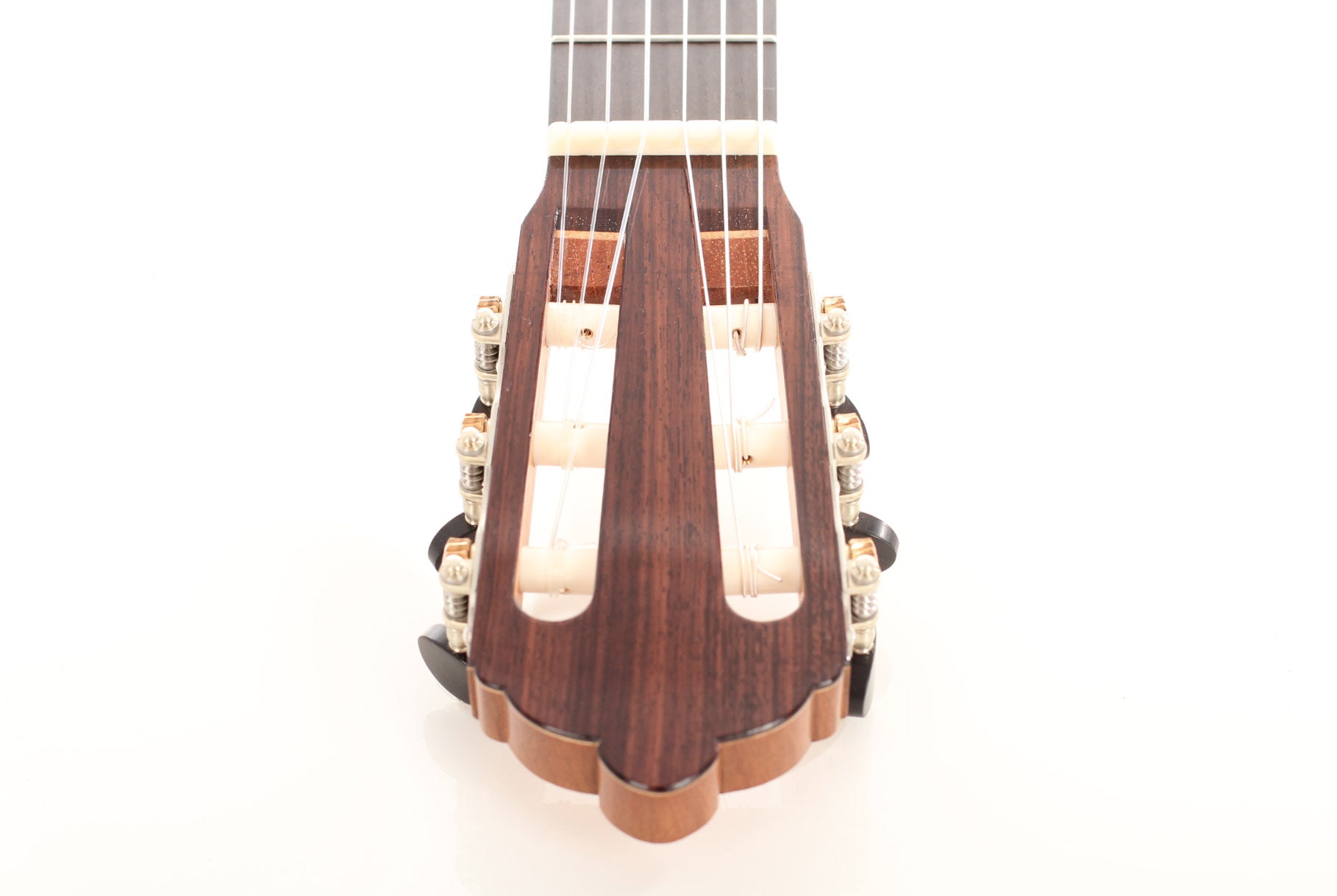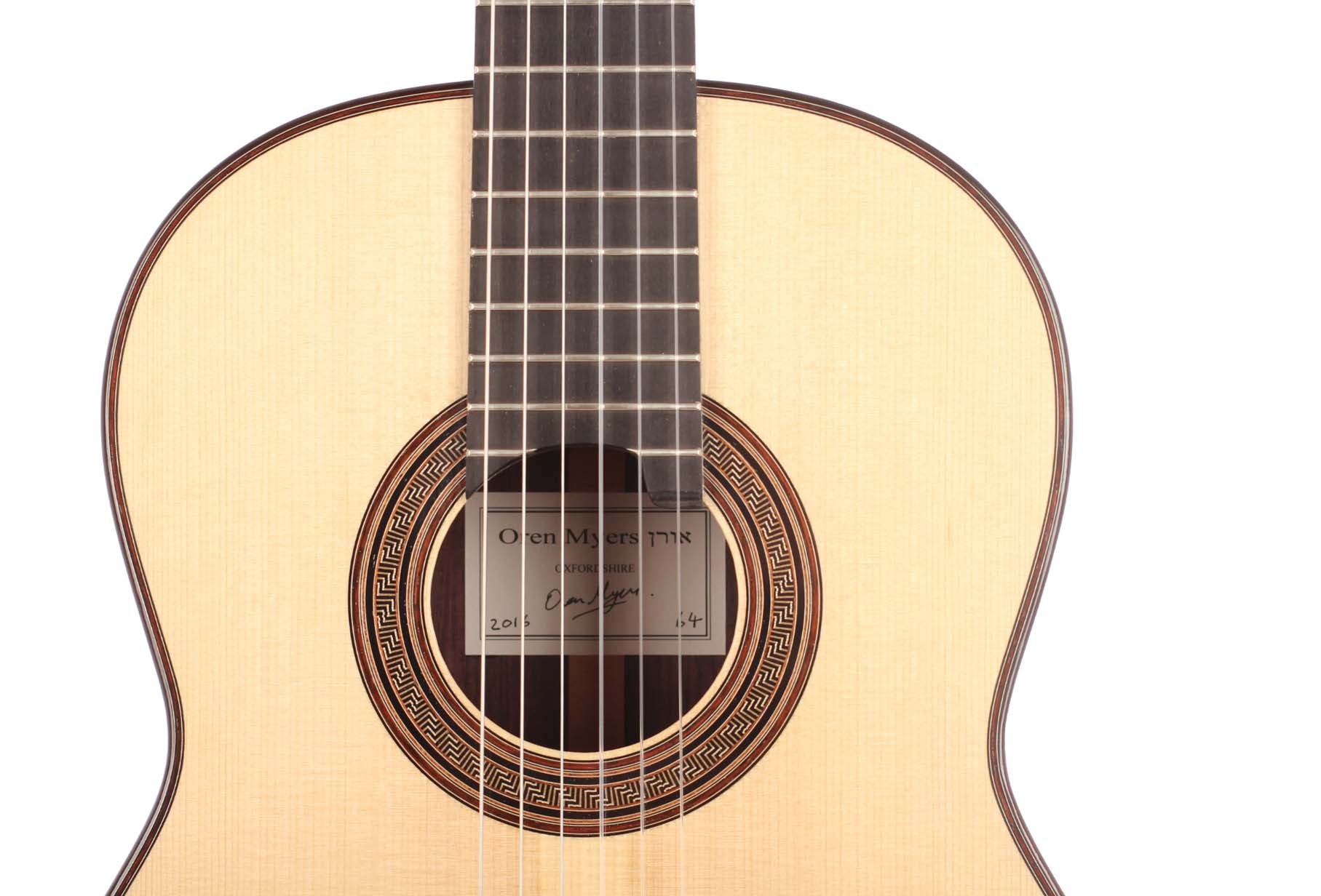 The design of Oren Myers guitars, and the construction methods he uses, fall into the broad category of 'traditional', and though he works within established parameters, he has not copied any one particular instrument or maker. Each piece of wood is distinct, and therefore the precise thickness of the components of each guitar are adjusted accordingly. Stringing up a new instrument always carries the thrill of finally, after weeks of construction, hearing the effect of these minor, but crucial differences. The body shape is of his own design, as are the decorative elements of the guitar: the head - inspired by the lines of a painting by Picasso, Woman With Yellow Hair - and rosette - inspired by the motif on an ancient Greek vase housed in the British Museum. The guitar has a spruce top and back and sides are made of Indian rosewood. The tuning machines are made by Alessi. A hardshell Hiscox Pro II case is included.