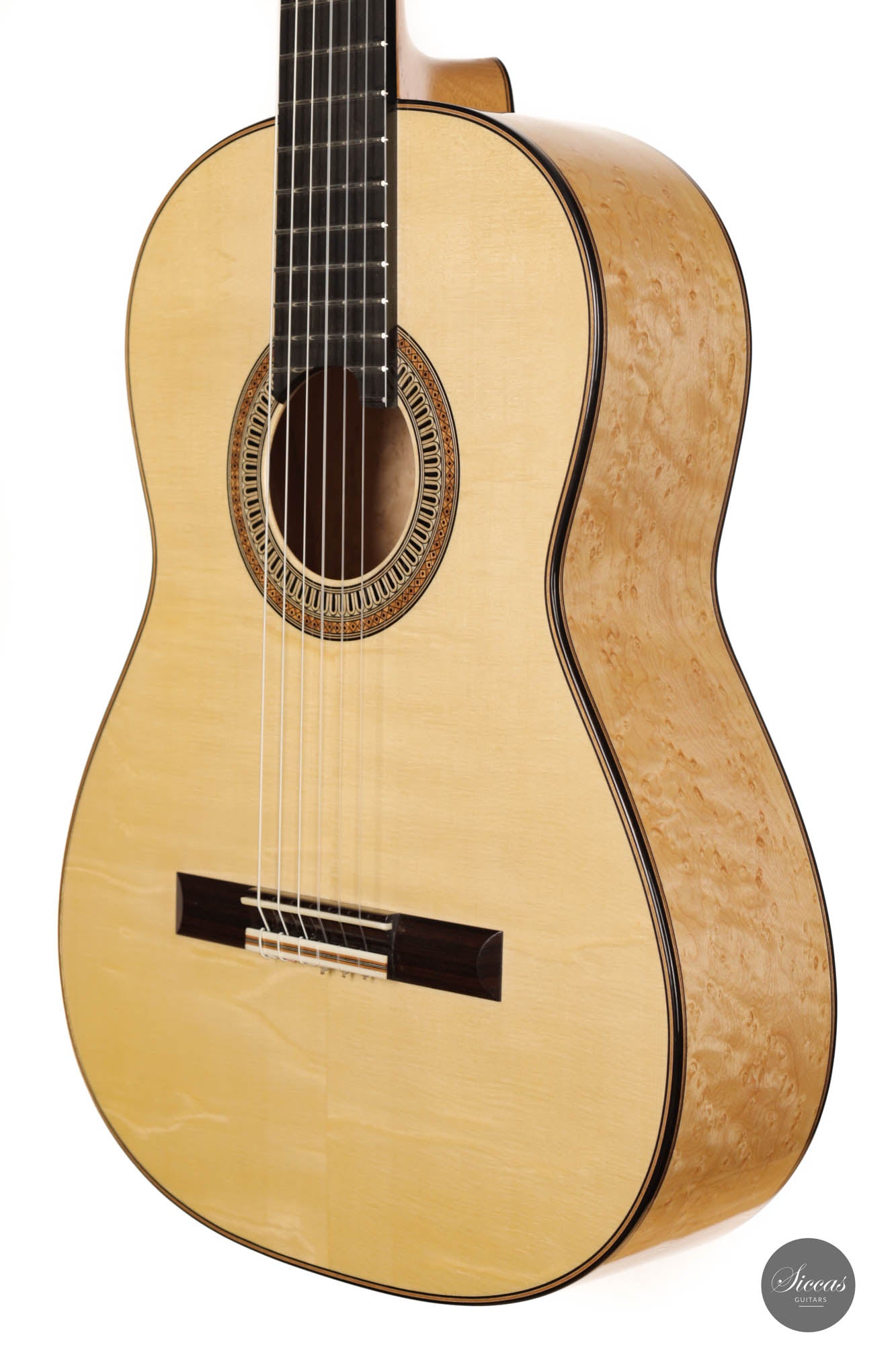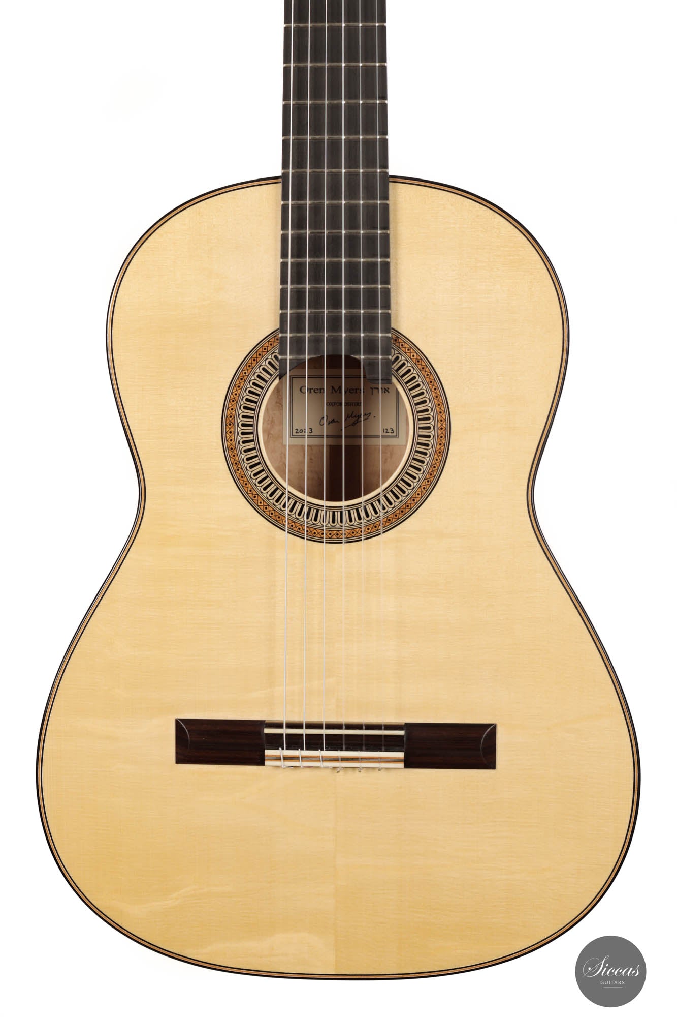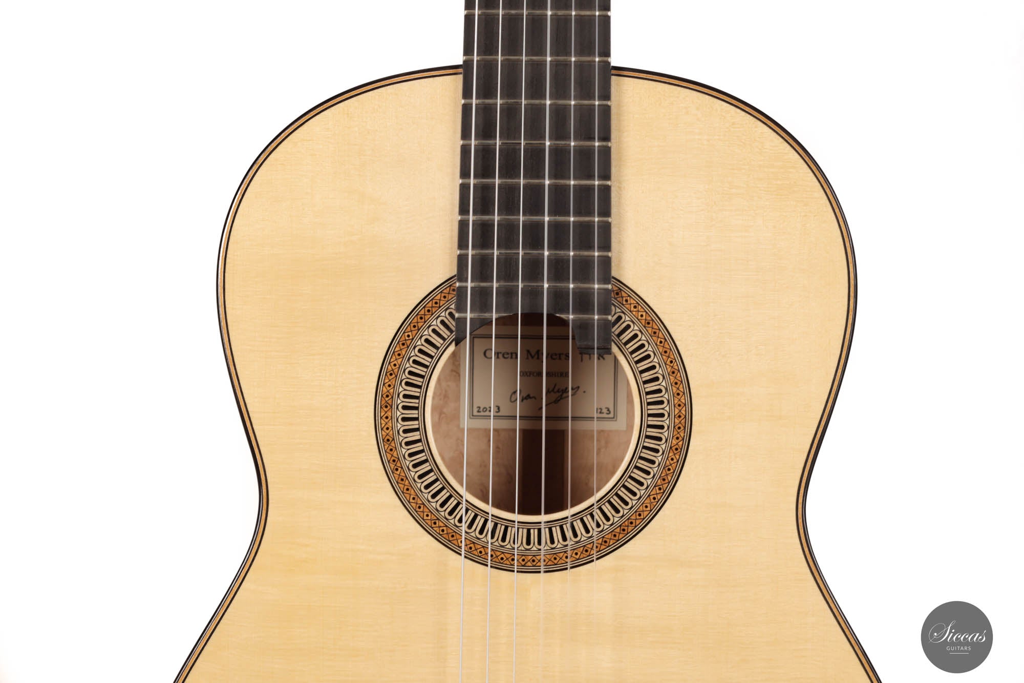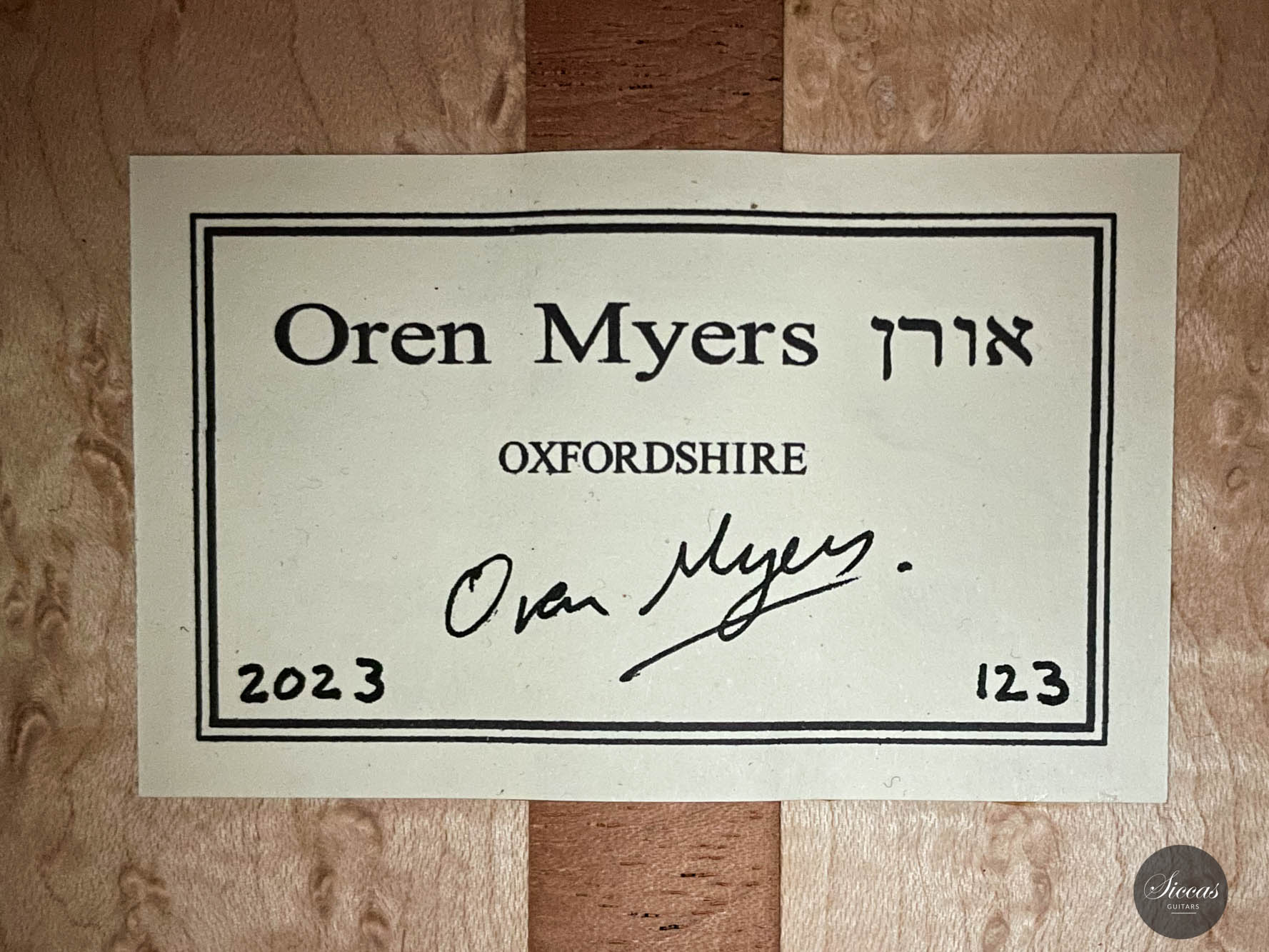 The 2023 Oren Myers guitar is a stunning instrument with exceptional design and craftsmanship. The head of the guitar is inspired by the lines of Picasso's "Woman with Yellow Hair" painting, while the rosette draws inspiration from an antique Greek vase housed in the British Museum. These details add a unique and artistic touch to the guitar's design. In addition to its exceptional design and craftsmanship, this 2023 Oren Myers features a spruce soundboard that contributes to its bright and responsive tone. Meanwhile, the back and sides of the guitar are made from stunning bird’s eye maple, which adds a beautiful and unique visual texture to the instrument. The Oren Myers guitar offers a fast response and a refined, careful tone that fills the entire room. The trebles are sweet and singing, while the bass response is snappy and powerful, making for a surprisingly well-balanced and dynamic guitar. The guitar’s build quality is excellent, with every detail carefully considered and executed perfectly. Despite its simplicity, the guitar's tasteful and elegant design is a testament to the skill and artistry of its maker. This true concert guitar meets even the highest standards in the classical guitar repertoire.