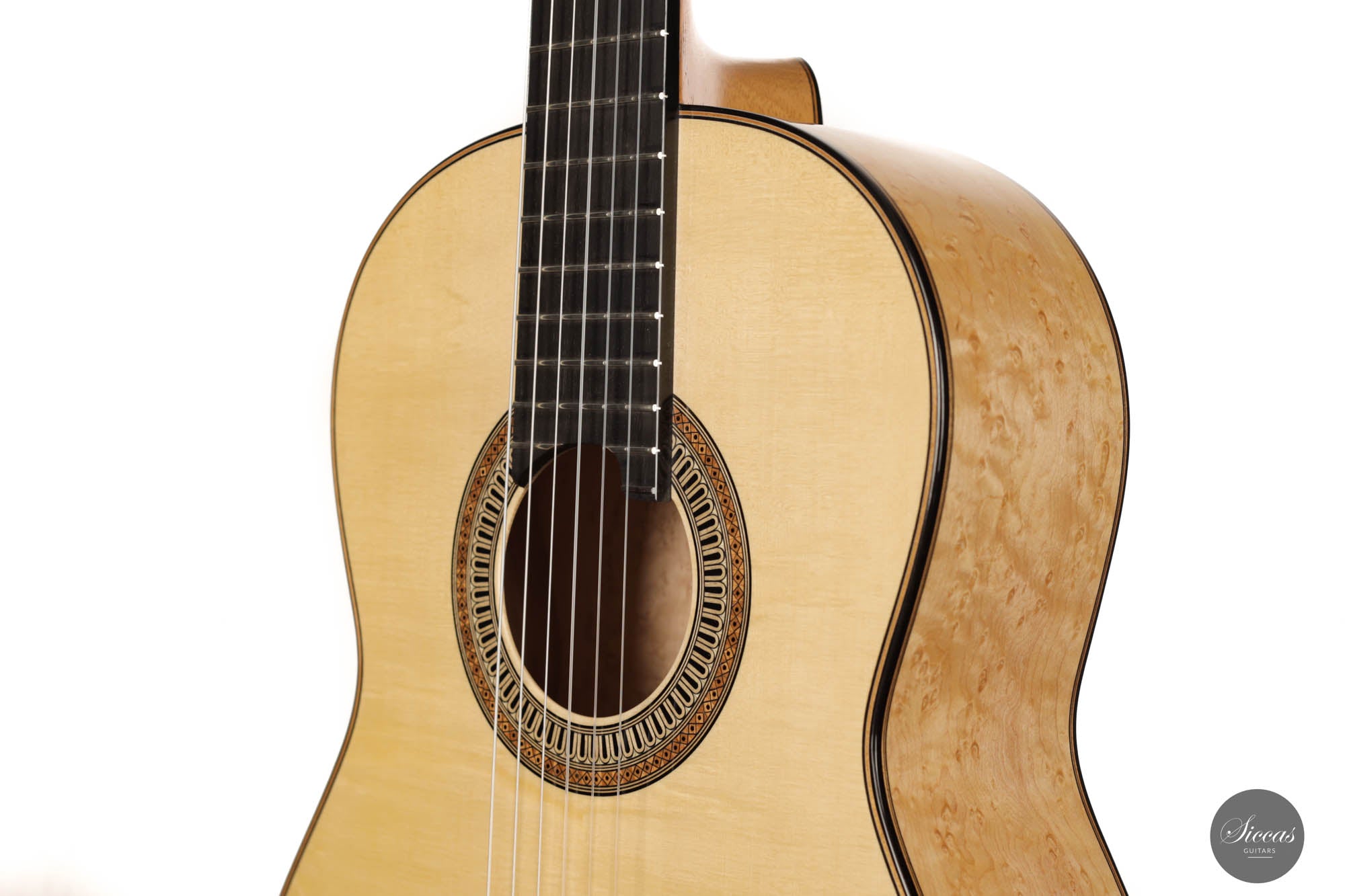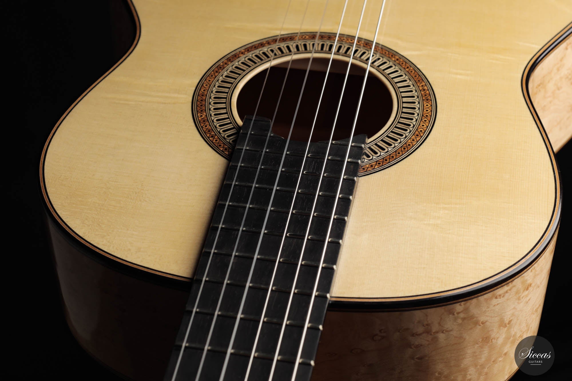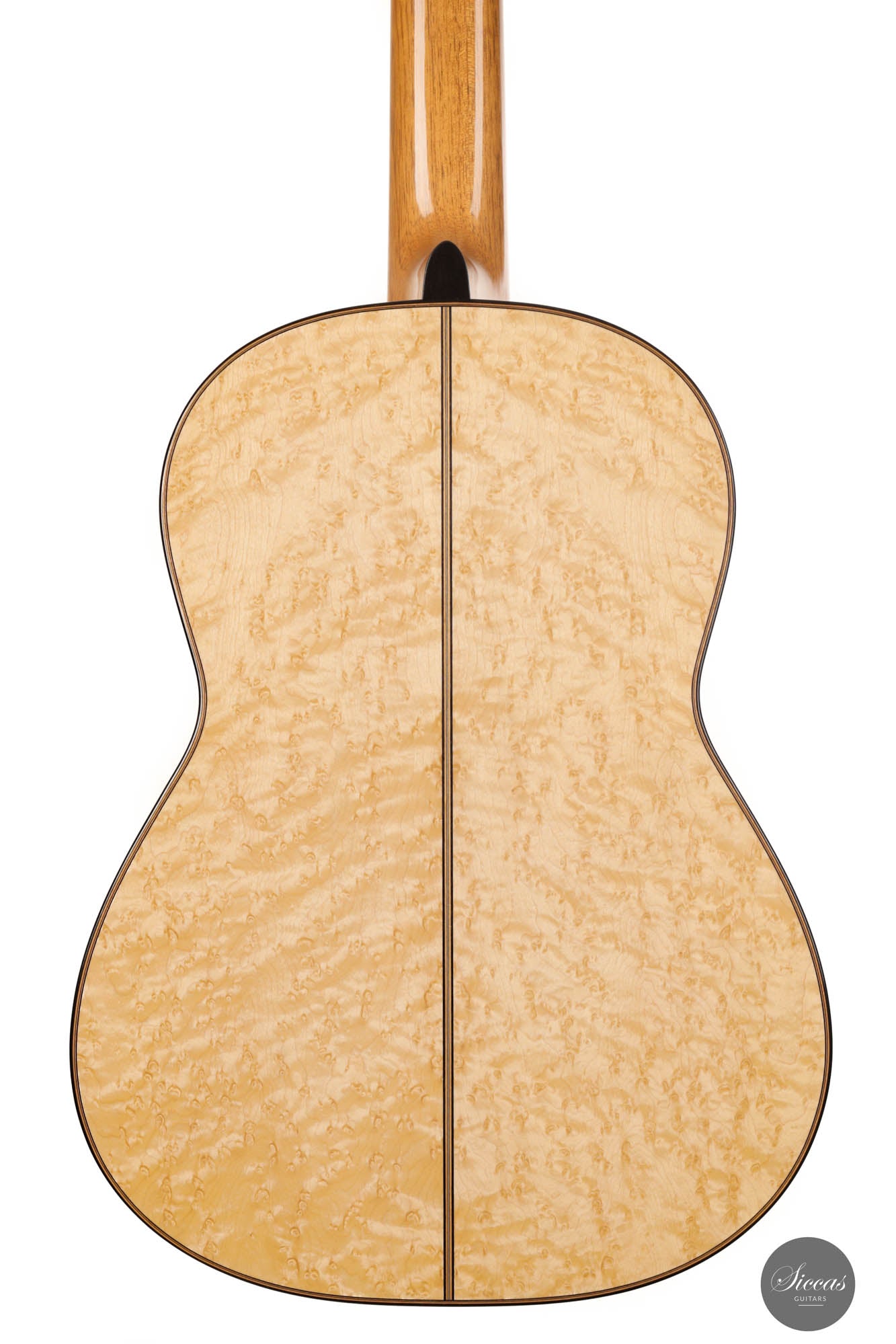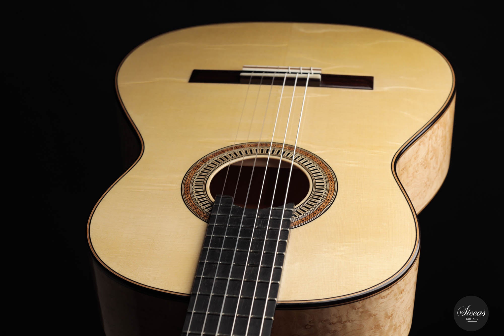 The 2023 Oren Myers guitar is a stunning instrument with exceptional design and craftsmanship. The head of the guitar is inspired by the lines of Picasso's "Woman with Yellow Hair" painting, while the rosette draws inspiration from an antique Greek vase housed in the British Museum. These details add a unique and artistic touch to the guitar's design. In addition to its exceptional design and craftsmanship, this 2023 Oren Myers features a spruce soundboard that contributes to its bright and responsive tone. Meanwhile, the back and sides of the guitar are made from stunning bird’s eye maple, which adds a beautiful and unique visual texture to the instrument. The Oren Myers guitar offers a fast response and a refined, careful tone that fills the entire room. The trebles are sweet and singing, while the bass response is snappy and powerful, making for a surprisingly well-balanced and dynamic guitar. The guitar’s build quality is excellent, with every detail carefully considered and executed perfectly. Despite its simplicity, the guitar's tasteful and elegant design is a testament to the skill and artistry of its maker. This true concert guitar meets even the highest standards in the classical guitar repertoire.