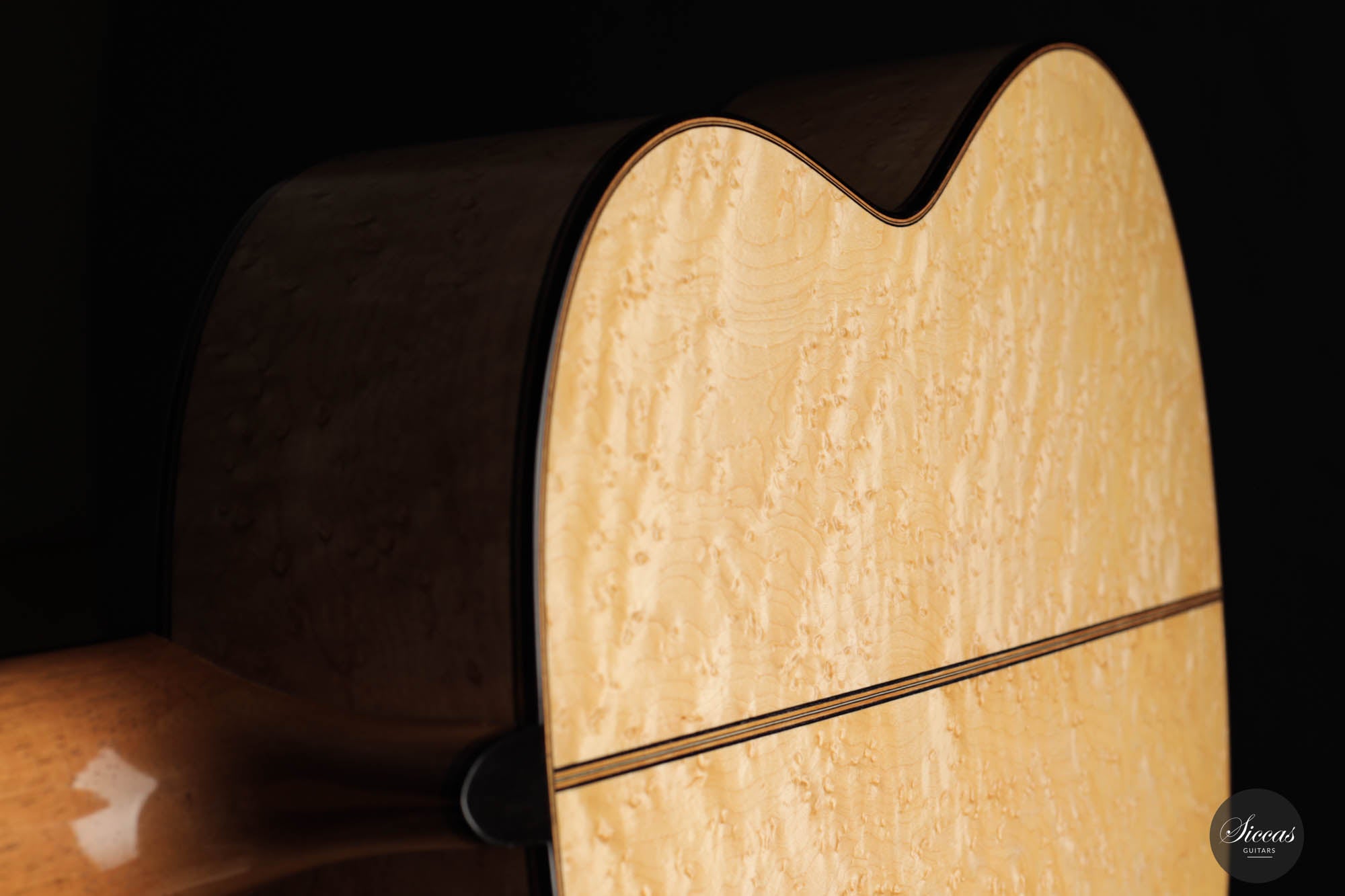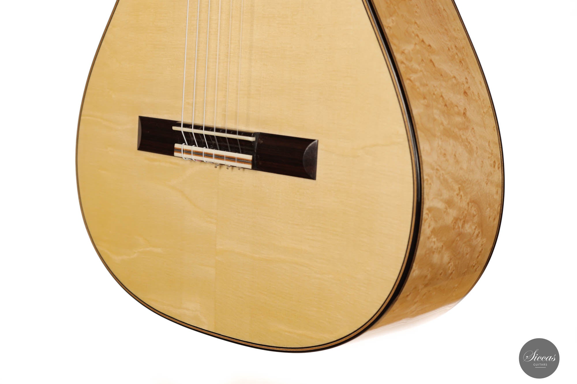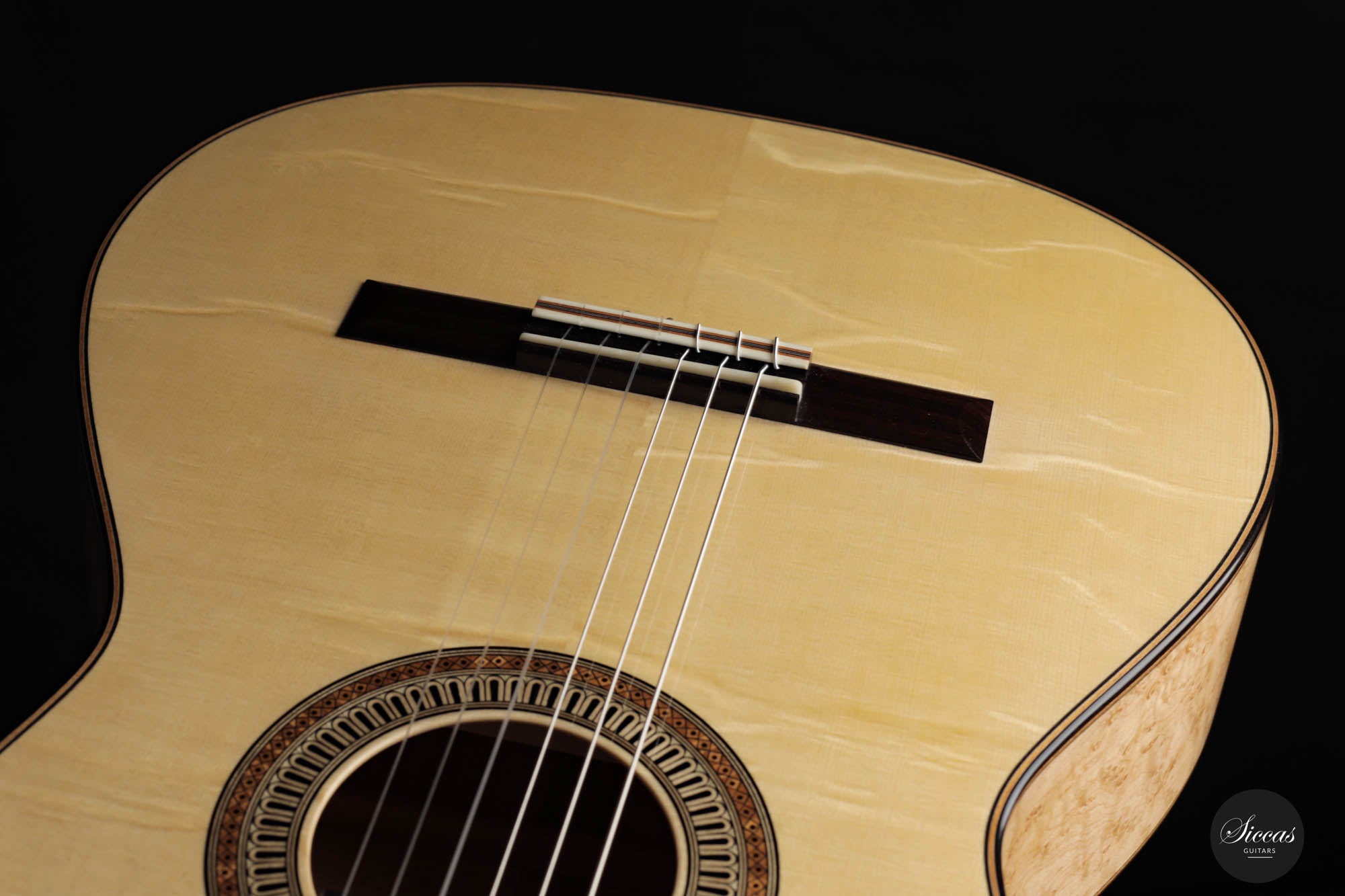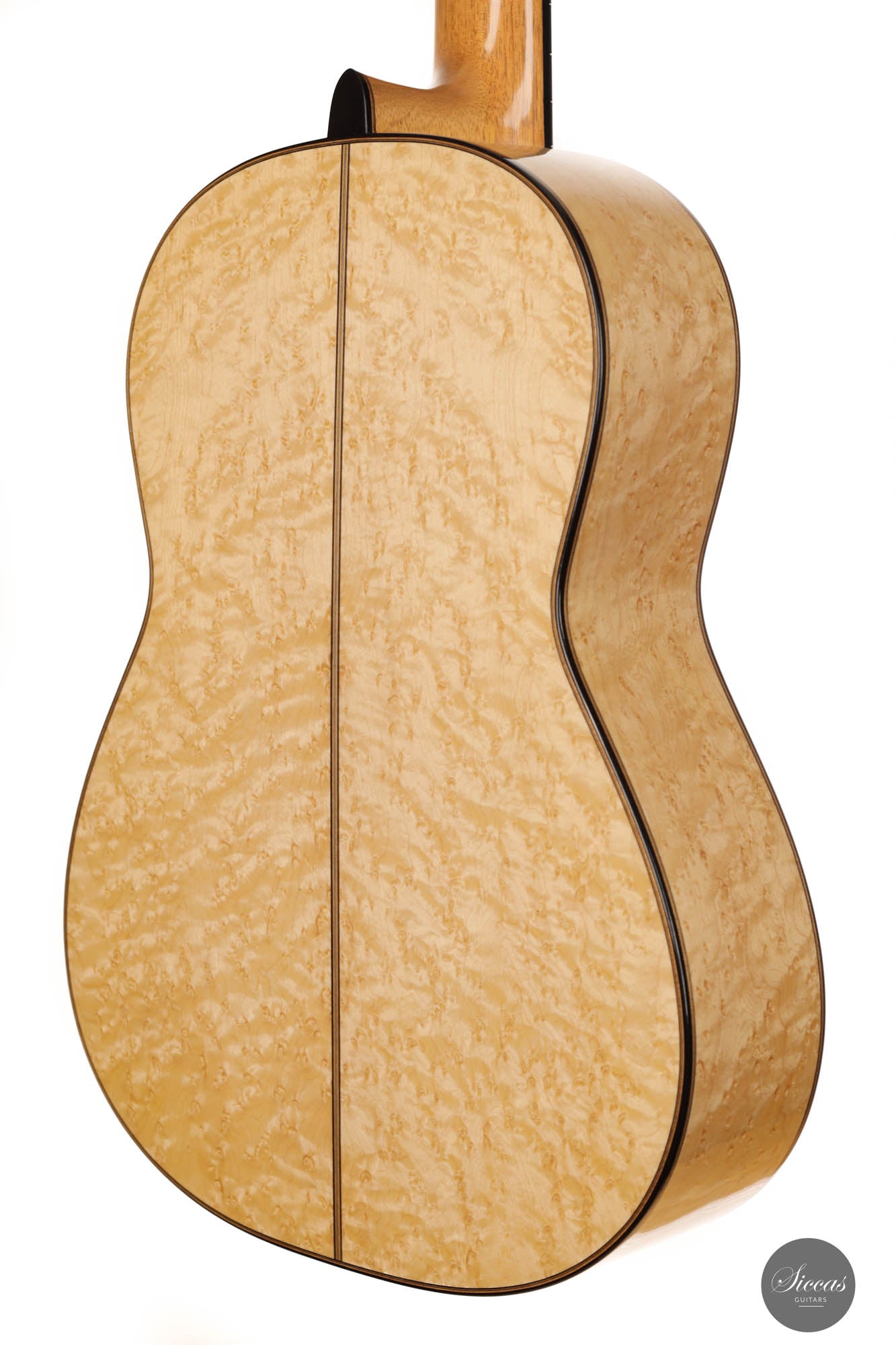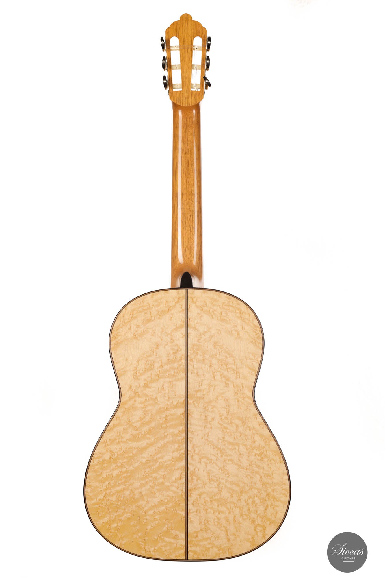 The 2023 Oren Myers guitar is a stunning instrument with exceptional design and craftsmanship. The head of the guitar is inspired by the lines of Picasso's "Woman with Yellow Hair" painting, while the rosette draws inspiration from an antique Greek vase housed in the British Museum. These details add a unique and artistic touch to the guitar's design. In addition to its exceptional design and craftsmanship, this 2023 Oren Myers features a spruce soundboard that contributes to its bright and responsive tone. Meanwhile, the back and sides of the guitar are made from stunning bird’s eye maple, which adds a beautiful and unique visual texture to the instrument. The Oren Myers guitar offers a fast response and a refined, careful tone that fills the entire room. The trebles are sweet and singing, while the bass response is snappy and powerful, making for a surprisingly well-balanced and dynamic guitar. The guitar’s build quality is excellent, with every detail carefully considered and executed perfectly. Despite its simplicity, the guitar's tasteful and elegant design is a testament to the skill and artistry of its maker. This true concert guitar meets even the highest standards in the classical guitar repertoire.