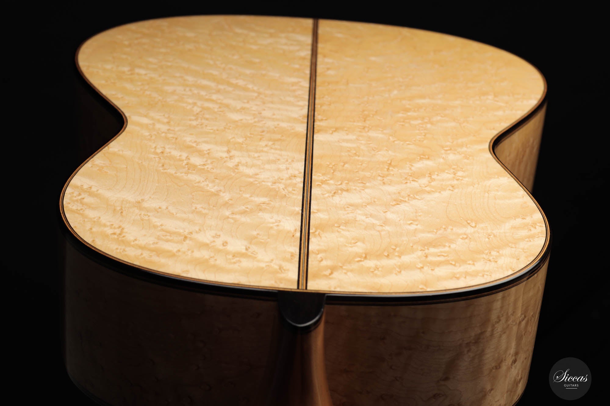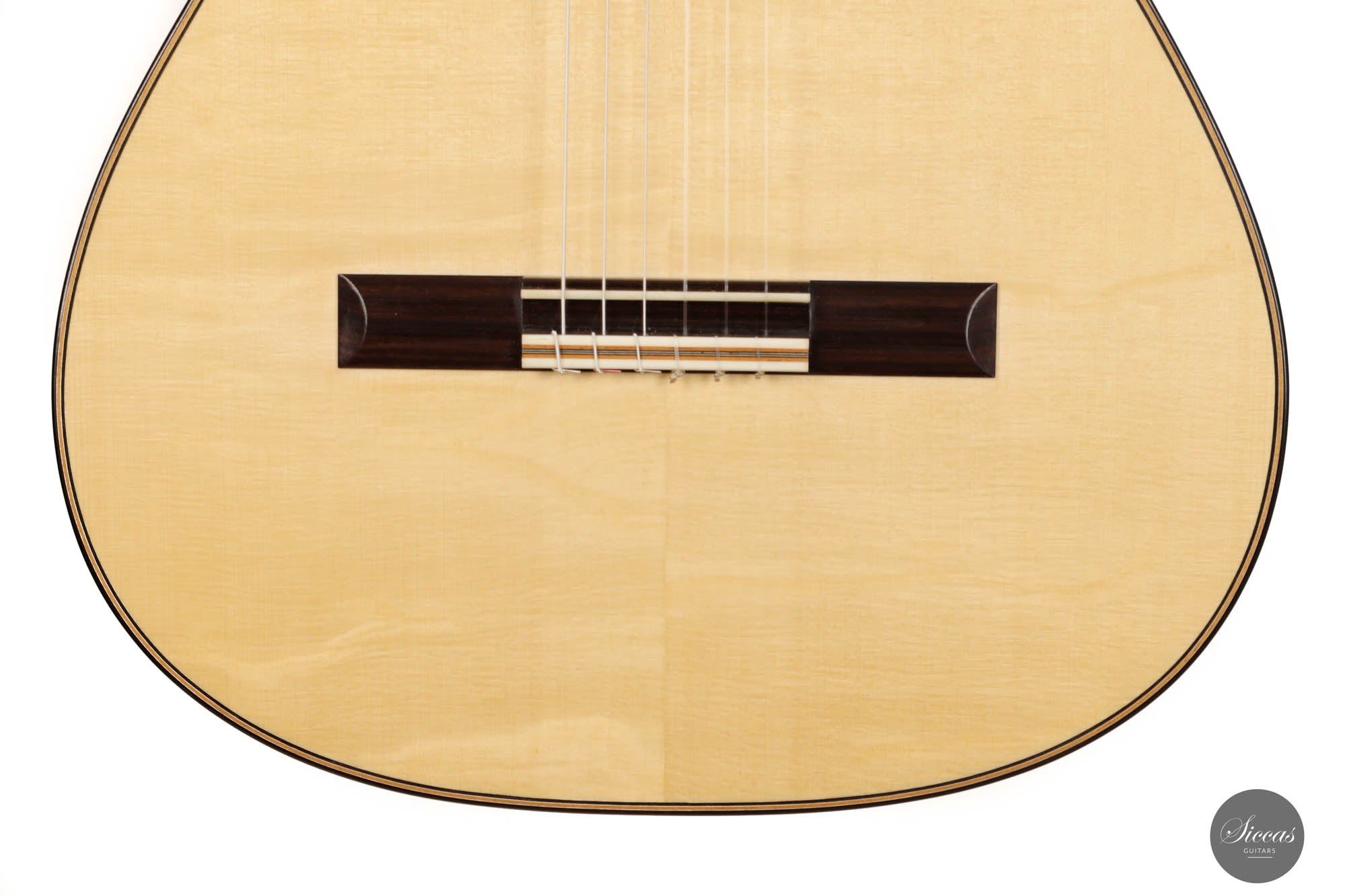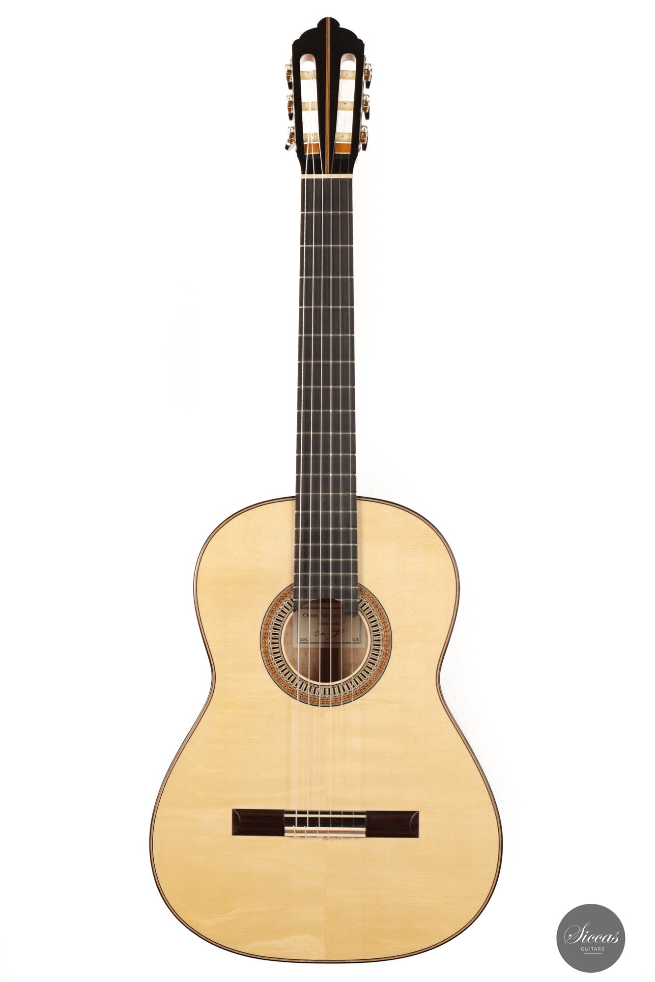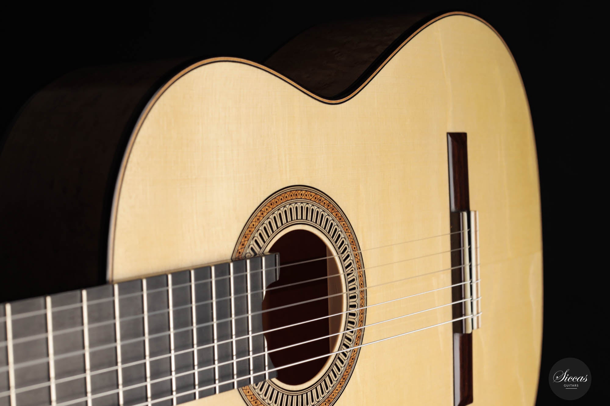 The 2023 Oren Myers guitar is a stunning instrument with exceptional design and craftsmanship. The head of the guitar is inspired by the lines of Picasso's "Woman with Yellow Hair" painting, while the rosette draws inspiration from an antique Greek vase housed in the British Museum. These details add a unique and artistic touch to the guitar's design. In addition to its exceptional design and craftsmanship, this 2023 Oren Myers features a spruce soundboard that contributes to its bright and responsive tone. Meanwhile, the back and sides of the guitar are made from stunning bird’s eye maple, which adds a beautiful and unique visual texture to the instrument. The Oren Myers guitar offers a fast response and a refined, careful tone that fills the entire room. The trebles are sweet and singing, while the bass response is snappy and powerful, making for a surprisingly well-balanced and dynamic guitar. The guitar’s build quality is excellent, with every detail carefully considered and executed perfectly. Despite its simplicity, the guitar's tasteful and elegant design is a testament to the skill and artistry of its maker. This true concert guitar meets even the highest standards in the classical guitar repertoire.