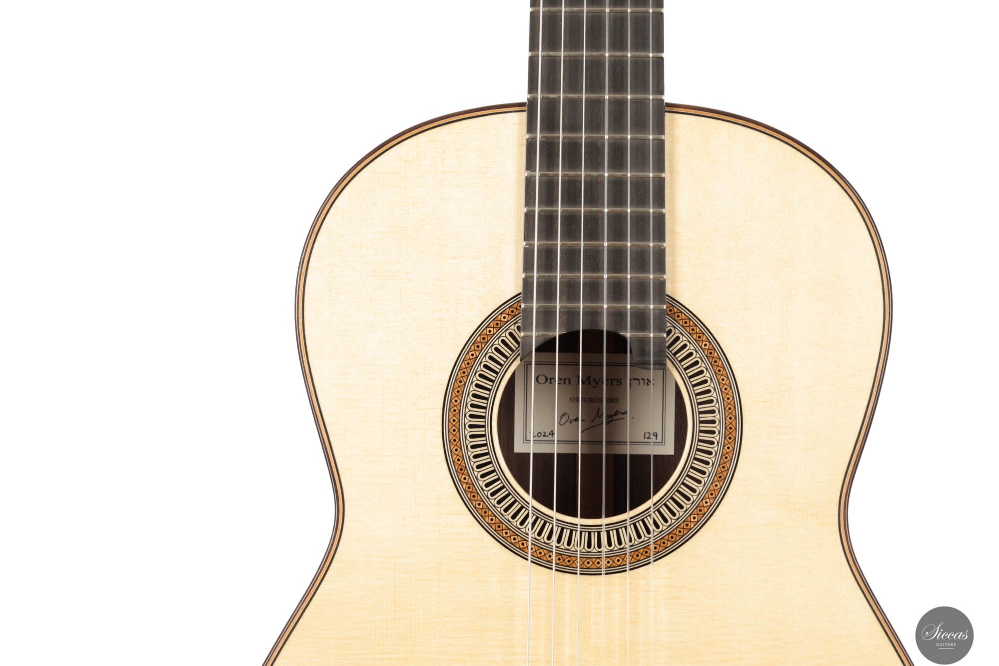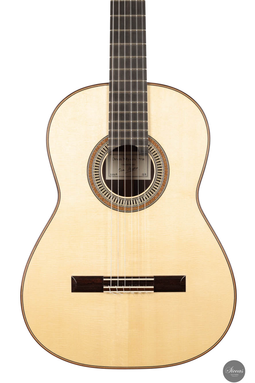 When played, the Oren Myers No. 129 guitar truly sings. It is designed for fast response, allowing each note to resonate fully and richly, perfect for filling rooms with its refined and meticulously crafted tone. The guitar’s sound spectrum is impressively dynamic, featuring sweet, melodious trebles and robust, powerful basses that together create a well-balanced and dynamic acoustic experience. This guitar’s simplistic yet profound elegance makes it more than just an instrument for concerts; it is a benchmark of excellence in the classical guitar world.