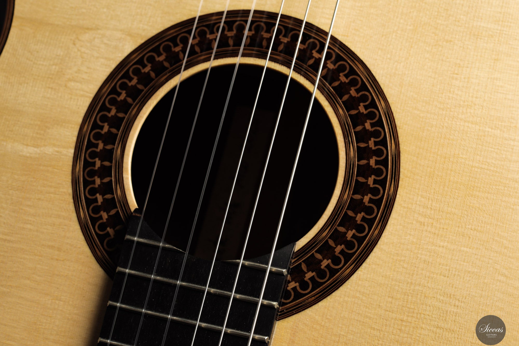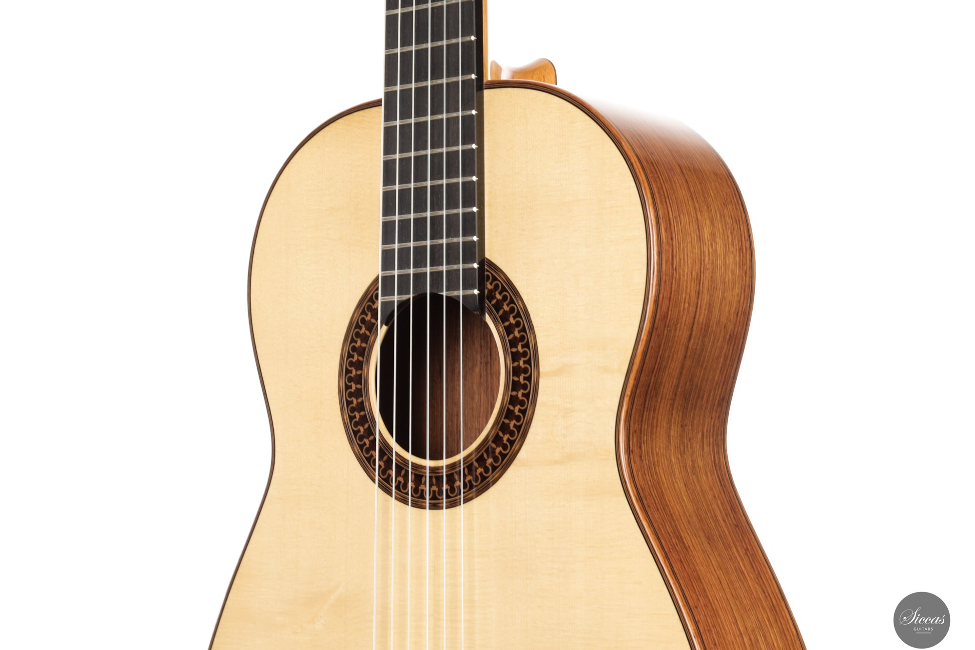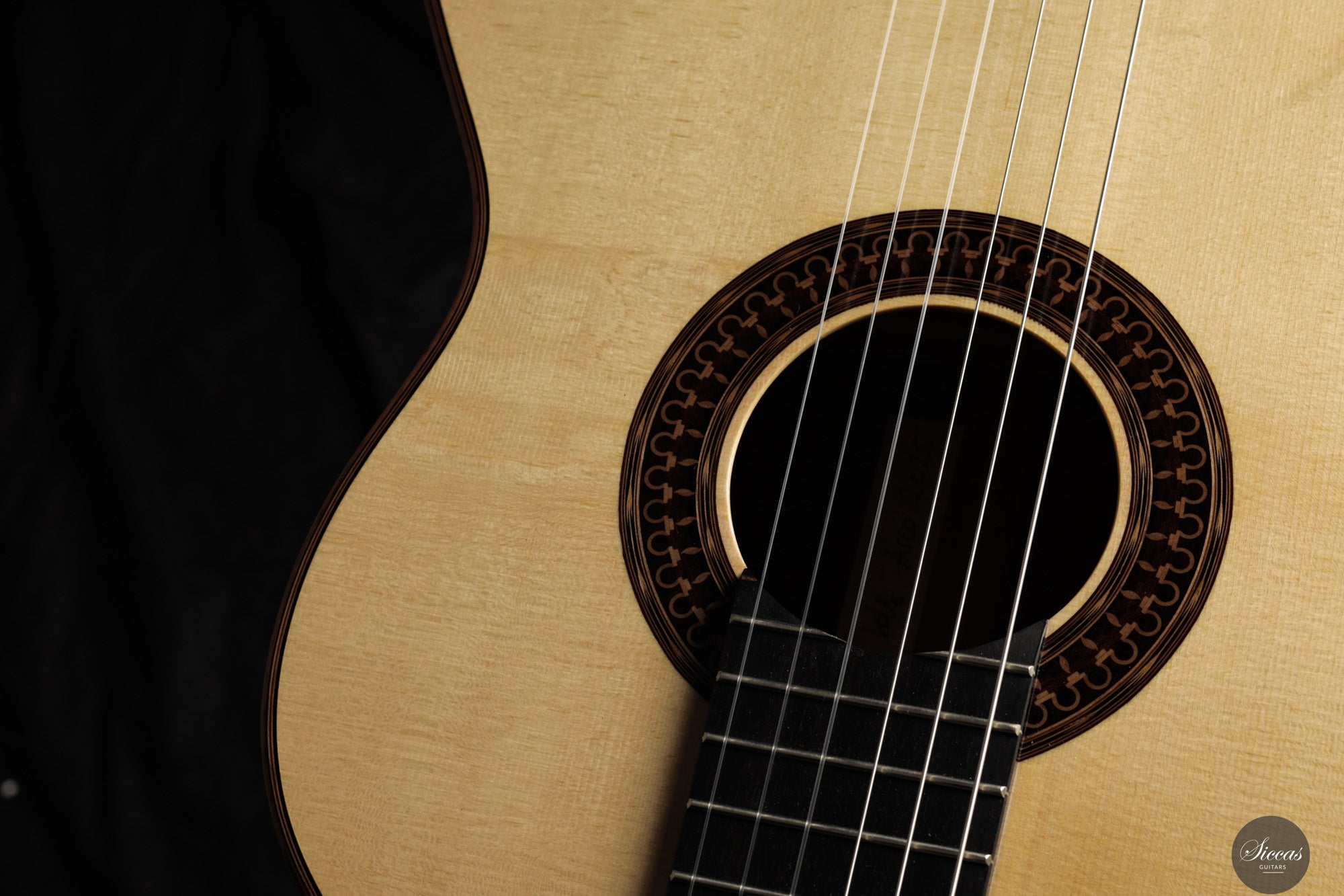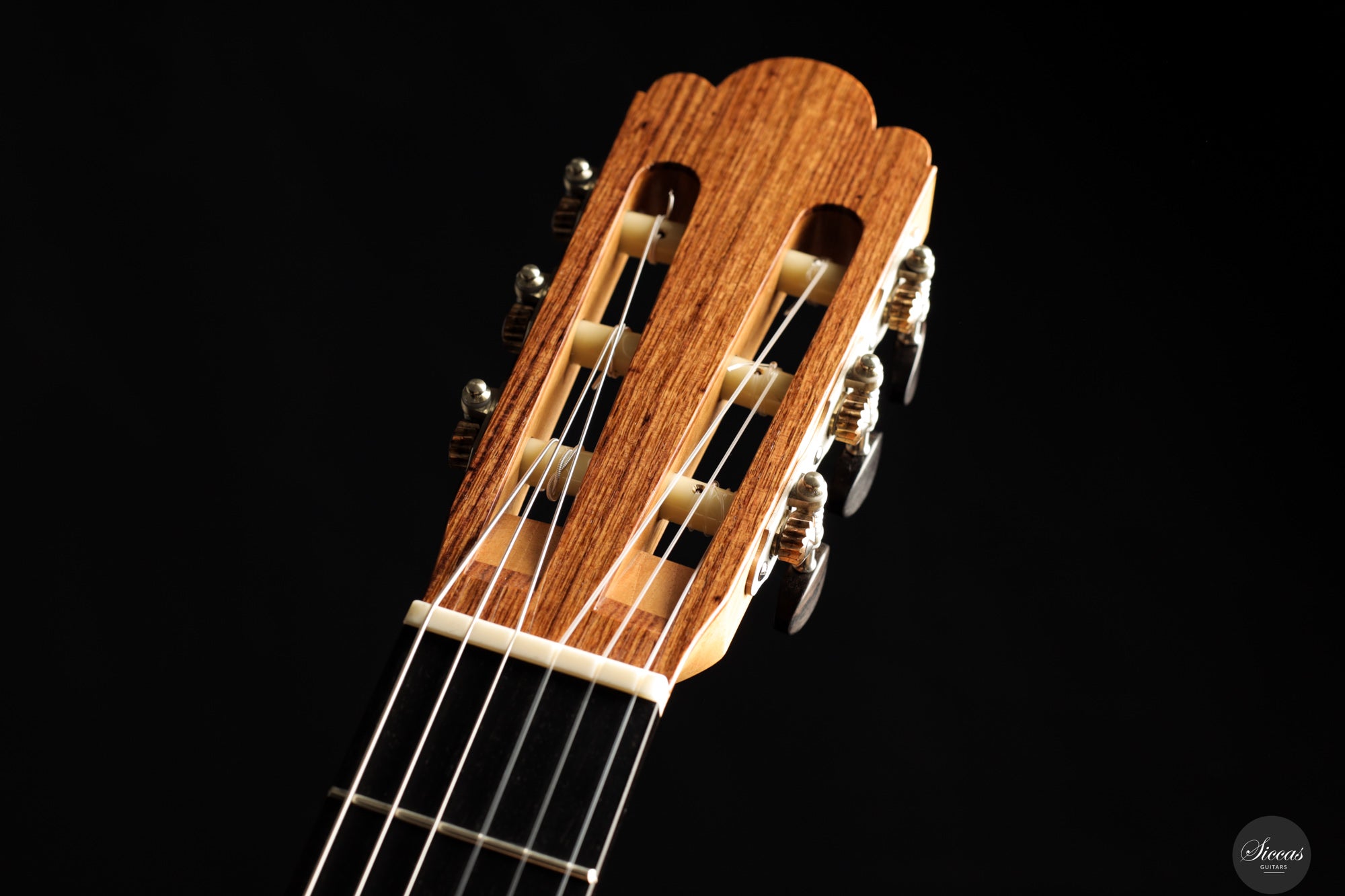 The sound of this instrument is sweet and lyrical, with expressive nuance appearing even at a gentle attack. Notes respond quickly and connect with ease across all registers, so that phrases flow naturally under the hands. The guitar projects with assurance without needing to be driven hard, and colour changes arise readily with subtle right hand movement, offering a wide palette without effort. Playability is one of its strong points. The instrument settles comfortably in the hands and supports relaxed, fluid phrasing from the first touch. Visually and sonically, this guitar presents refinement, coherence and a personal artistic voice. It is an inviting choice for players who seek a traditionally voiced concert instrument shaped with care, sensitivity and clear intention.