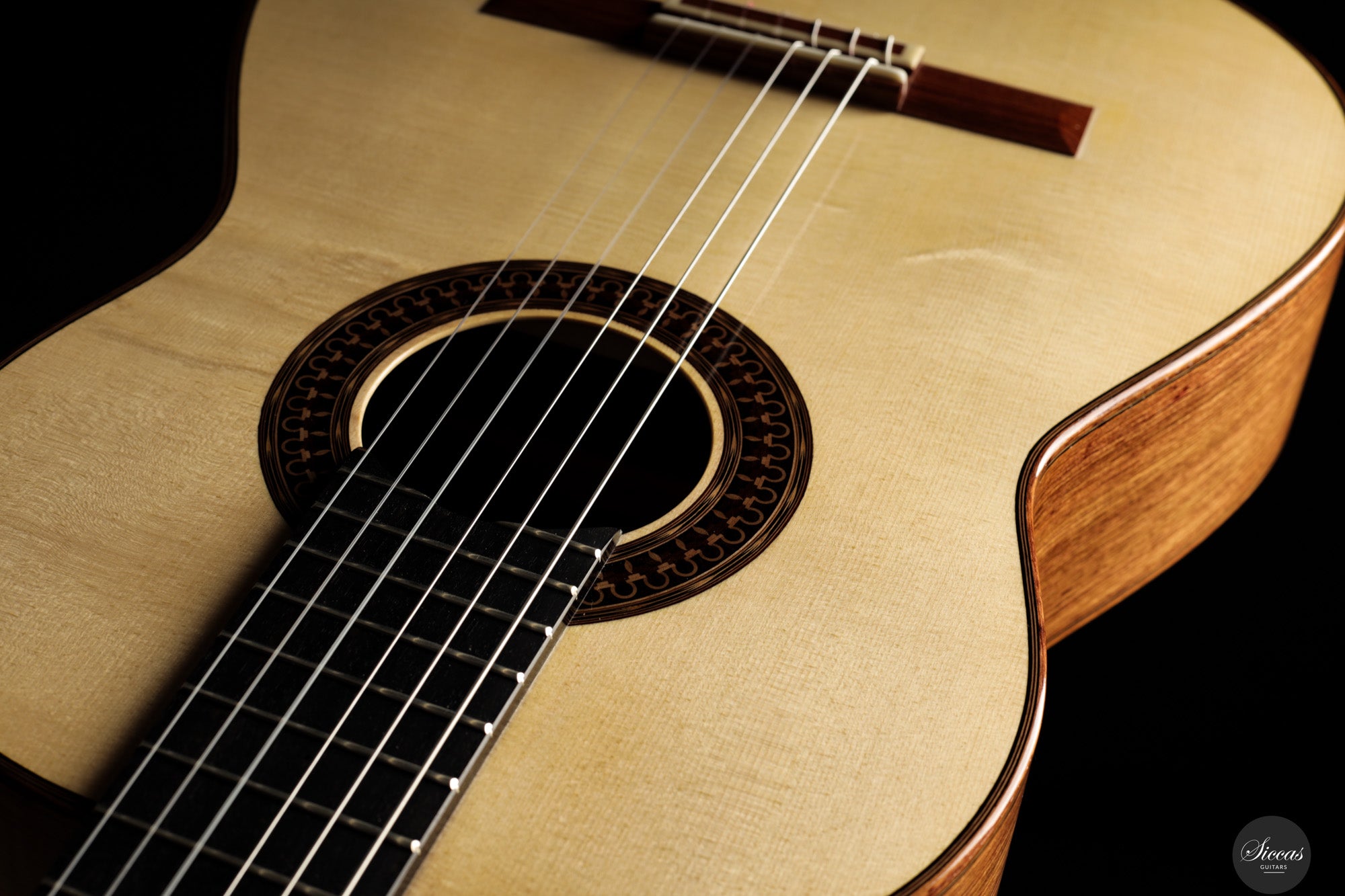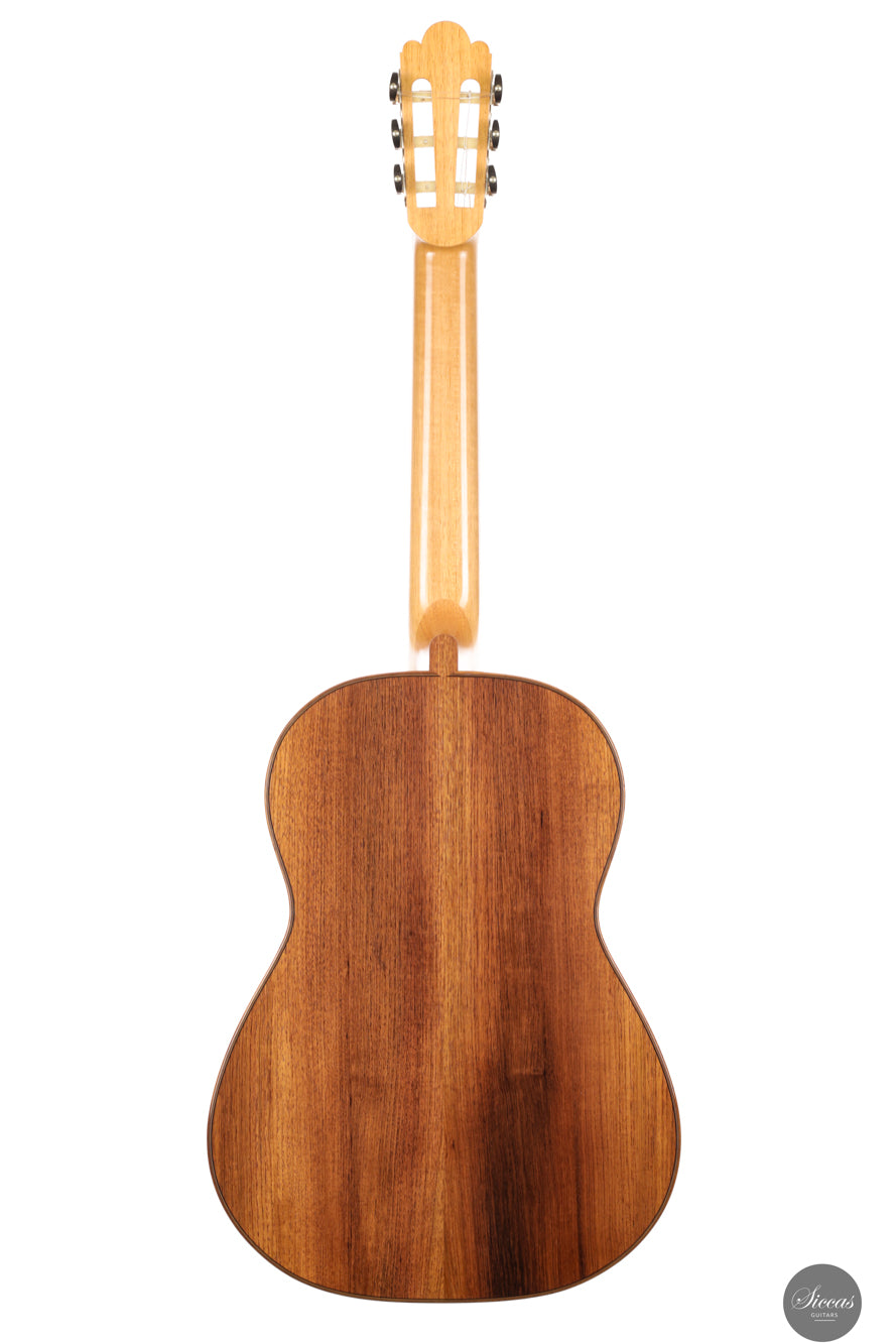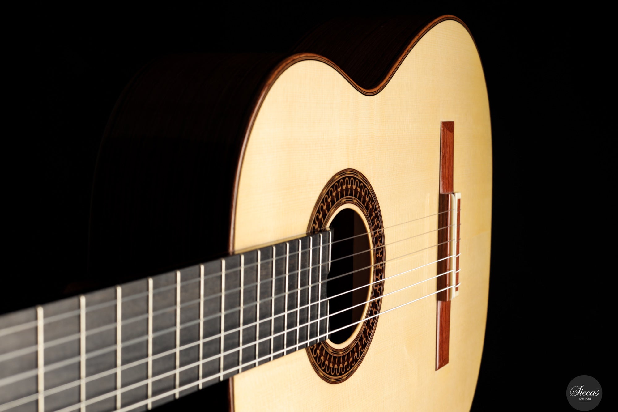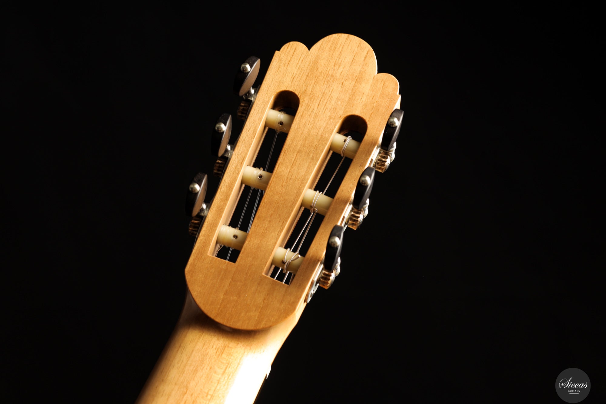 The sound of this instrument is sweet and lyrical, with expressive nuance appearing even at a gentle attack. Notes respond quickly and connect with ease across all registers, so that phrases flow naturally under the hands. The guitar projects with assurance without needing to be driven hard, and colour changes arise readily with subtle right hand movement, offering a wide palette without effort. Playability is one of its strong points. The instrument settles comfortably in the hands and supports relaxed, fluid phrasing from the first touch. Visually and sonically, this guitar presents refinement, coherence and a personal artistic voice. It is an inviting choice for players who seek a traditionally voiced concert instrument shaped with care, sensitivity and clear intention.